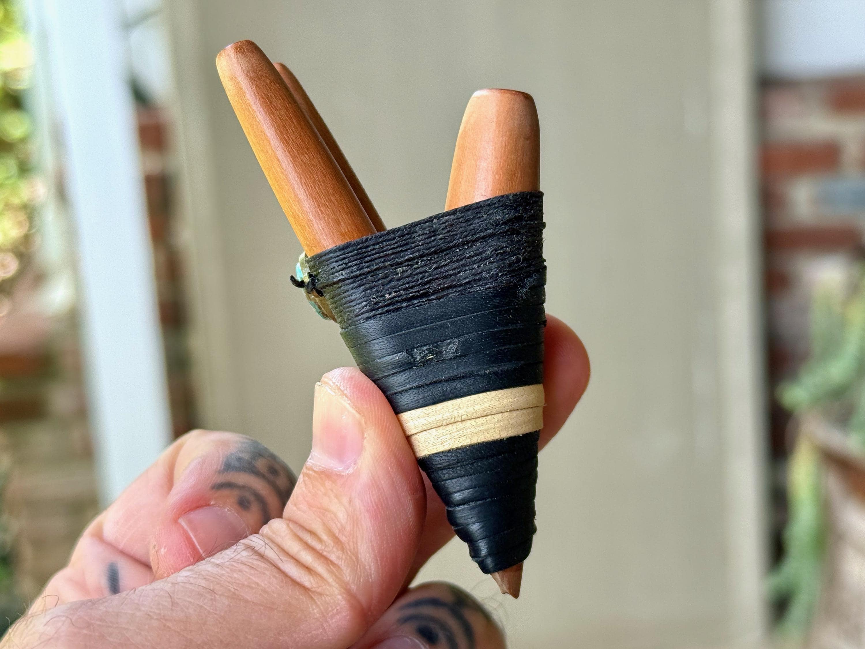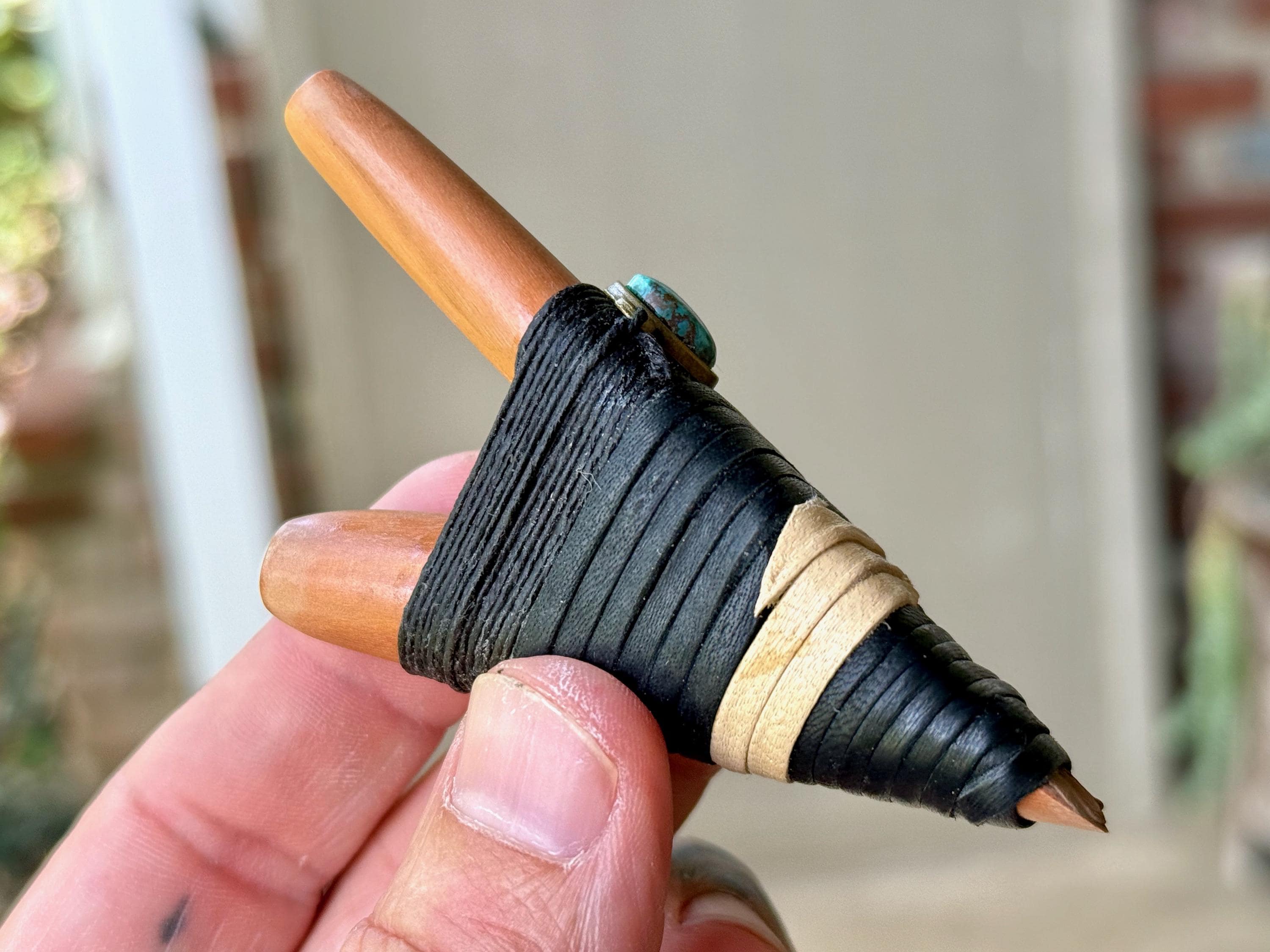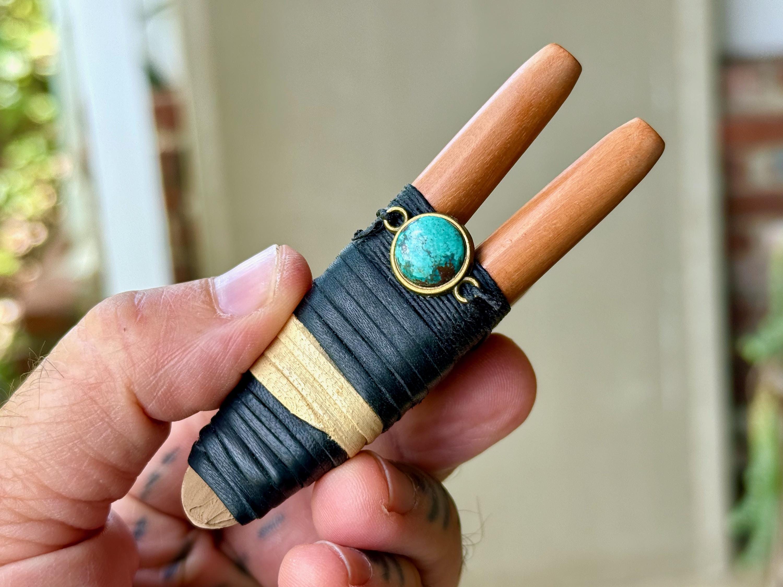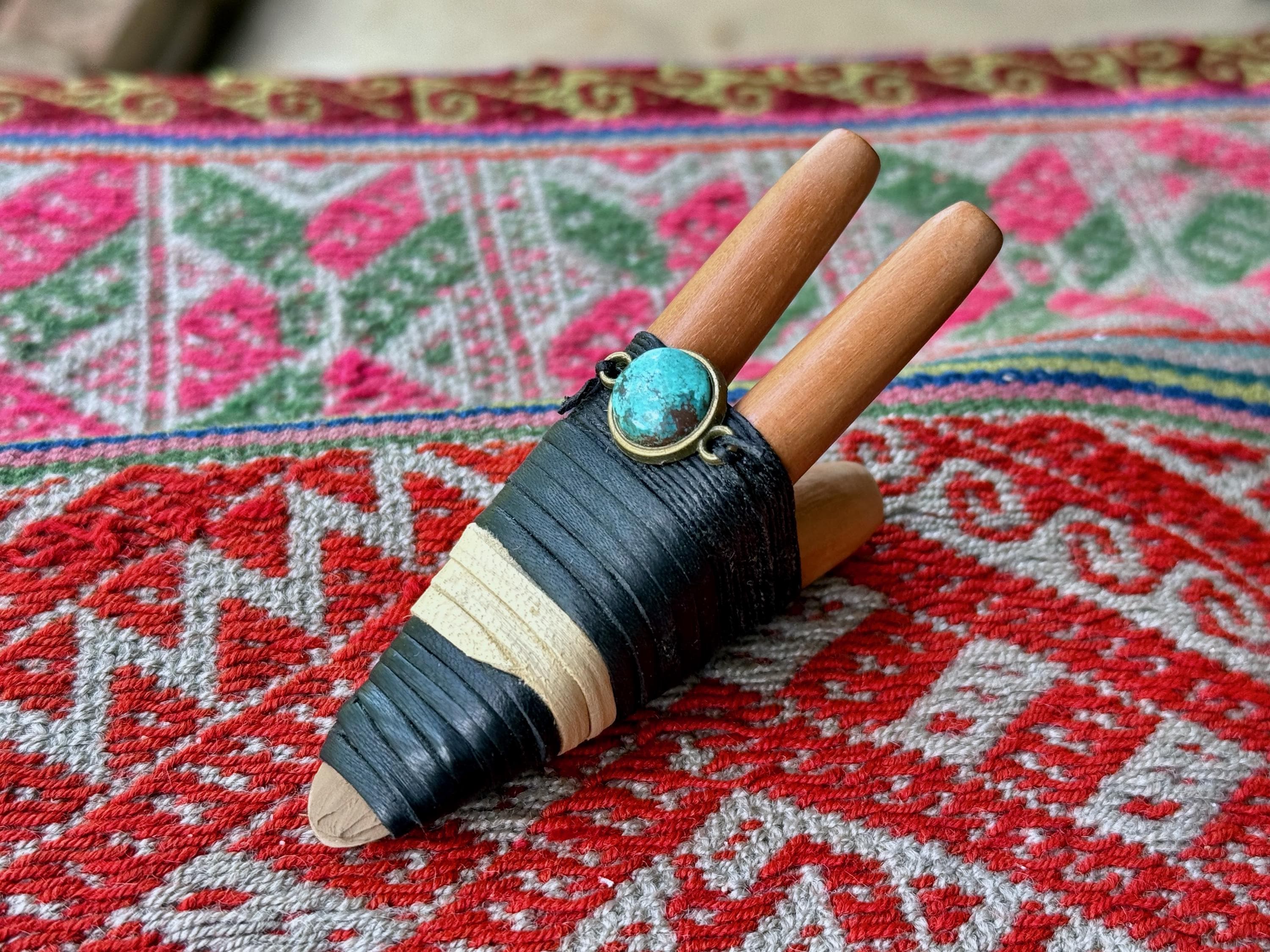 This Double Kuripe Pipe — for self-administering hapé — was hand crafted from natural Sawo Wood and adorned with leather, waxed thread and a Cloud Mountain Turquoise cabochon.
