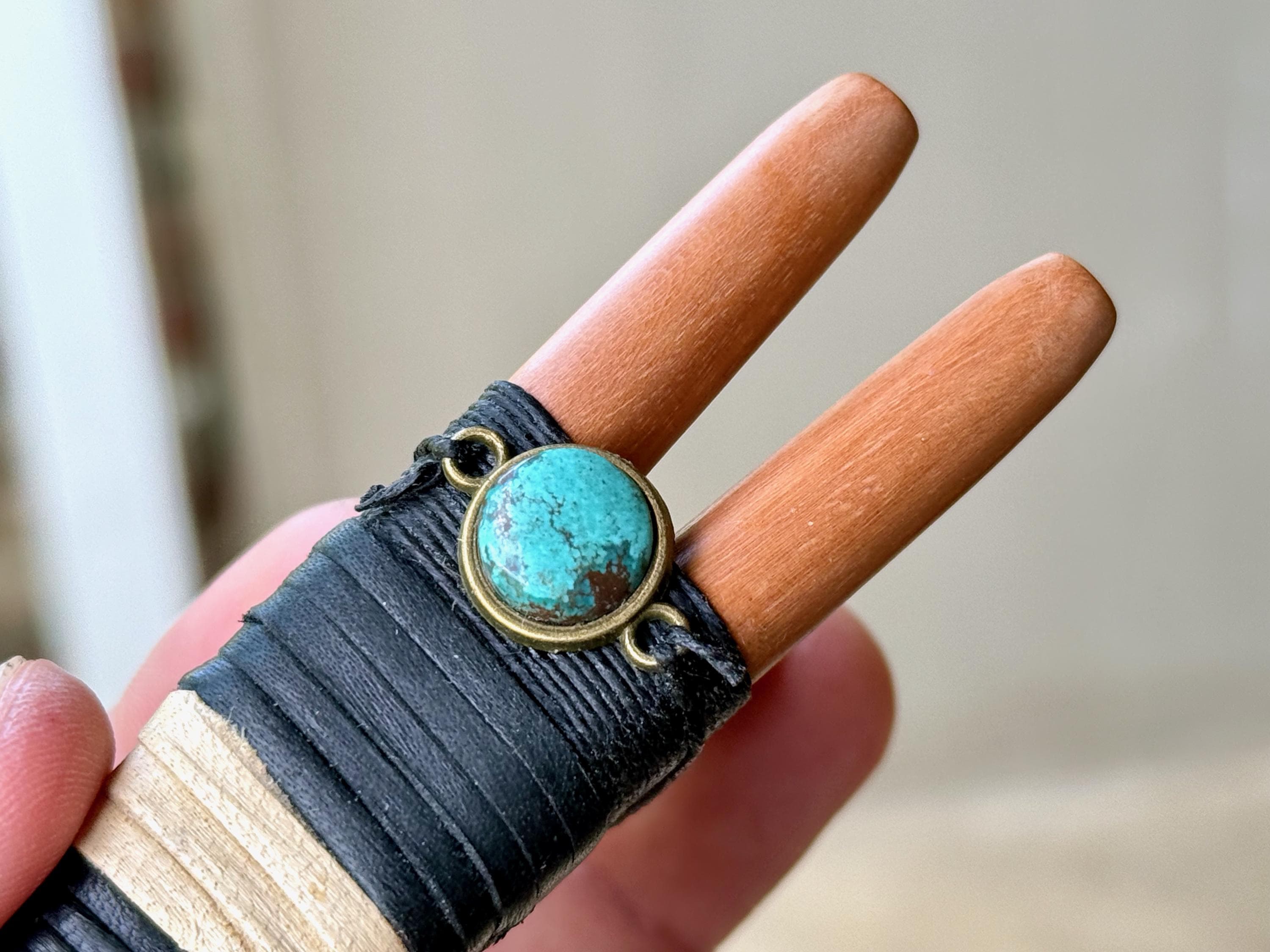 Additional ornamentation: Cloud Mountain Turquoise cabochon in bezeled brass setting