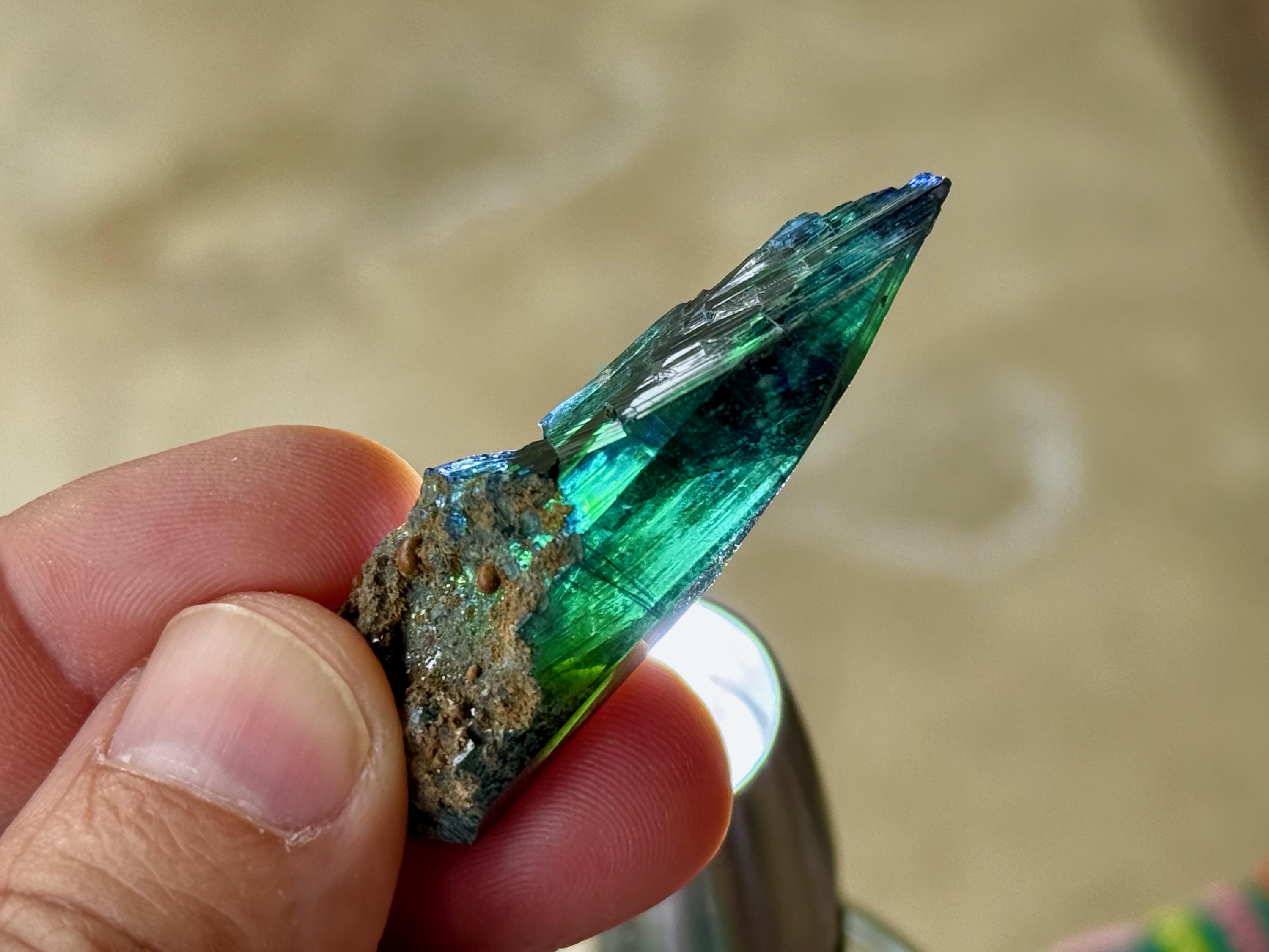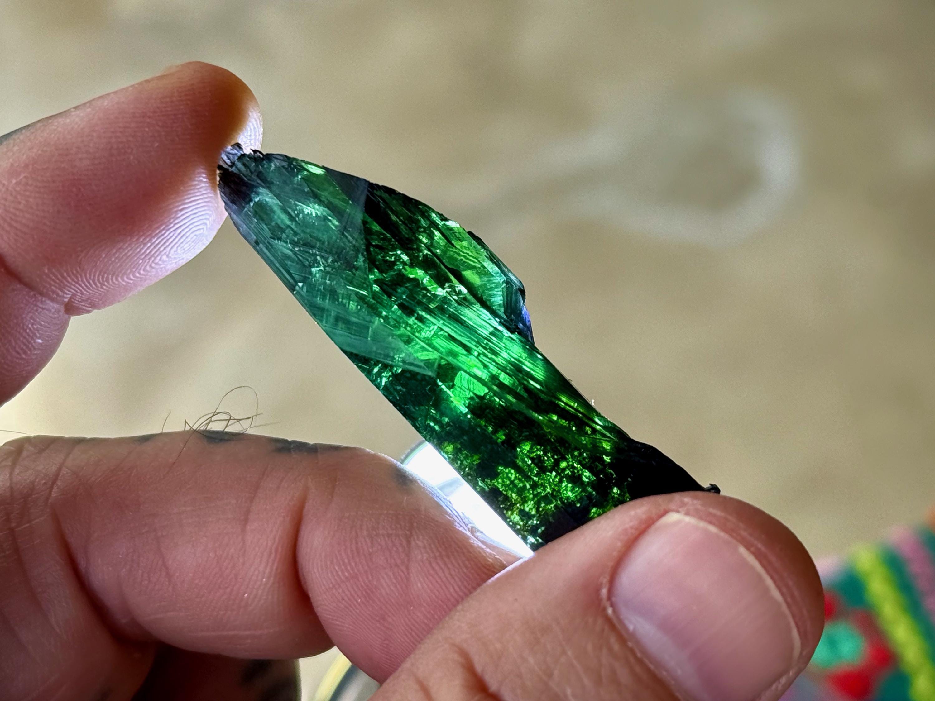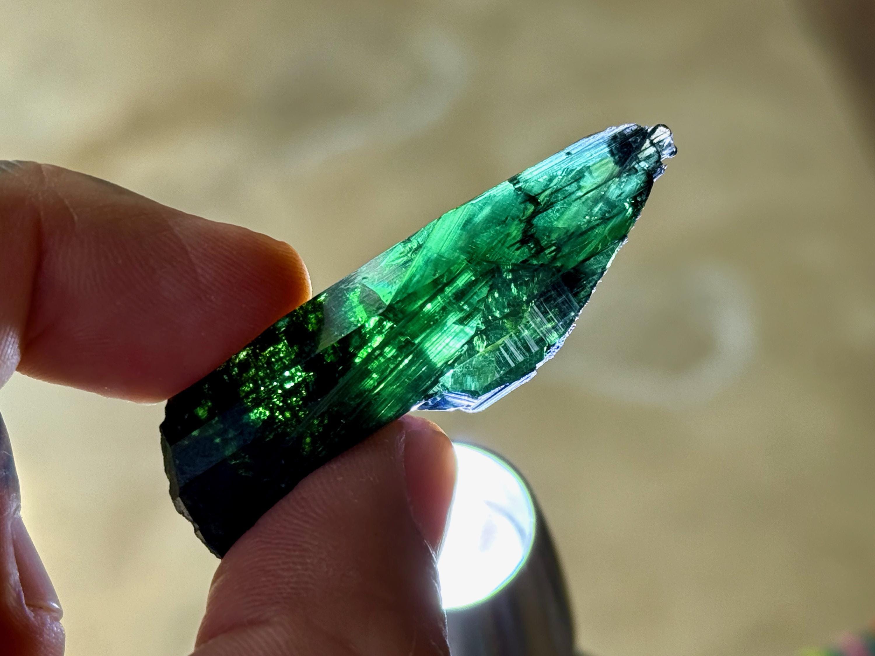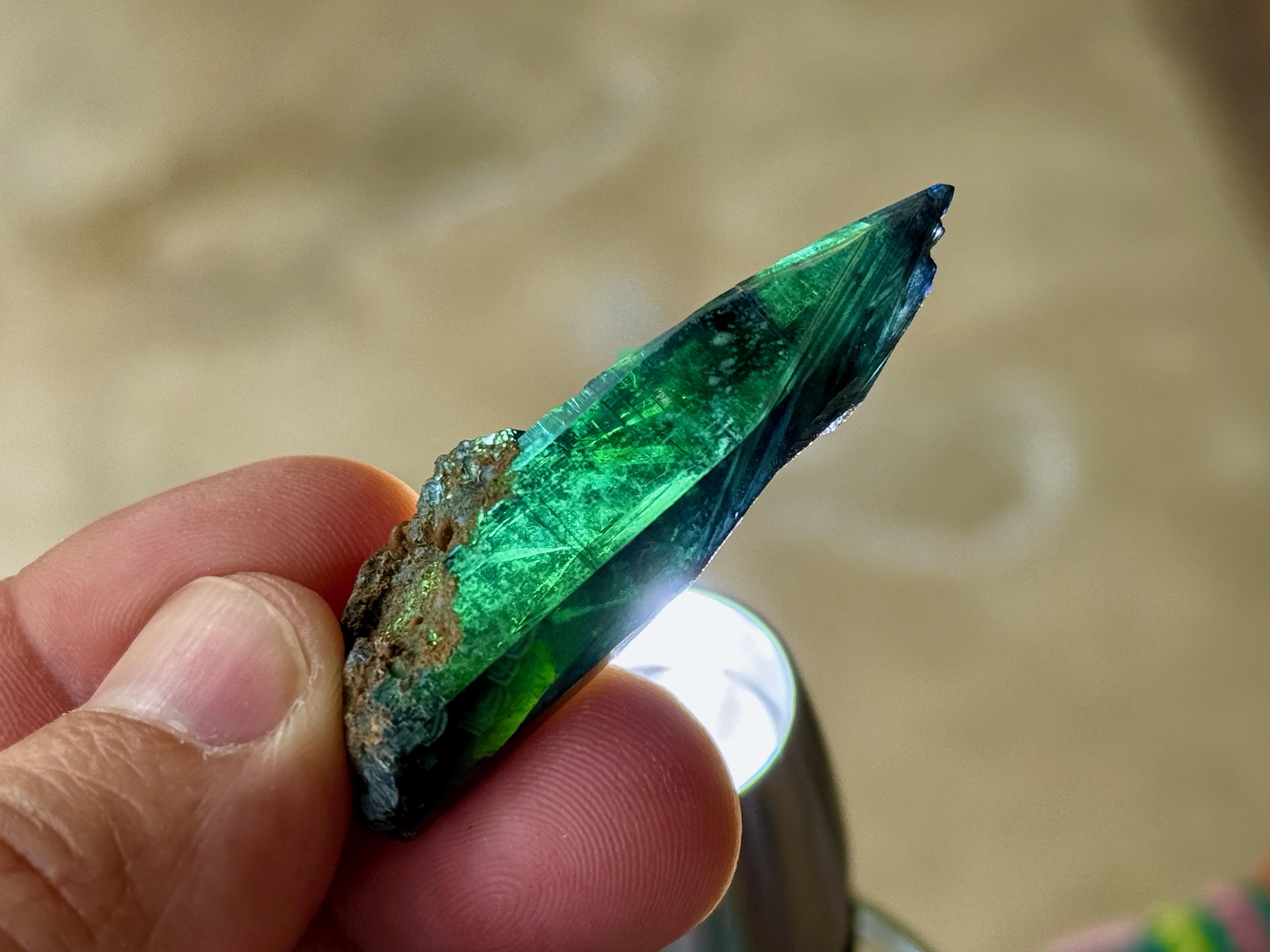 This crystal has outstanding translucency, and when backlit, we can see it light up with a brilliant green color and a bit of blue around the edges (Photos 1, 3-7).