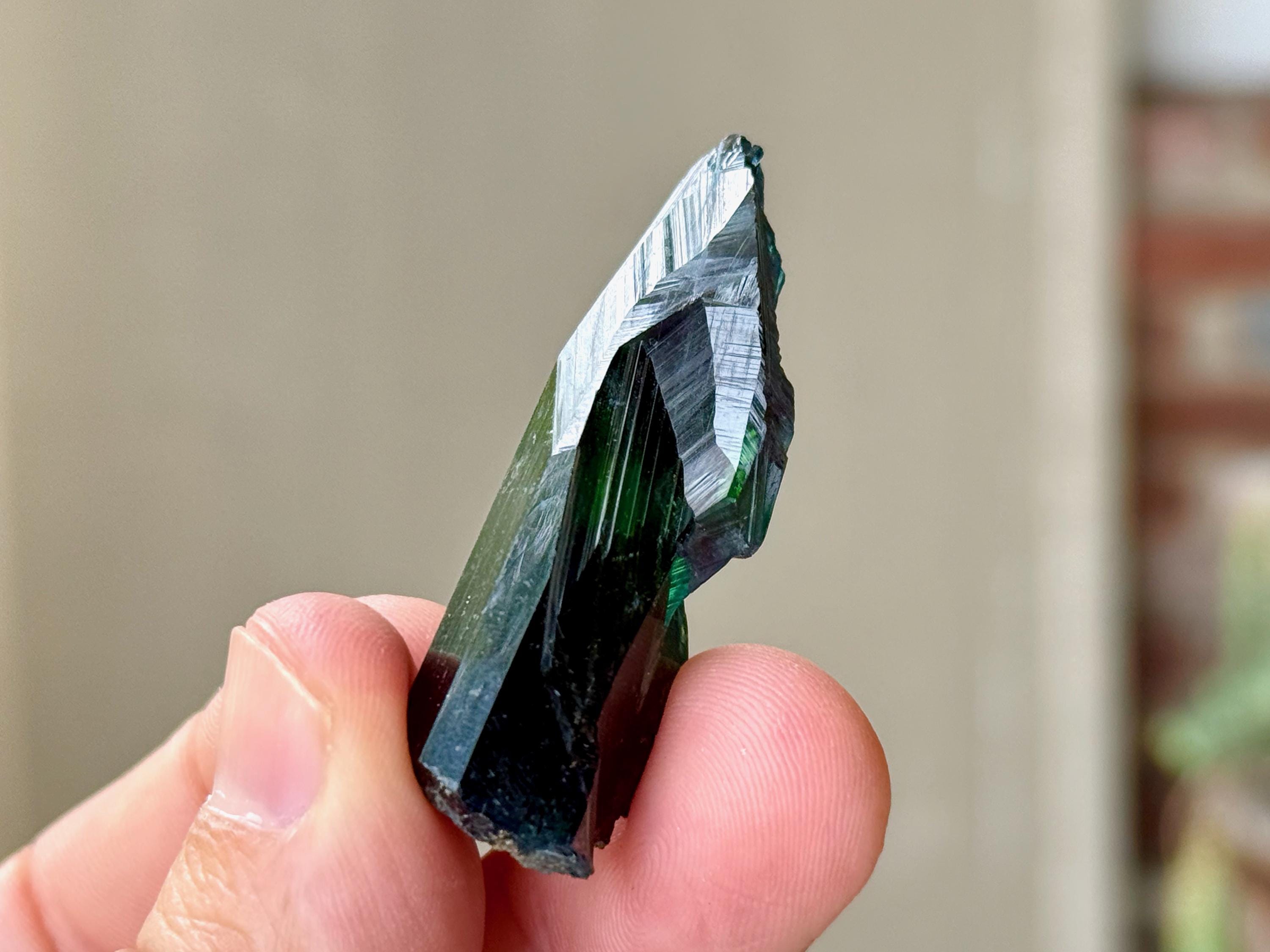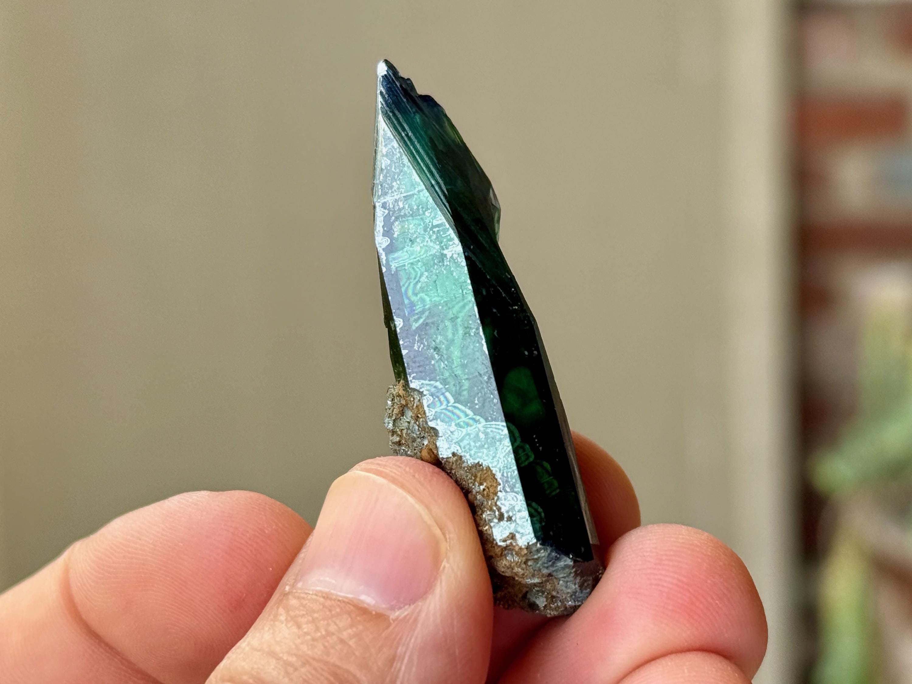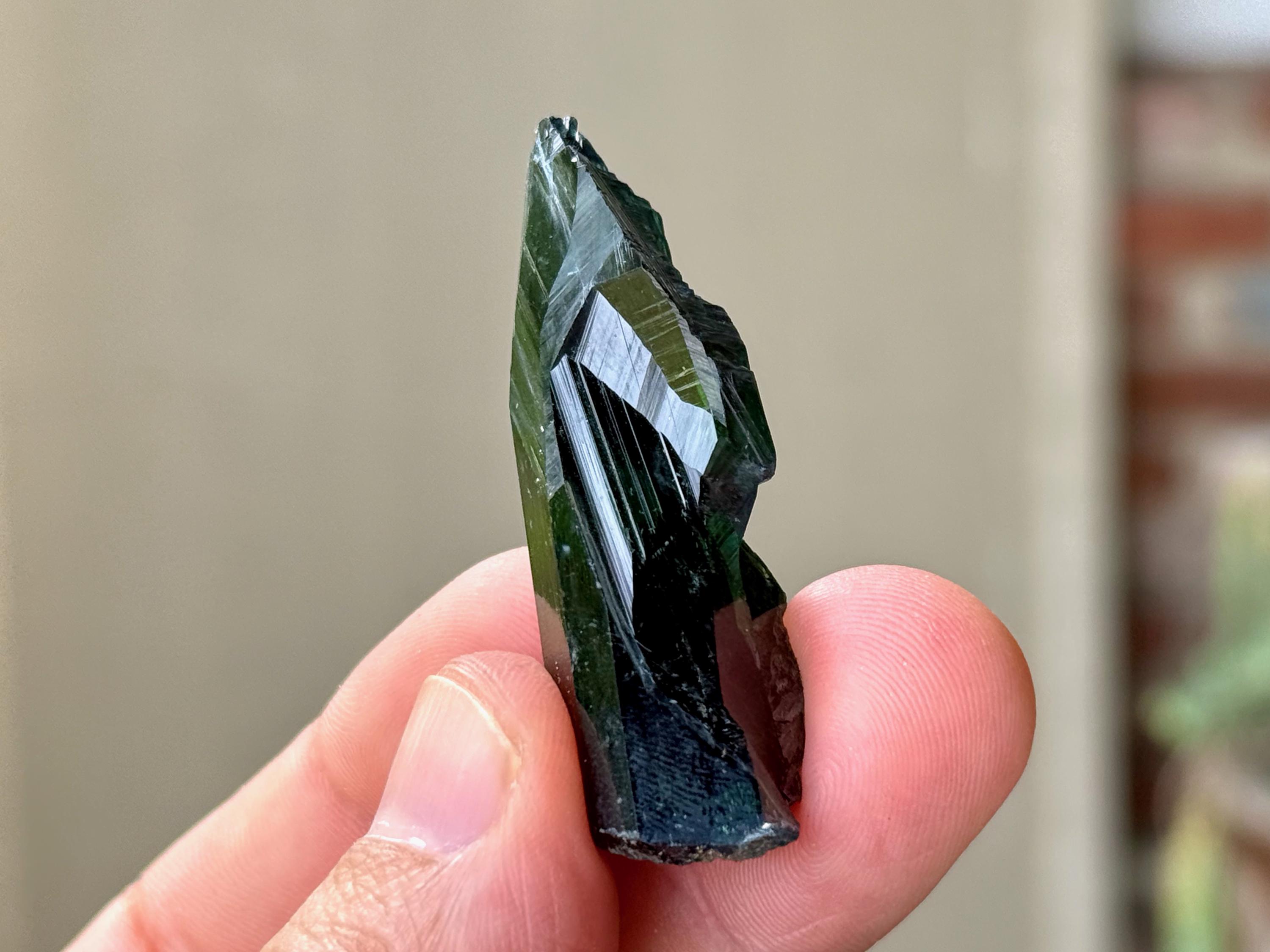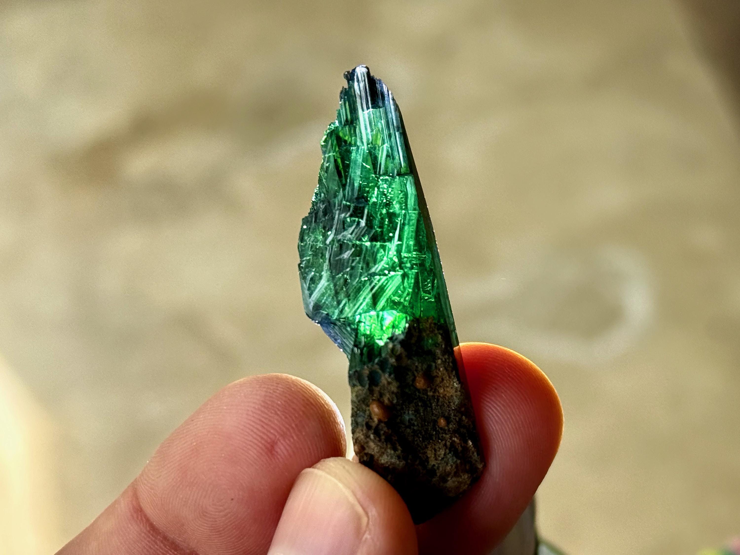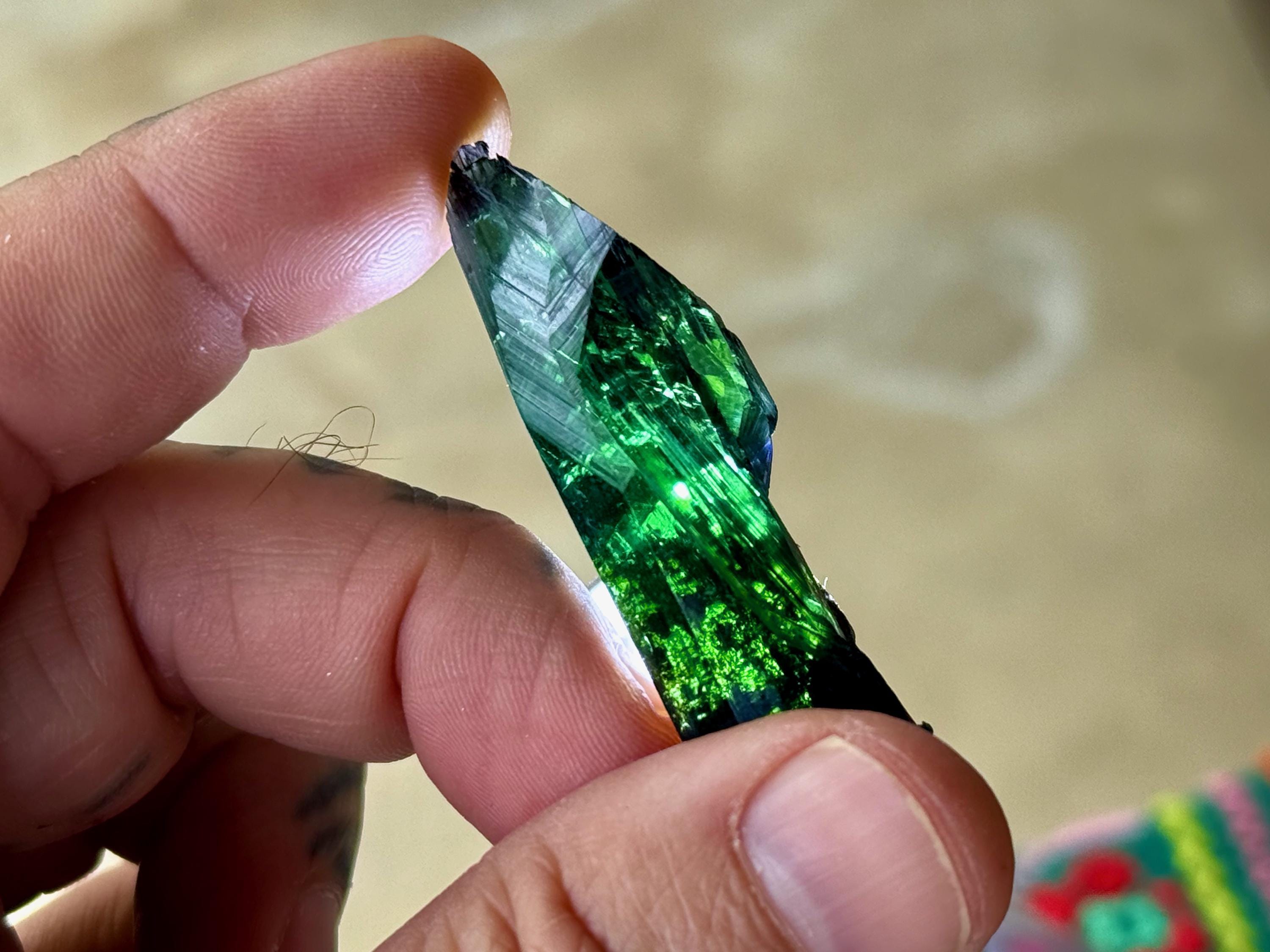 This crystal has outstanding translucency, and when backlit, we can see it light up with a brilliant green color and a bit of blue around the edges (Photos 1, 3-7).