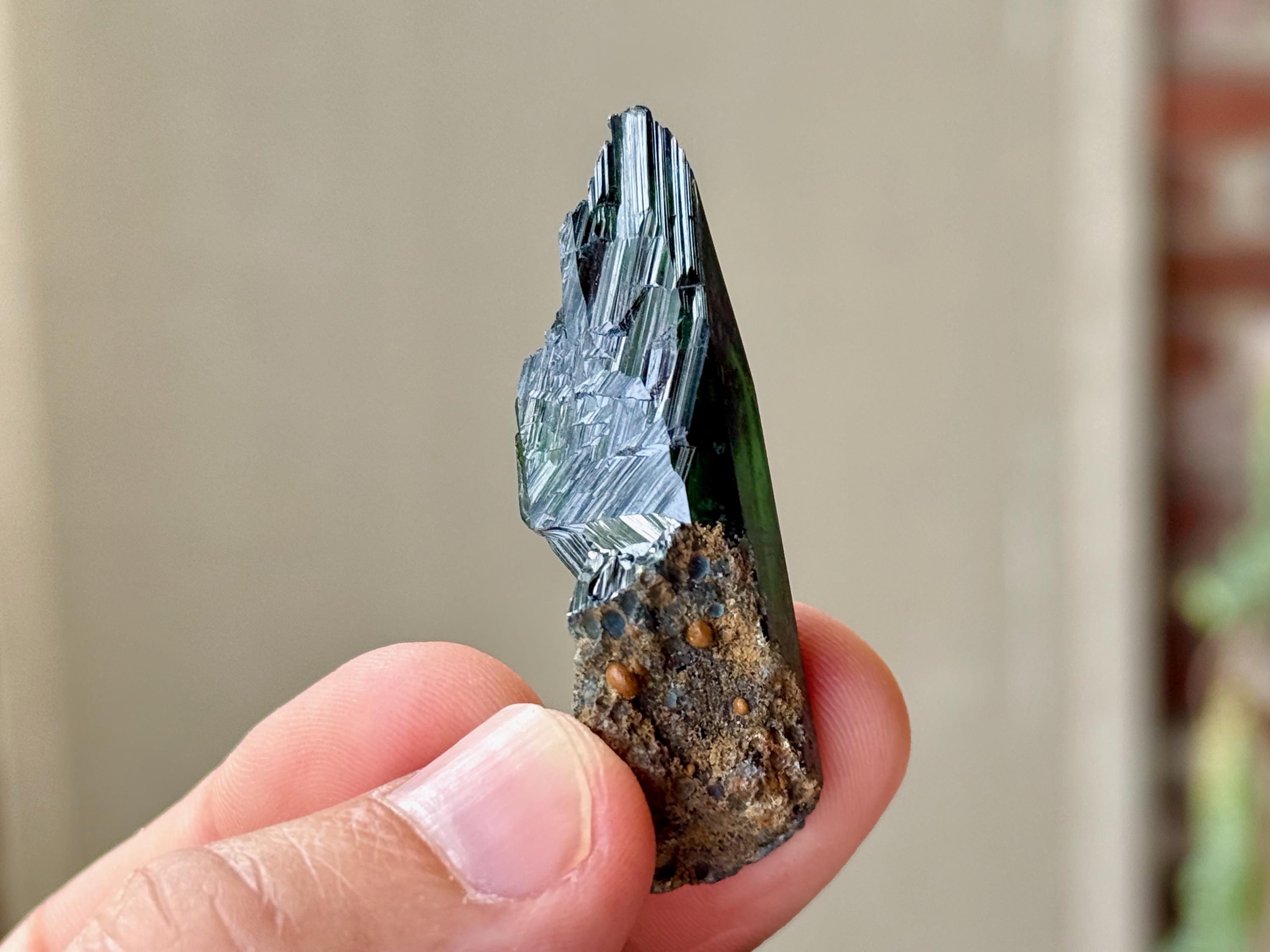A sleek formation with beautiful textures to this elegant Vivianite crystal with great luster. This crystal is entirely Vivianite with just a small amount of matrix at the base.