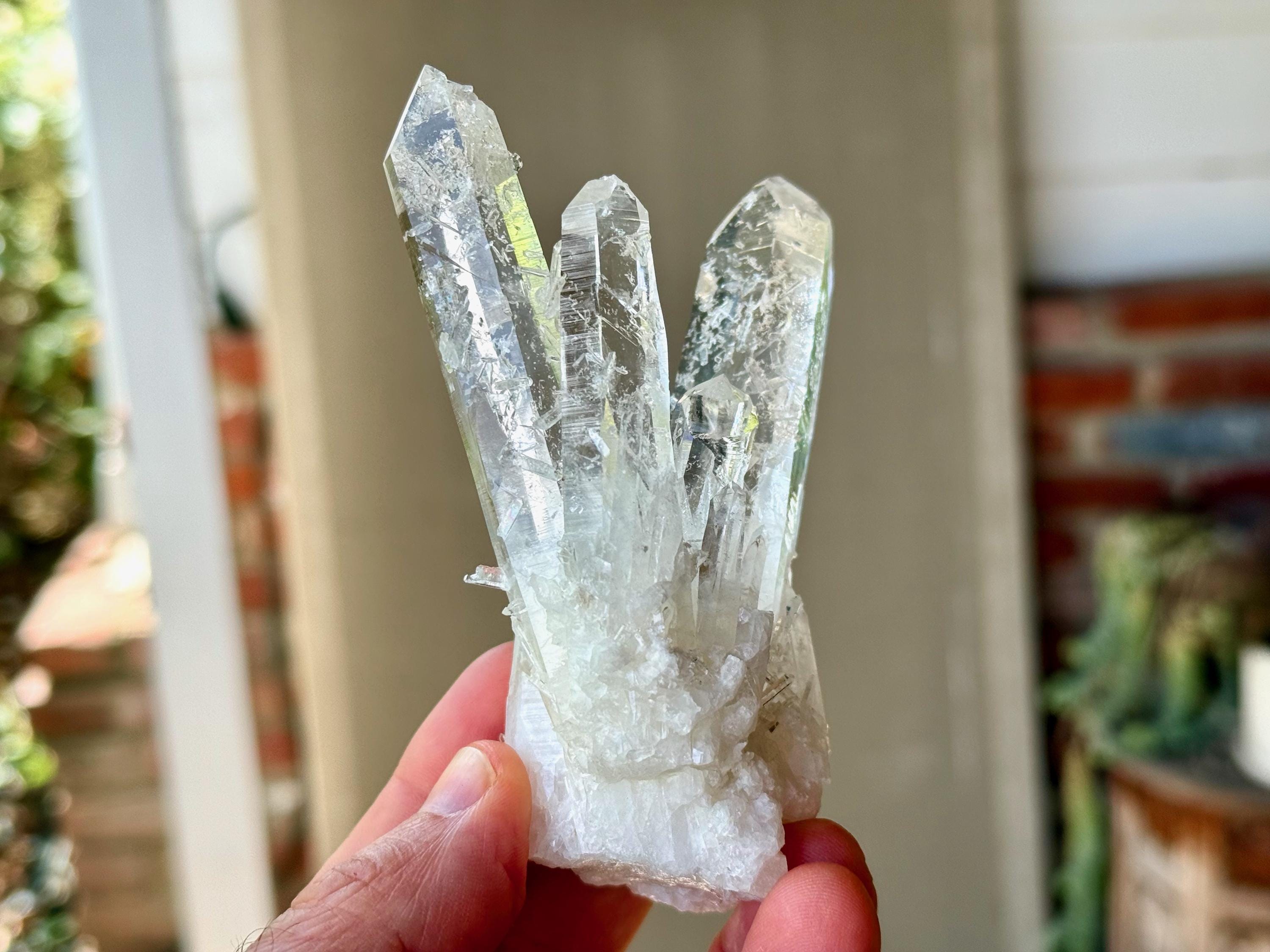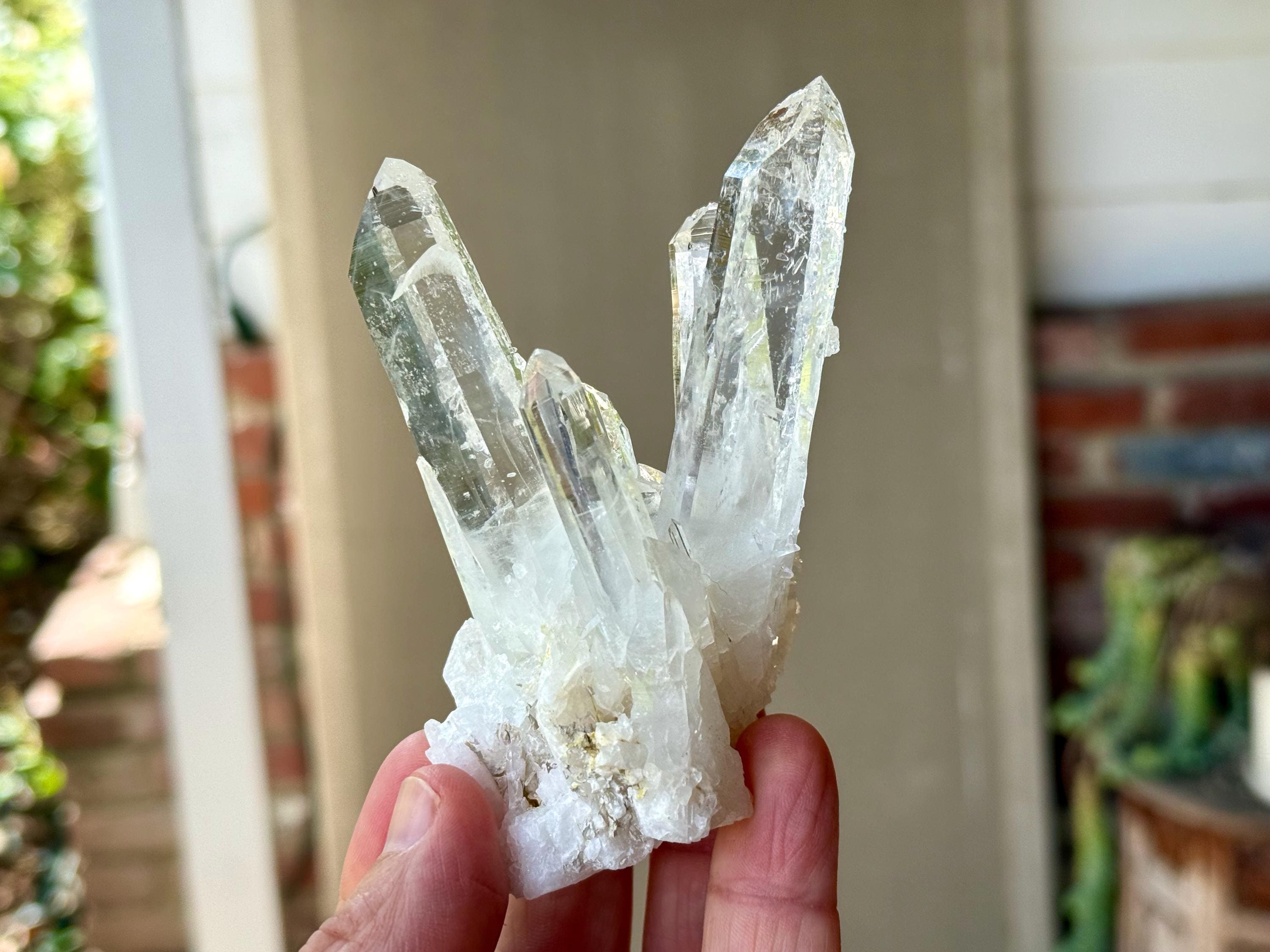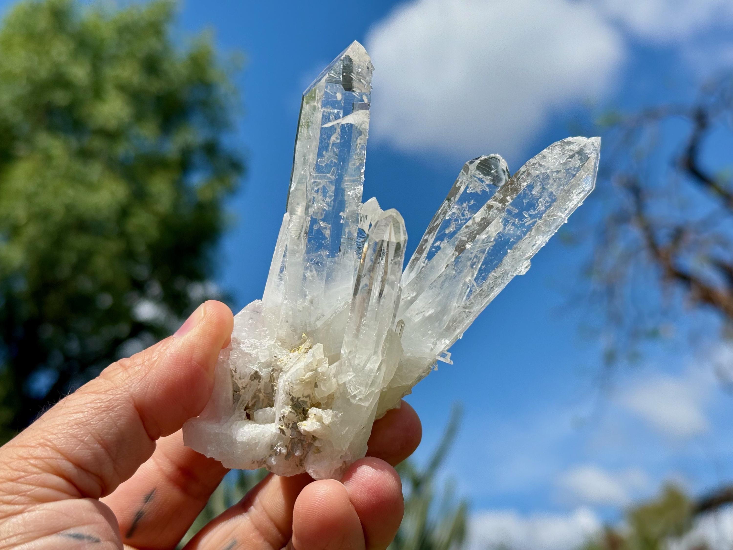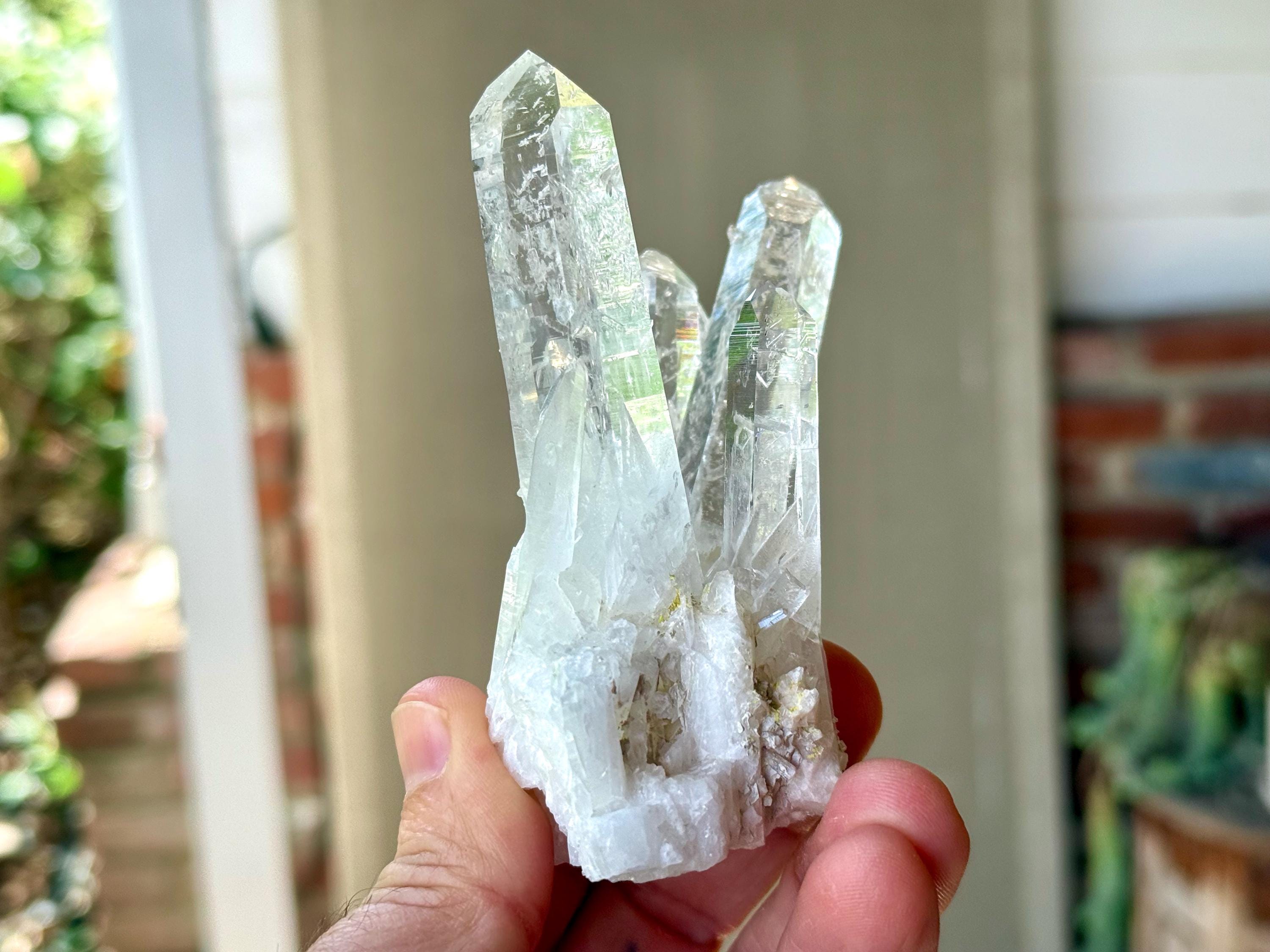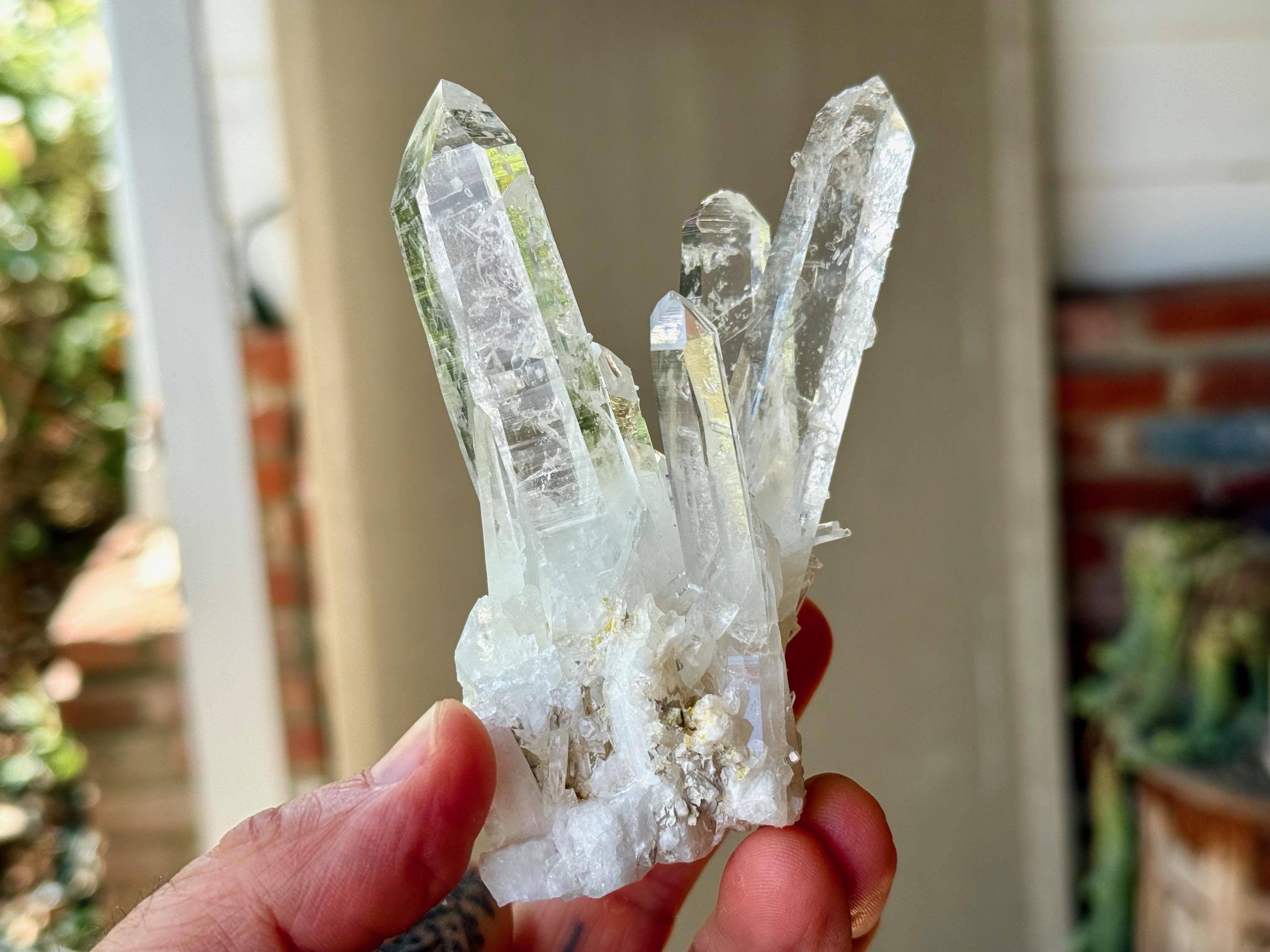 This crystal presents in a cluster formation with five individual, elongated Lemurian points sprouting up from a central matrix. Each crystal displays the same vitreous complexion and very finely etched striations.