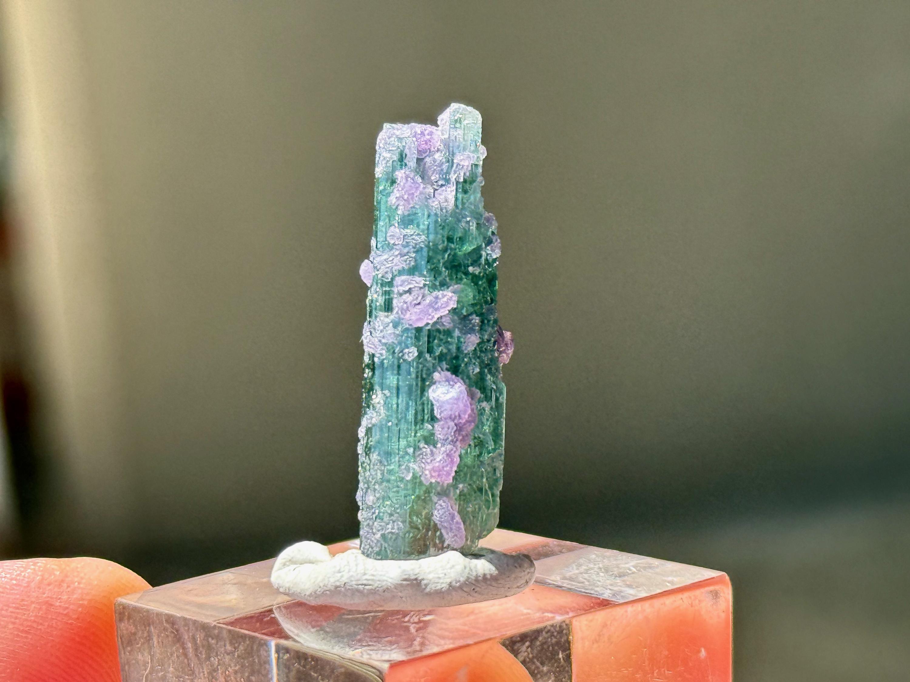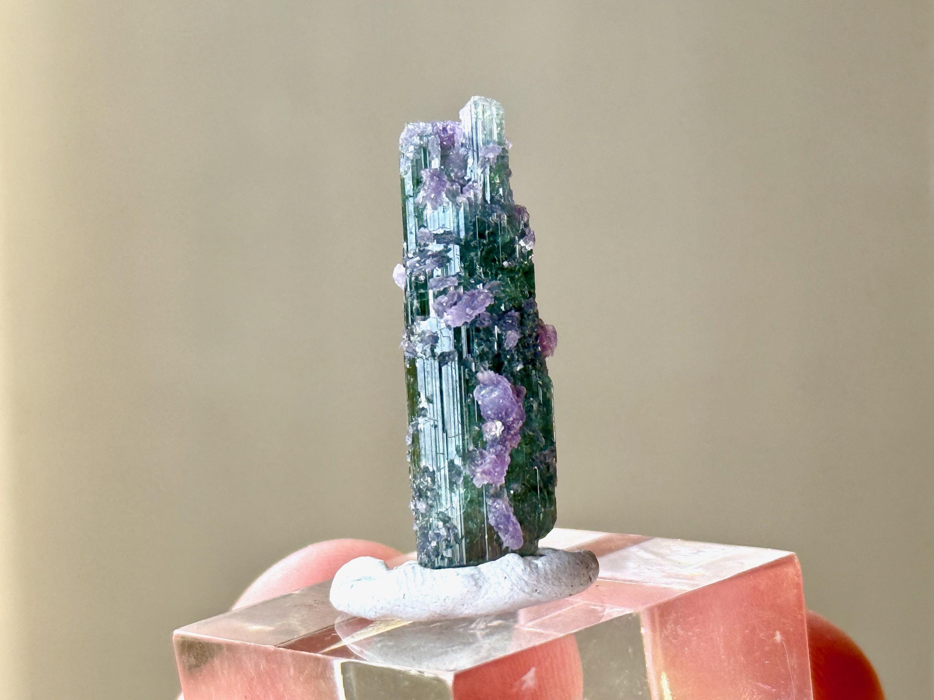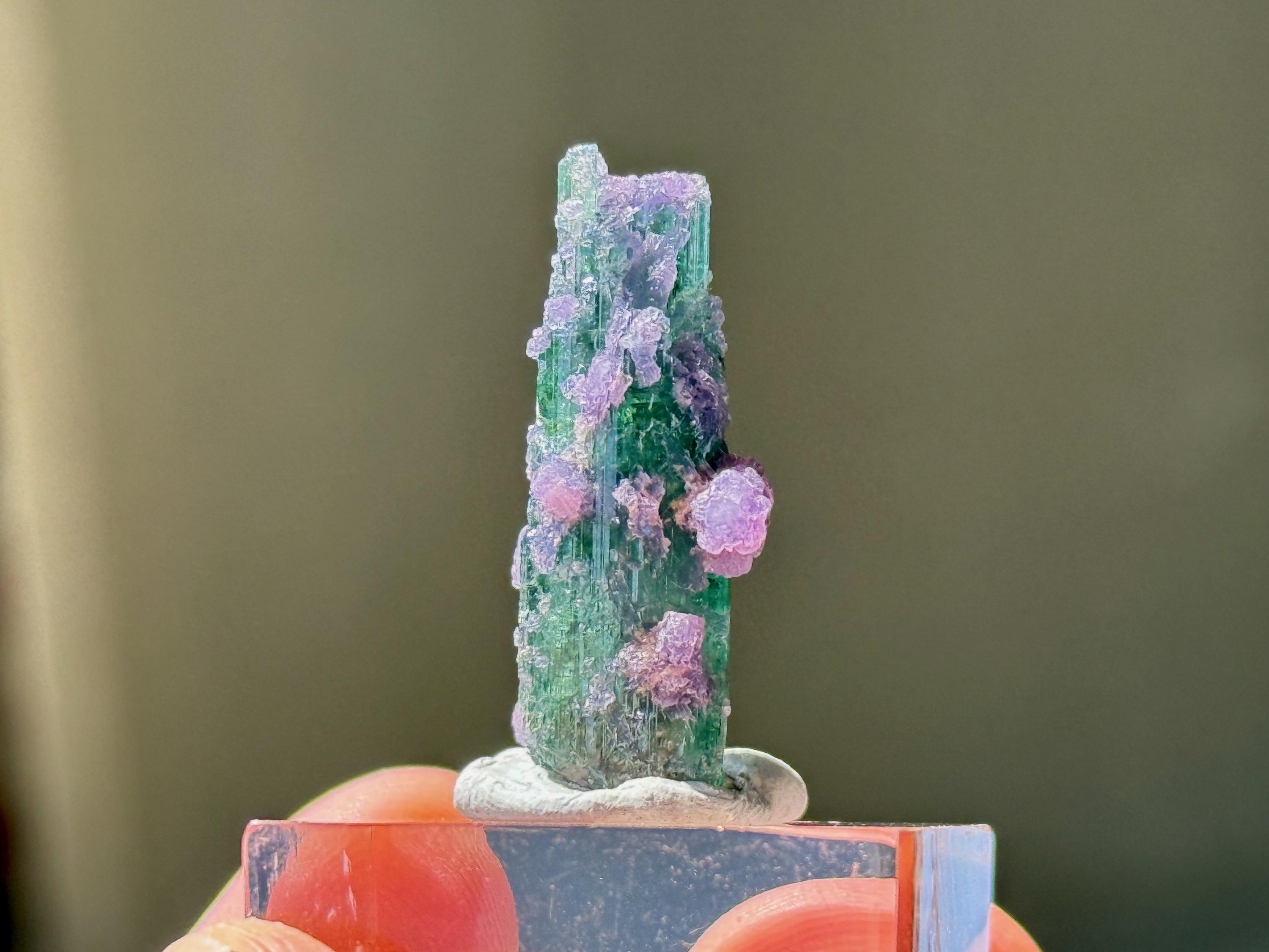 This crystal exhibits a glassy complexion with a clean ridged formation and a multitude of purple Lepidolite "barnacles" encrusted on the exterior.