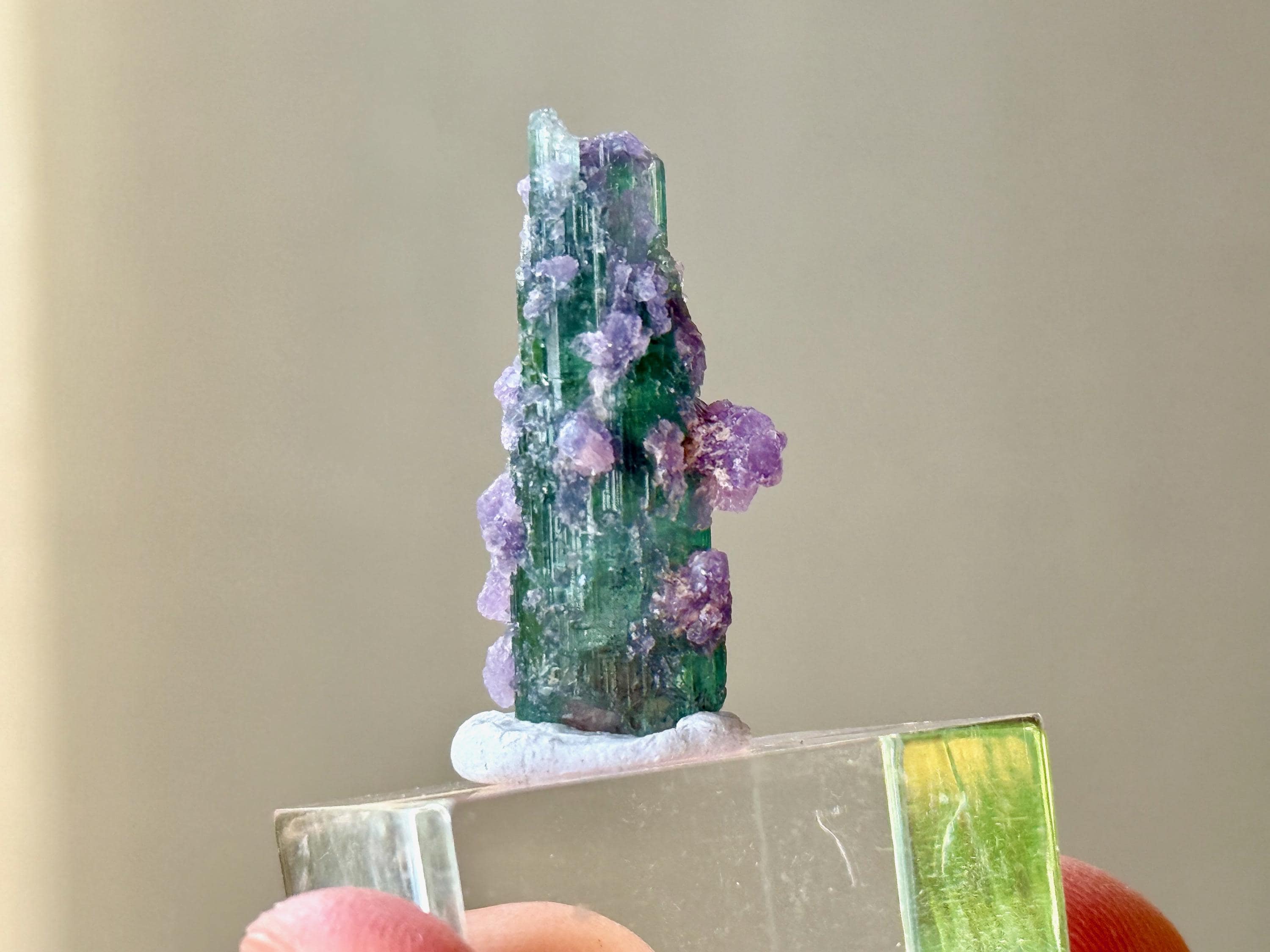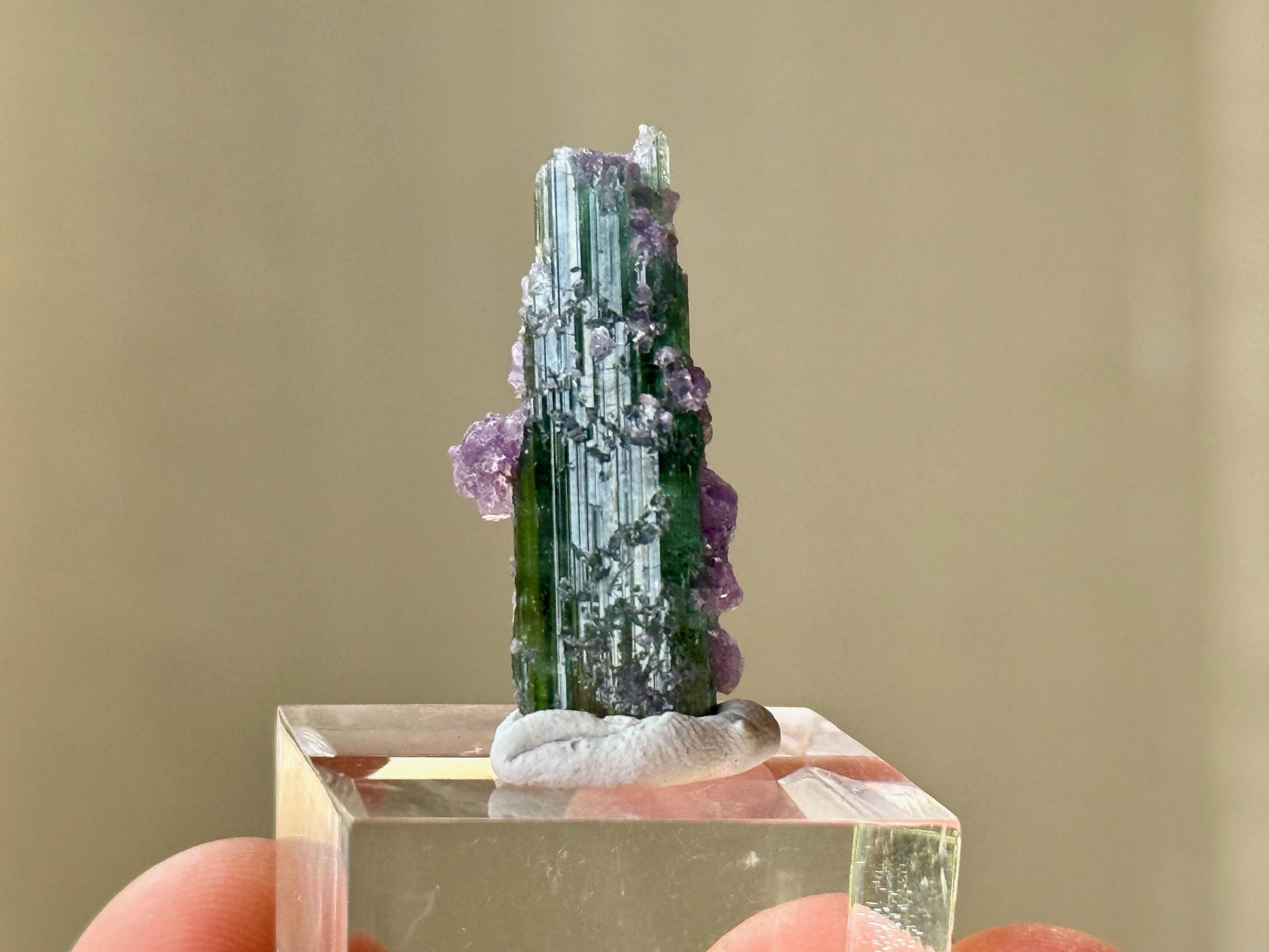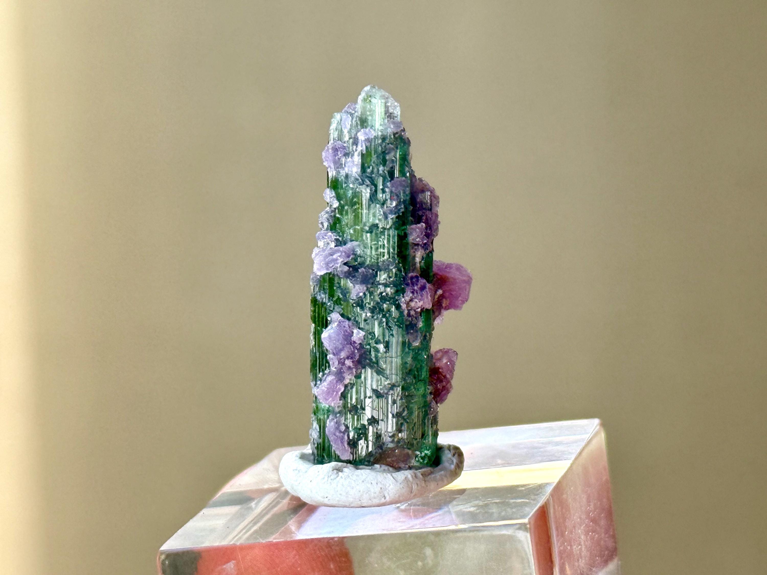 This crystal exhibits a glassy complexion with a clean ridged formation and a multitude of purple Lepidolite "barnacles" encrusted on the exterior.
