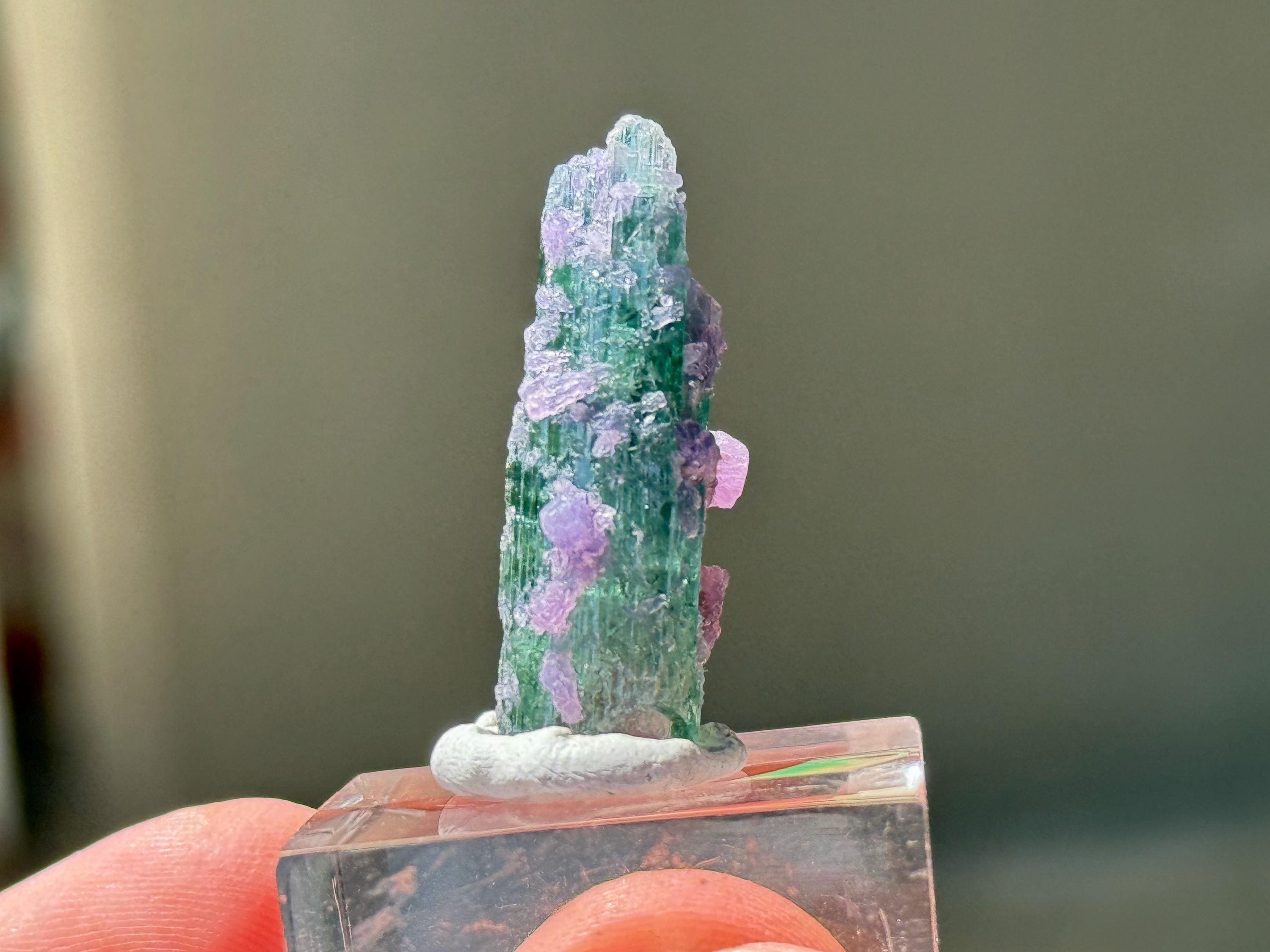 In a shaded or indoor environment, this crystal appears dark green (Photos 3-4). In direct sunlight, we start to see more of a Teal Blue color emerge (Photo 2). And when backlit, we see a glorious pale blue color come to life, with hints of pink at the base (Photos 1, 5-9).