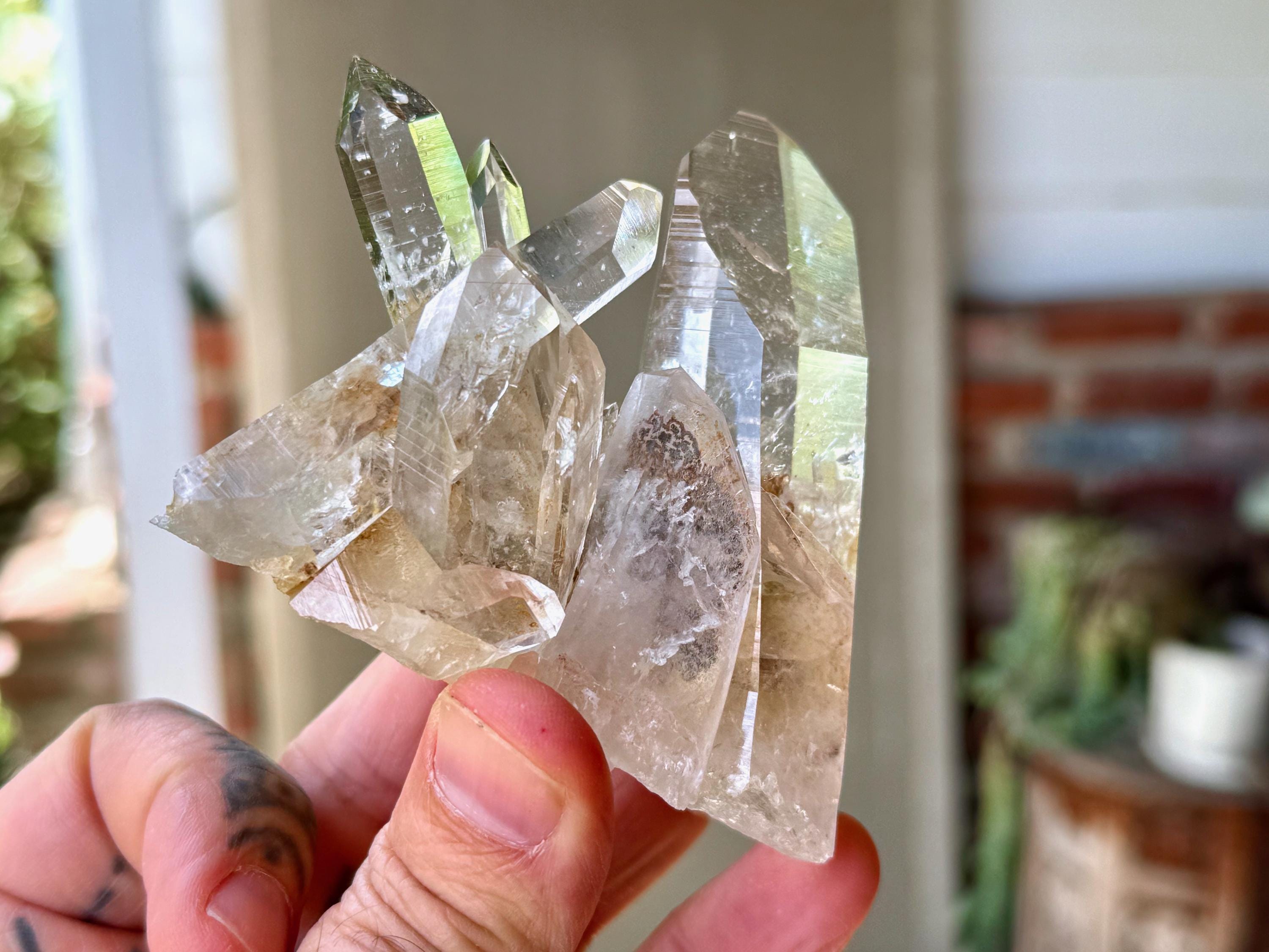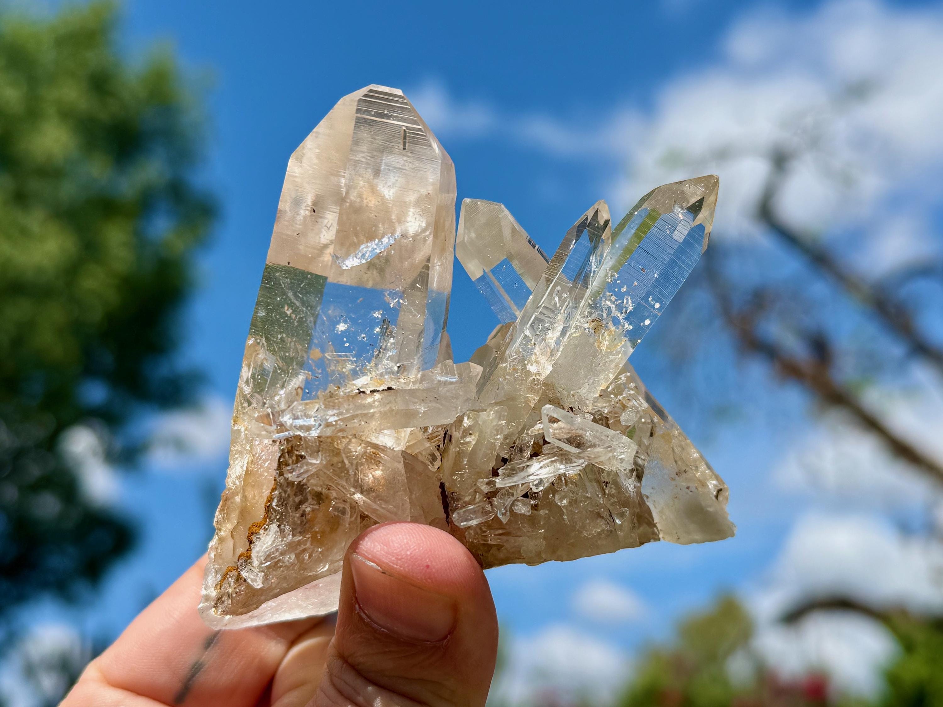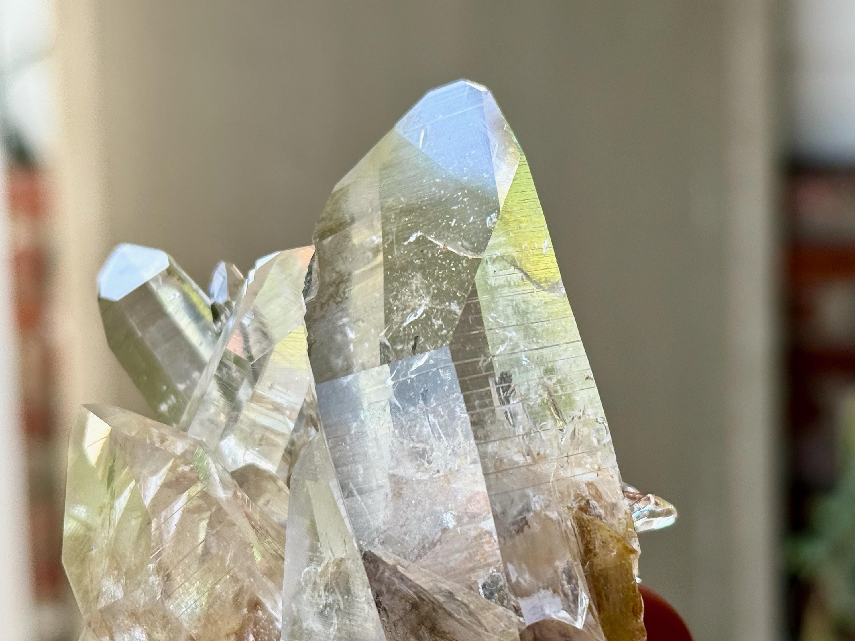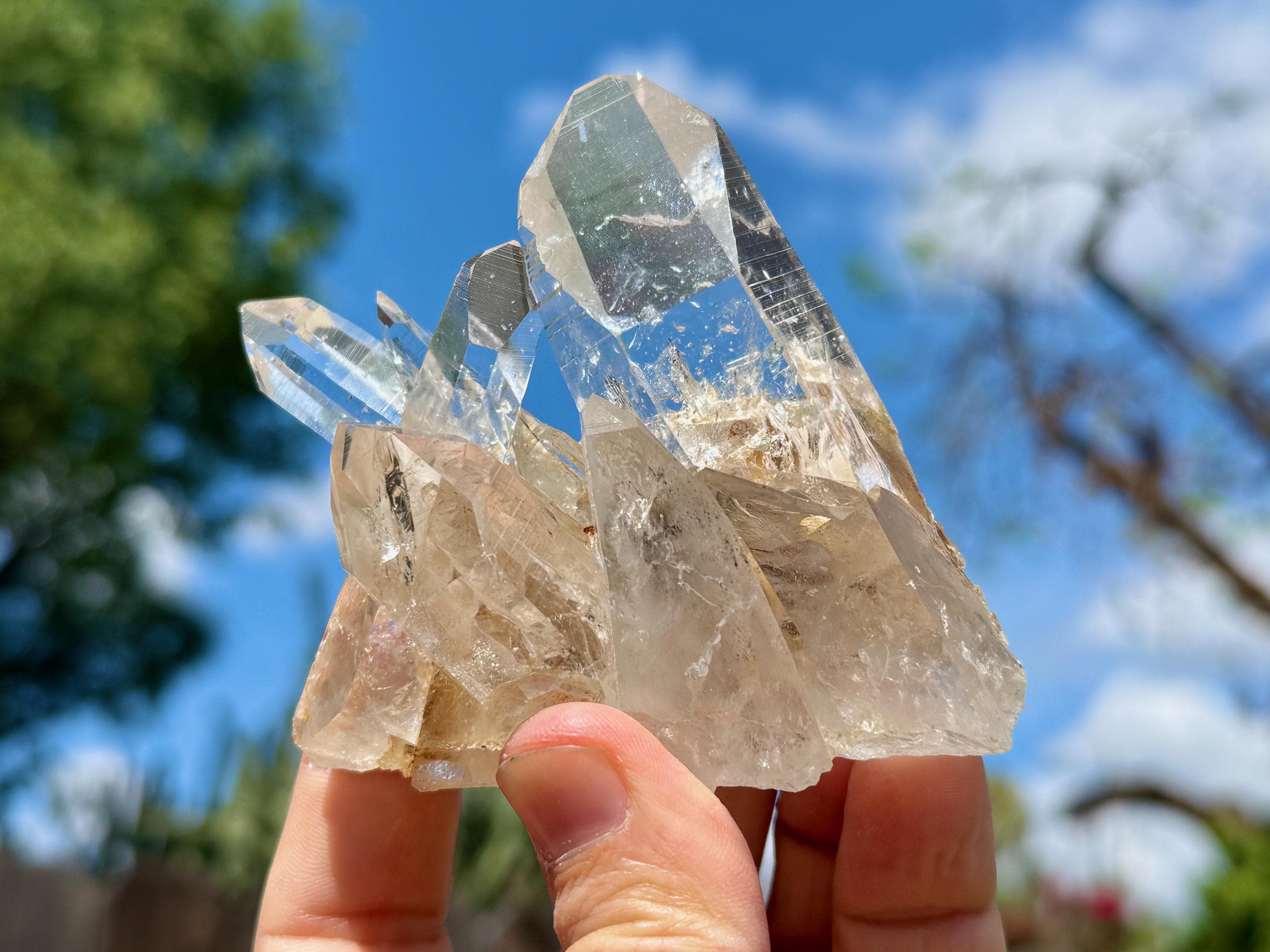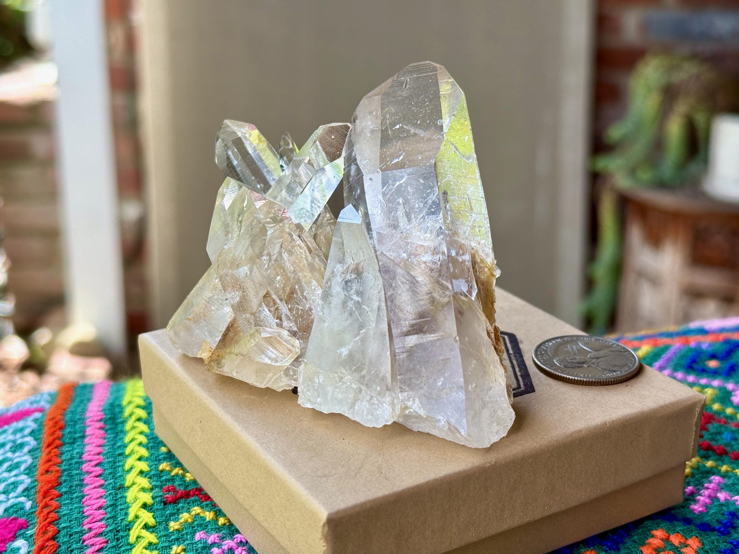 This crystal presents in a cluster formation with a large primary crystal and several smaller, elongated Lemurian points sprouting up from a central matrix. They criss-cross in a very aesthetic way! Each crystal displays the same vitreous complexion and very finely etched striations.