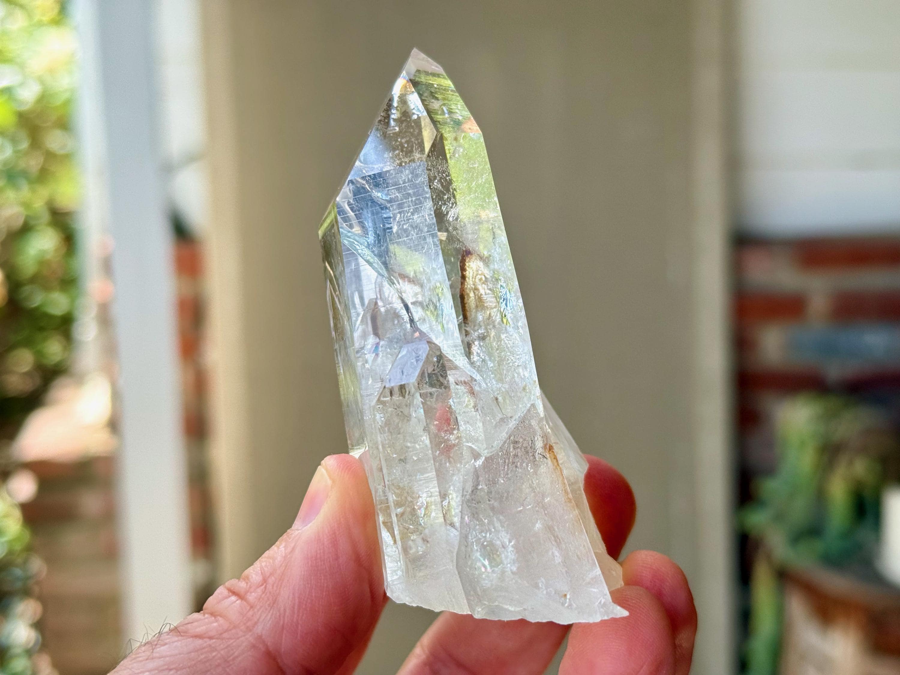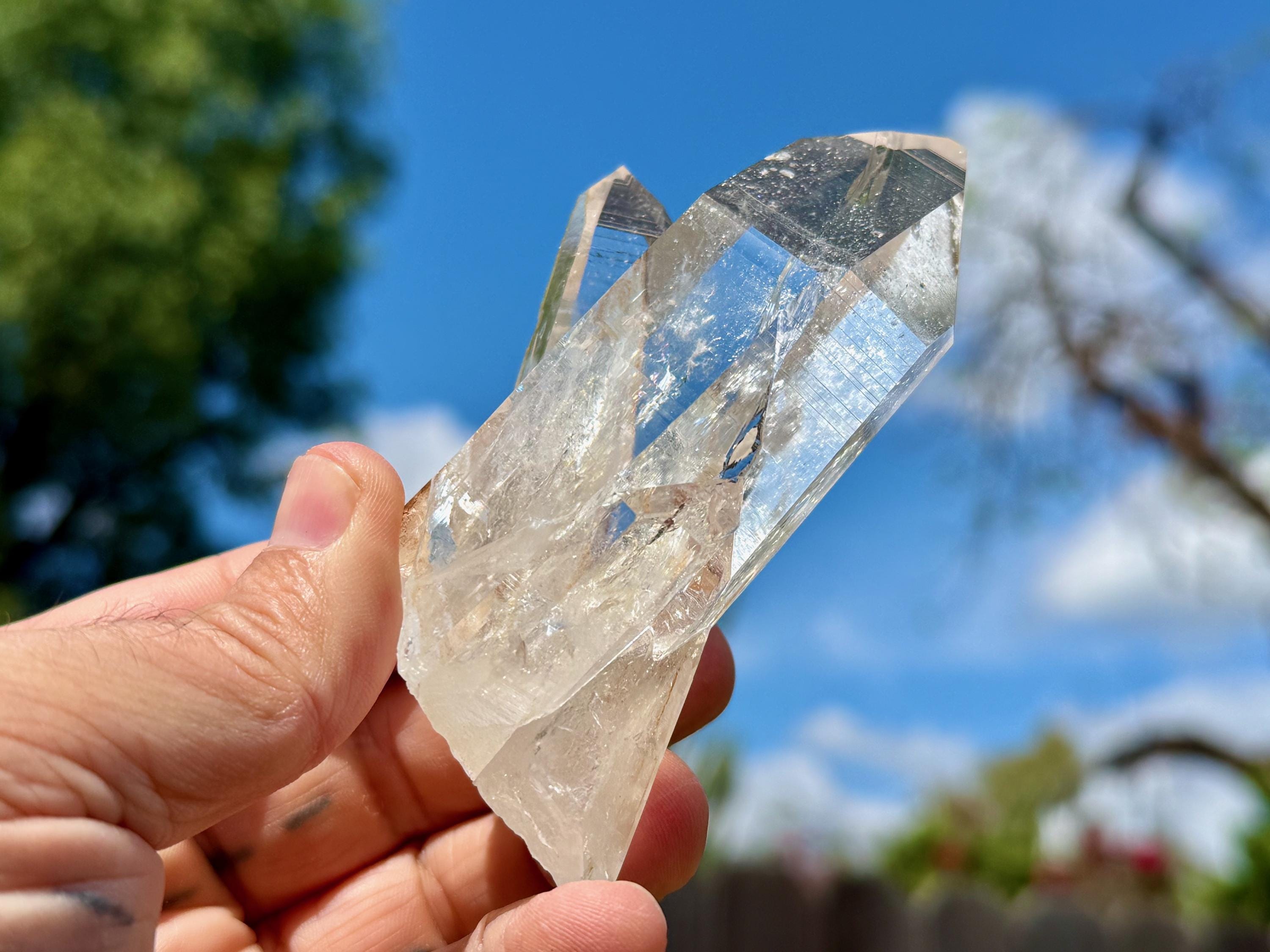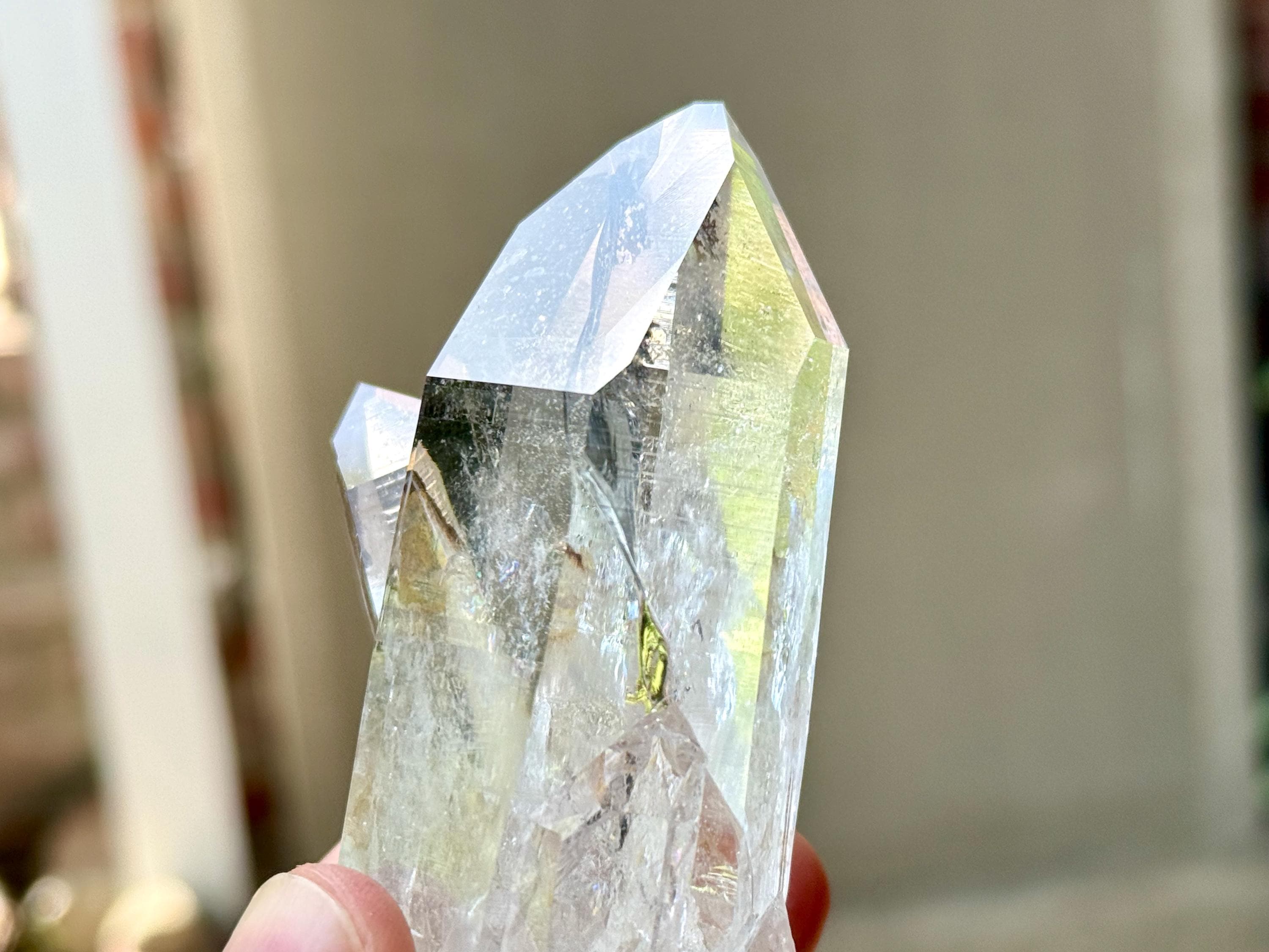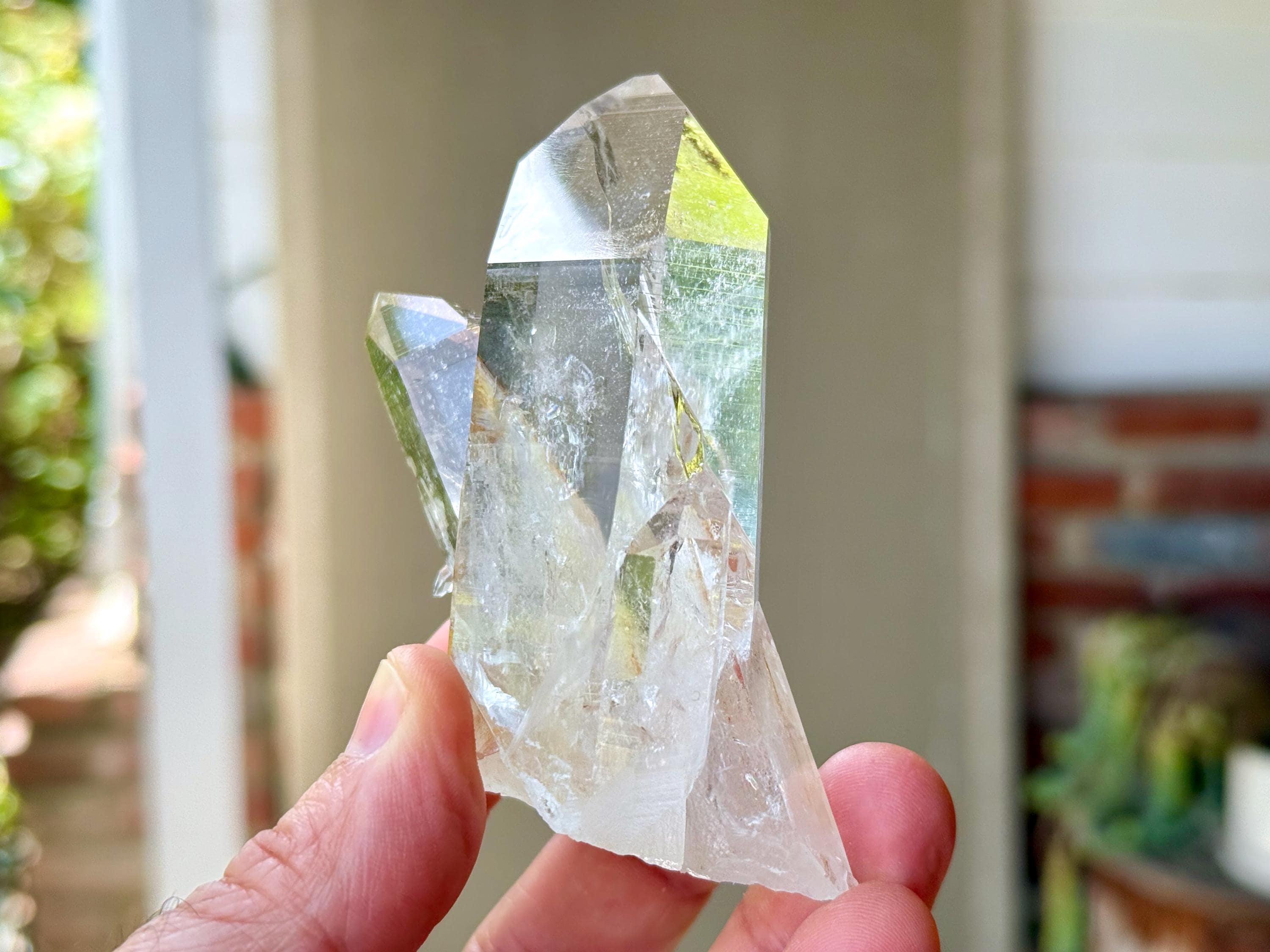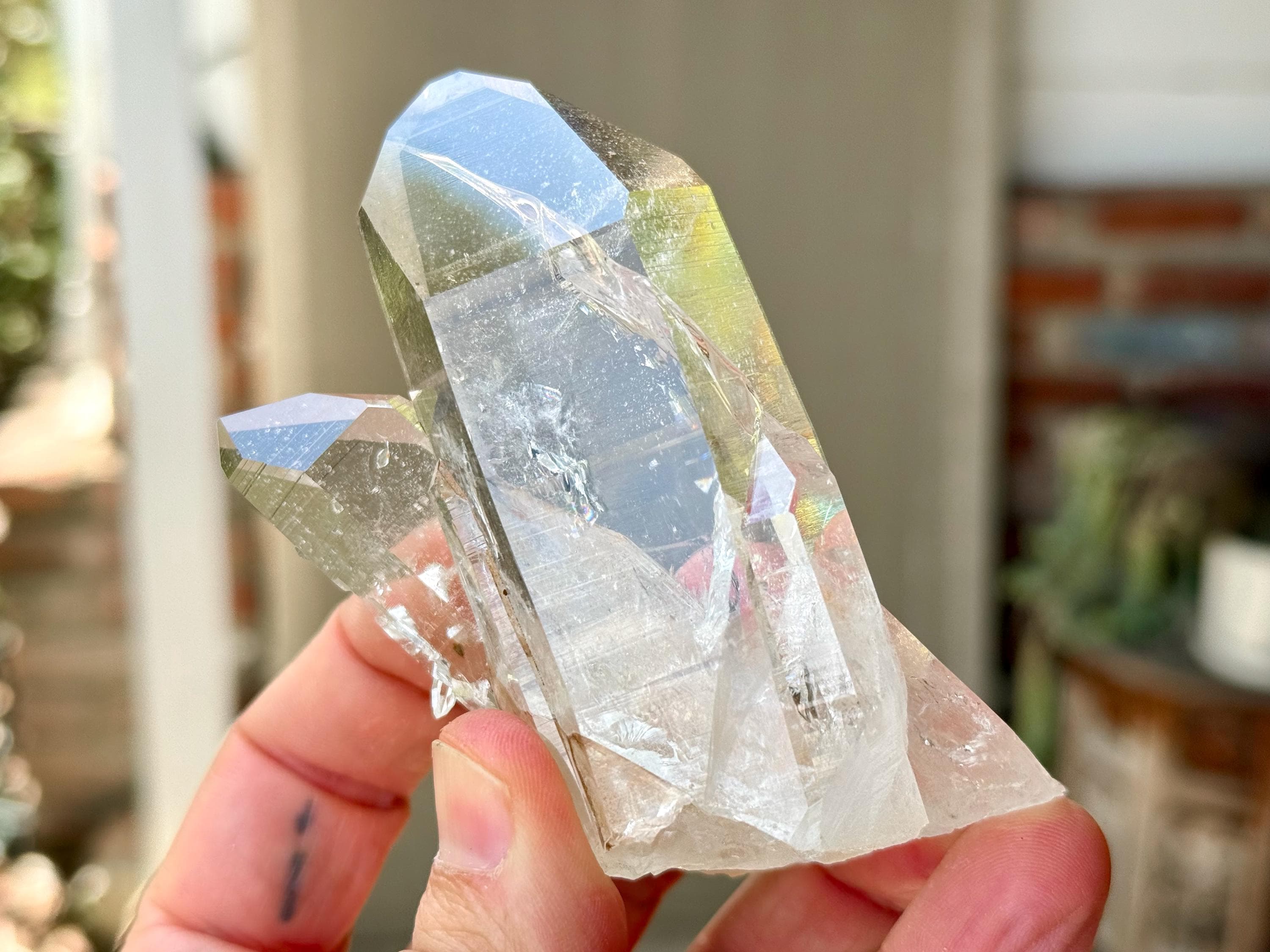 *Please note this crystal is clear and colorless. Any yellow hues in the photos are due to the natural sunlight and surrounding environment reflecting off the crystal.