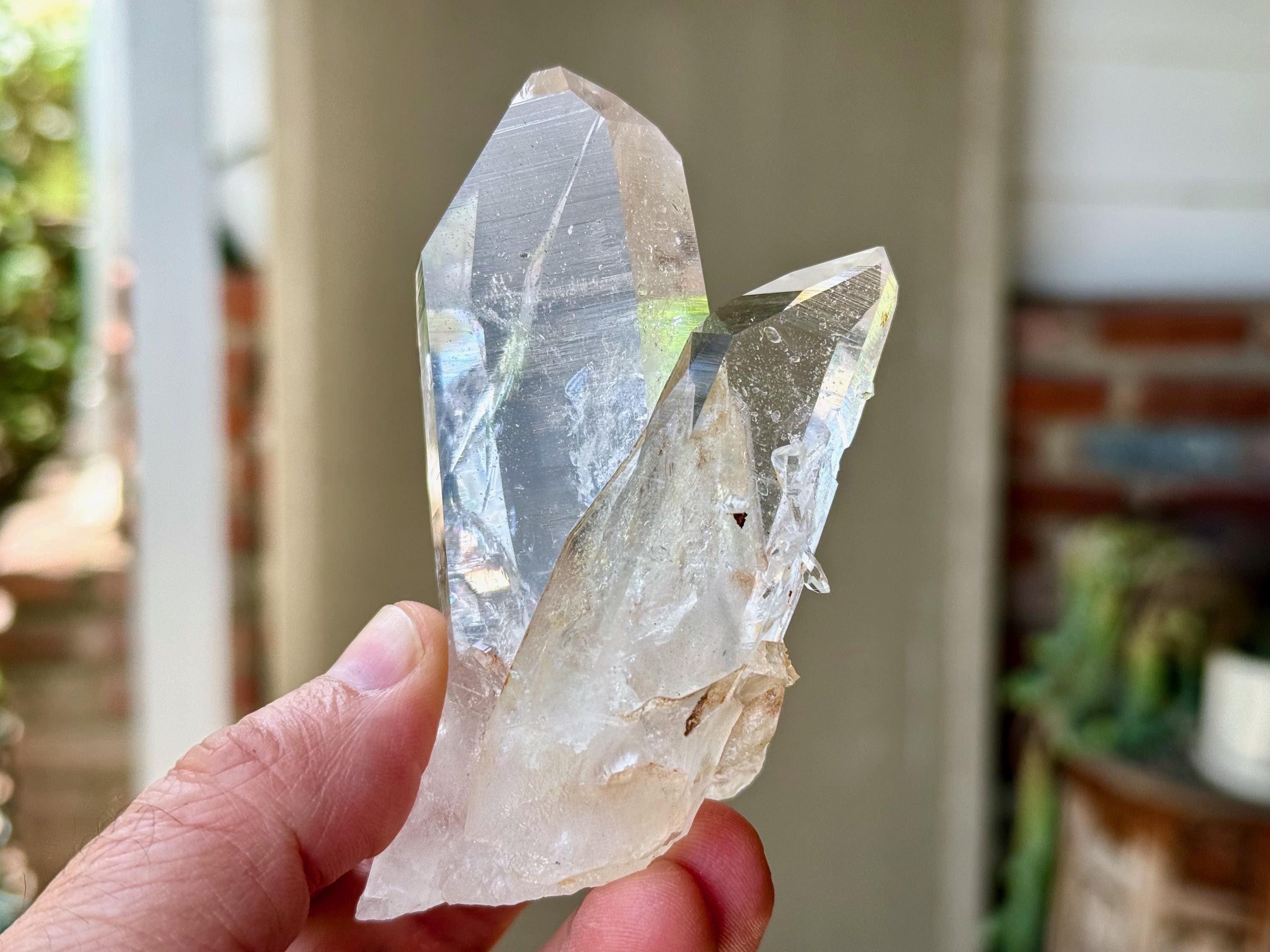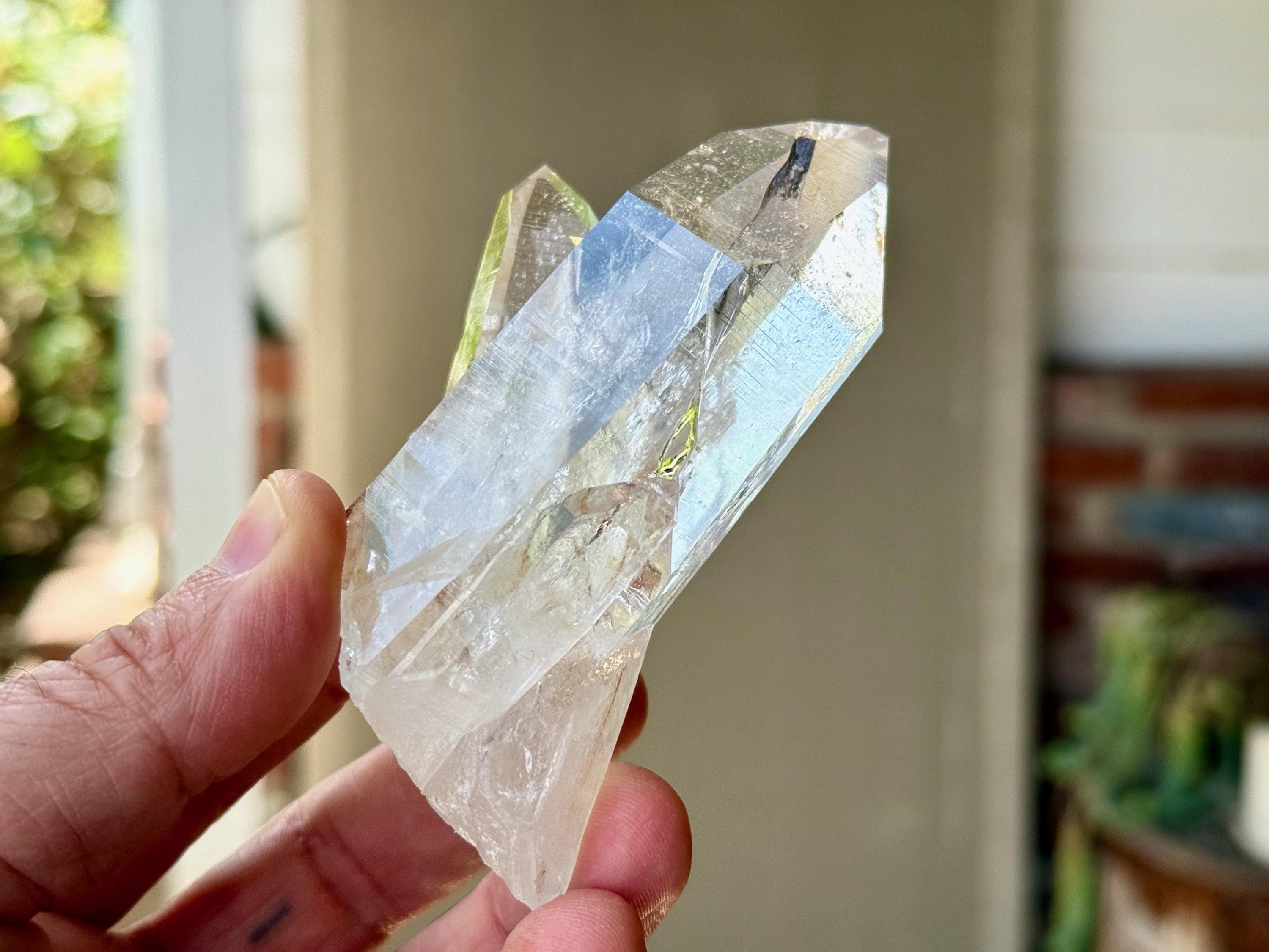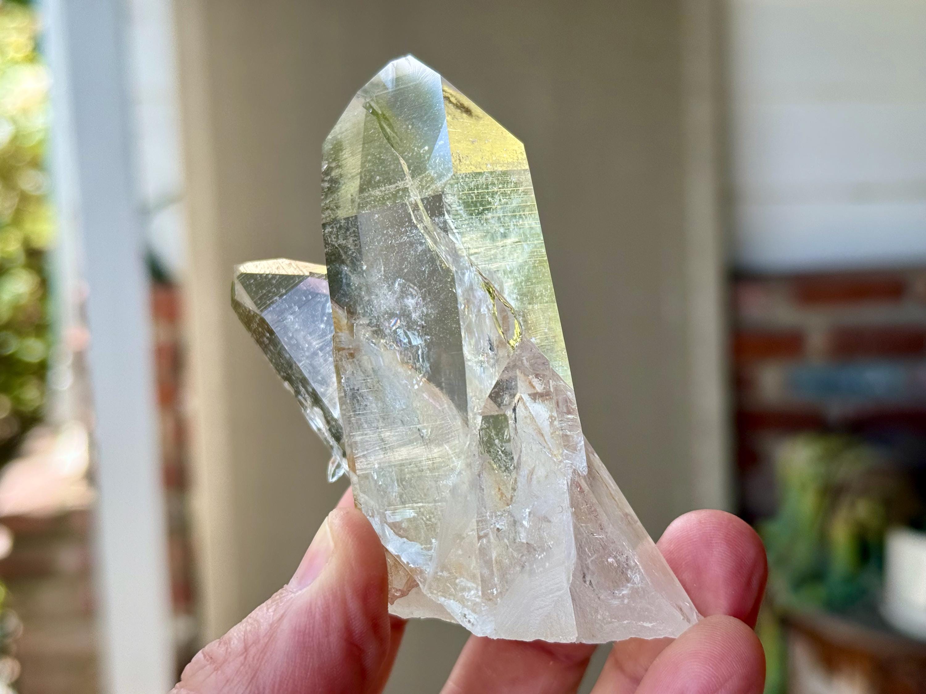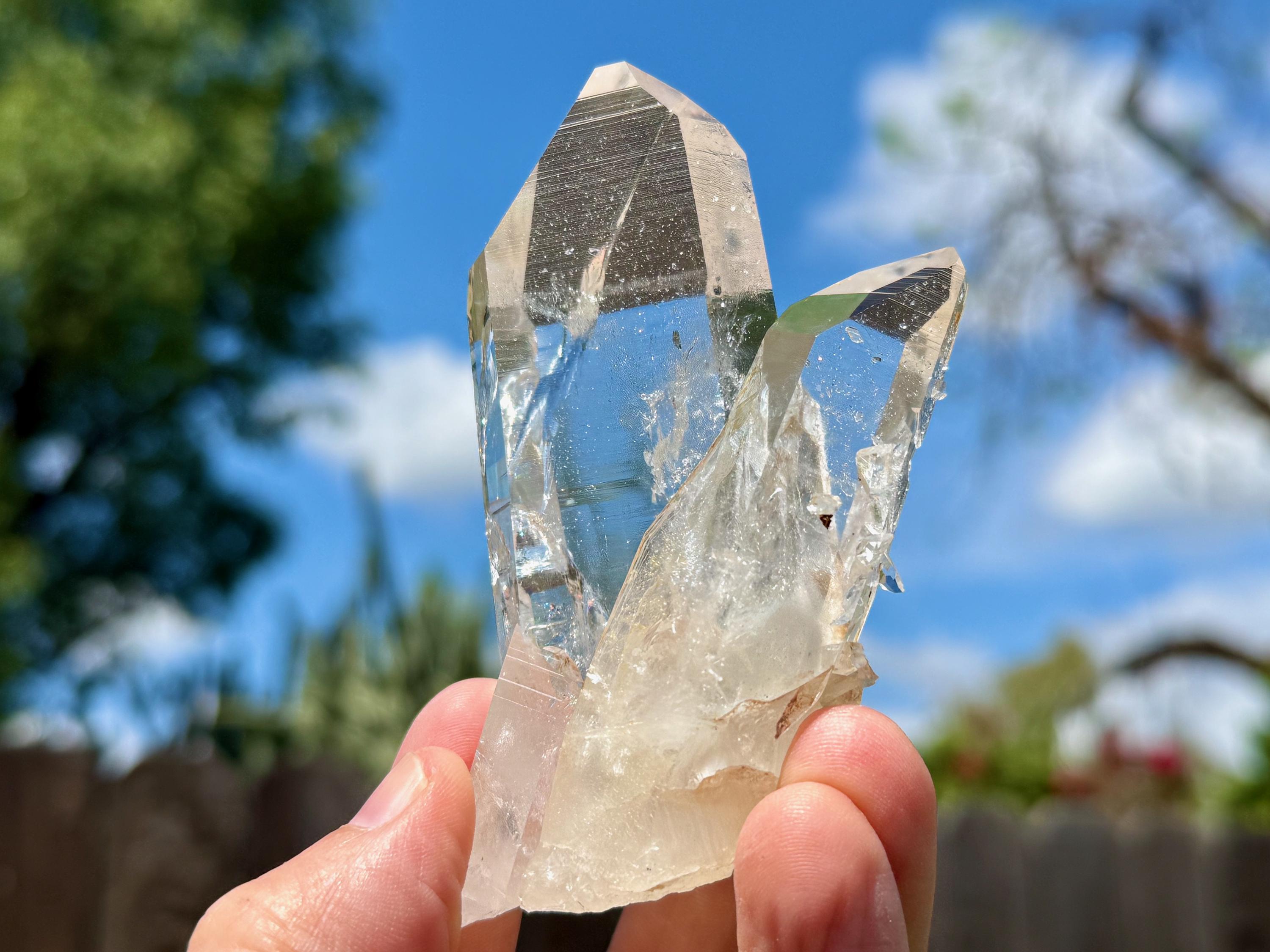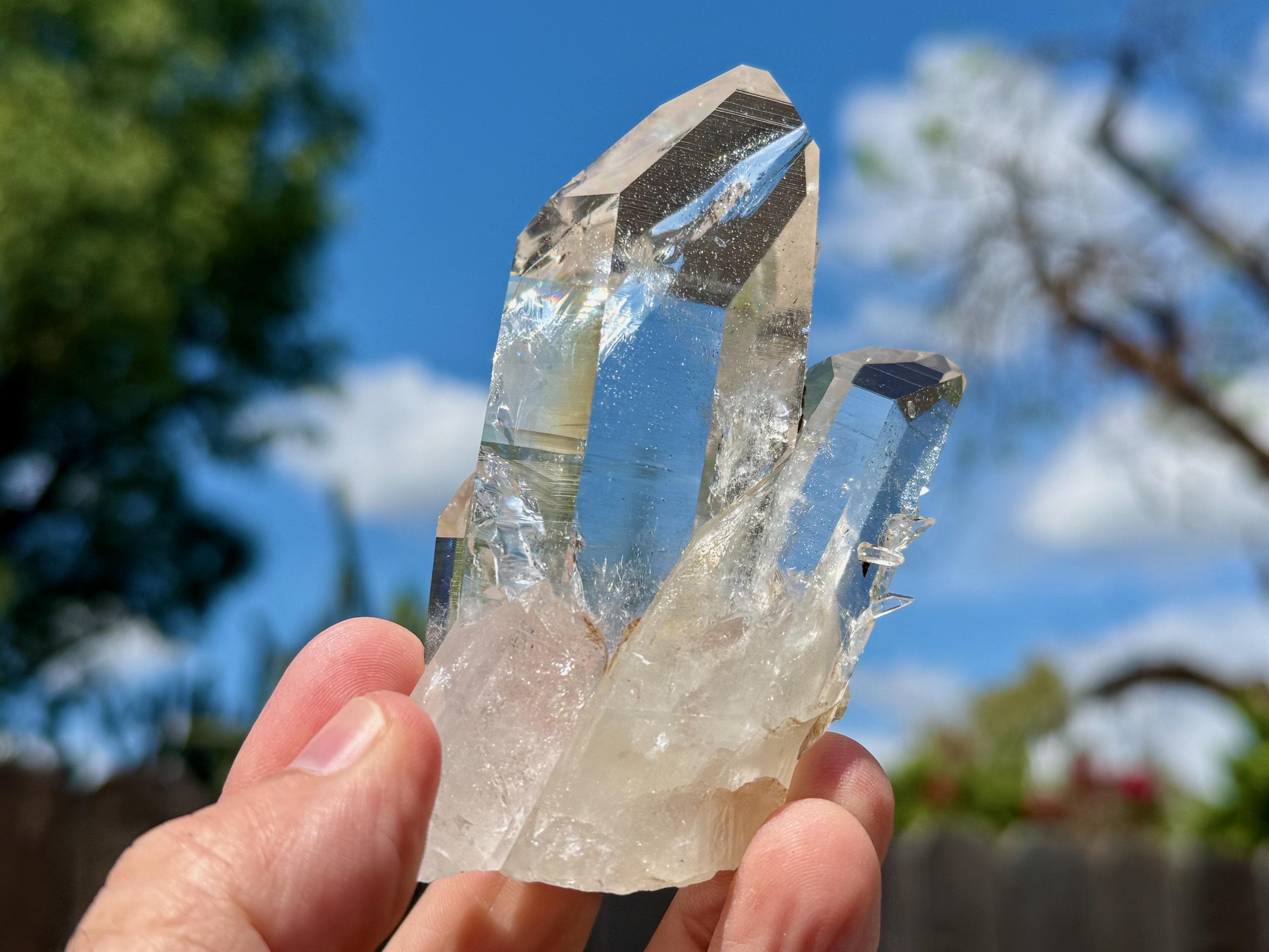 *Please note this crystal is clear and colorless. Any yellow hues in the photos are due to the natural sunlight and surrounding environment reflecting off the crystal.