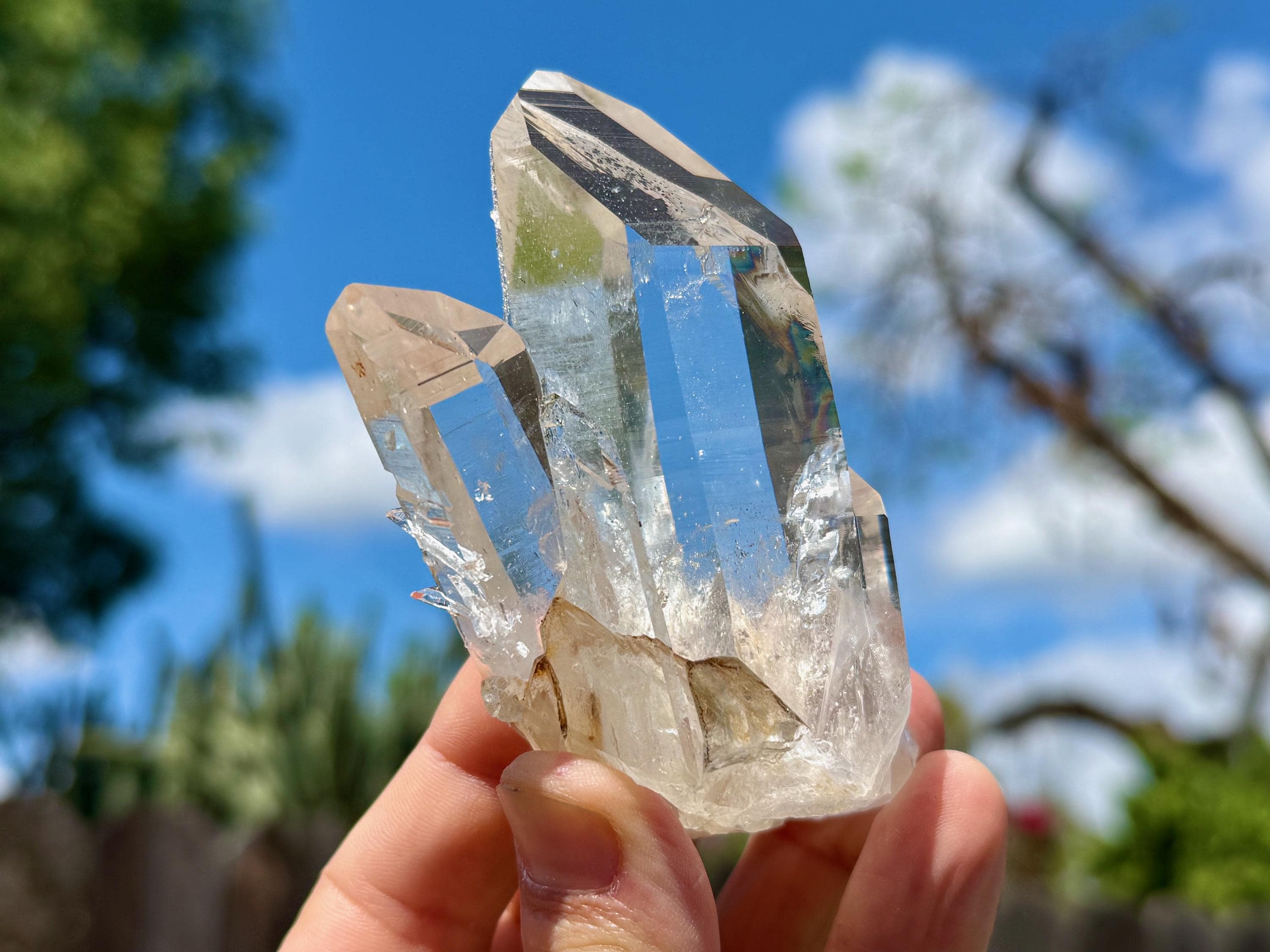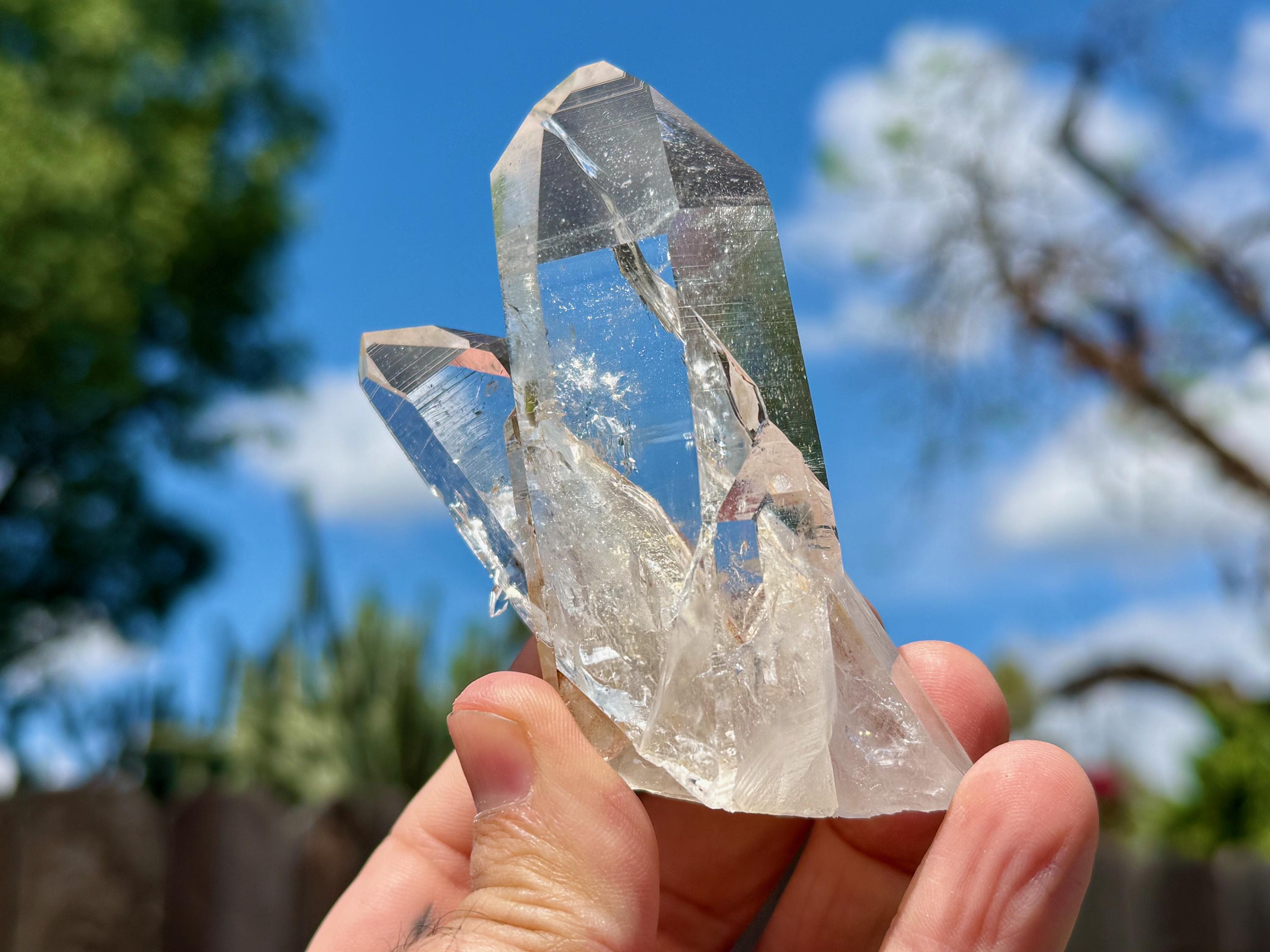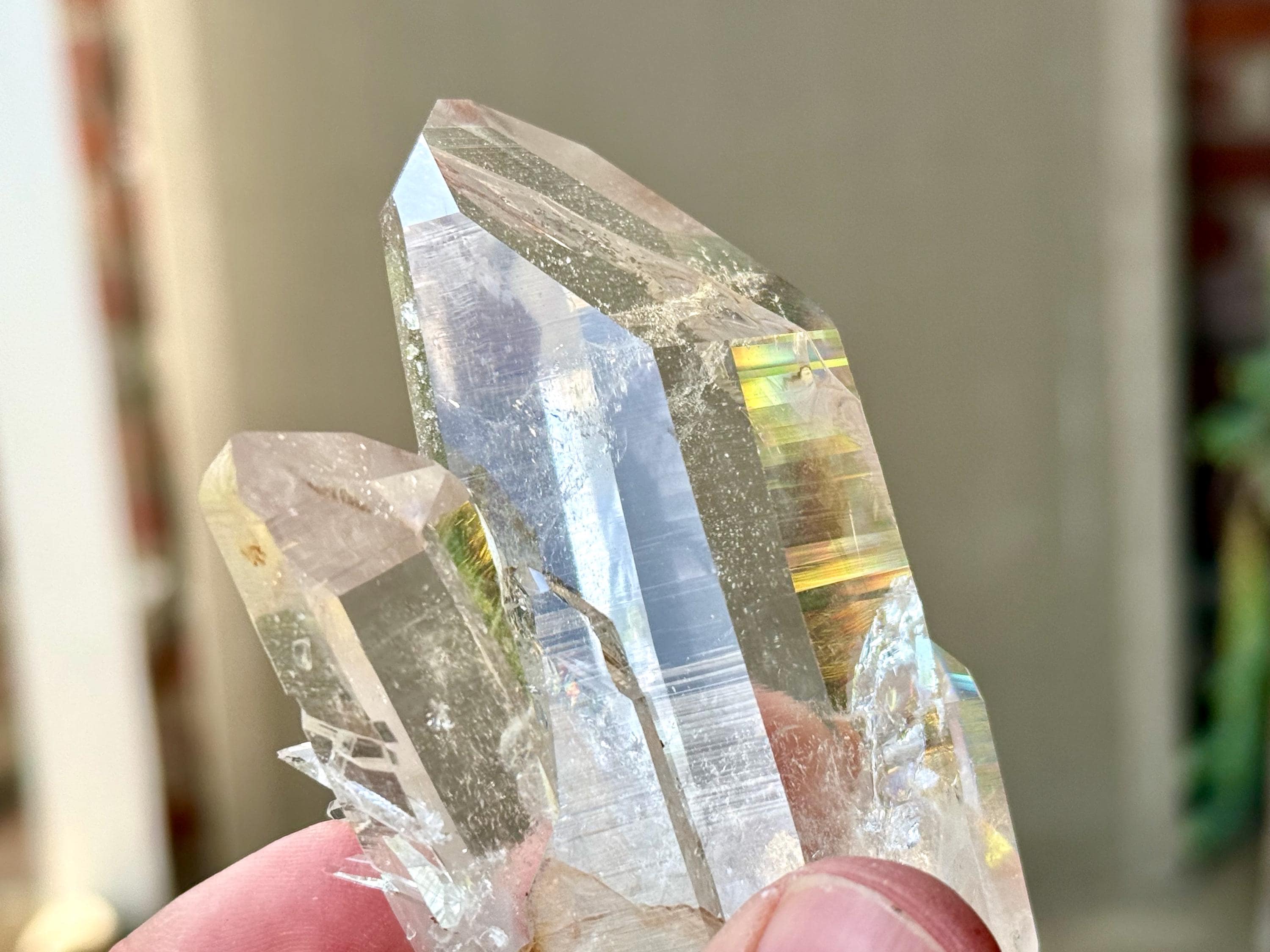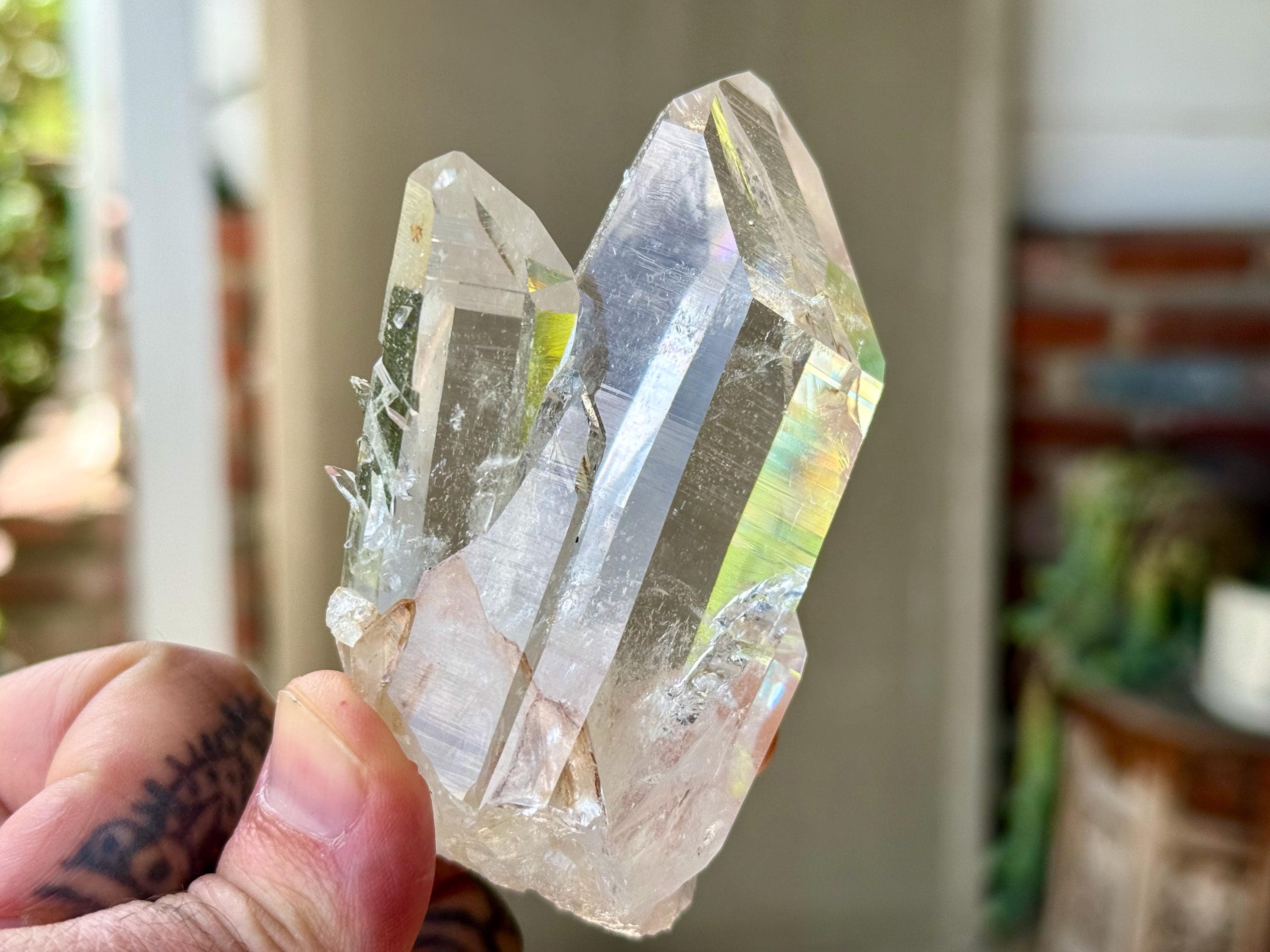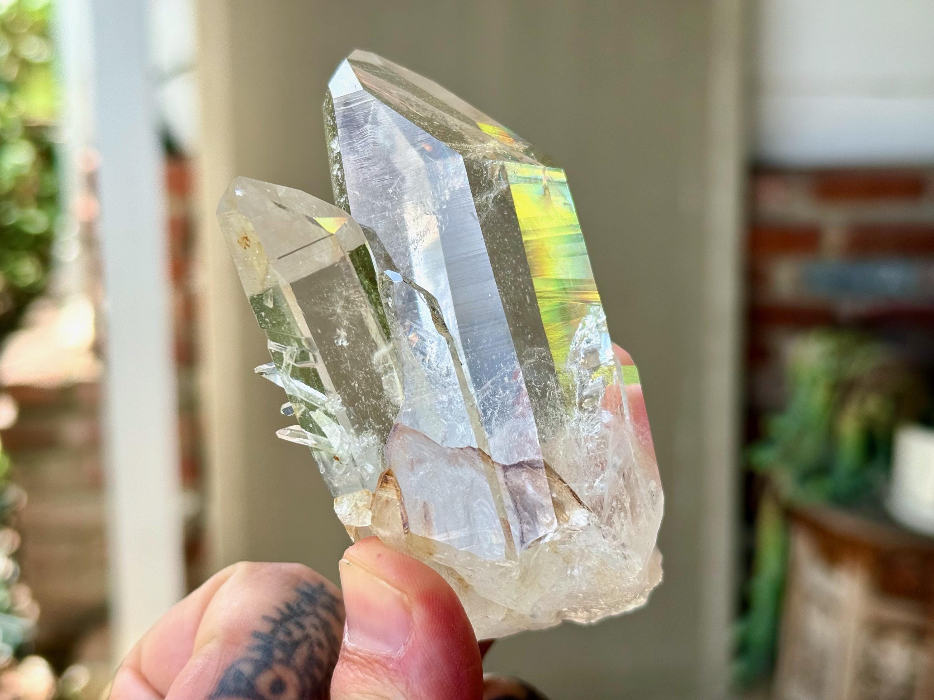 *Please note this crystal is clear and colorless. Any yellow hues in the photos are due to the natural sunlight and surrounding environment reflecting off the crystal.