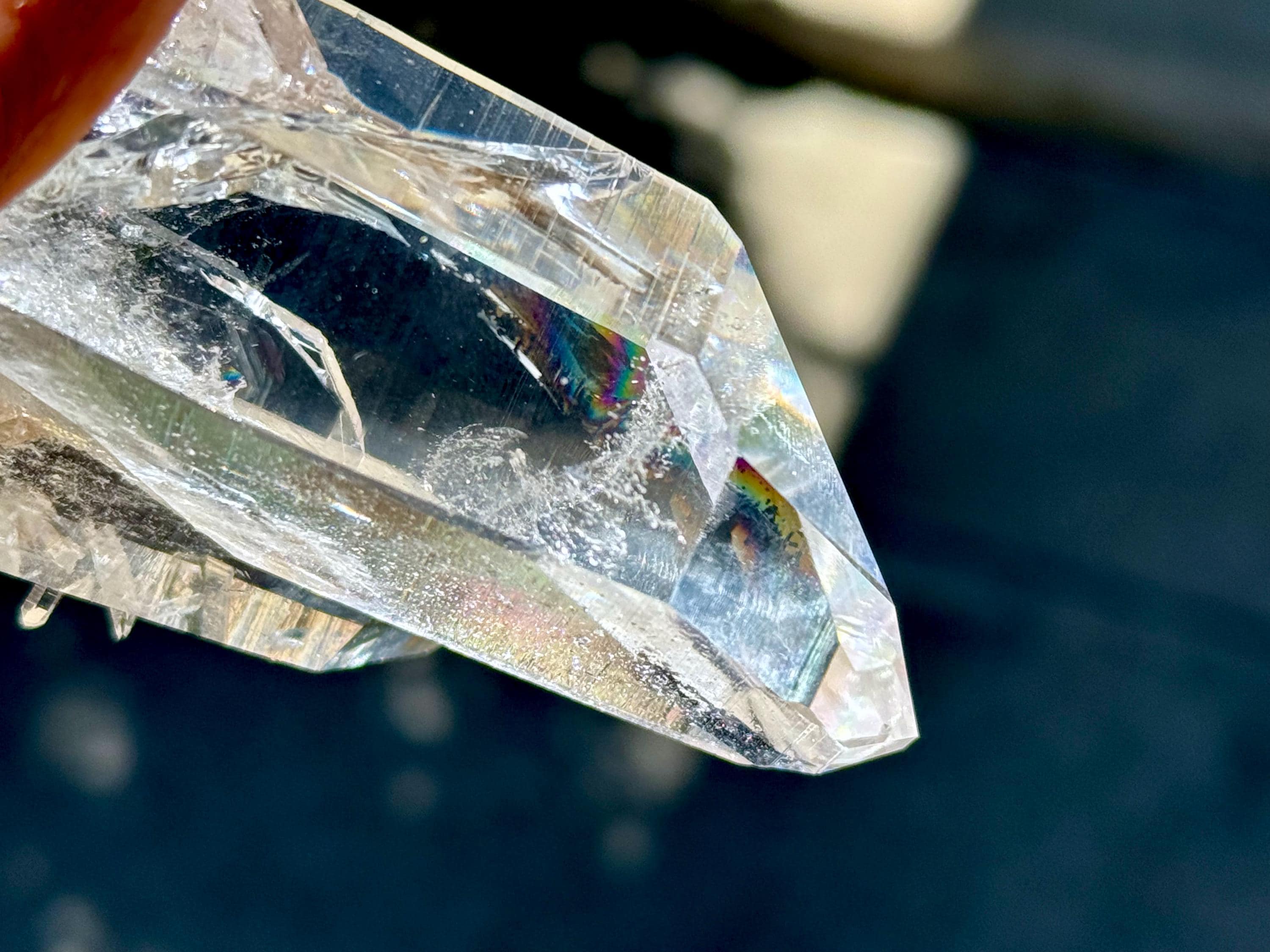 This crystal is a "Mother and Child" formation, with a smaller "child" crystal nested by the larger "mother." The primary crystal displays a foil-like inclusion that is actually a self-healed indication, showing where this crystal experienced an internal fracture while in the Earth and managed to heal itself over millions of years. This inclusion results in a brilliant rainbow at the right light and angle (Photo 3 + video).