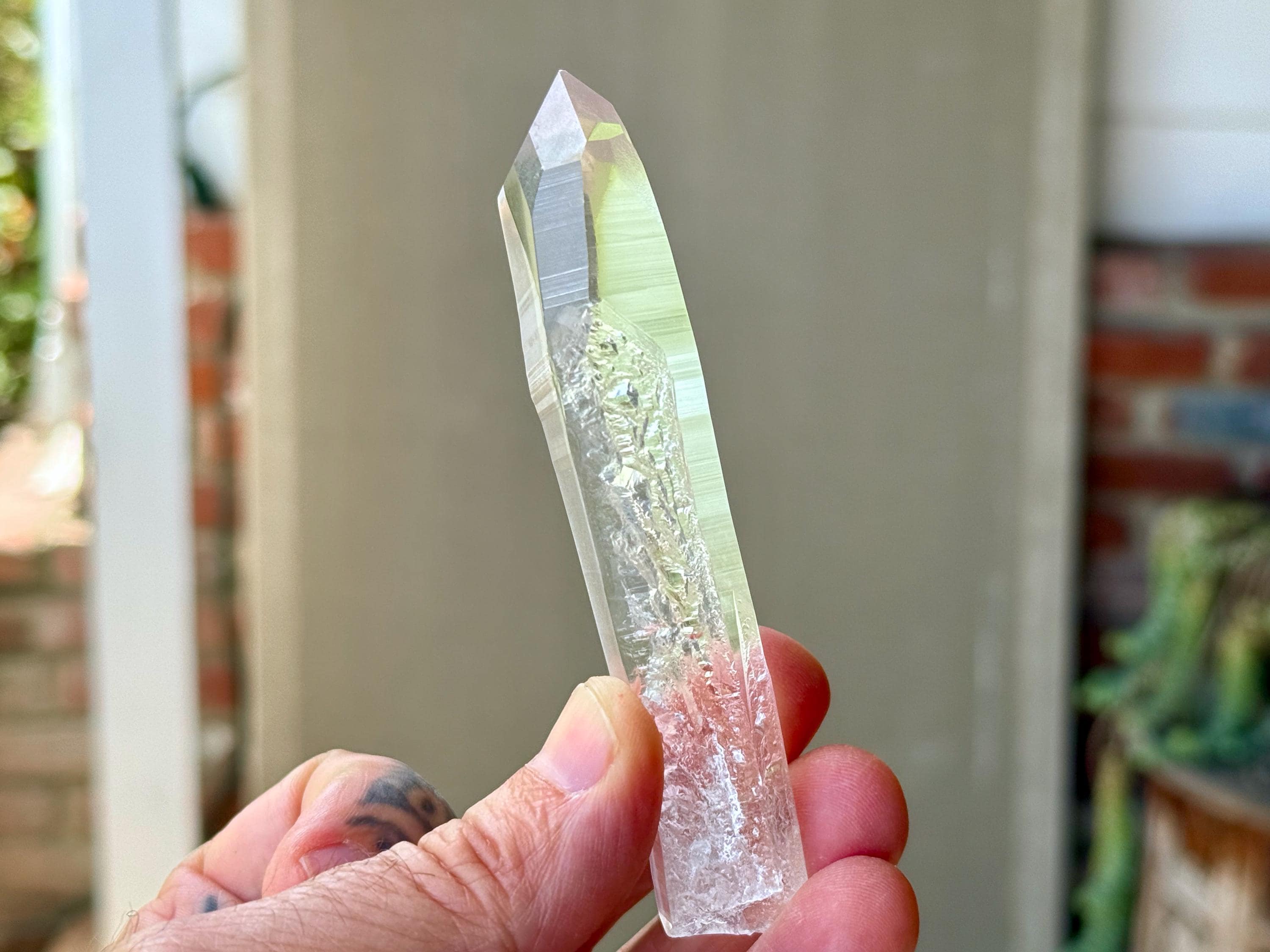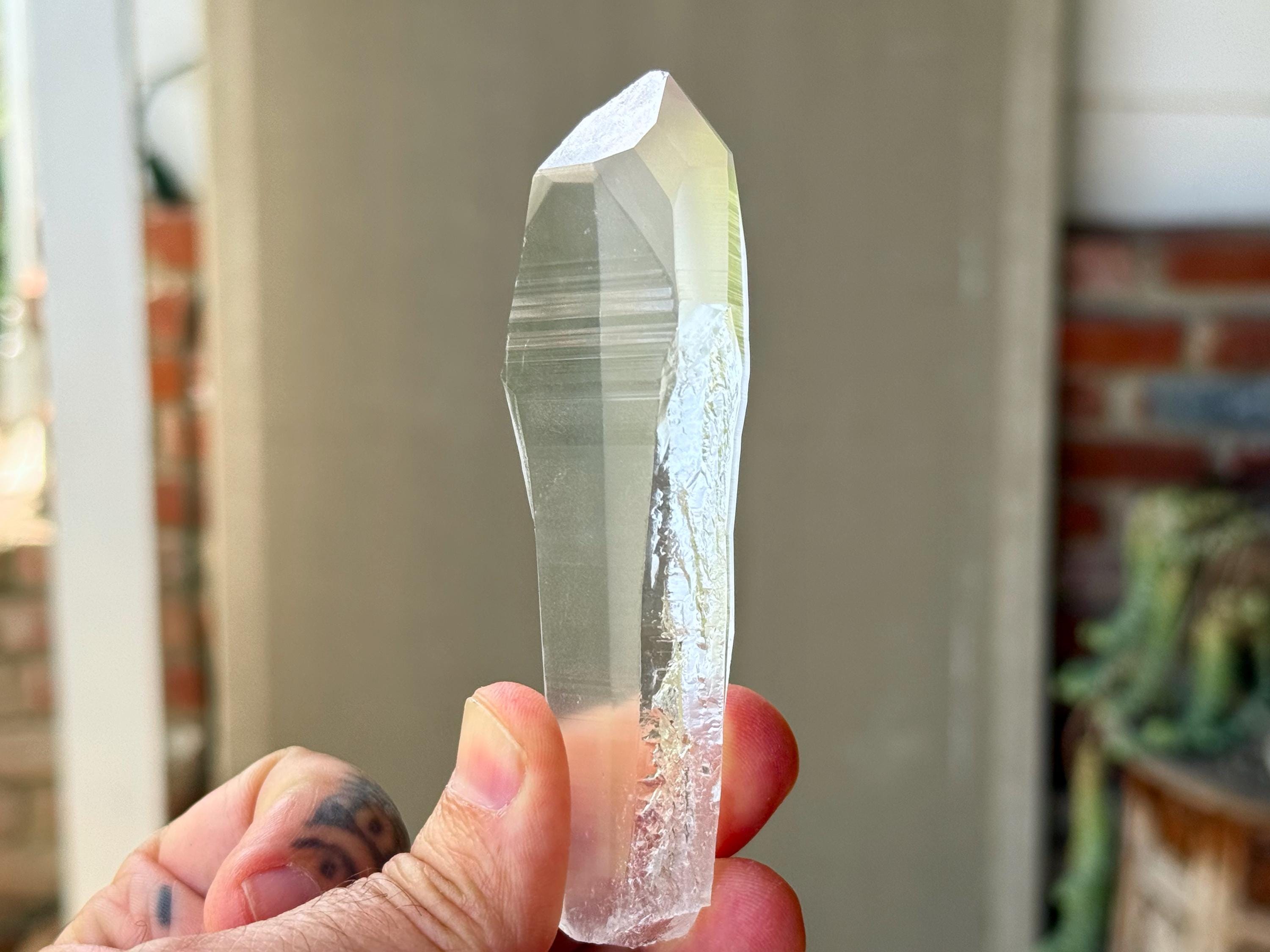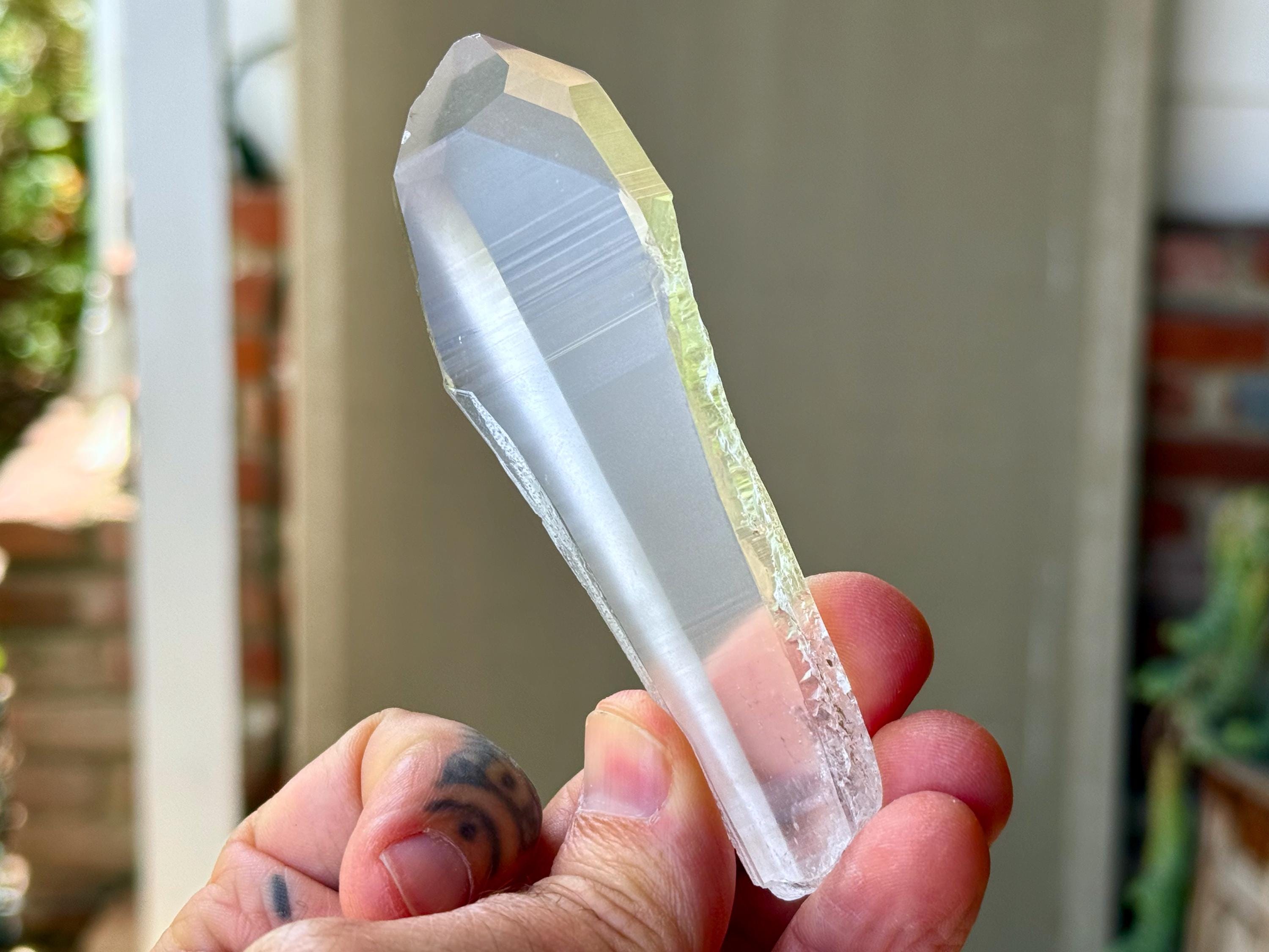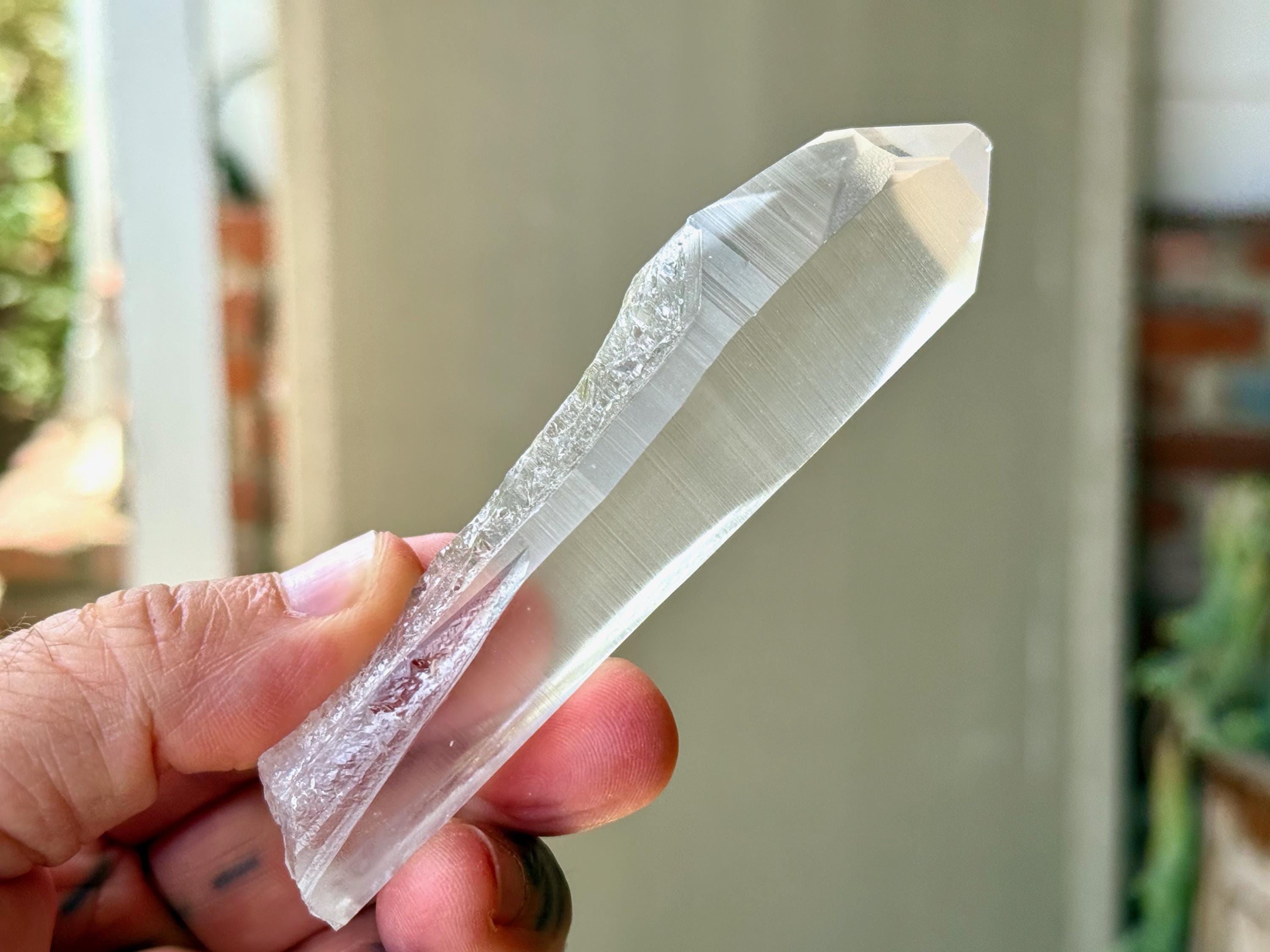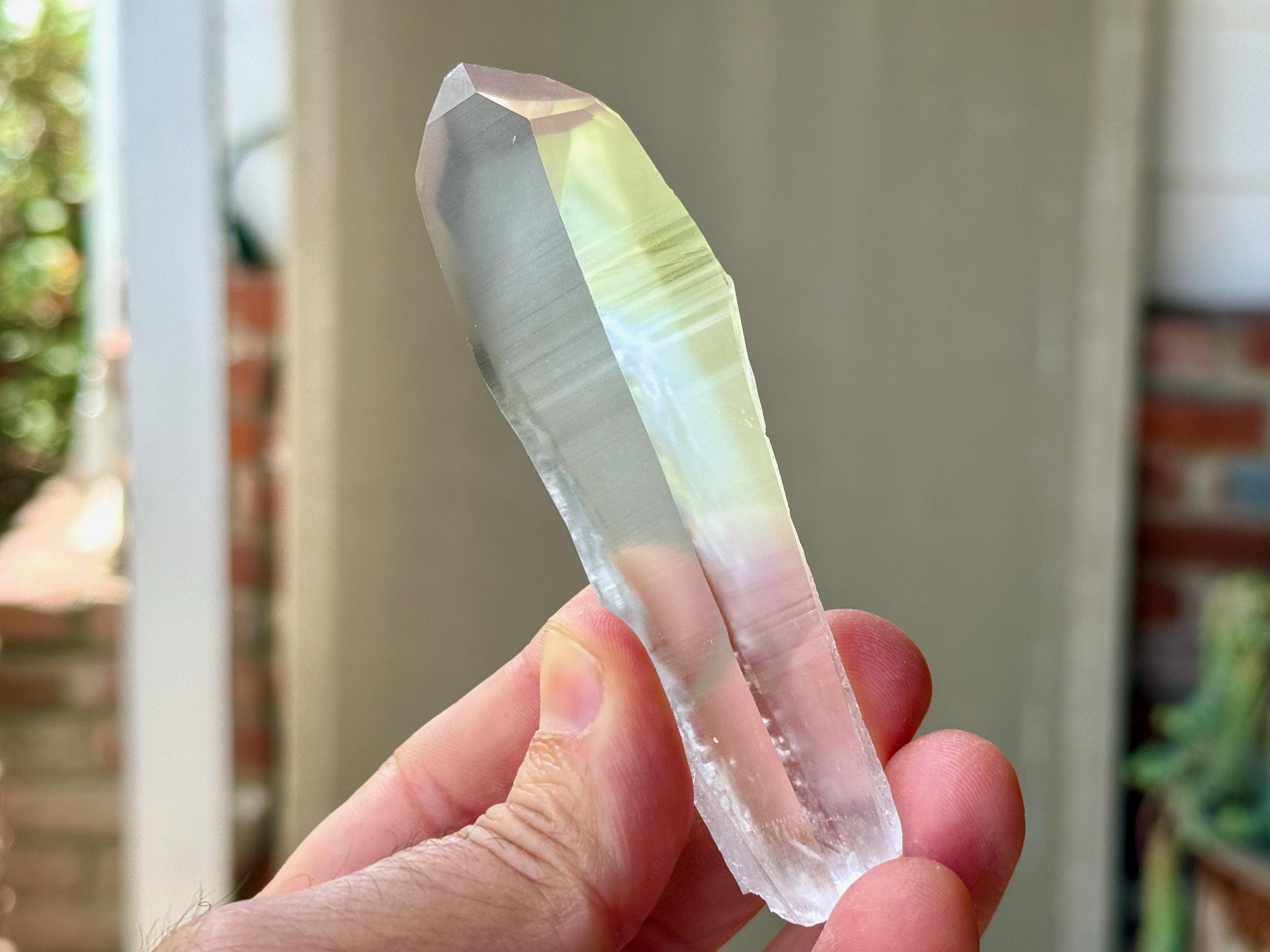 *Please note this crystal is clear and colorless. Any yellow hues in the photos are a result of the natural sunlight and surrounding environment reflecting off the crystal.