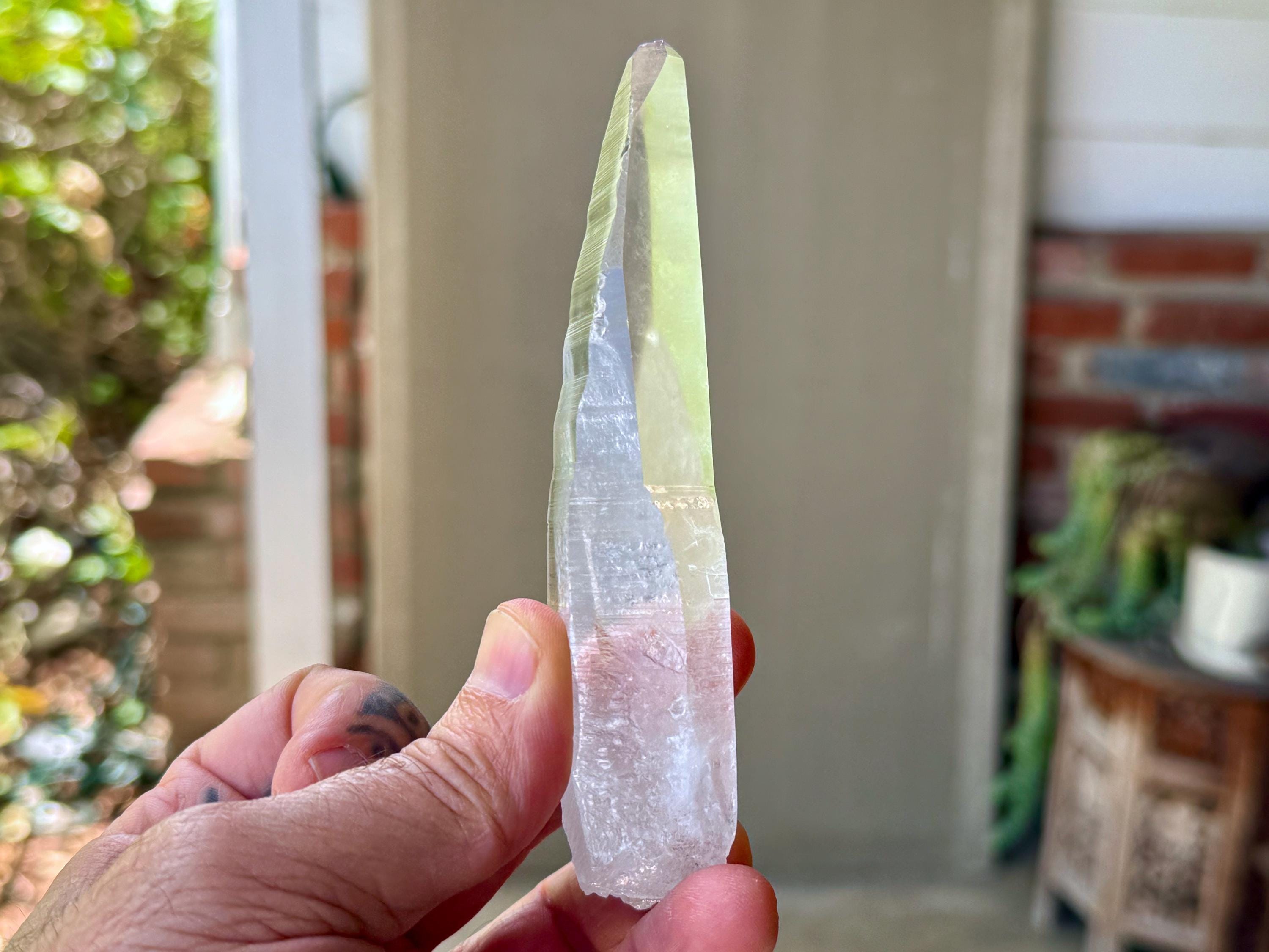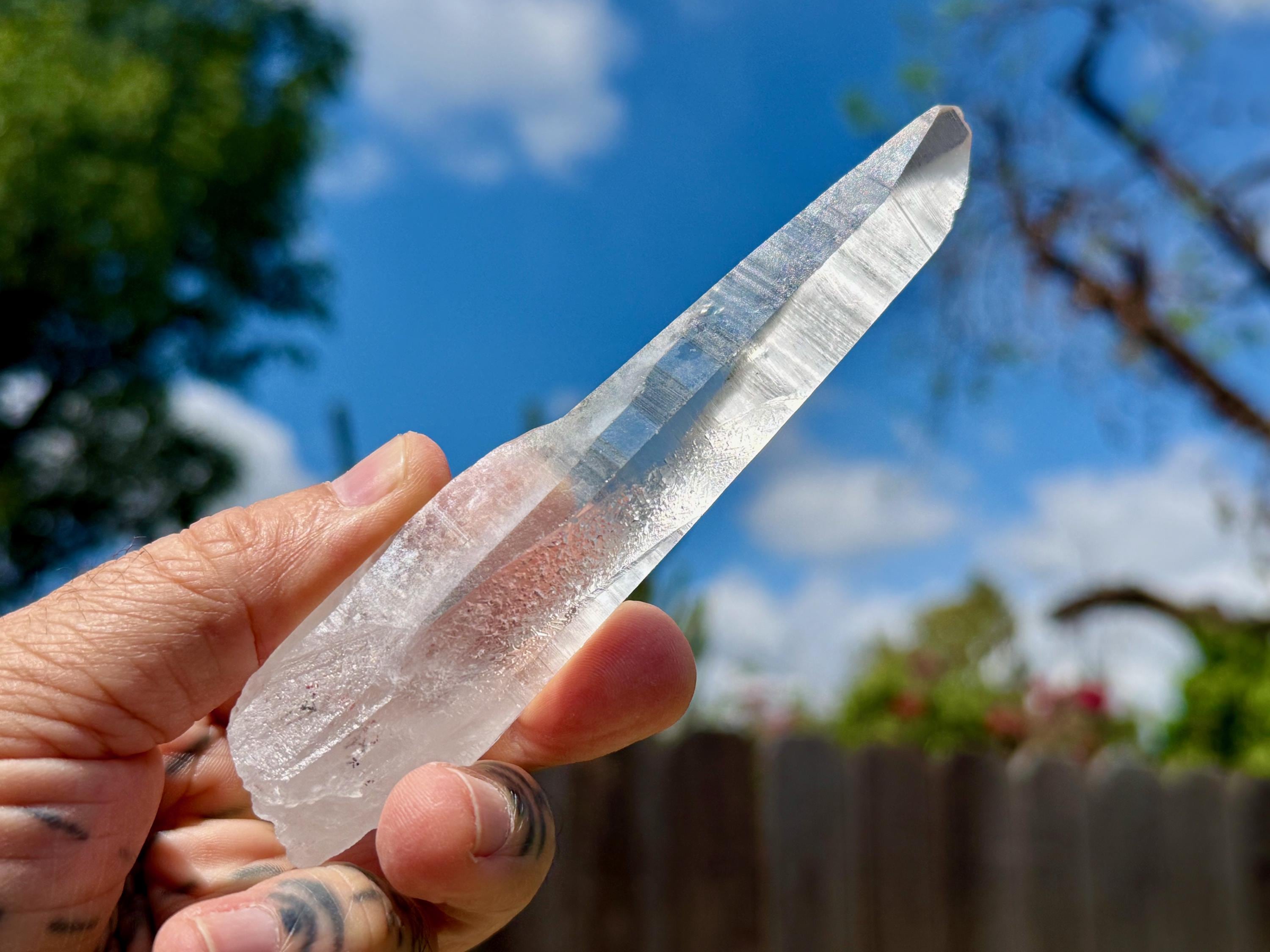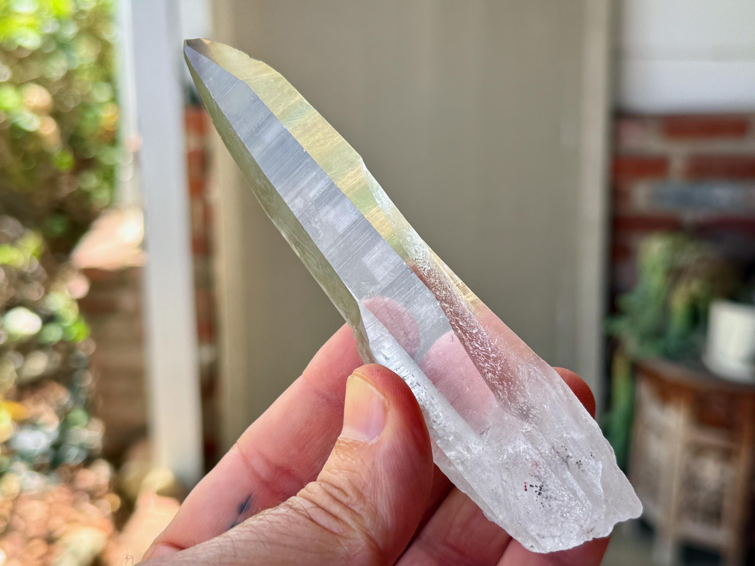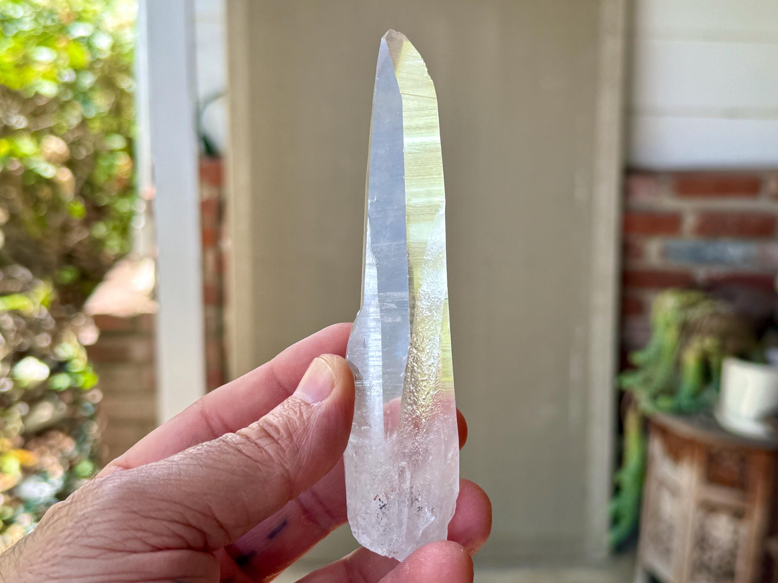 *Please note this crystal is clear and colorless. Any yellow hues in the photos are a result of the natural sunlight and surrounding environment reflecting off the crystal.