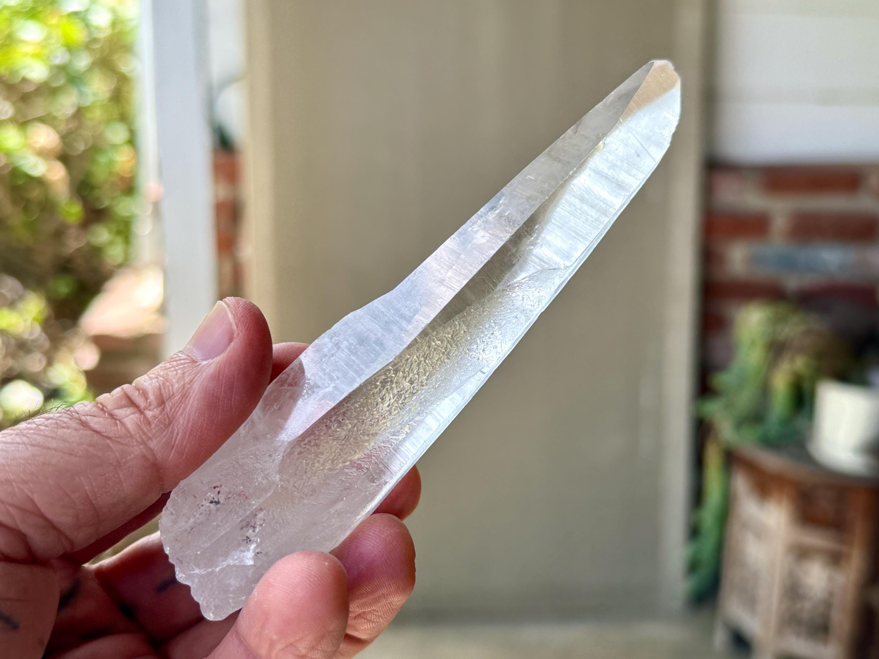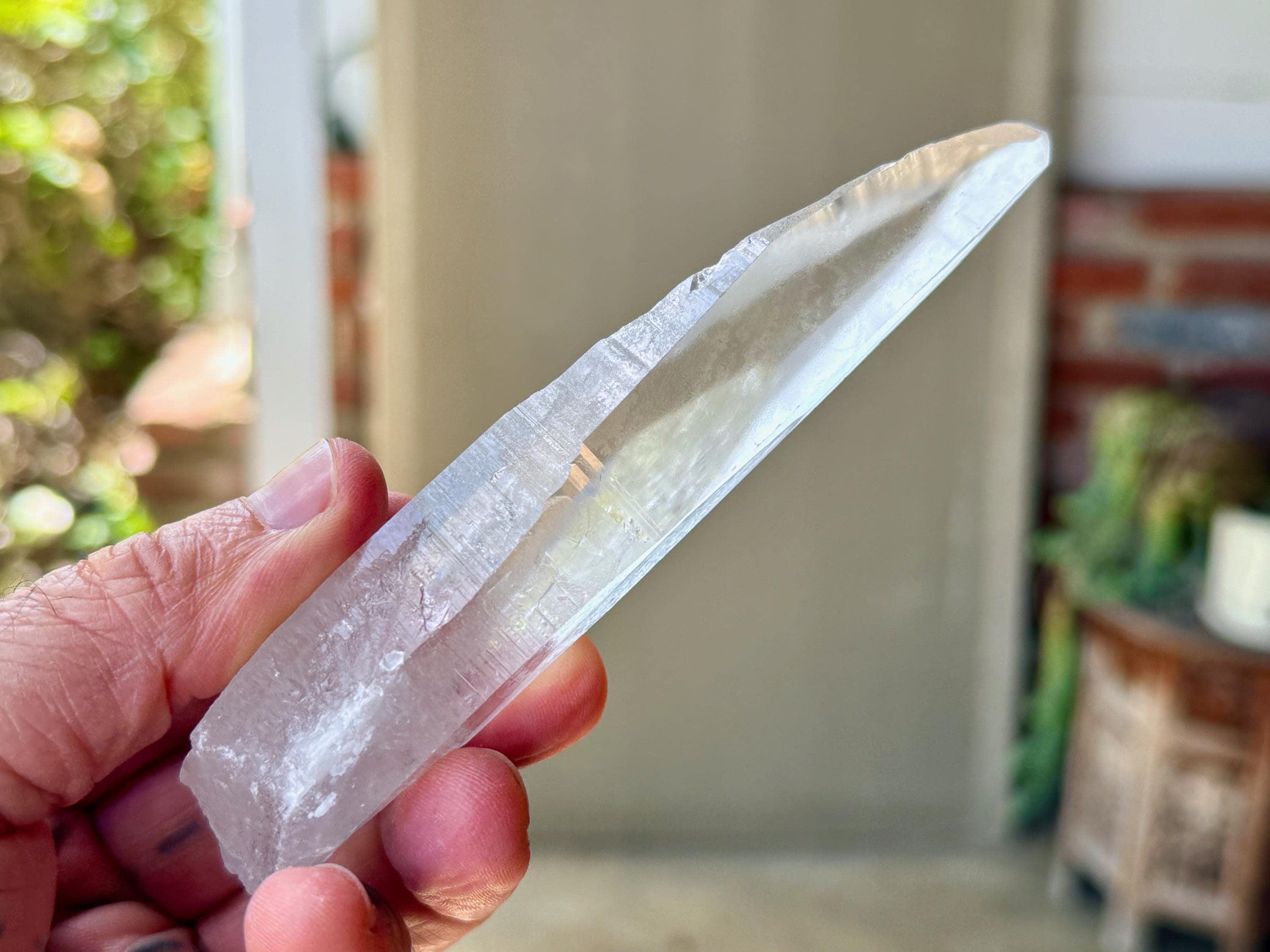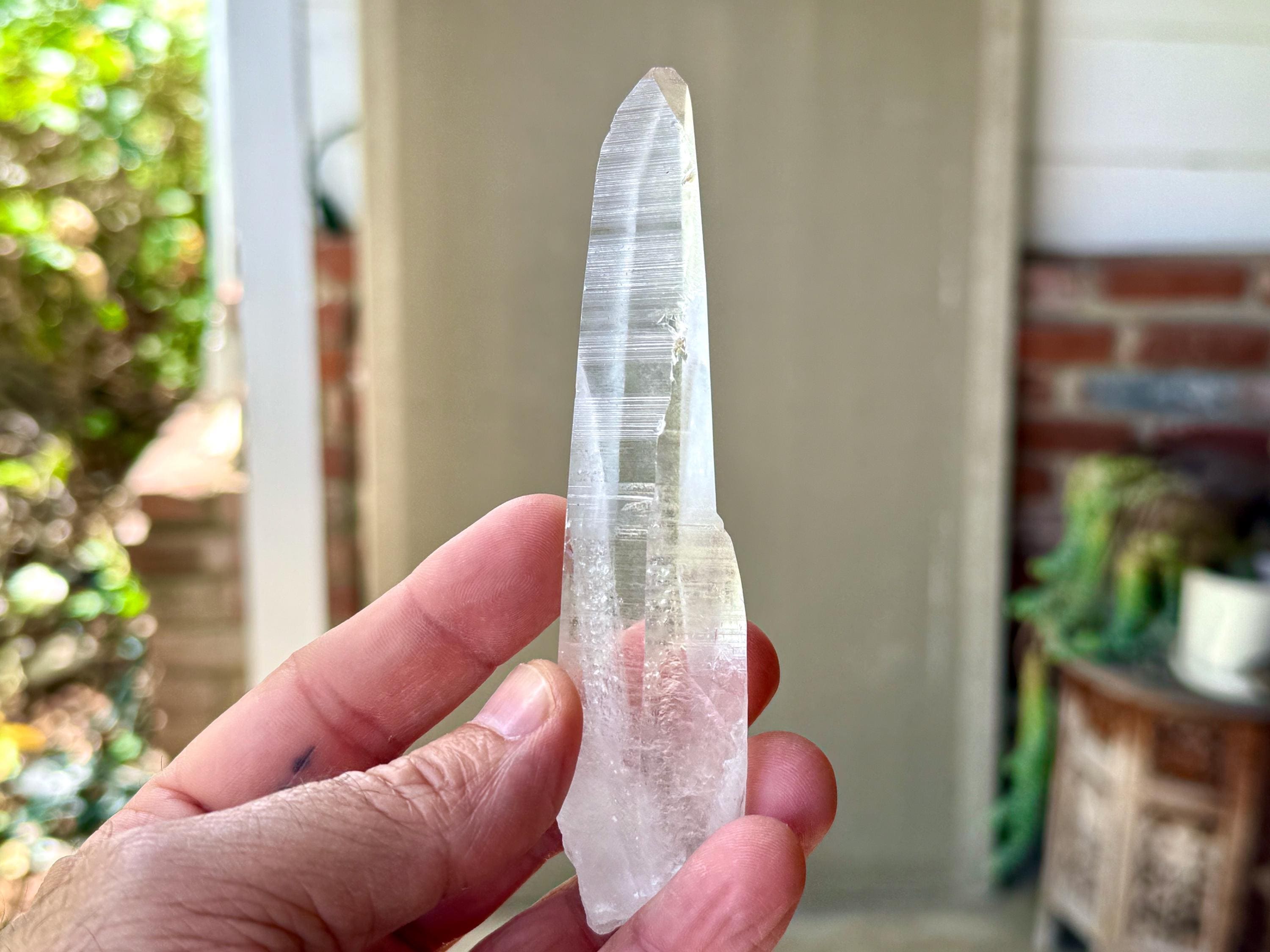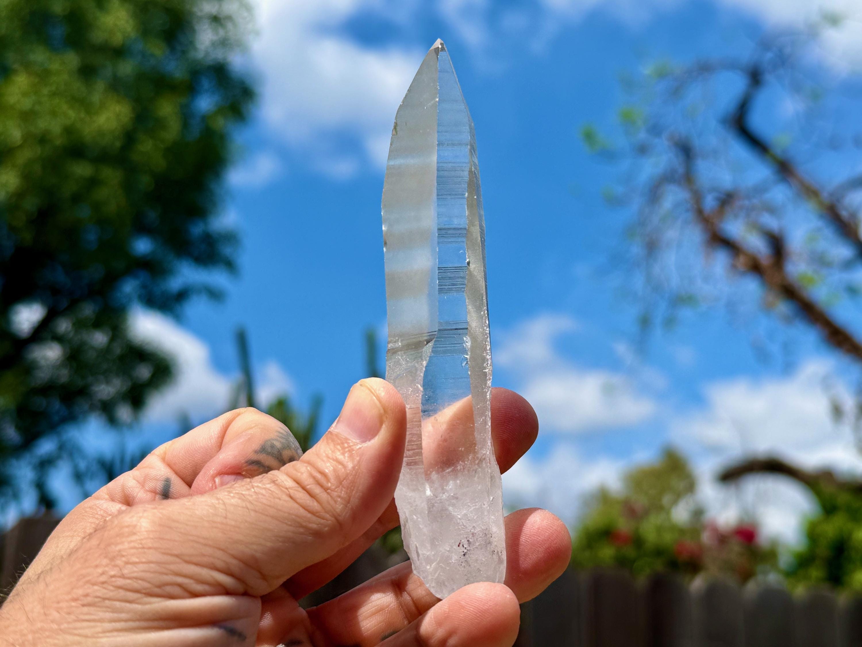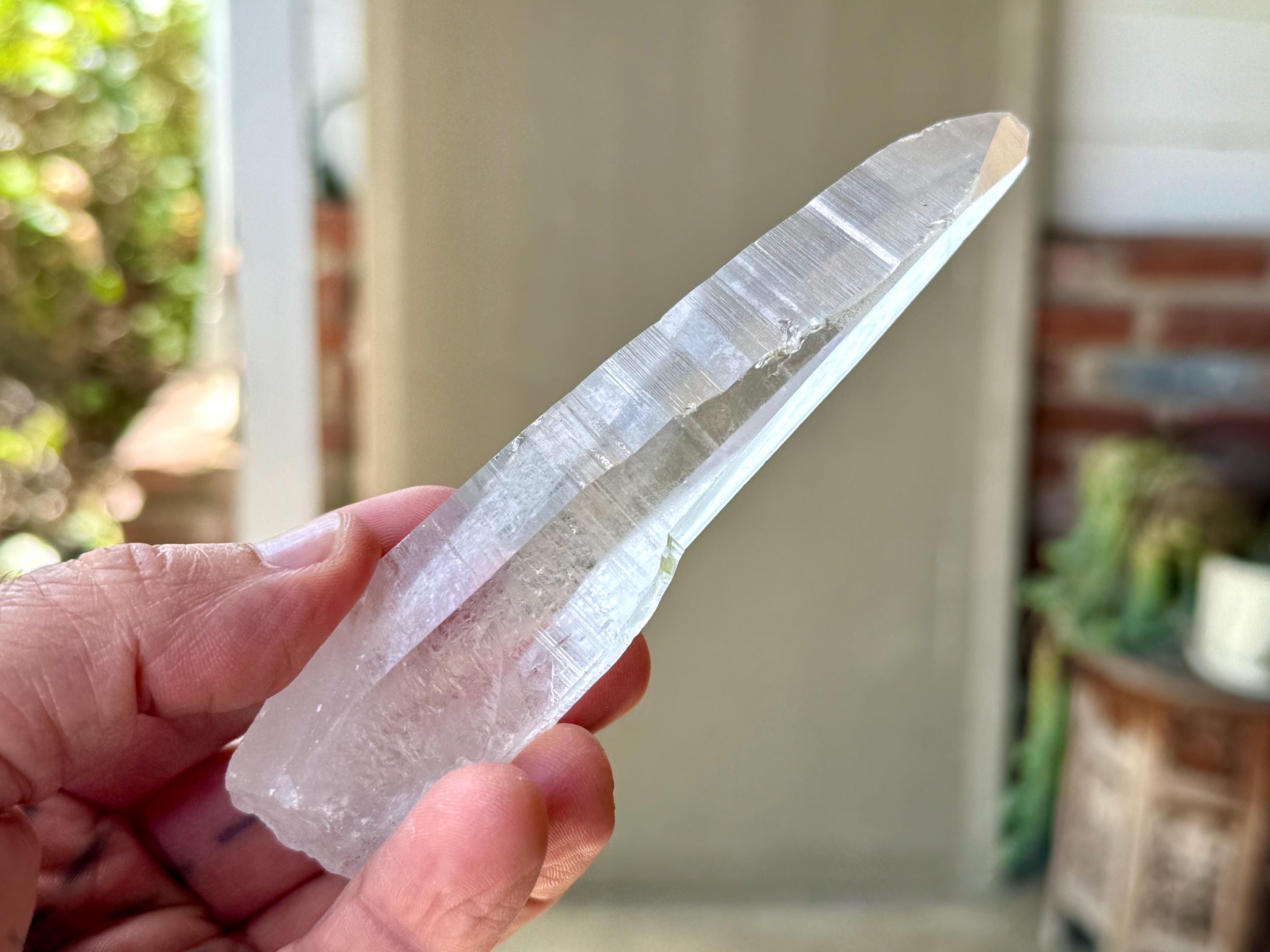 Superb clarity and brilliant luster to this elongated Lemurian Quartz crystal with finely etched striations on its left side, primarily.