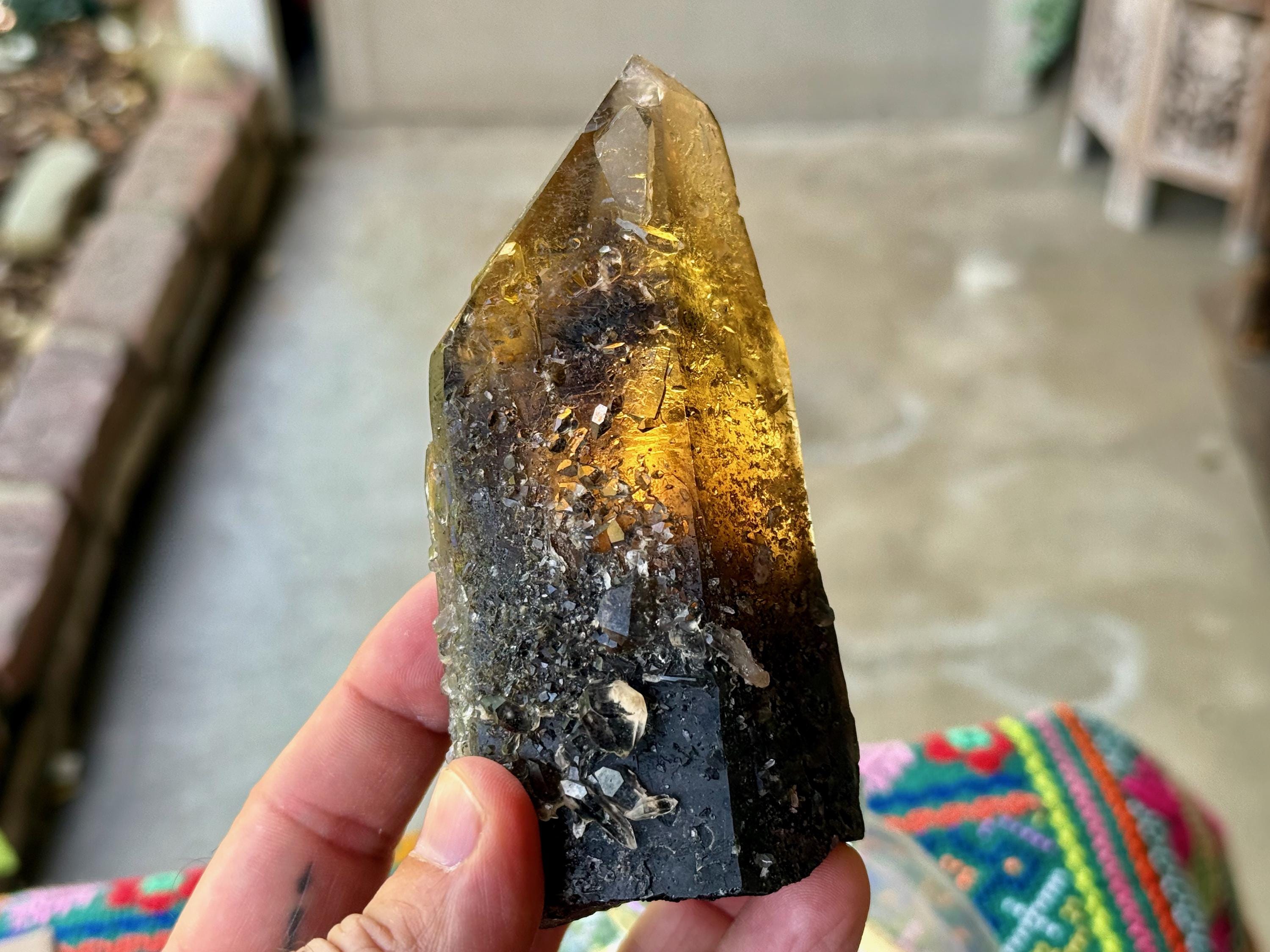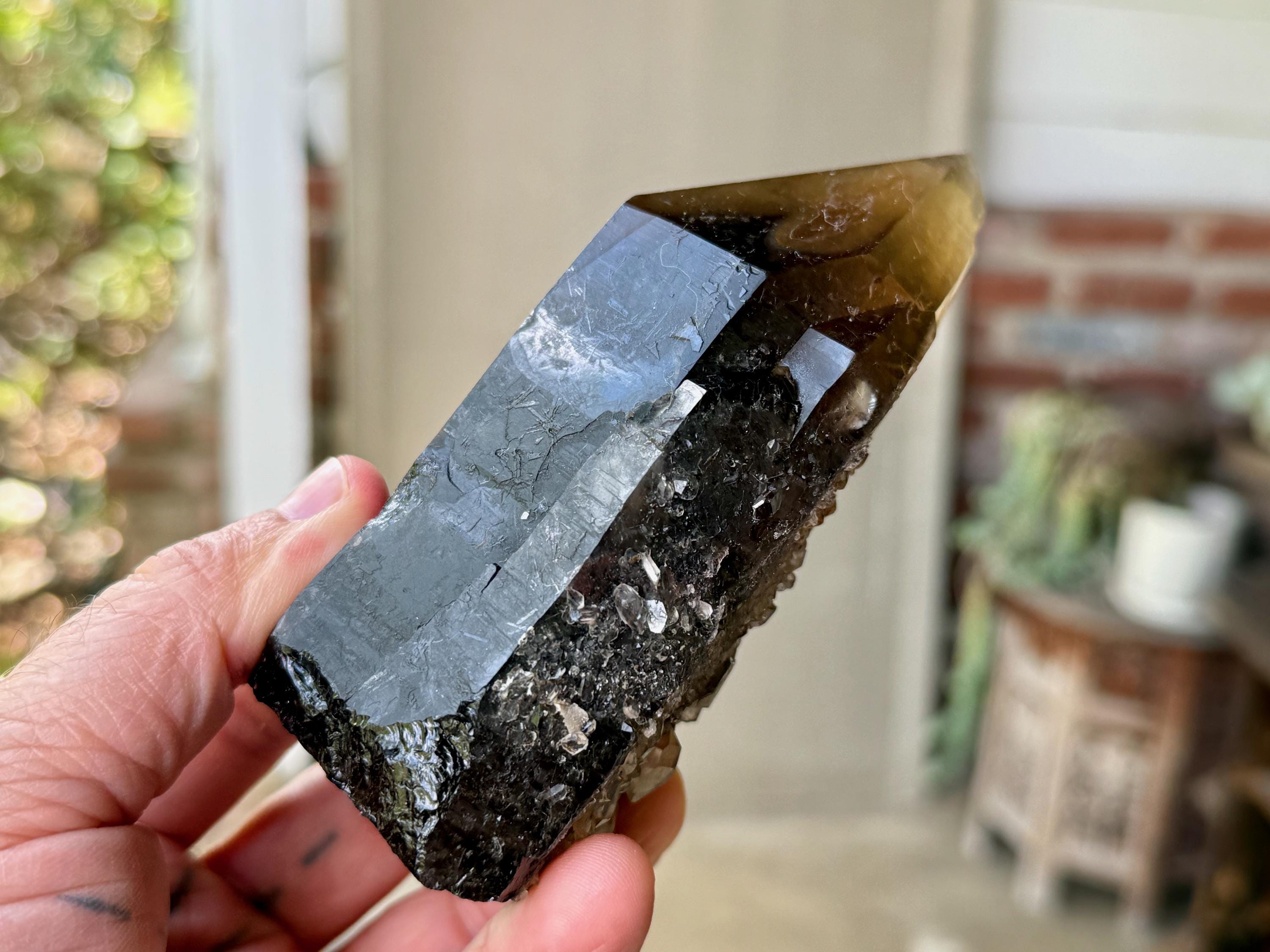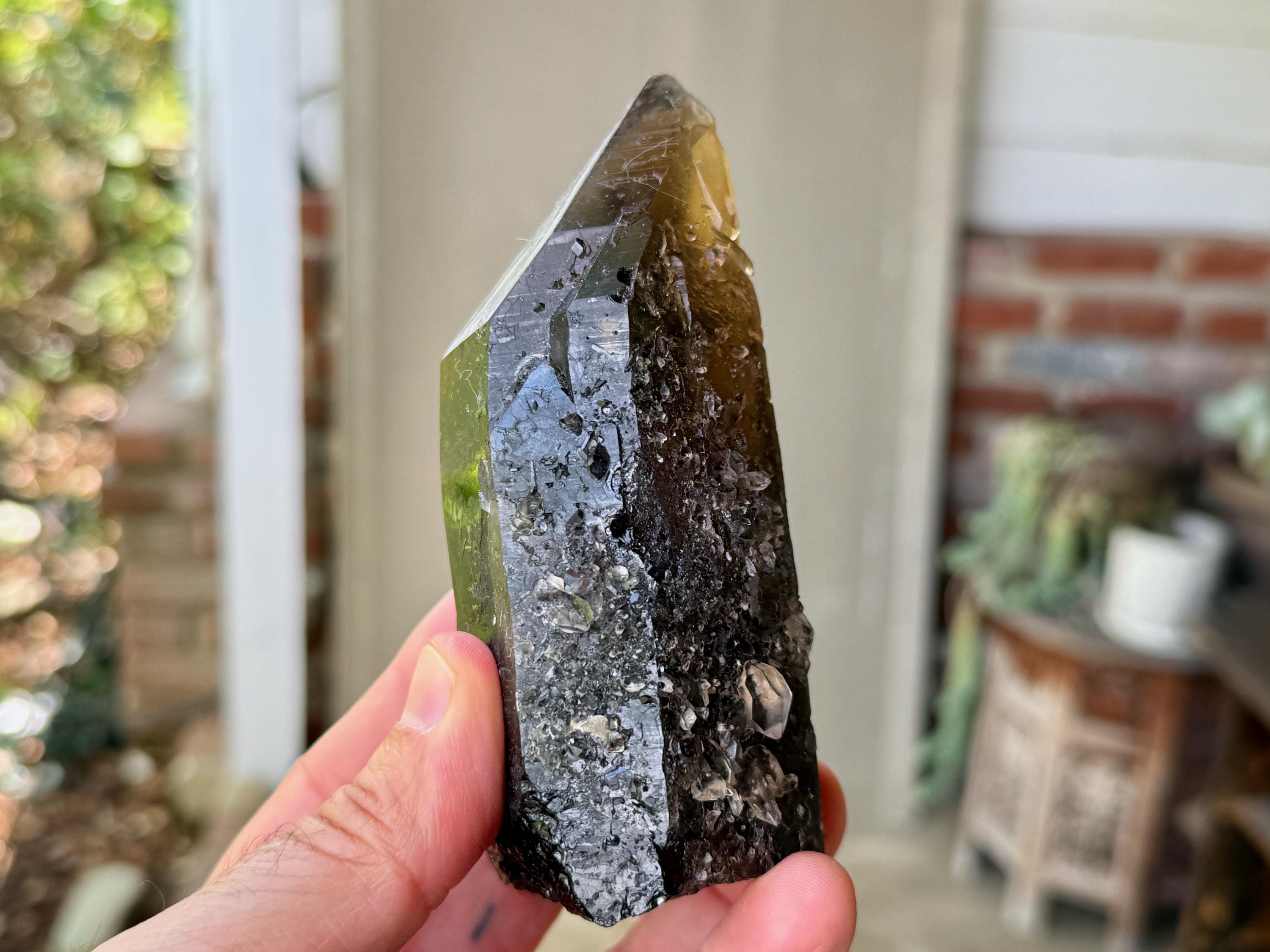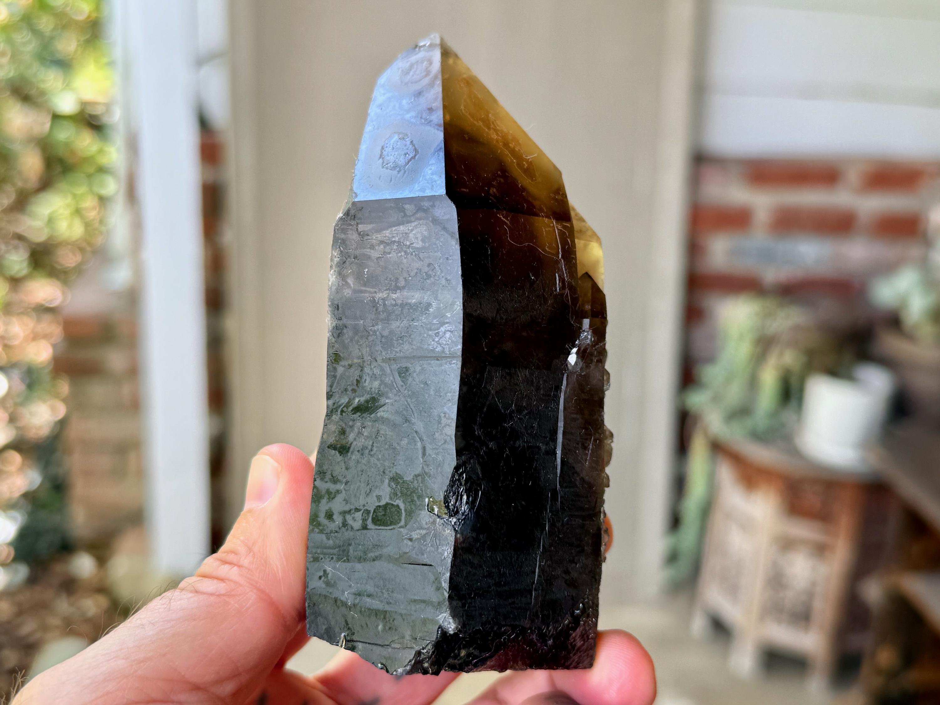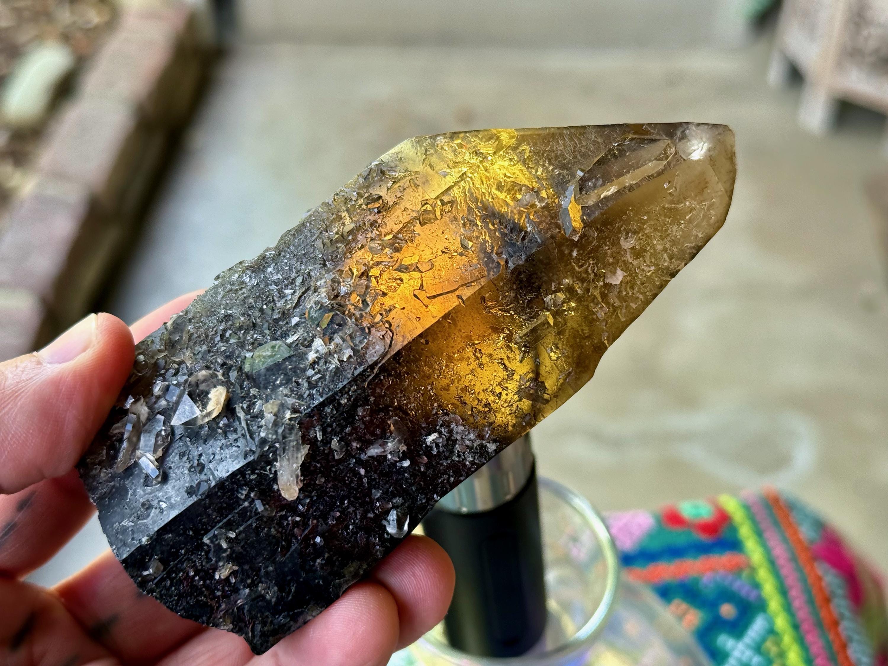 A broad, tall and powerful formation to this Pele's Dream Lemurian with a deep, smoky black complexion. In natural light, we can just make out the mild, gradient hue on this piece, that becomes more clear and golden toward the top. But when backlit, as in Photos 3-5, the yellow-golden color truly comes to life!