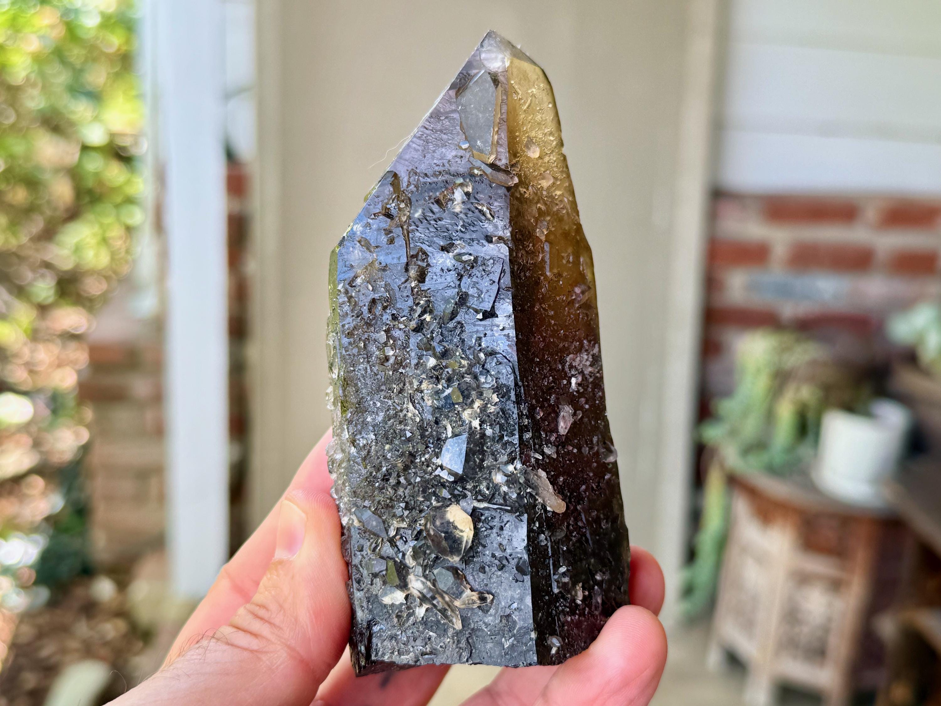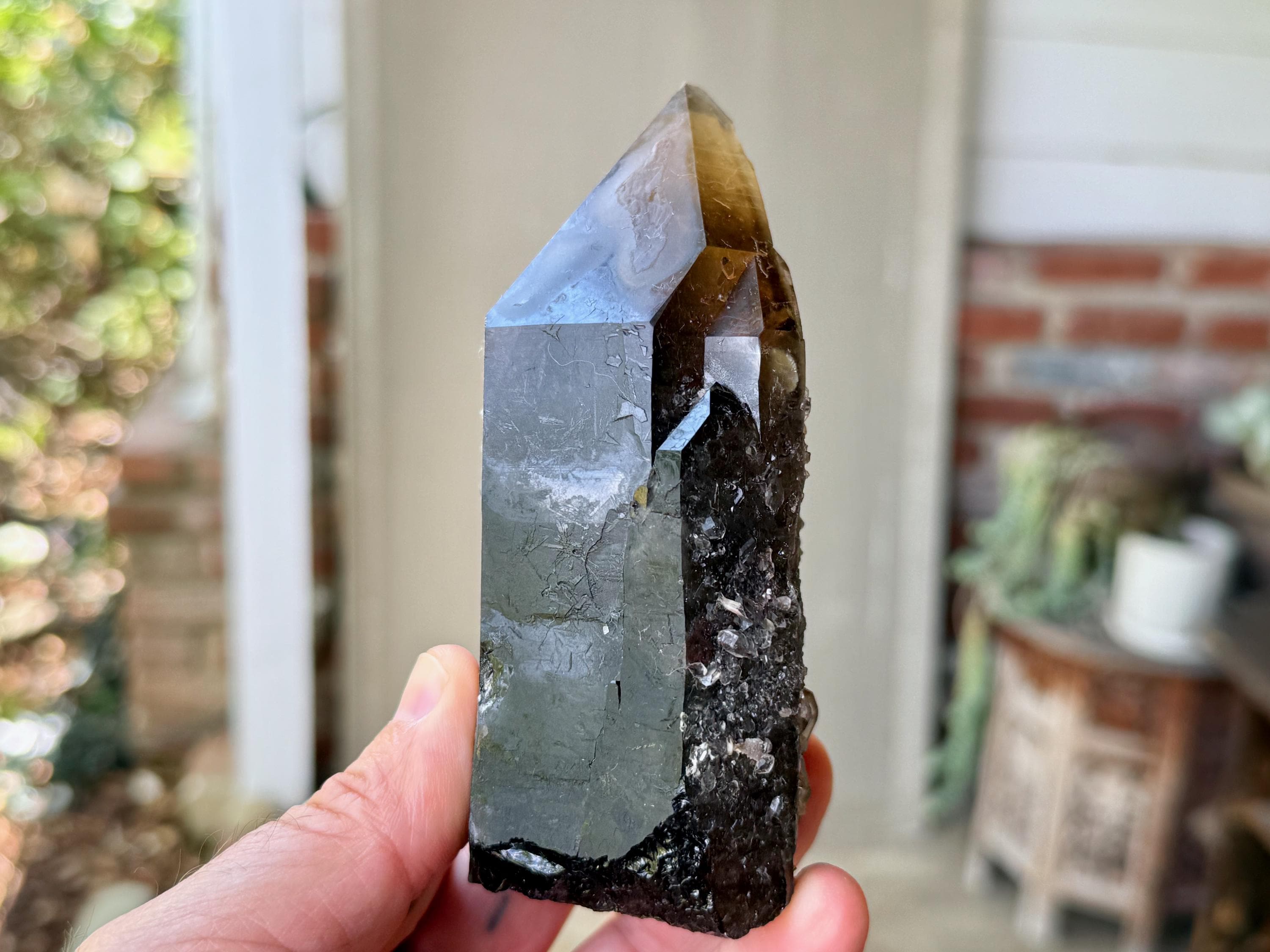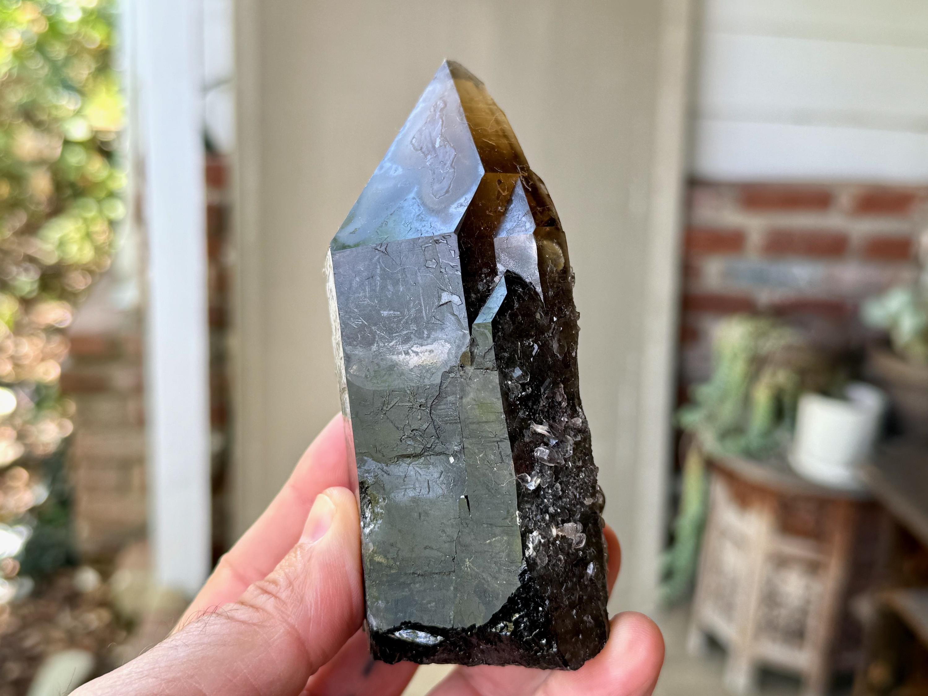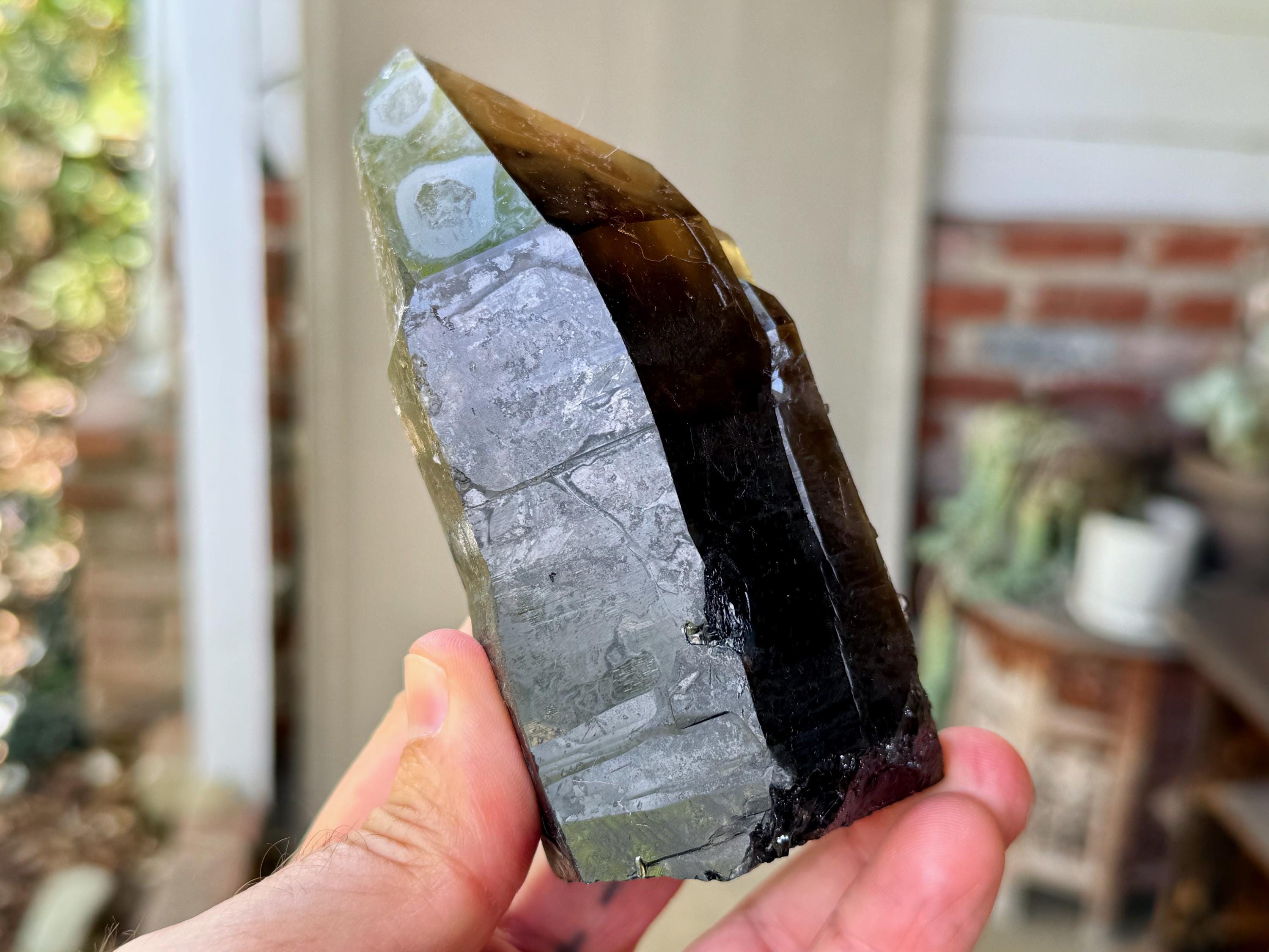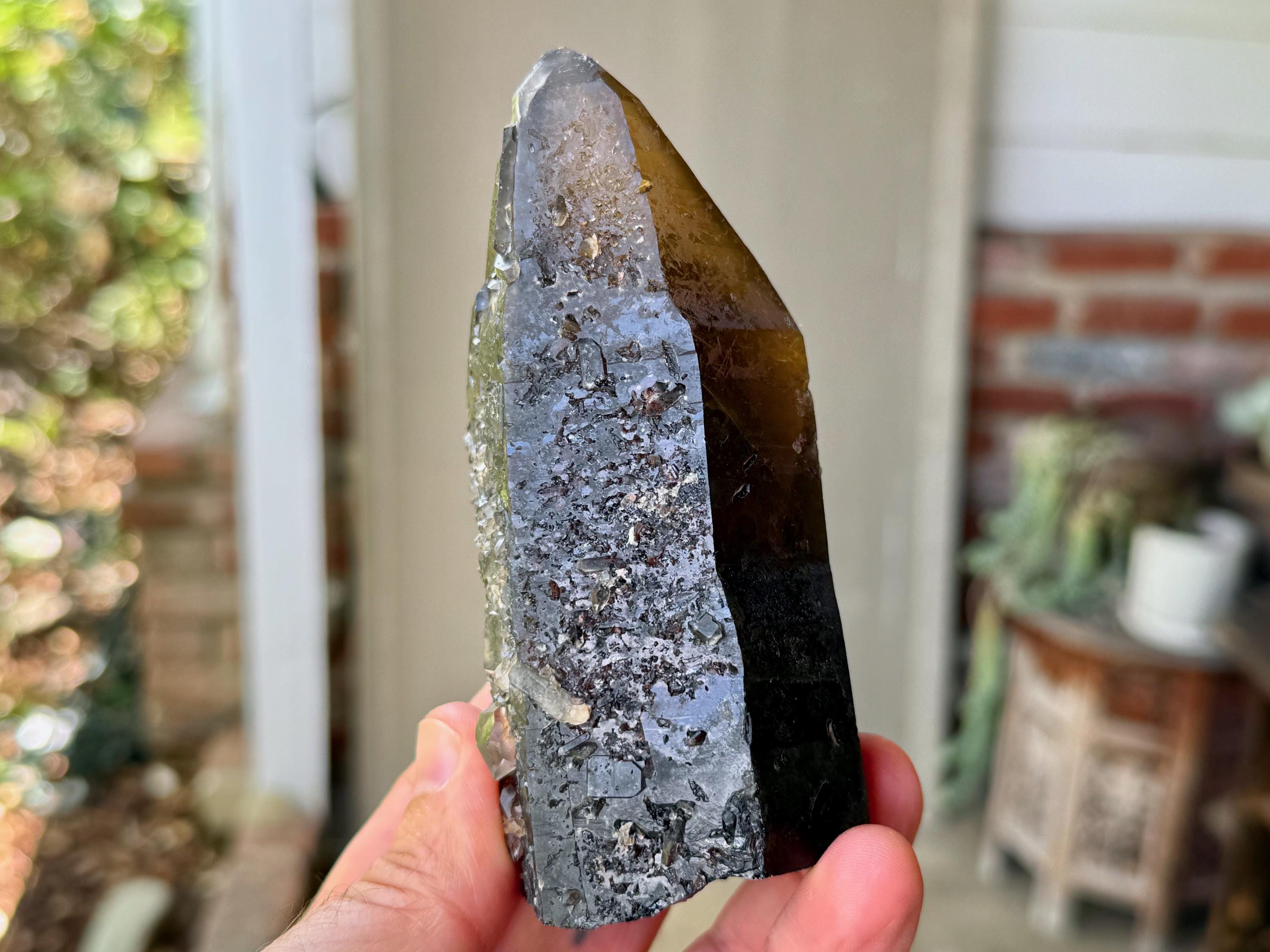 A broad, tall and powerful formation to this Pele's Dream Lemurian with a deep, smoky black complexion. In natural light, we can just make out the mild, gradient hue on this piece, that becomes more clear and golden toward the top. But when backlit, as in Photos 3-5, the yellow-golden color truly comes to life!