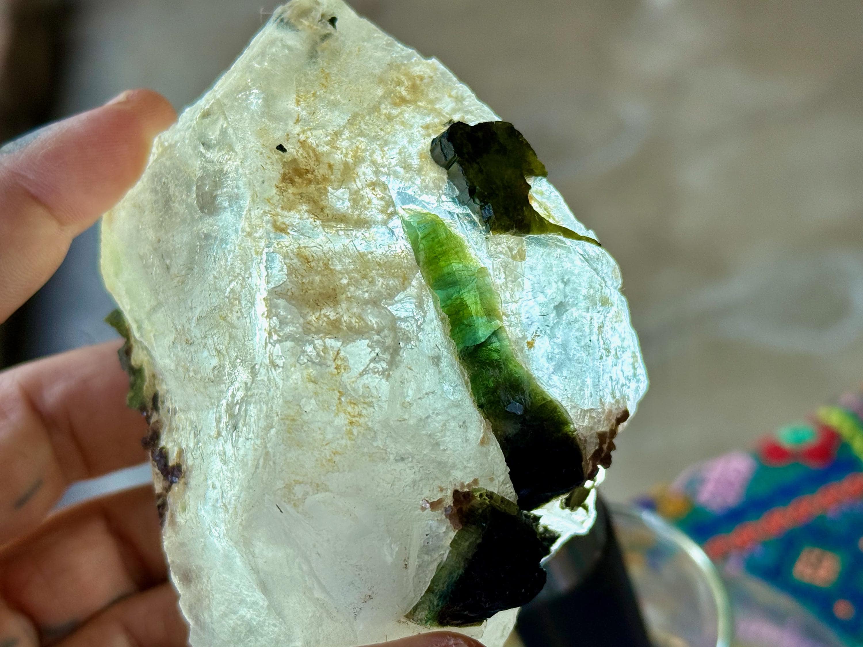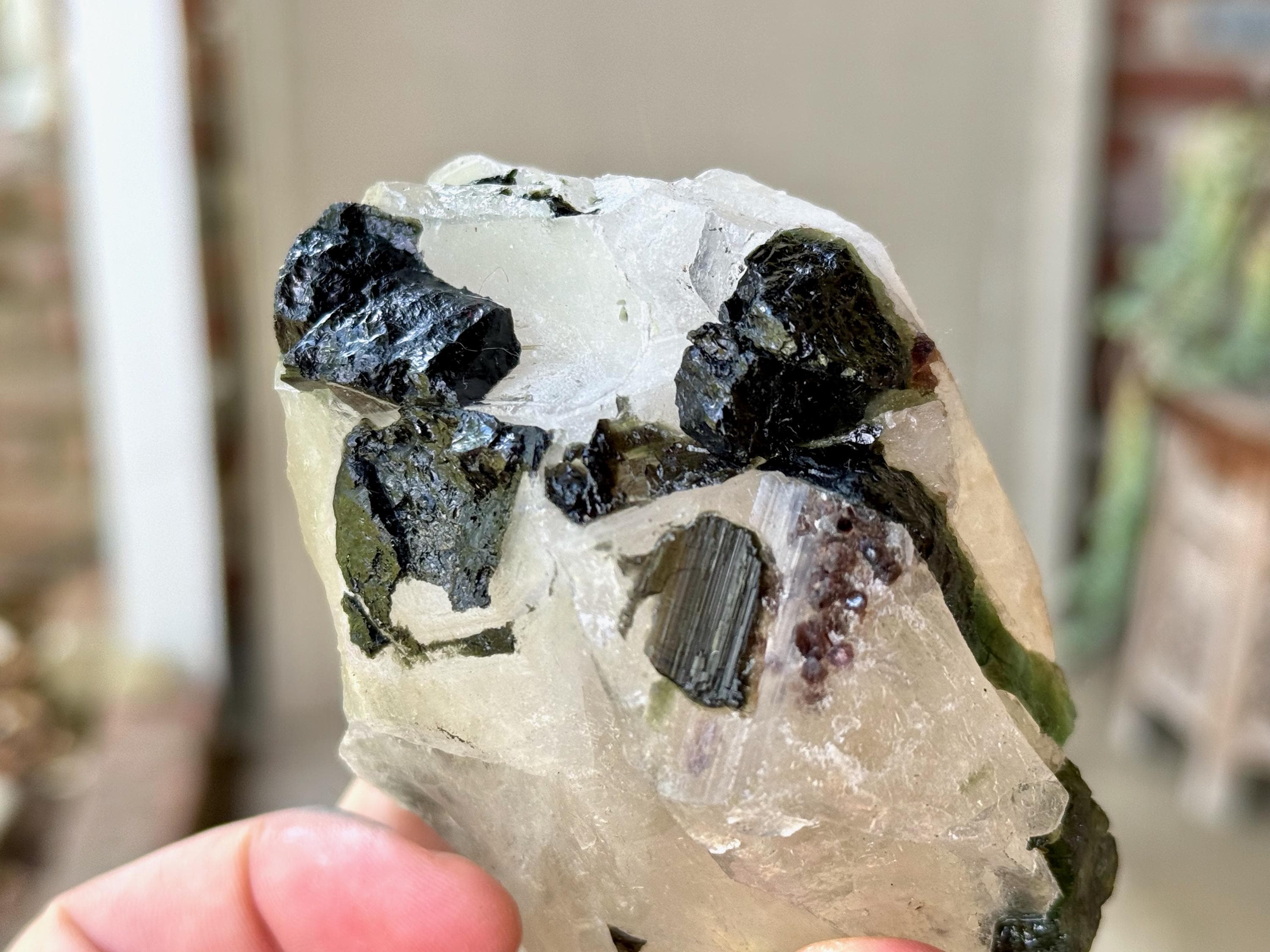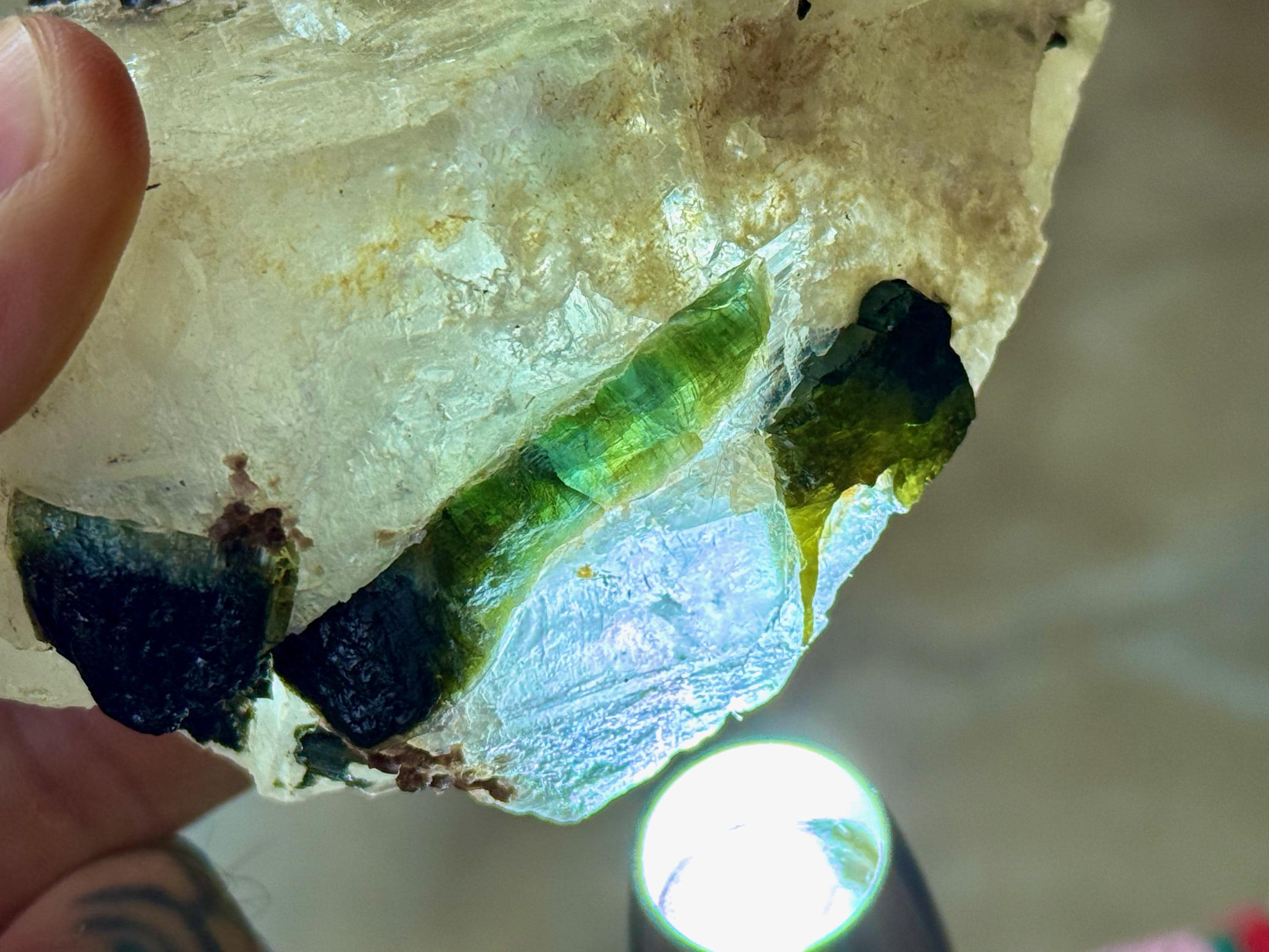 At the base we can see some very dark Tourmaline inclusions, and on the side, we see lighter Green Tourmaline, as well as some purple Lepidolite. When backlit, these Tourmalines light up beautifully and some also reveal hints of light blue as well (Photos 4-8).