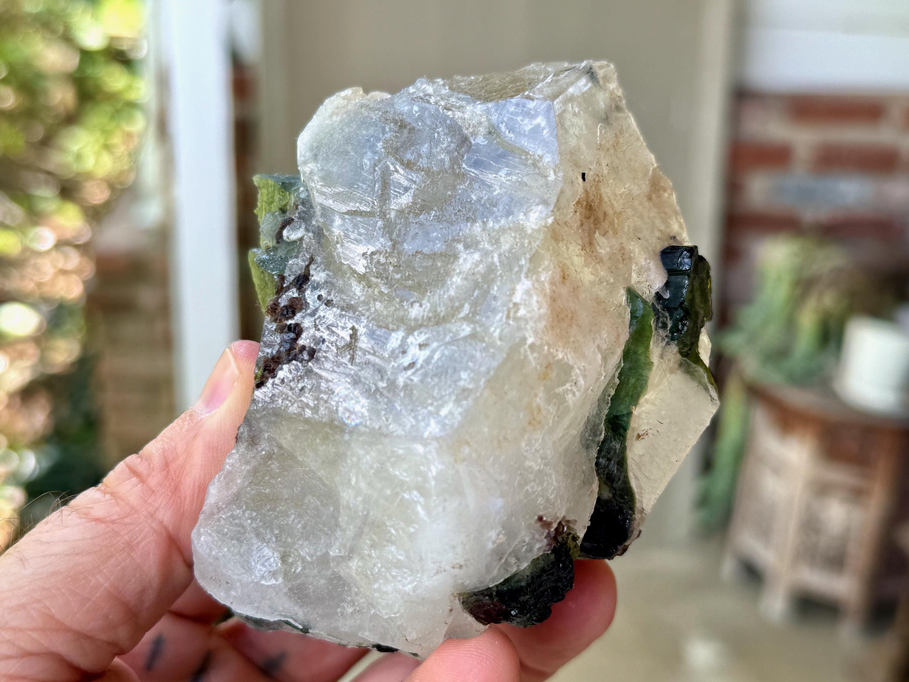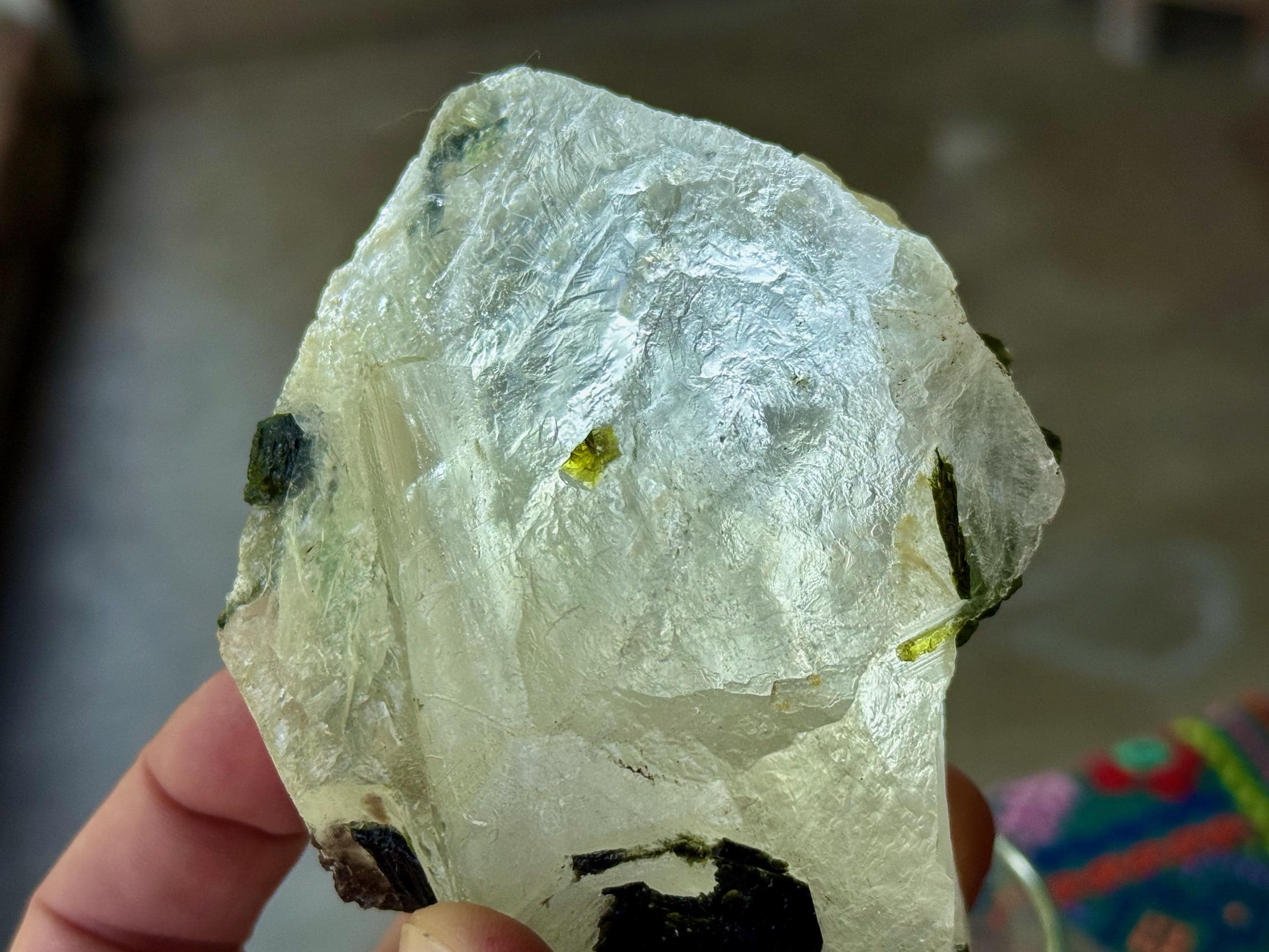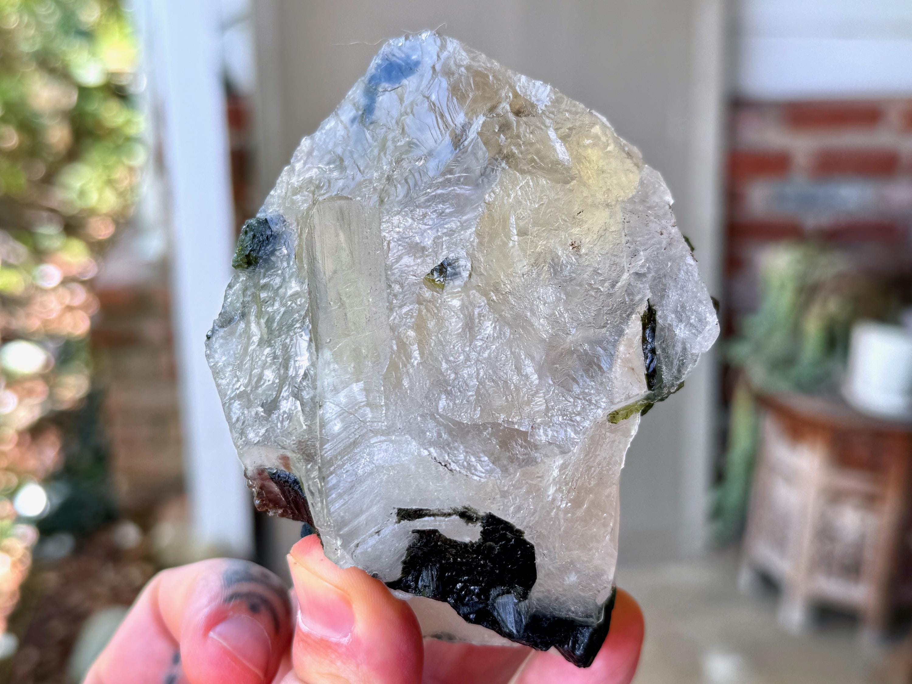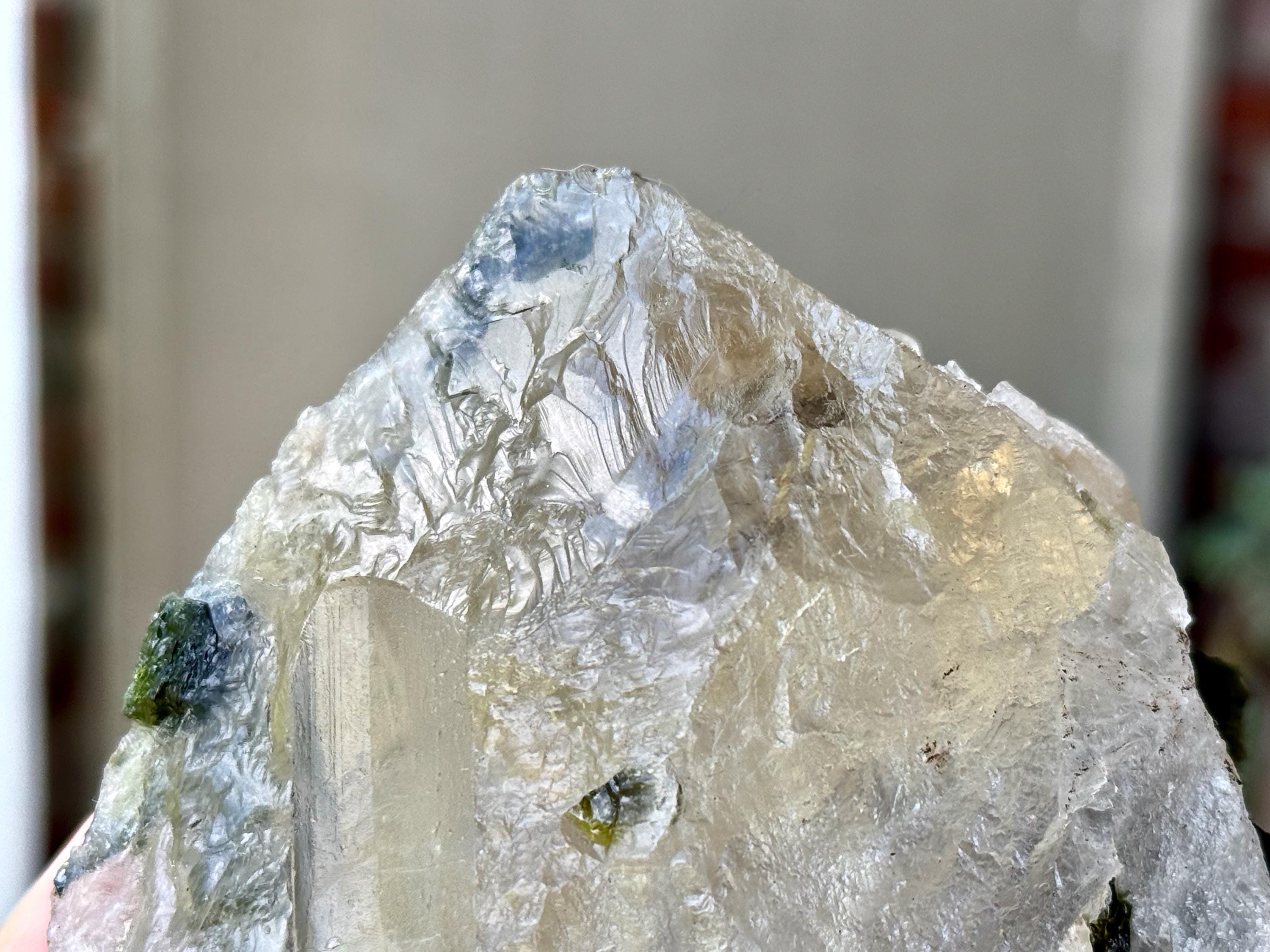 At the base we can see some very dark Tourmaline inclusions, and on the side, we see lighter Green Tourmaline, as well as some purple Lepidolite. When backlit, these Tourmalines light up beautifully and some also reveal hints of light blue as well (Photos 4-8).