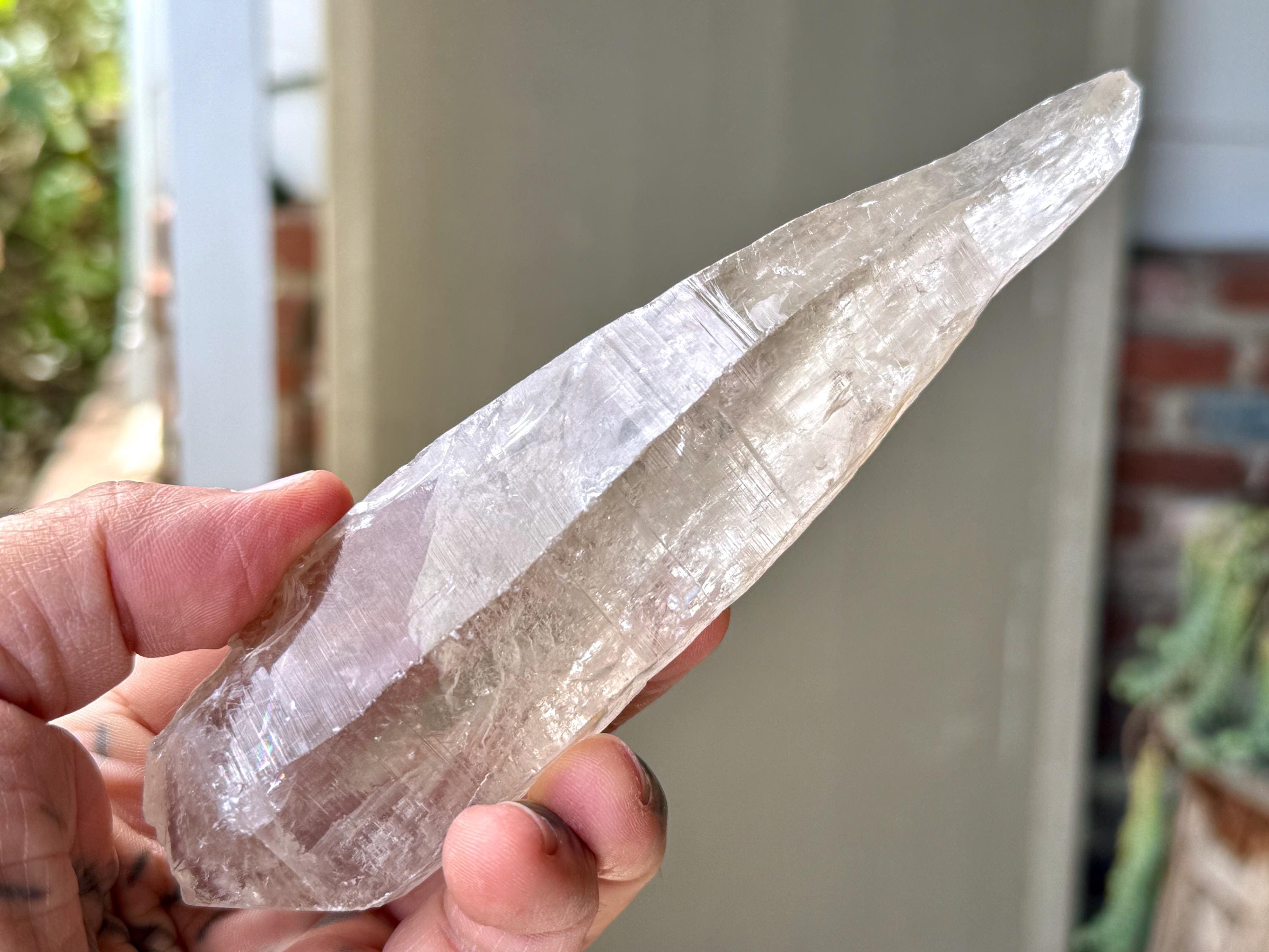 Lemurian Quartz resonates with all chakras, but primarily the Crown Chakra. It has one of the highest vibrations of any crystal and is a beautiful companion for meditation and to realign energies in the body. It can assist in clearing blockages in one's energy field and/or chakras, dispelling heavy energies from the body. If there is stagnant energy in the body, it can help to increase Prana (life force) energy to get things moving properly again. Meditating with Lemurian Crystals can allow us to connect with higher-dimensional spirit guides and connect to Divine realms, as well as to decode the information they contain within.