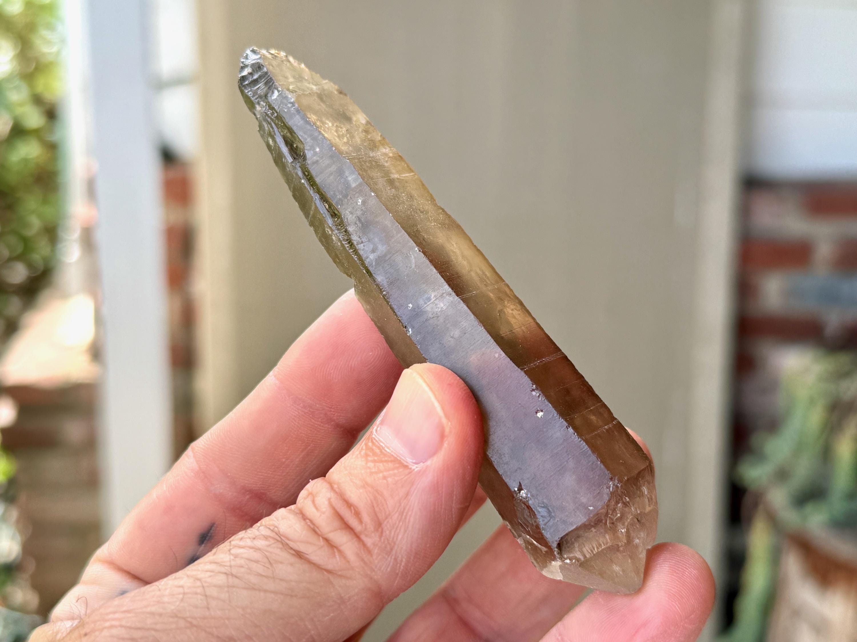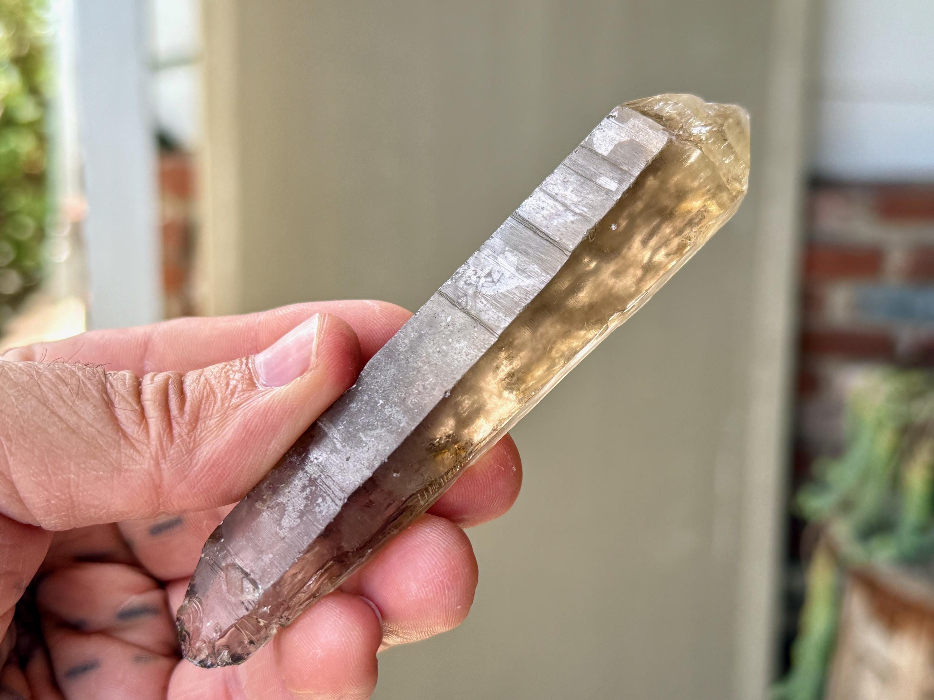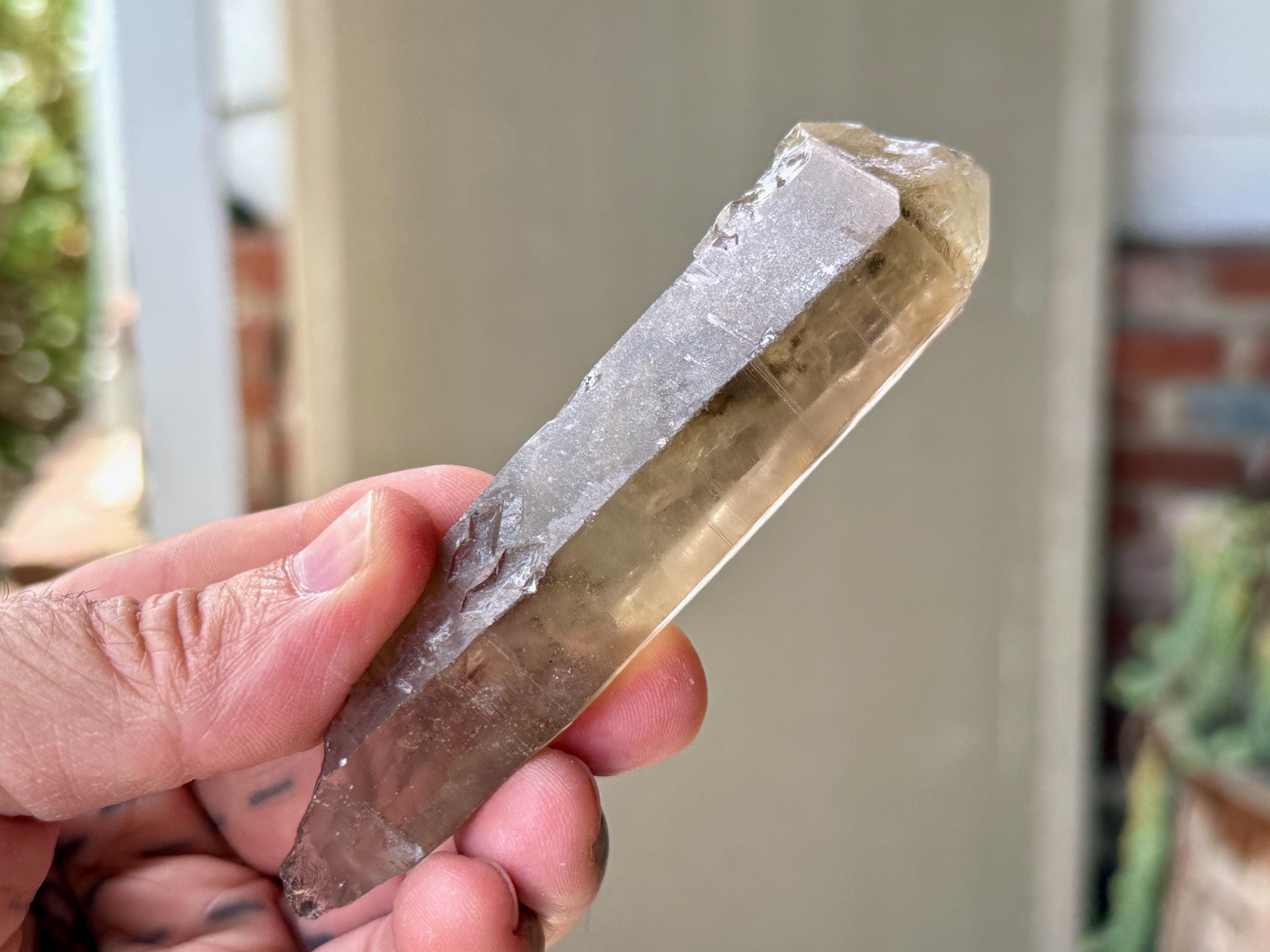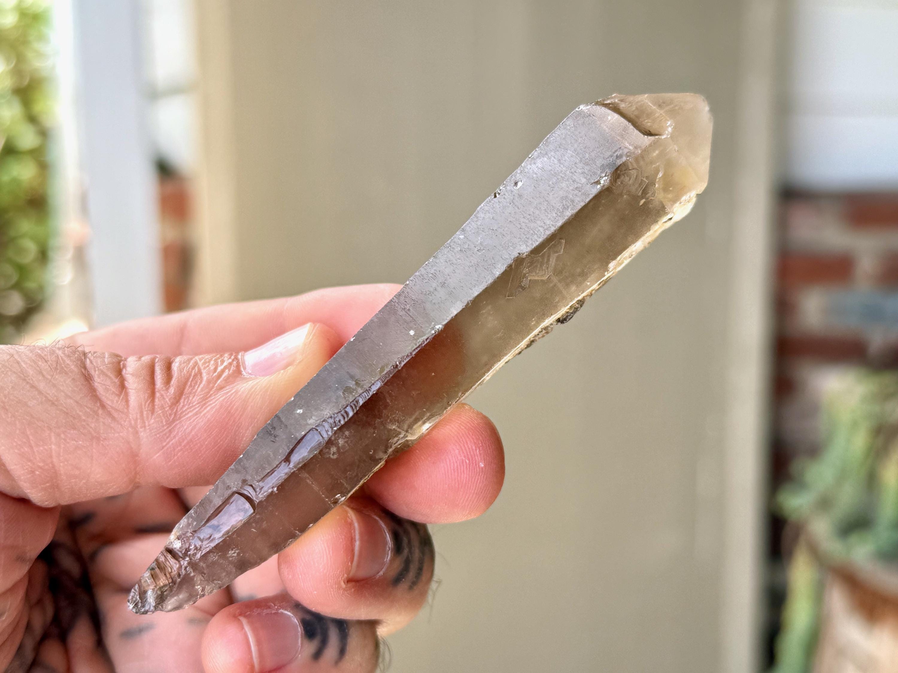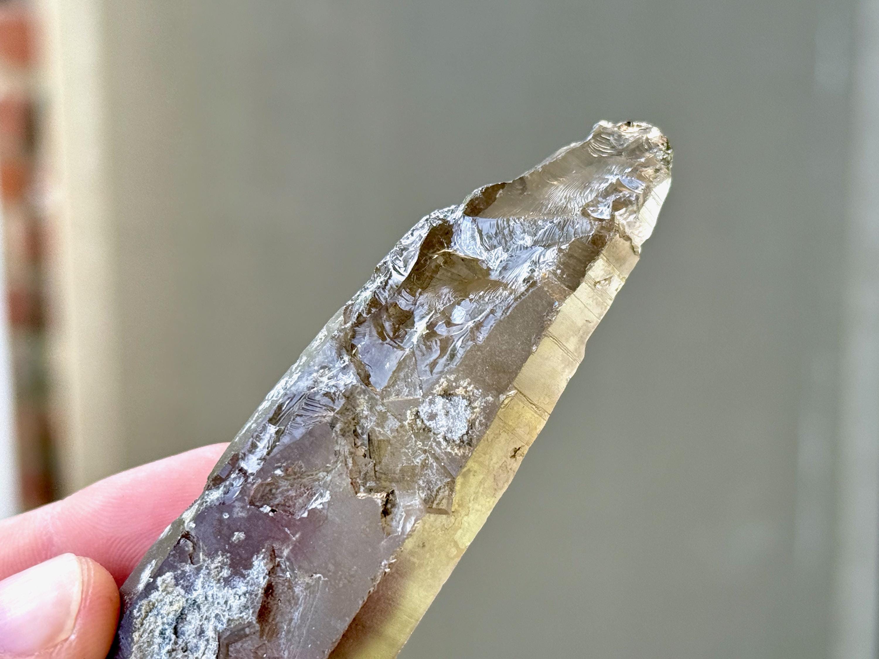 Gorgeous smoky hue, outstanding clarity and superb luster to this elongated Sacred Scribe Lemurian. This crystal exhibits very mild striations on its front side (or left side, depending on how you view it). The backside features an array of impressions and contact imprints.