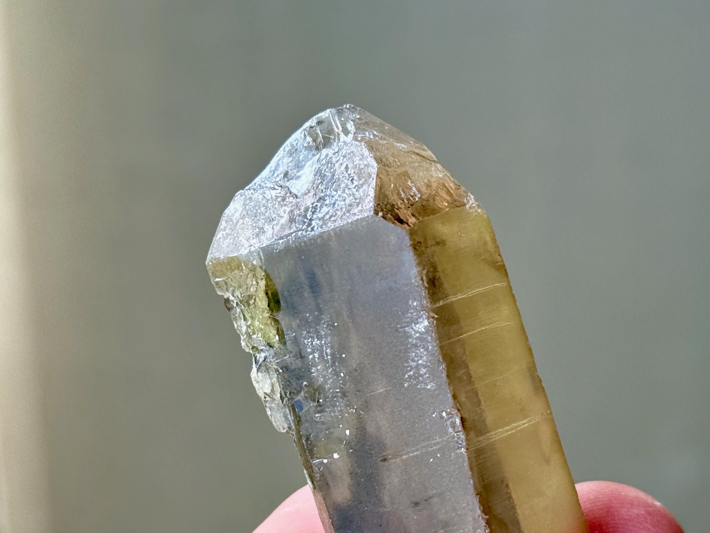 These flaws are characteristic of most of the crystals from this locale, due to the environmental conditions and nature of the mining site. However, the overall quality of this piece is actually very nice otherwise. The main facet area is intact, save for the minor chips mentioned above, and the termination is complete and very nice.
