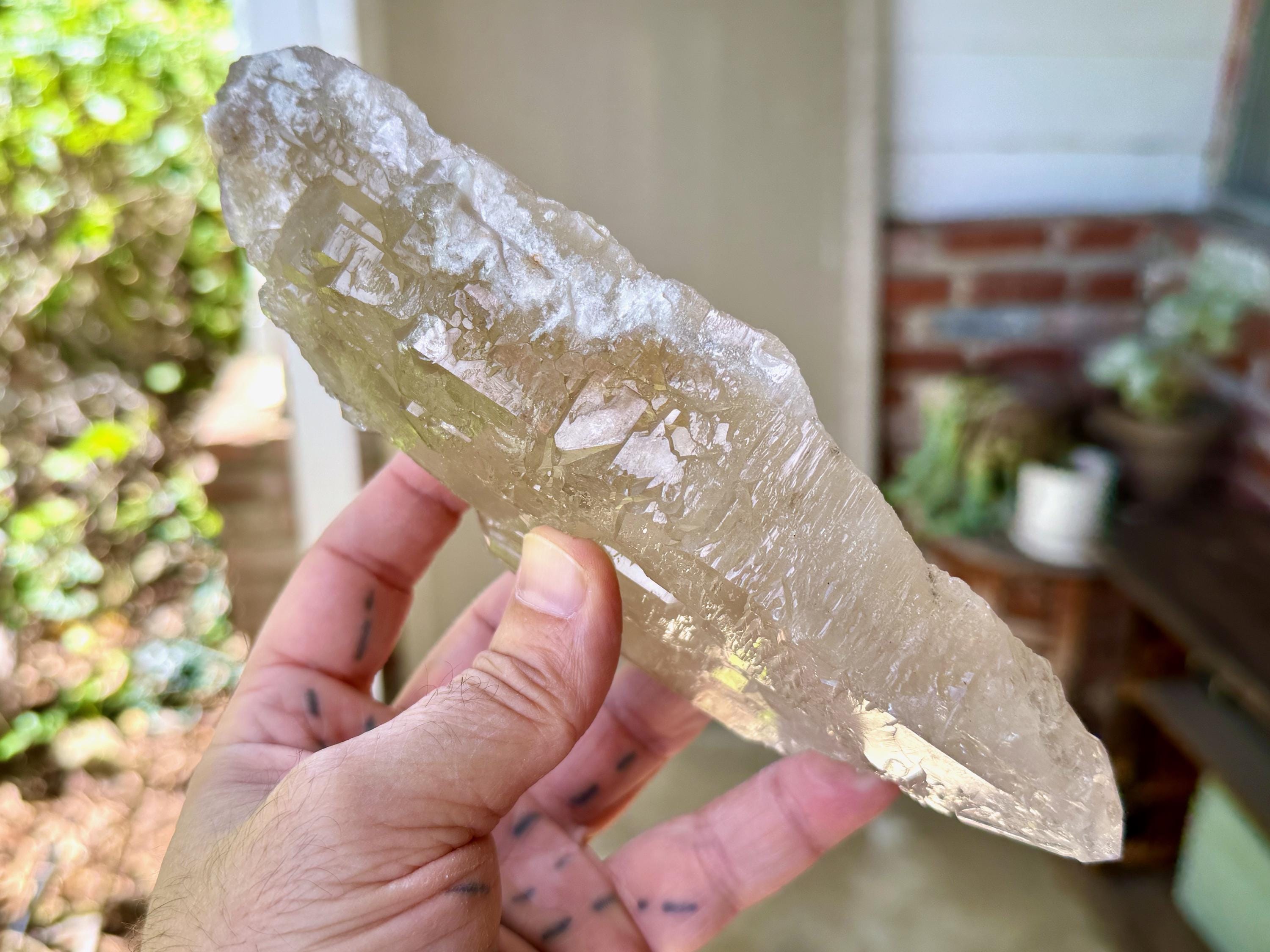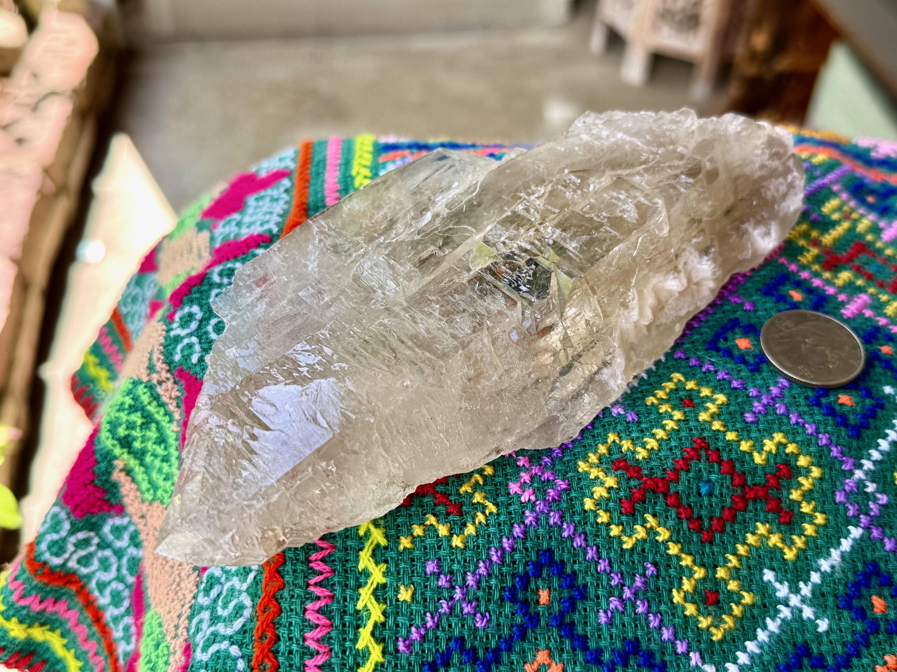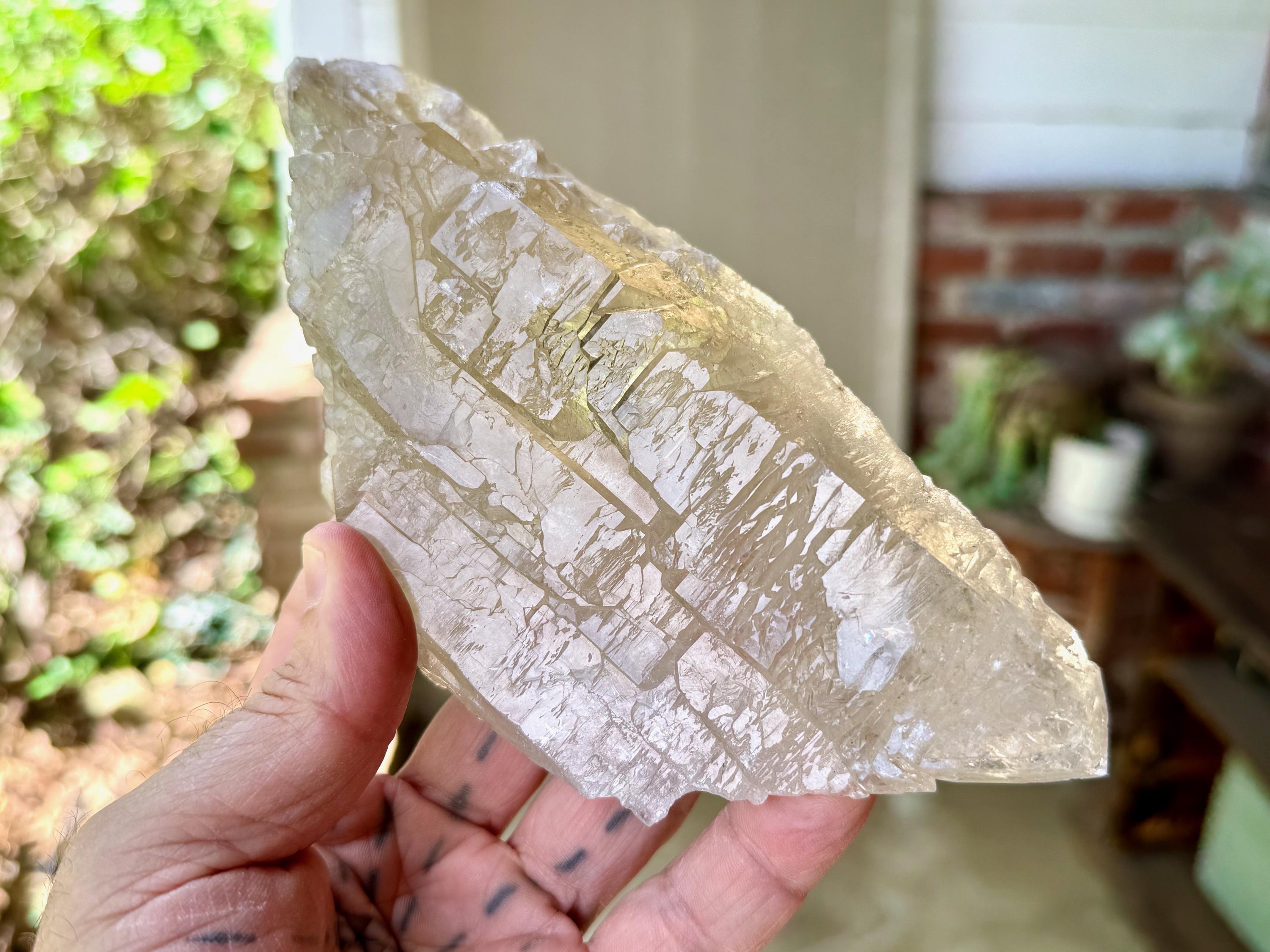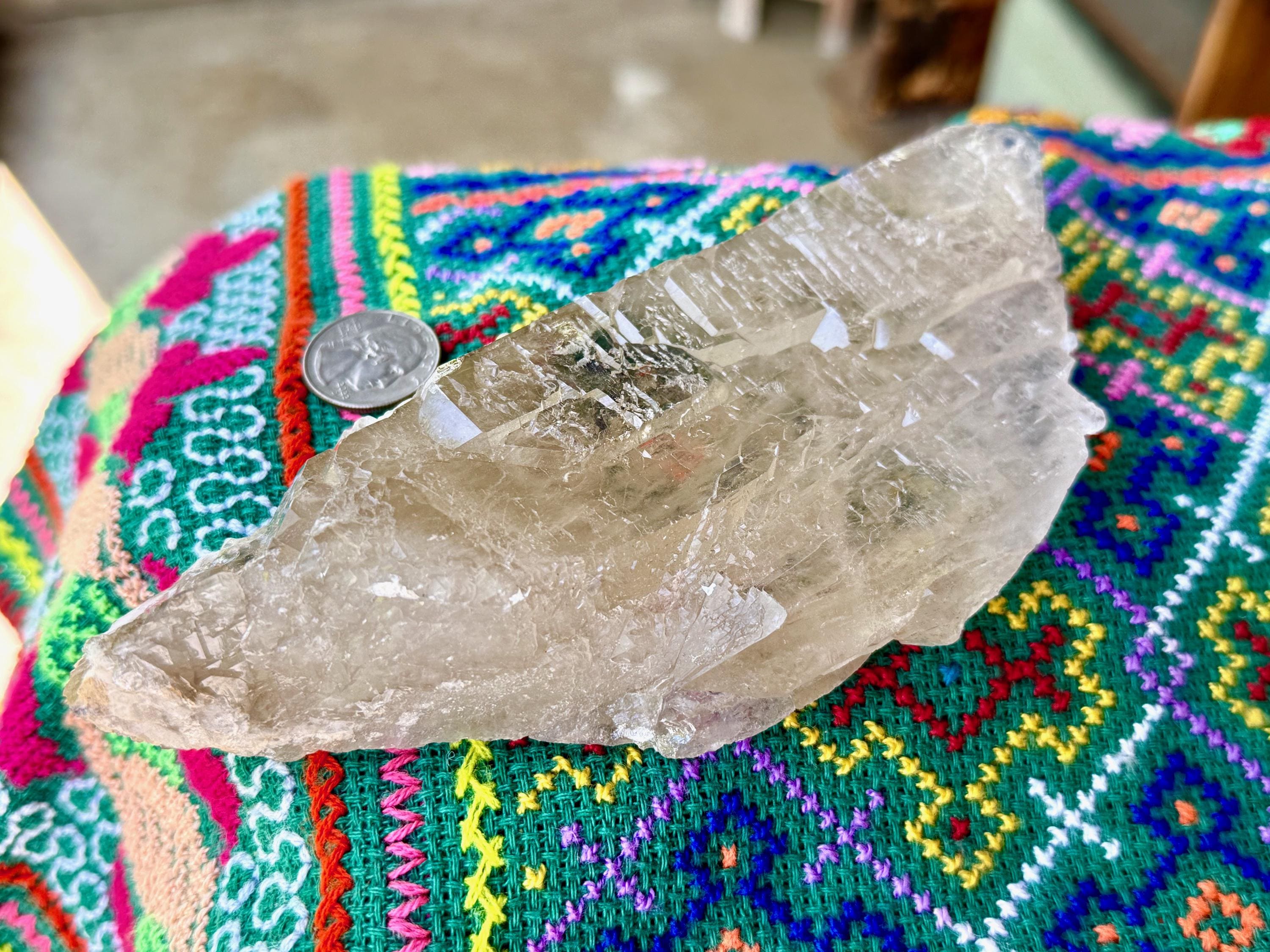 This crystal possess what is known as a "galactic key" formation, having broken off a larger crystal at some point hundreds of millions of years ago in the Earth, due to shifting tectonic plates, and that managed to fully heal itself on its back and sides (see more on this formation below).