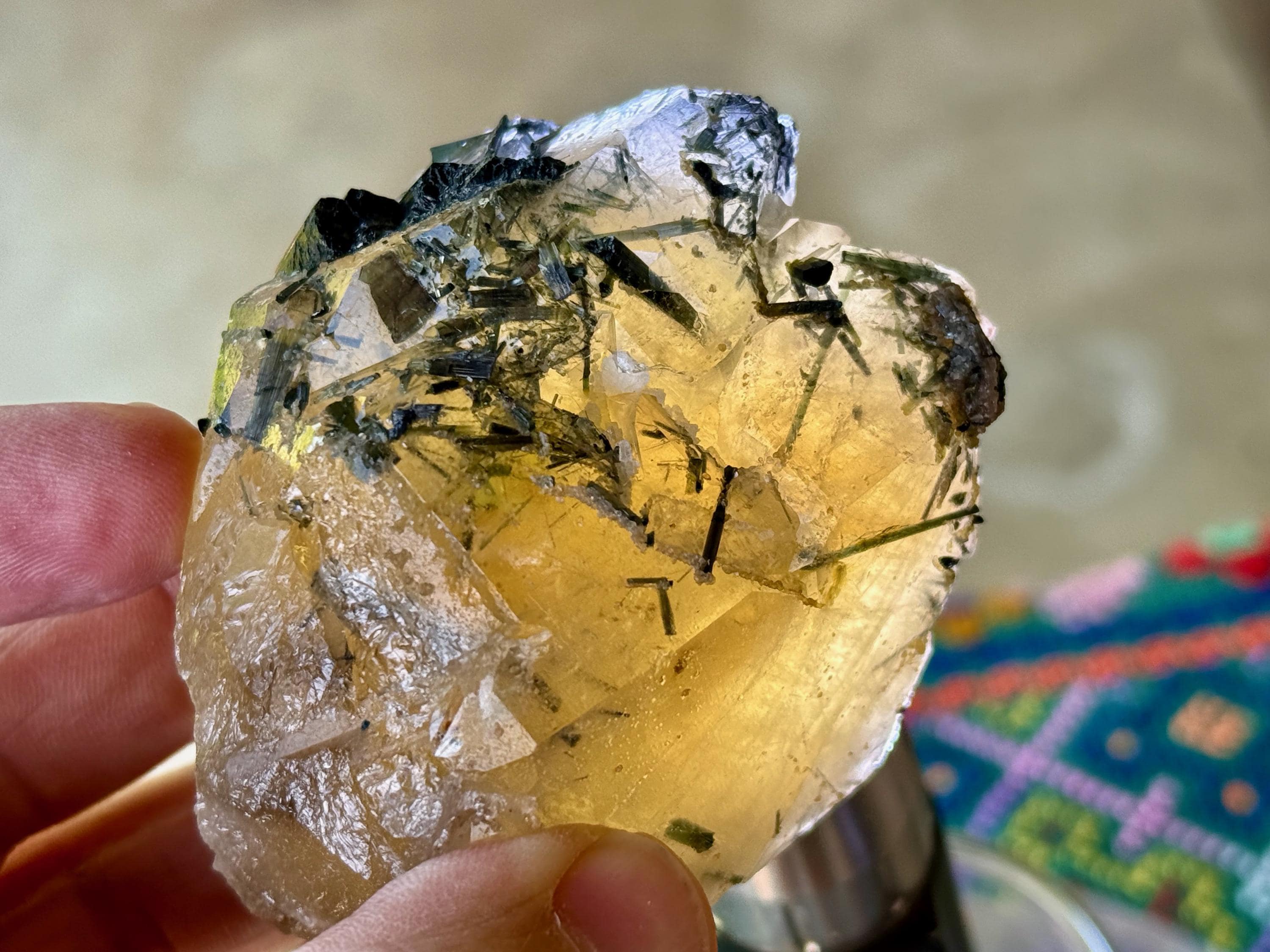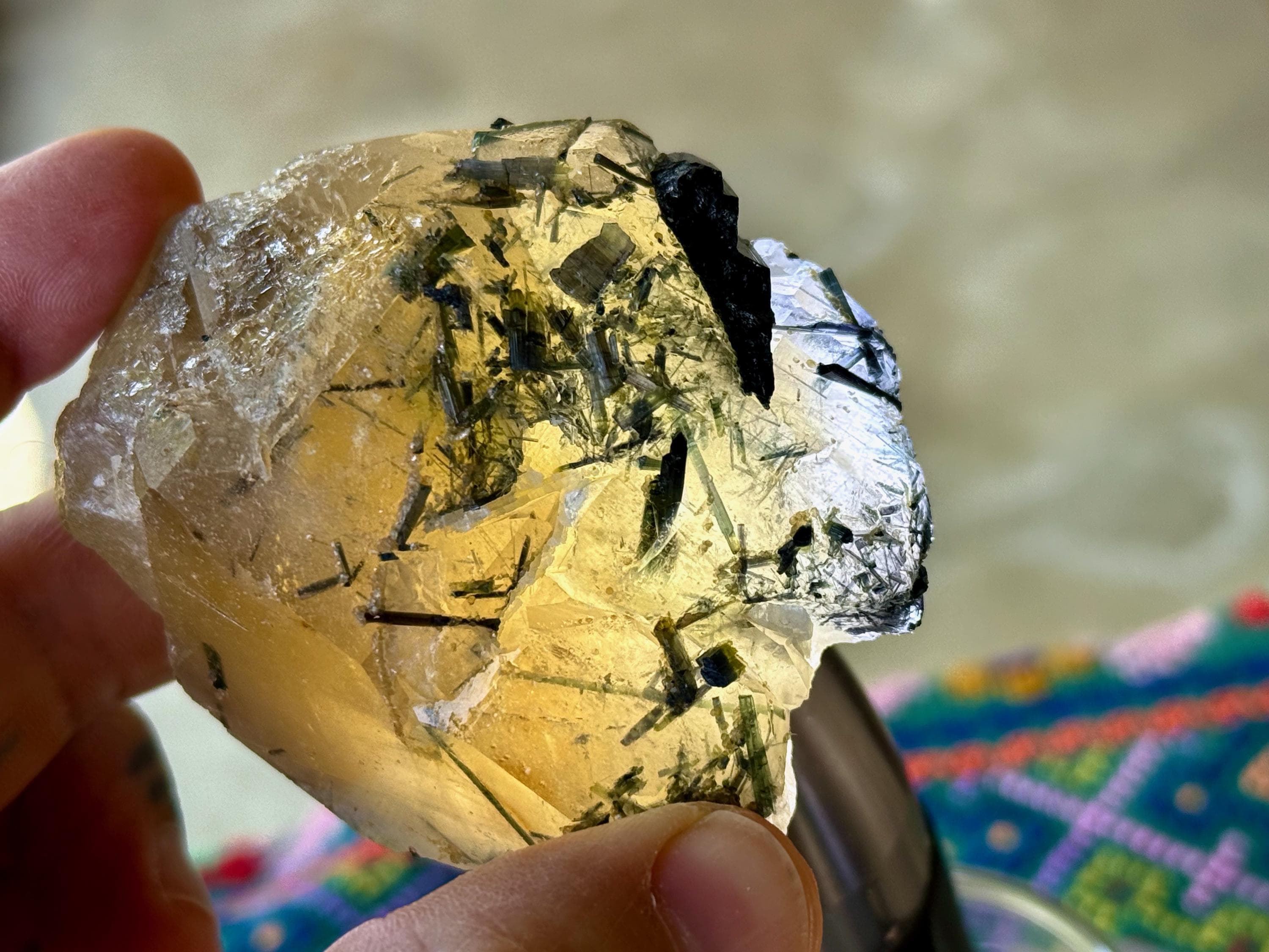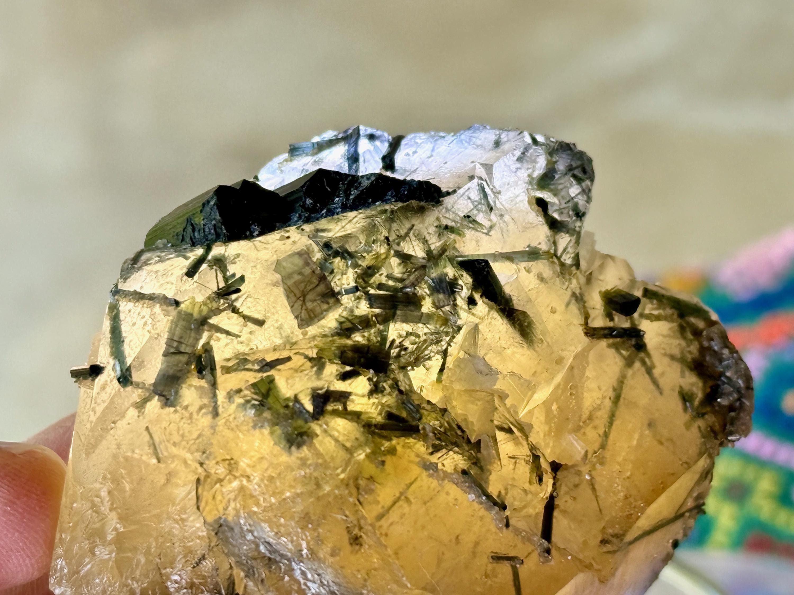 Great luster and a deep, smoky-golden color to this broad and chunky natural Citrine with an array of dark Blue & Green Tourmaline inclusions within.