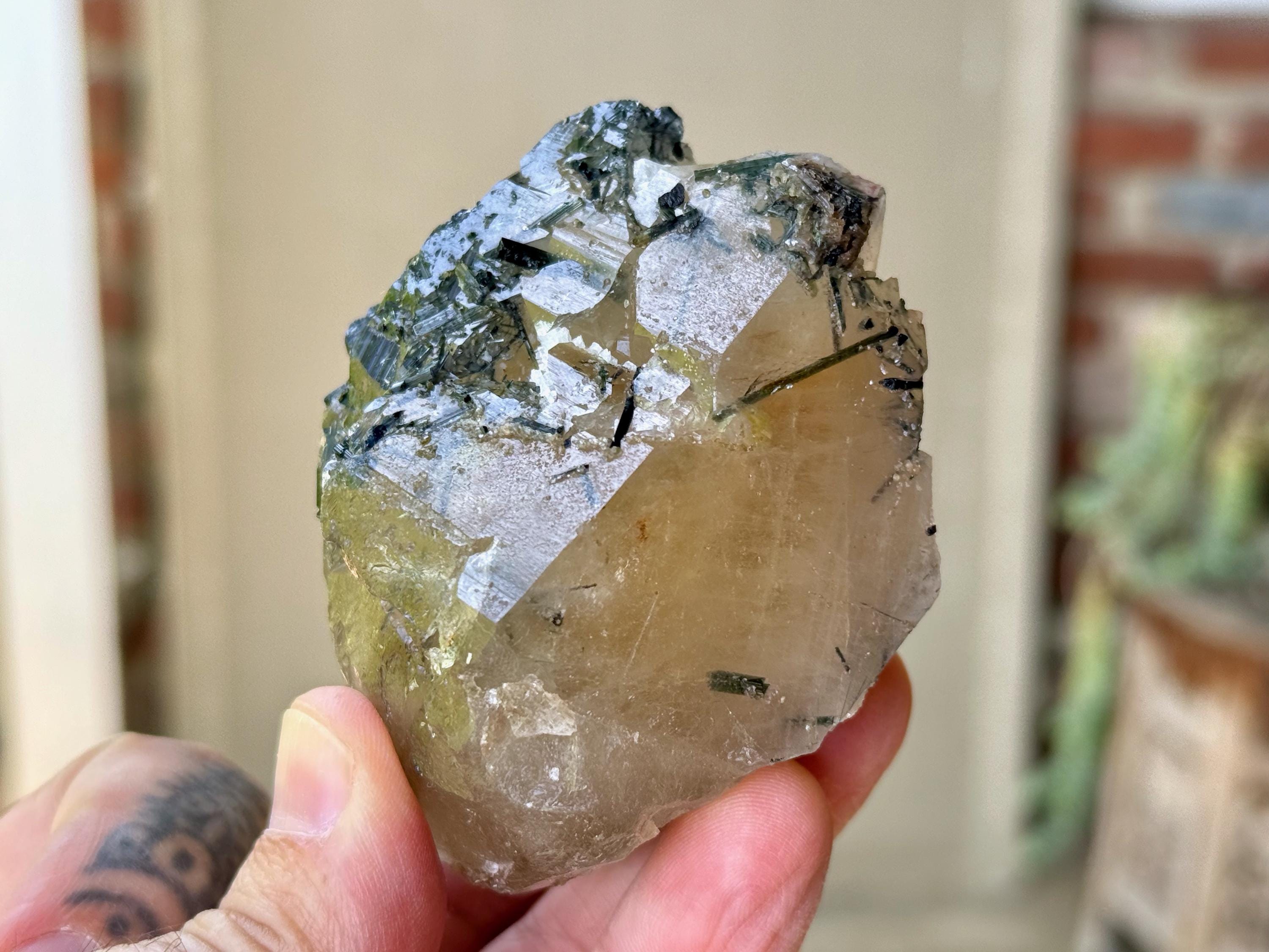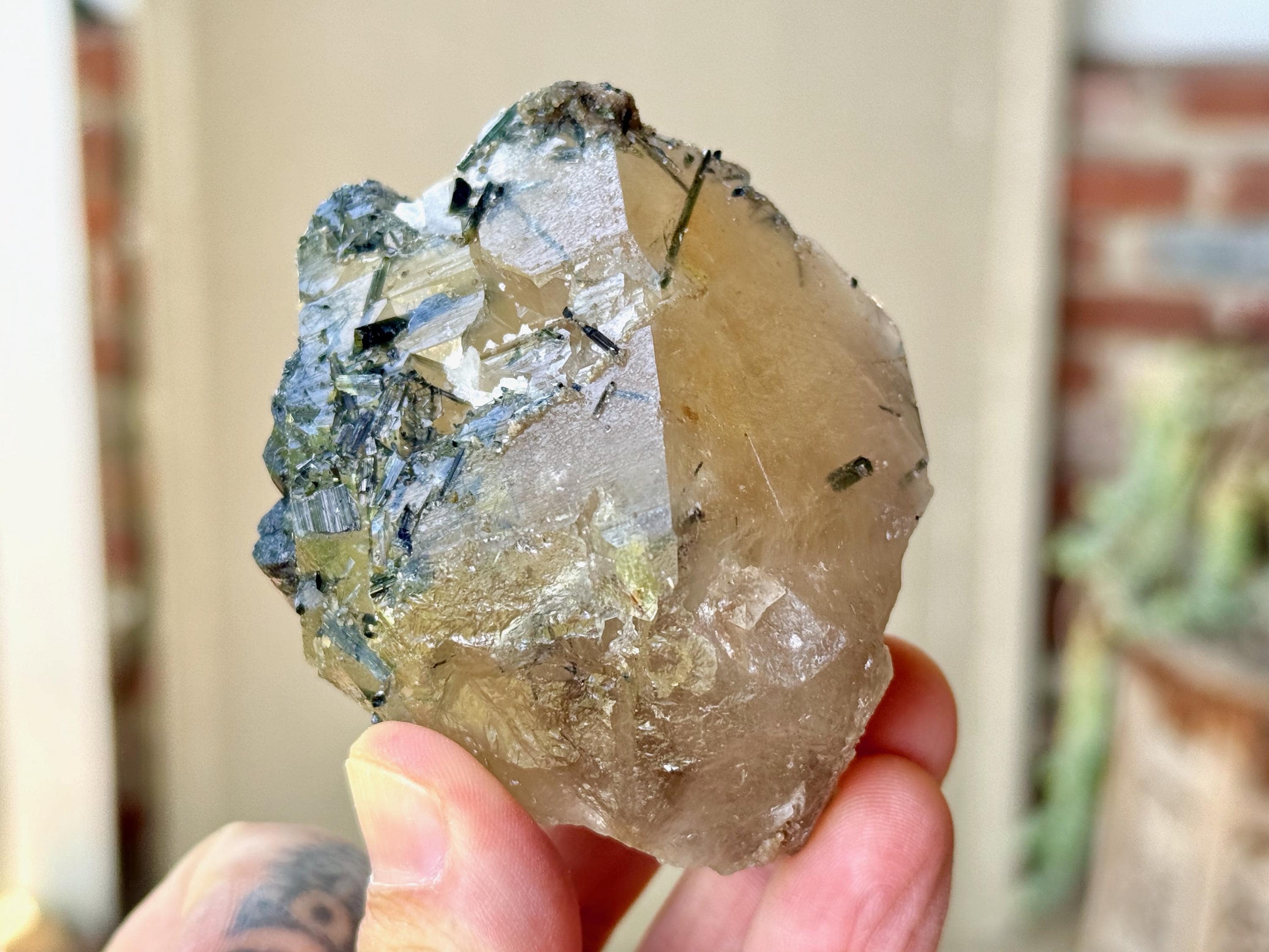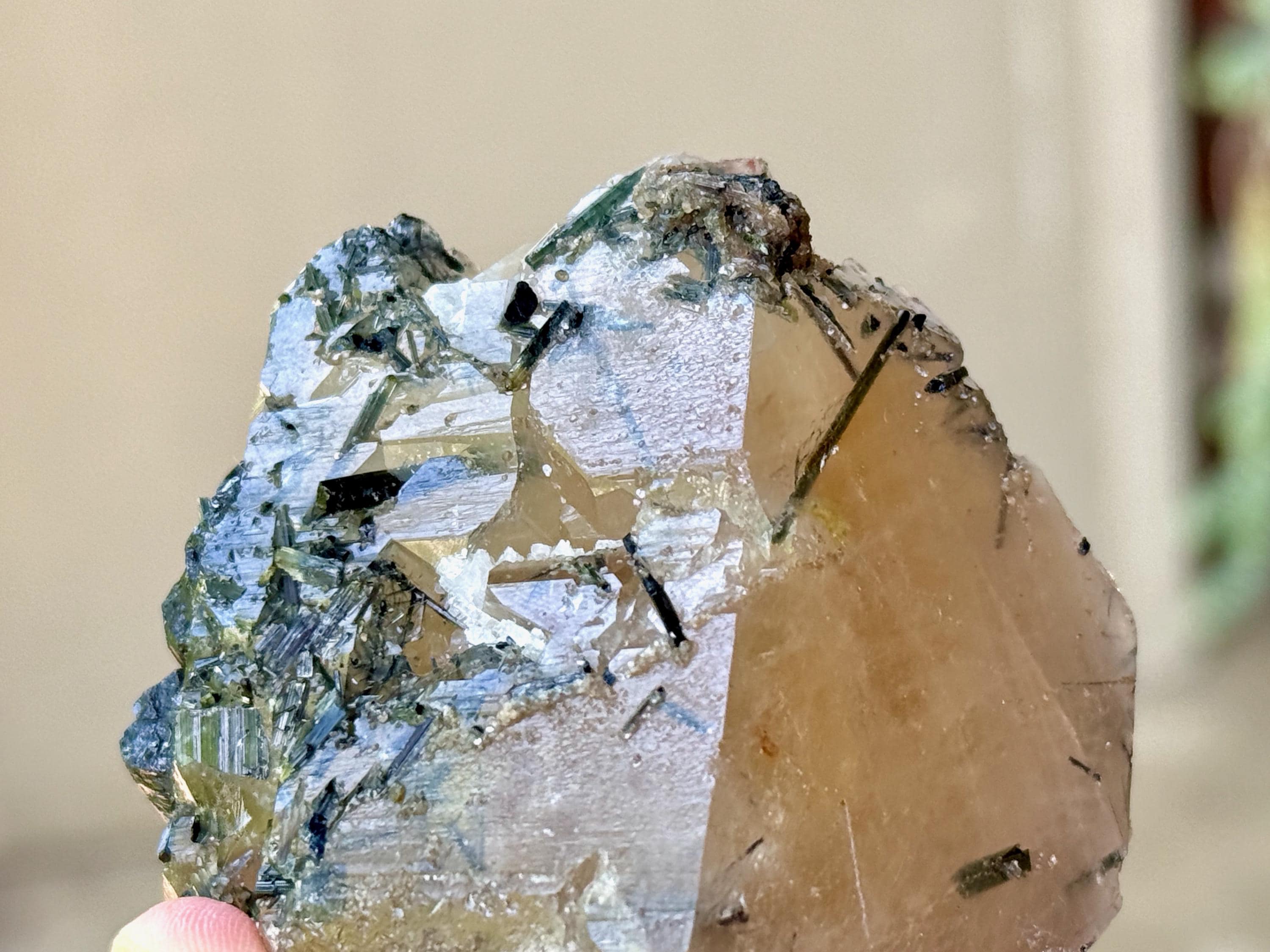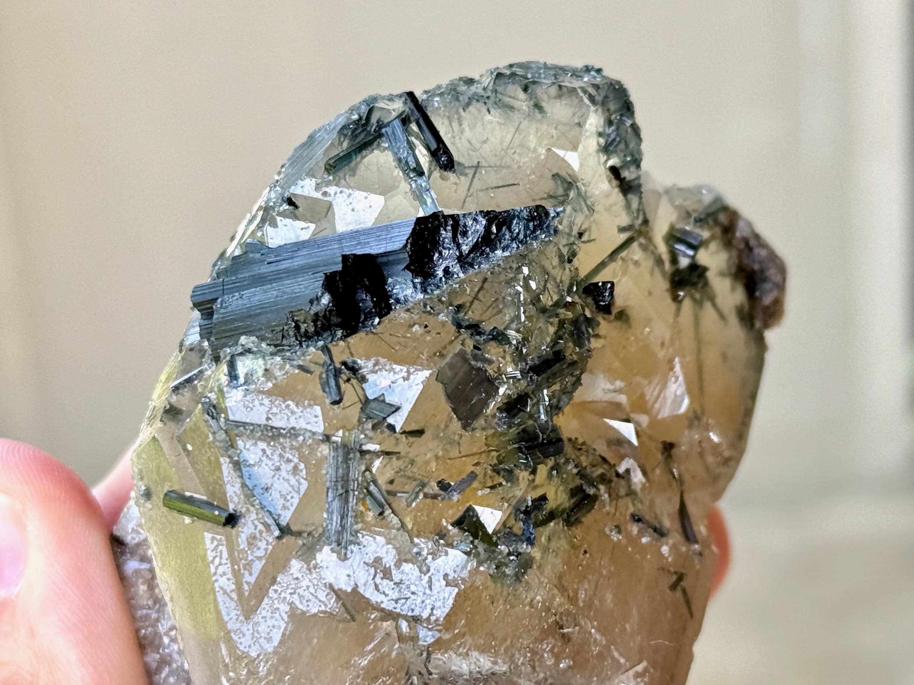 Great luster and a deep, smoky-golden color to this broad and chunky natural Citrine with an array of dark Blue & Green Tourmaline inclusions within.