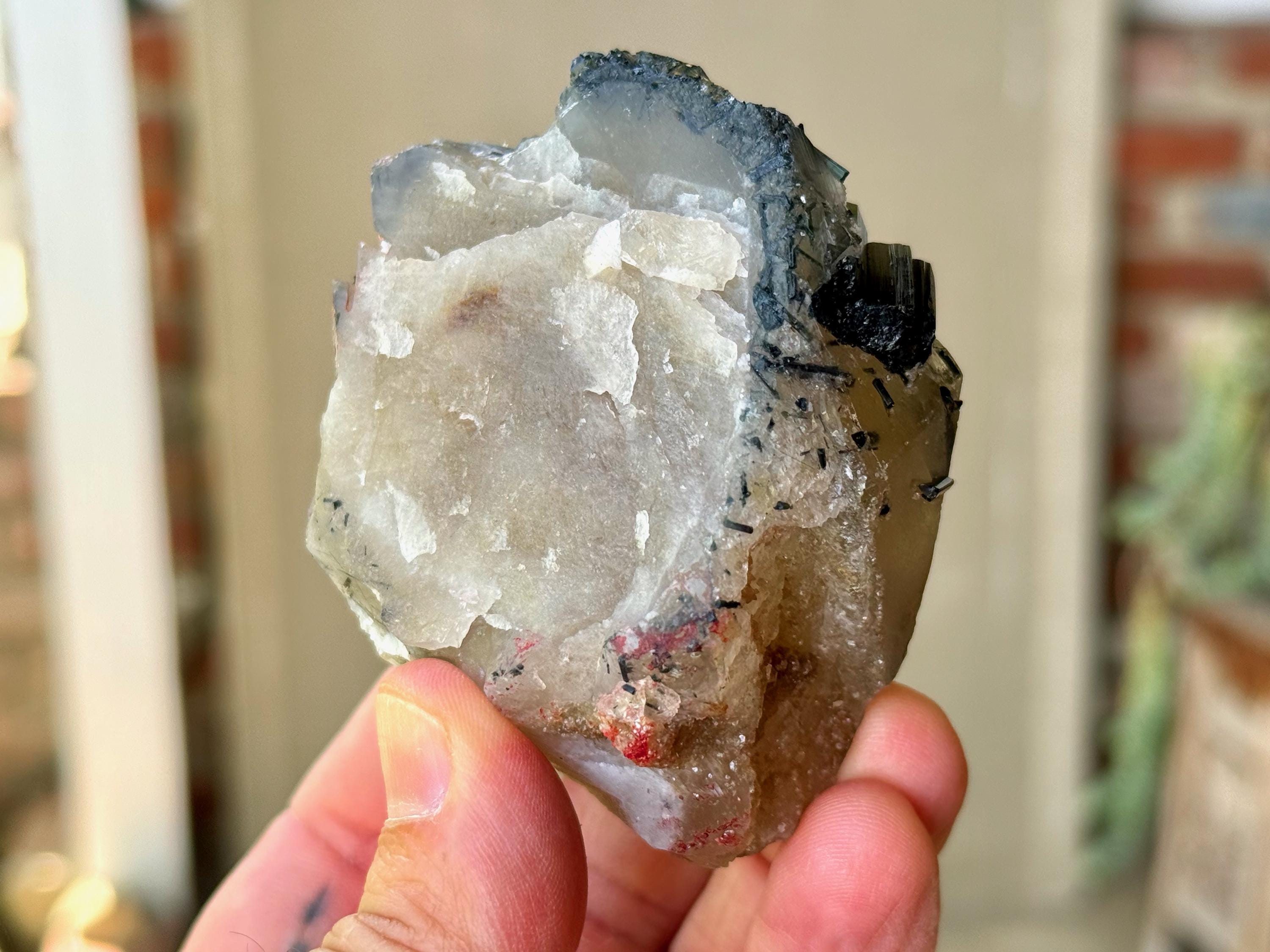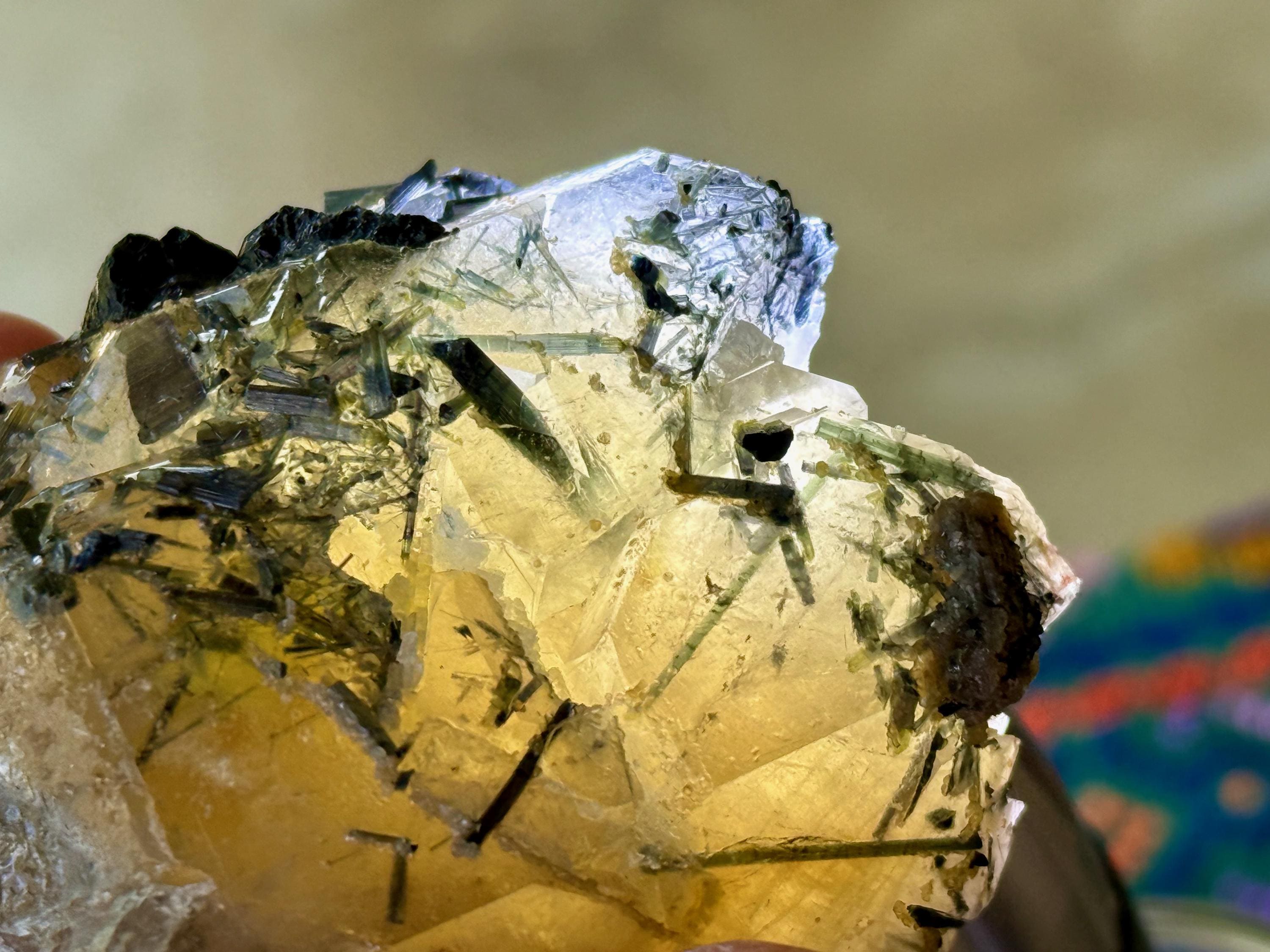 At first glance these inclusions appear to be black, but upon closer examination and a little backlighting, you'll find that these are actually Blue and Green Tourmalines (Photos 3-7).