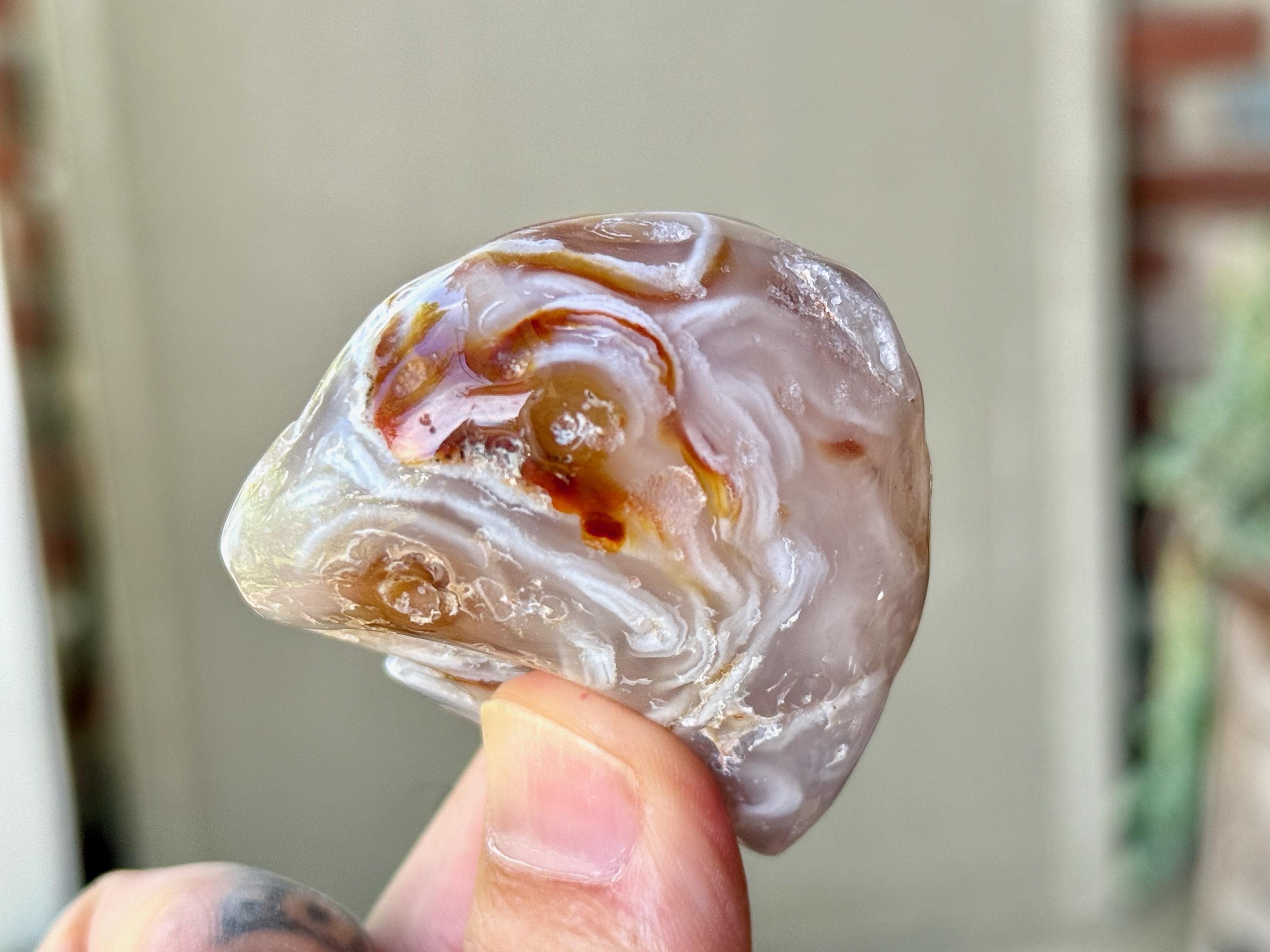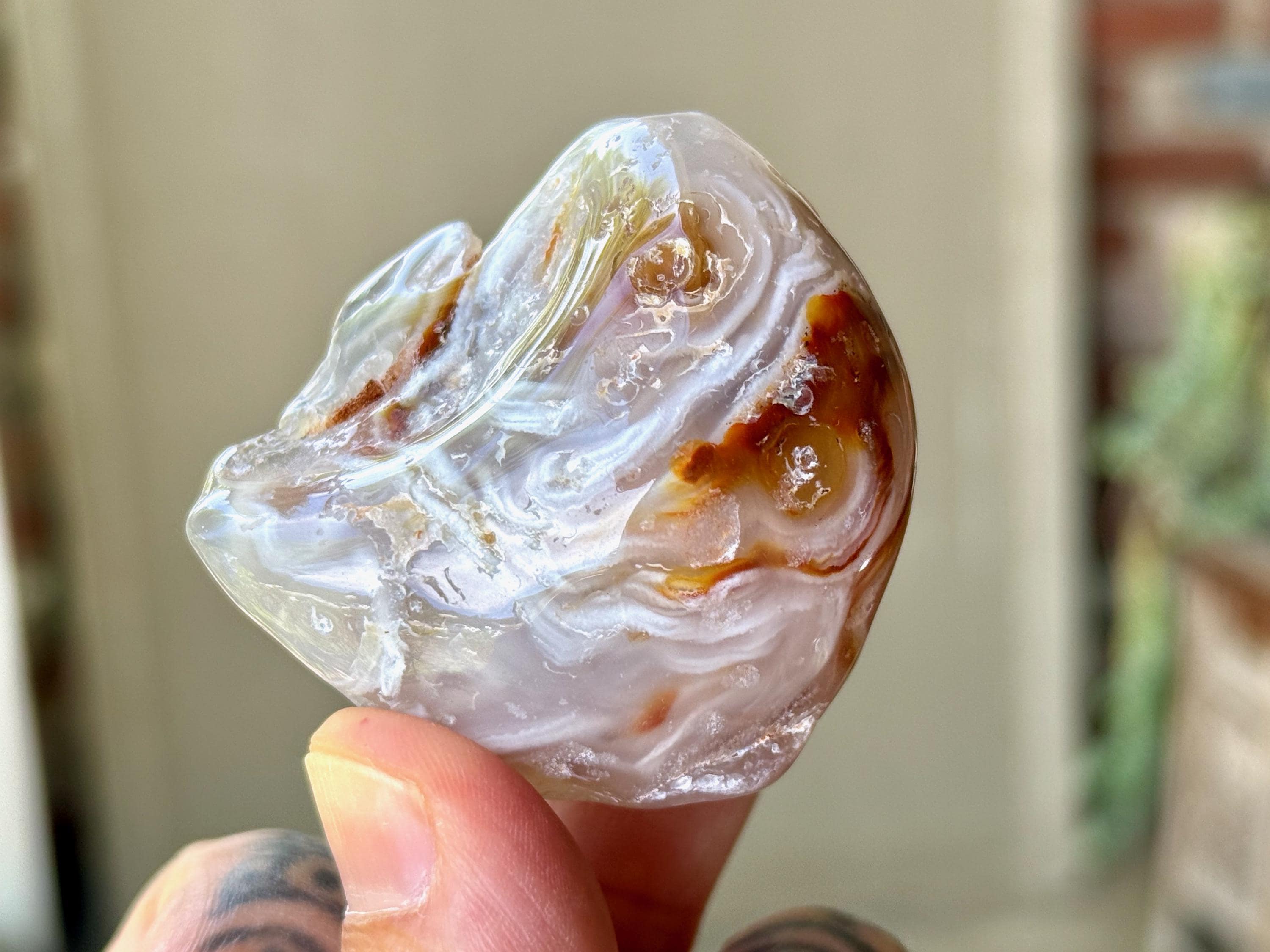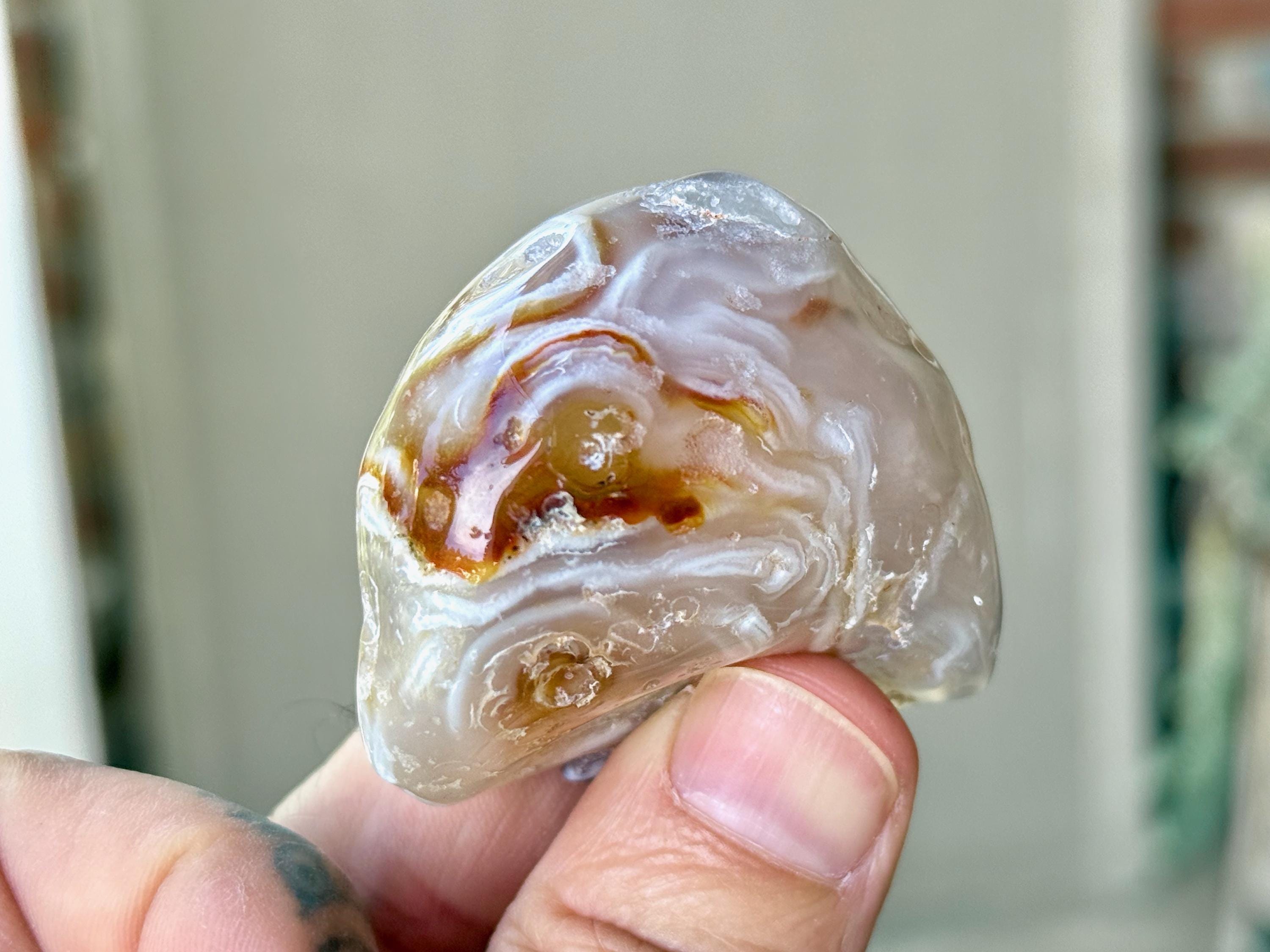 Beautiful swirling patterns of orange, gray and white adorn this aquatic Enhydro Agate. Of course what is most special about this piece is that it is absolutely FILLED with ancient water.