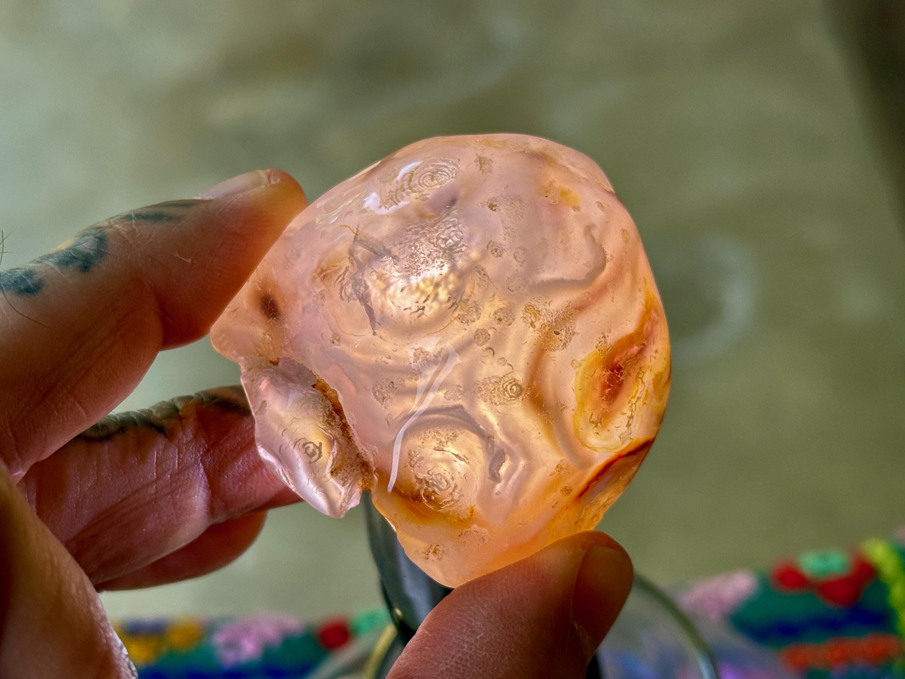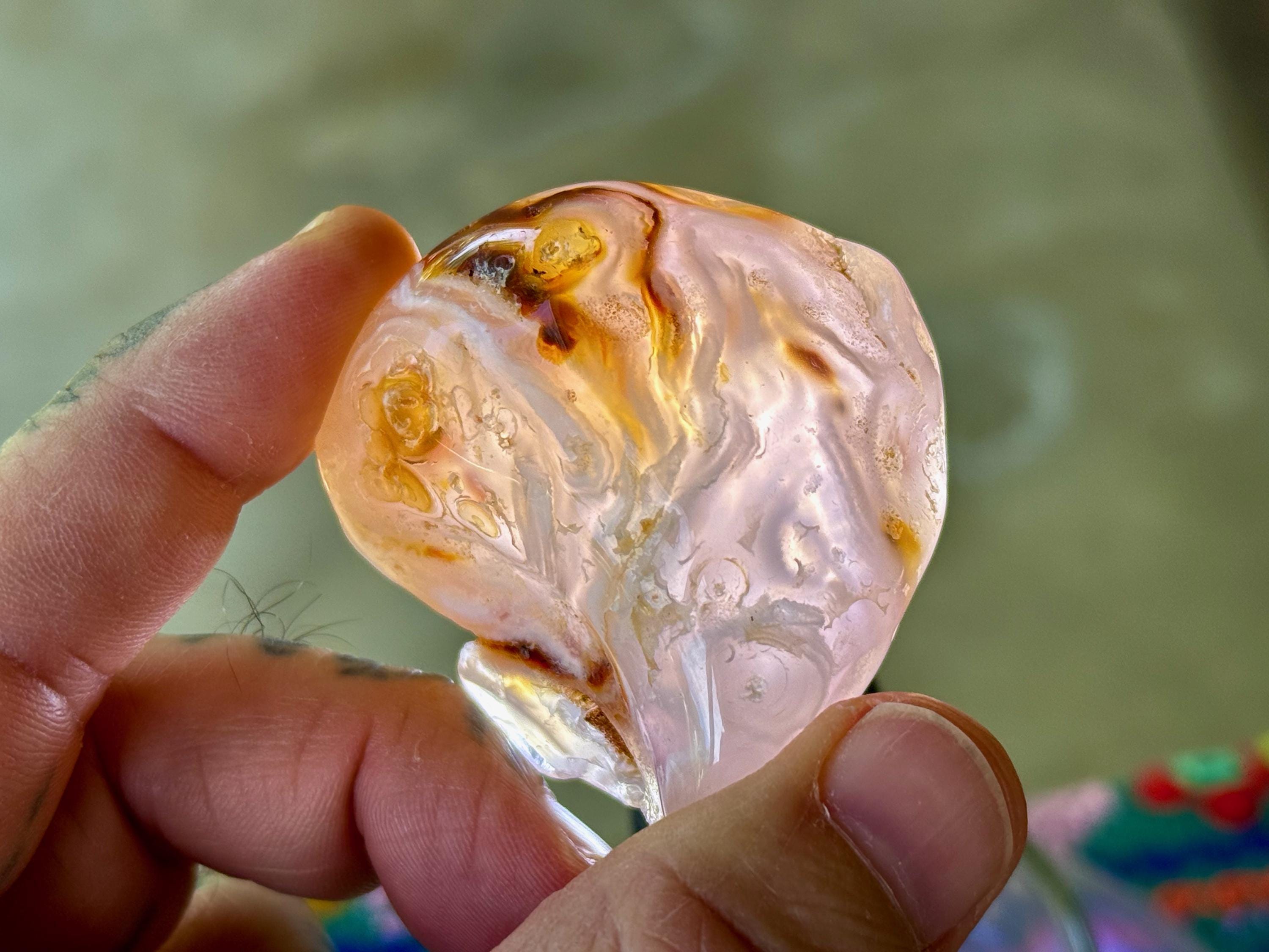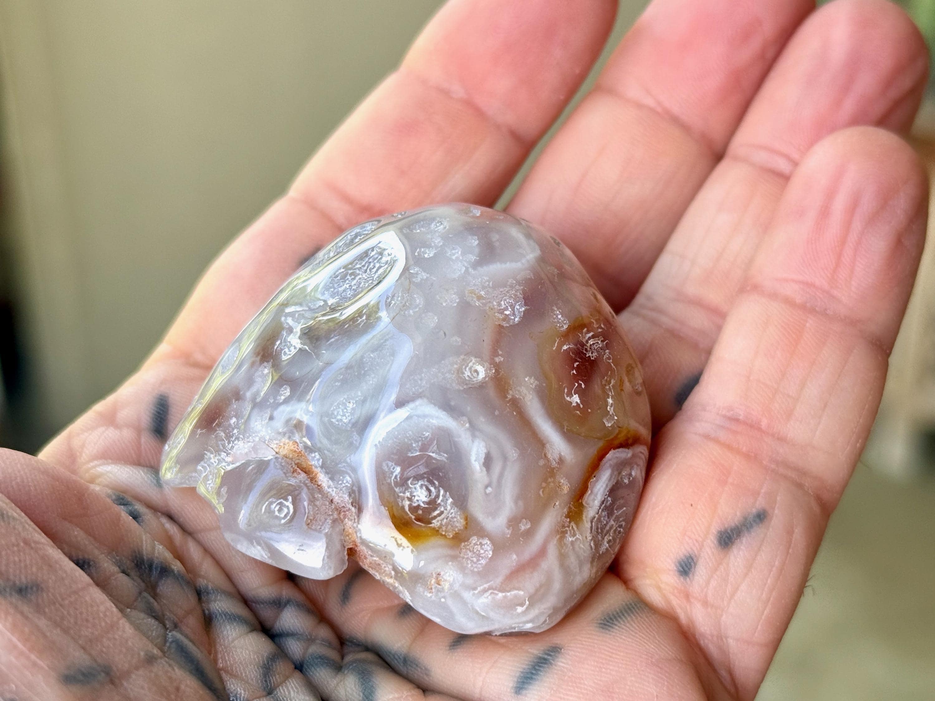 Beautiful swirling patterns of orange, gray and white adorn this aquatic Enhydro Agate. Of course what is most special about this piece is that it is absolutely FILLED with ancient water.