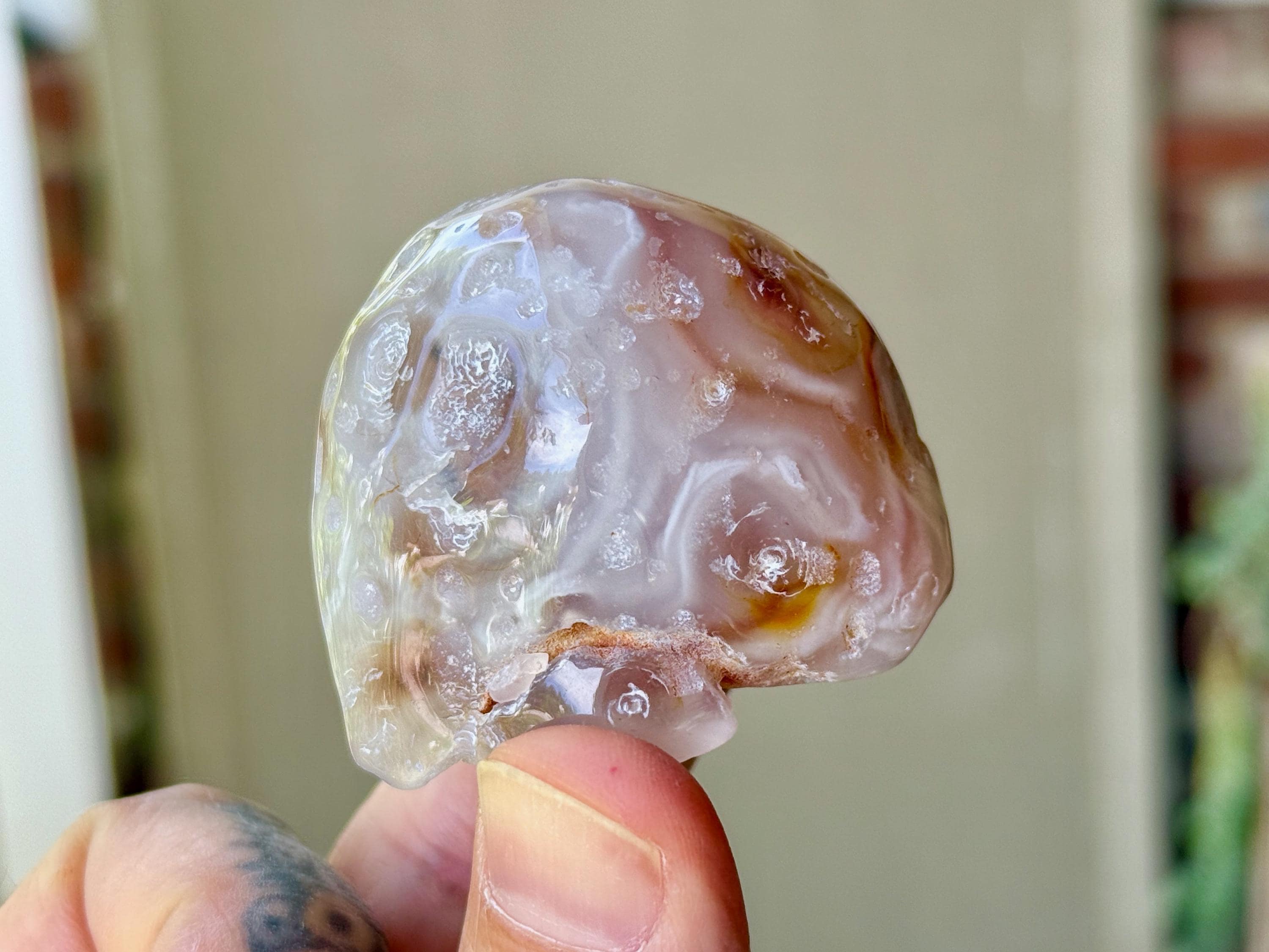 This beautiful Ocean Agate comes from a 2018 find in Rio Grande do Sul, Brazil. While it is absolutely beautiful to look at from a glance, it has a secret within that makes it incredibly special and rare: it contains quite a large amount of water inside!