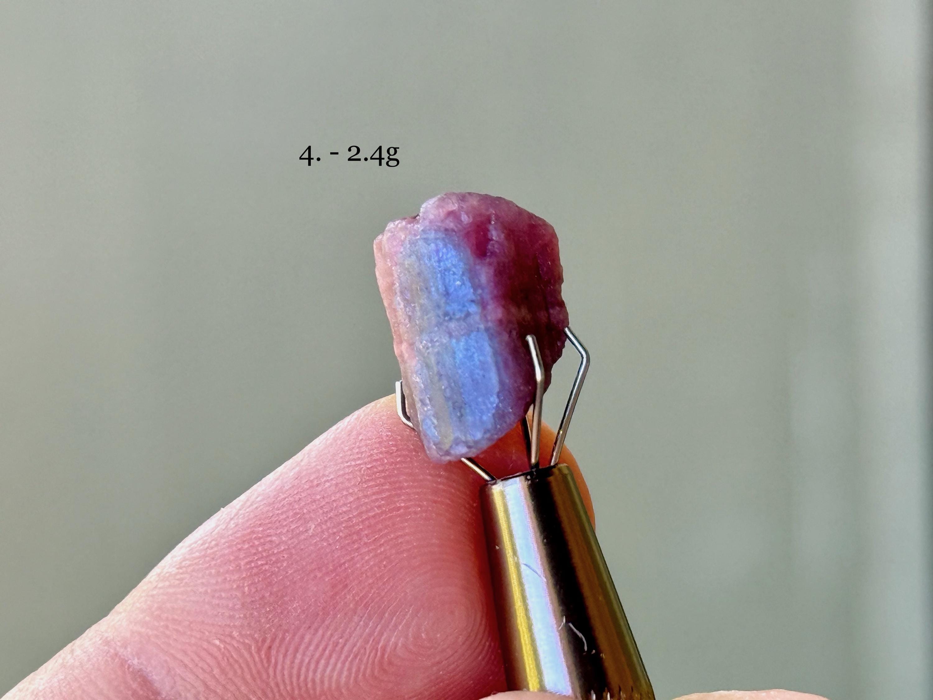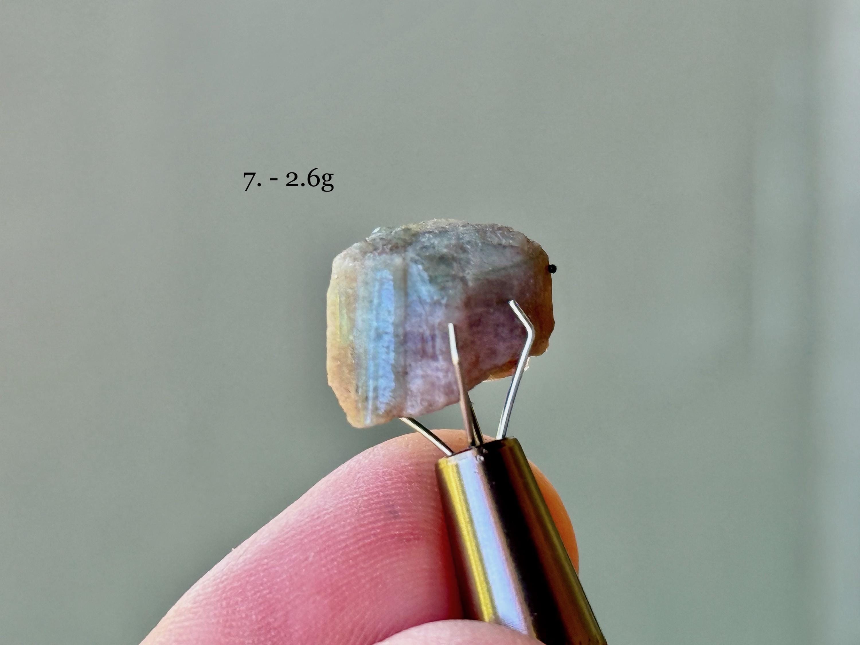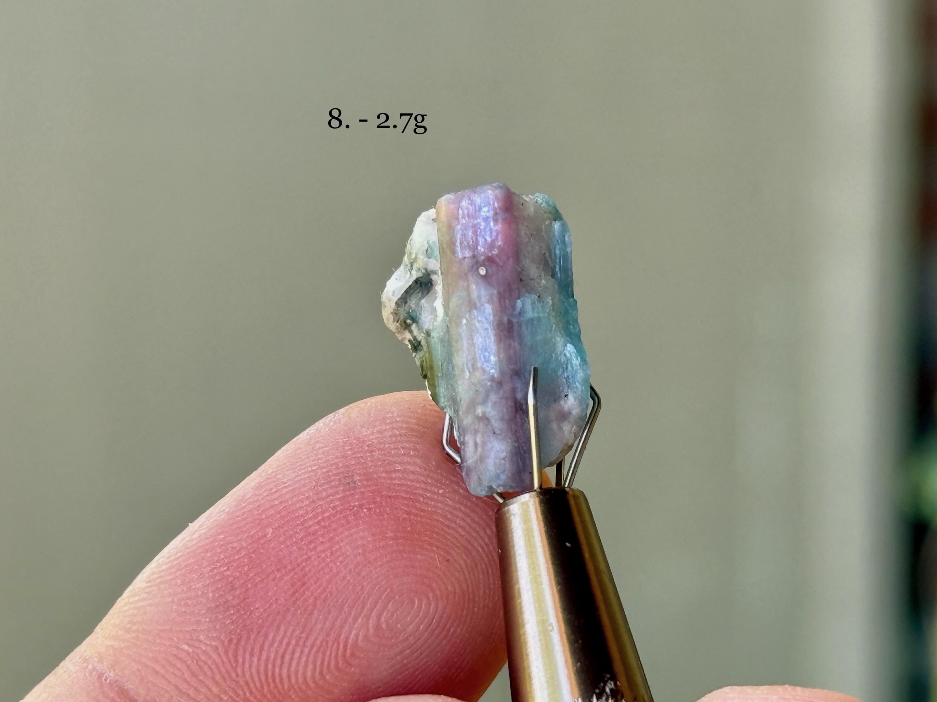 A colorful selection of small-sized Paraiba Tourmalines with bicolor blue and pink (and some green and purple) hues. Most of these crystals feature partial formations, with some portion of the interior exposed. Some, though not all, may have some terminated portions, and some have Quartz attached. We've included photos in natural light and backlit to show off their translucency.