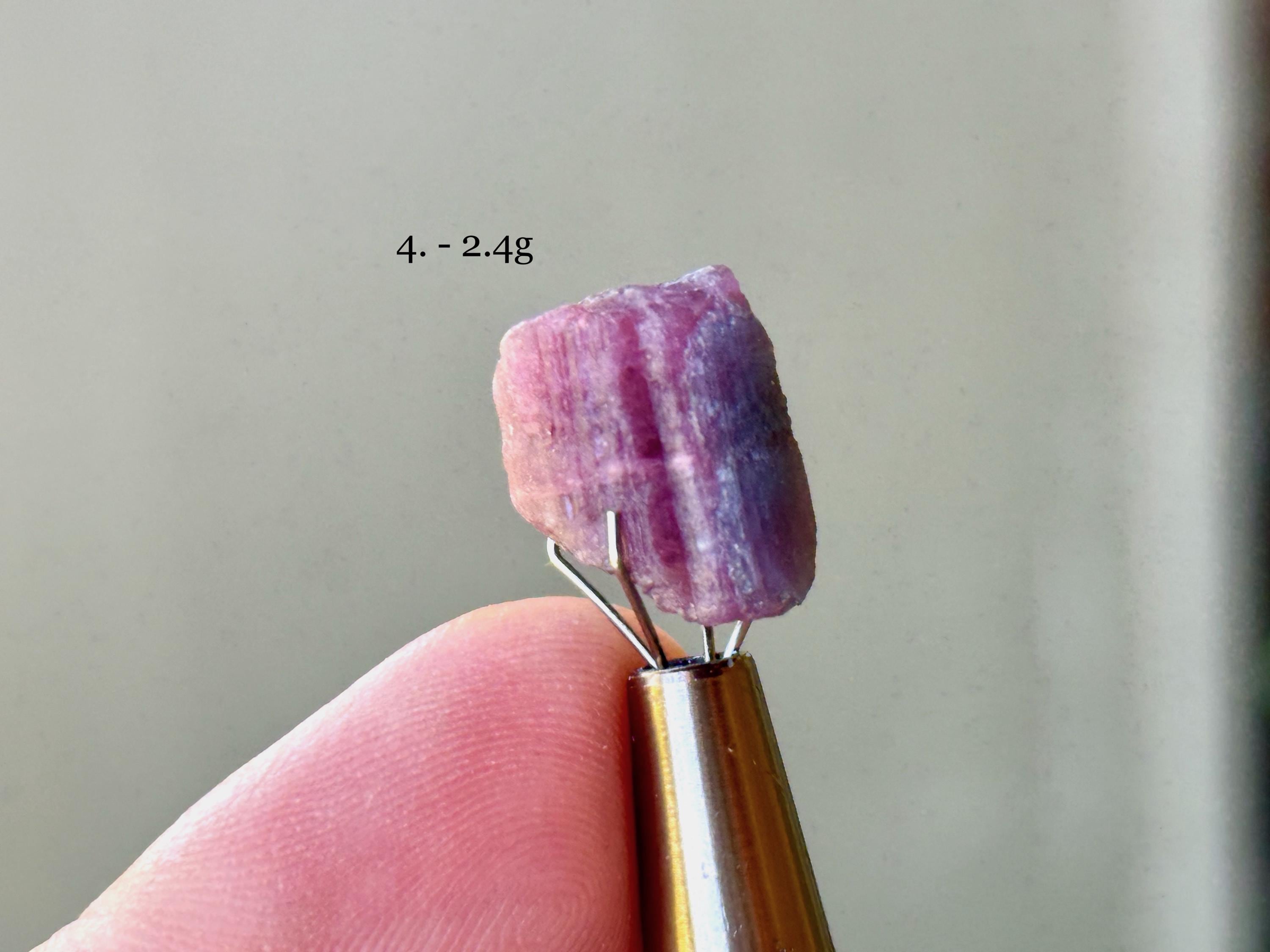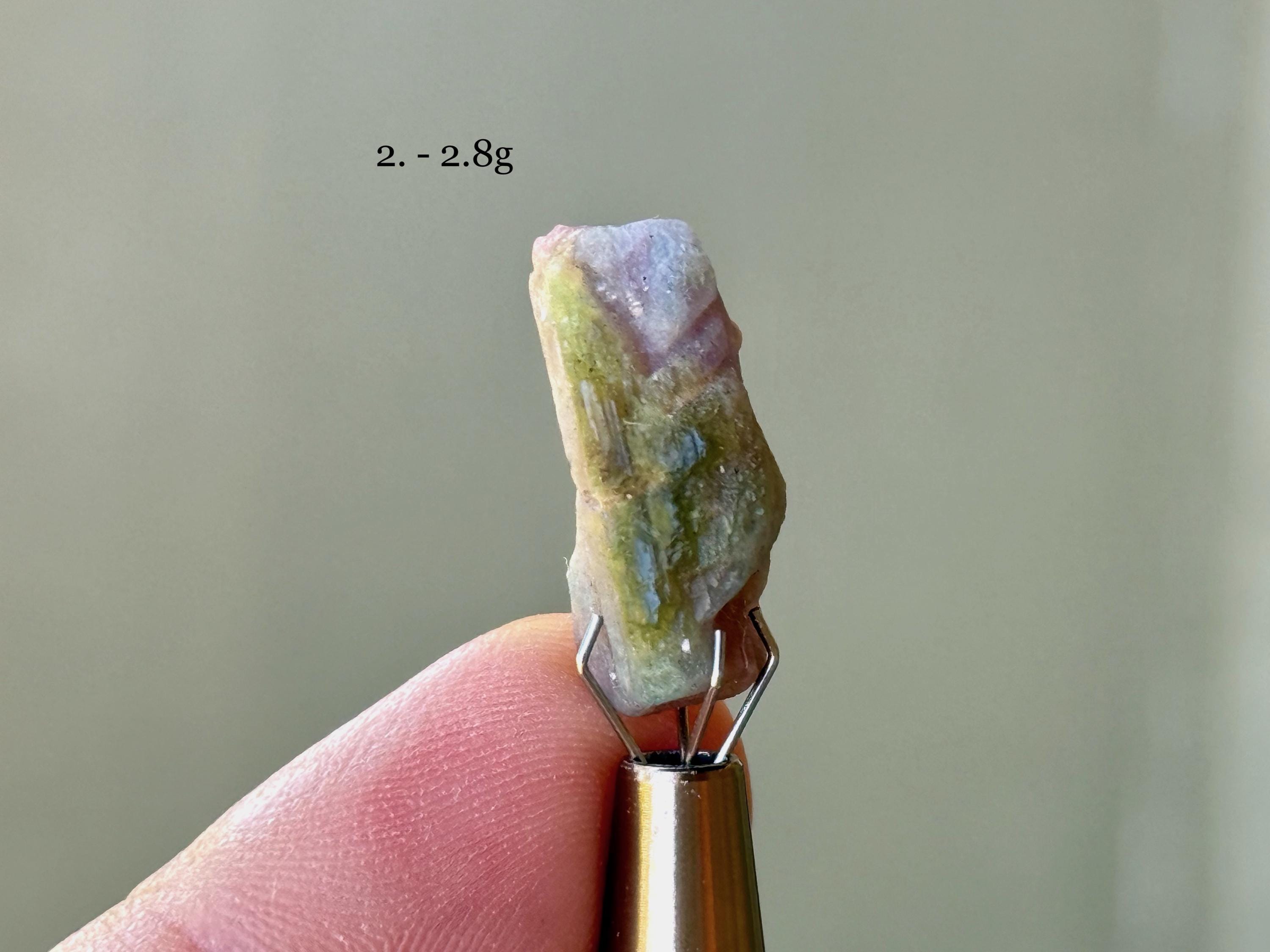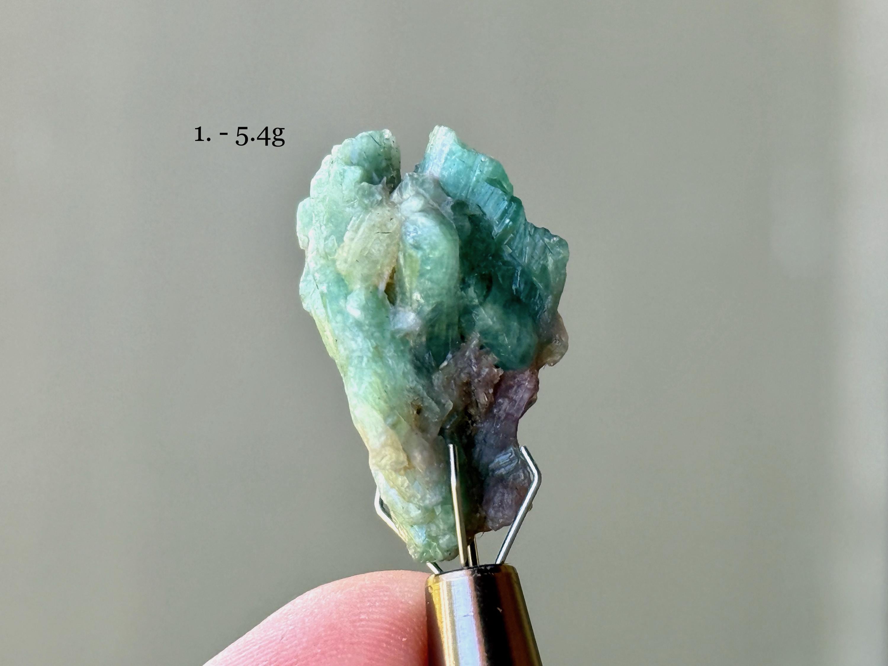 A colorful selection of small-sized Paraiba Tourmalines with bicolor blue and pink (and some green and purple) hues. Most of these crystals feature partial formations, with some portion of the interior exposed. Some, though not all, may have some terminated portions, and some have Quartz attached. We've included photos in natural light and backlit to show off their translucency.