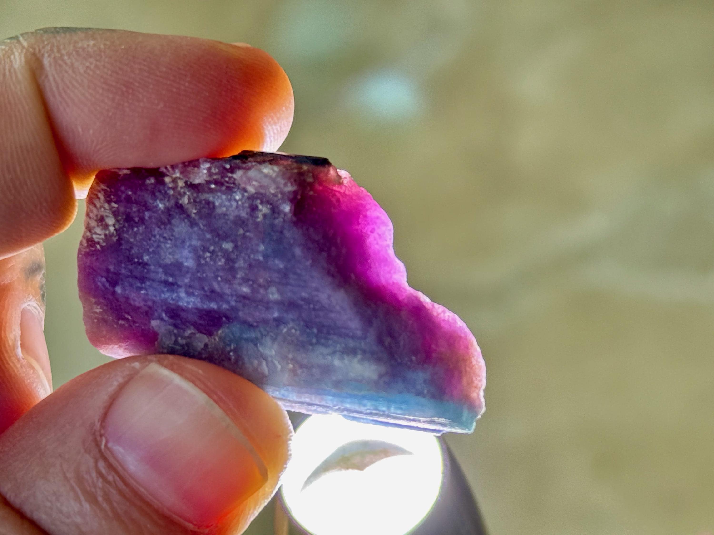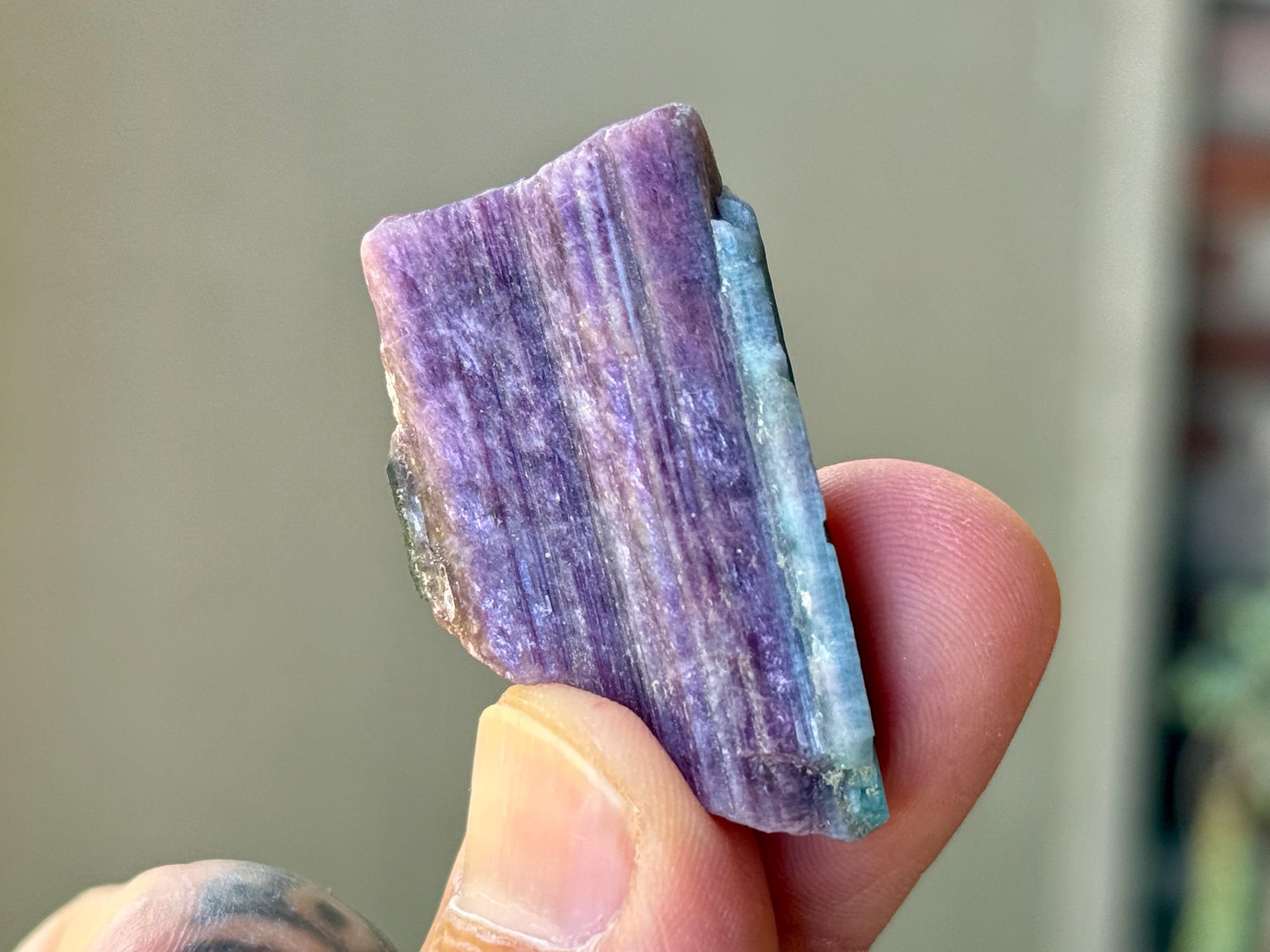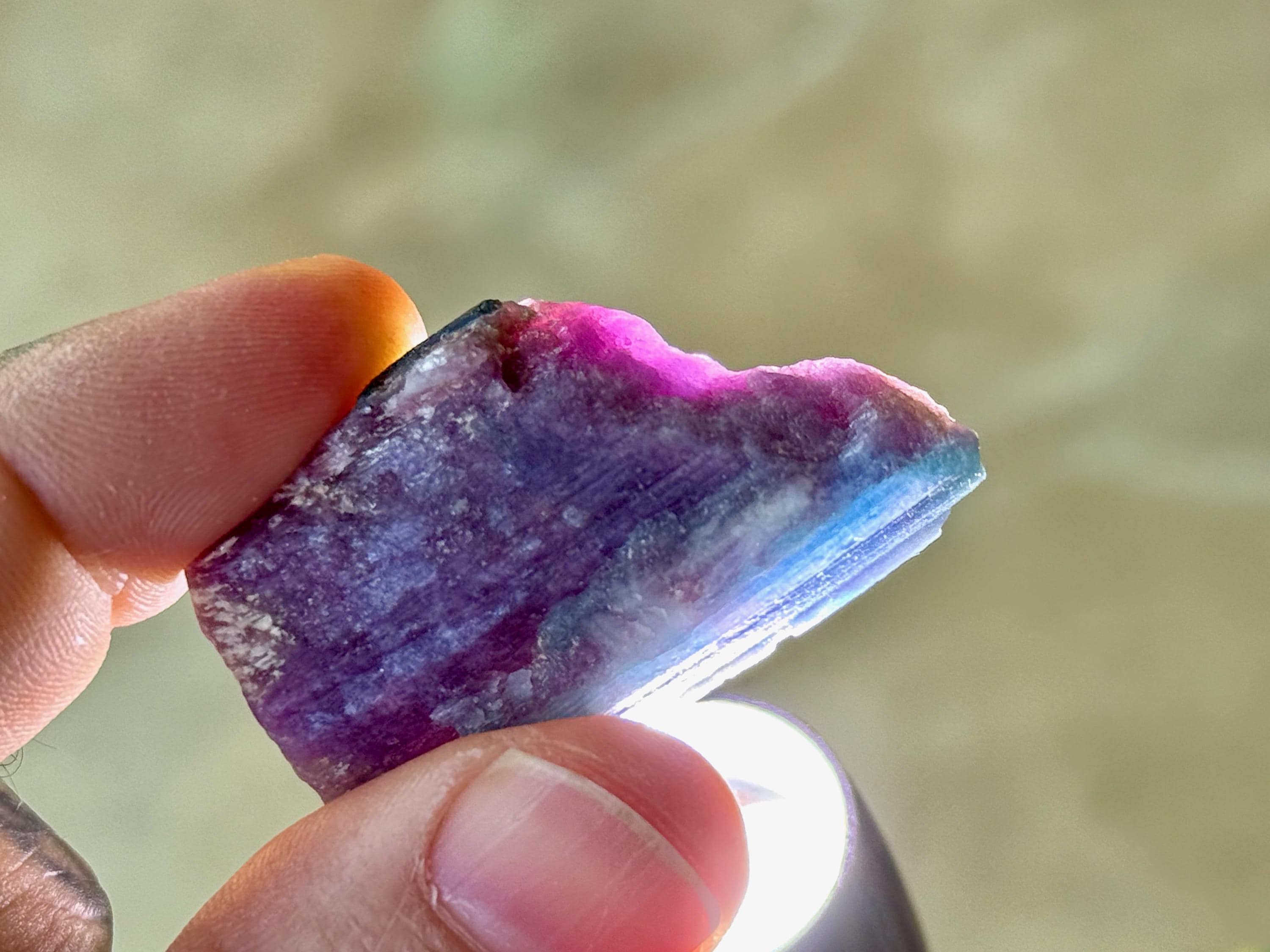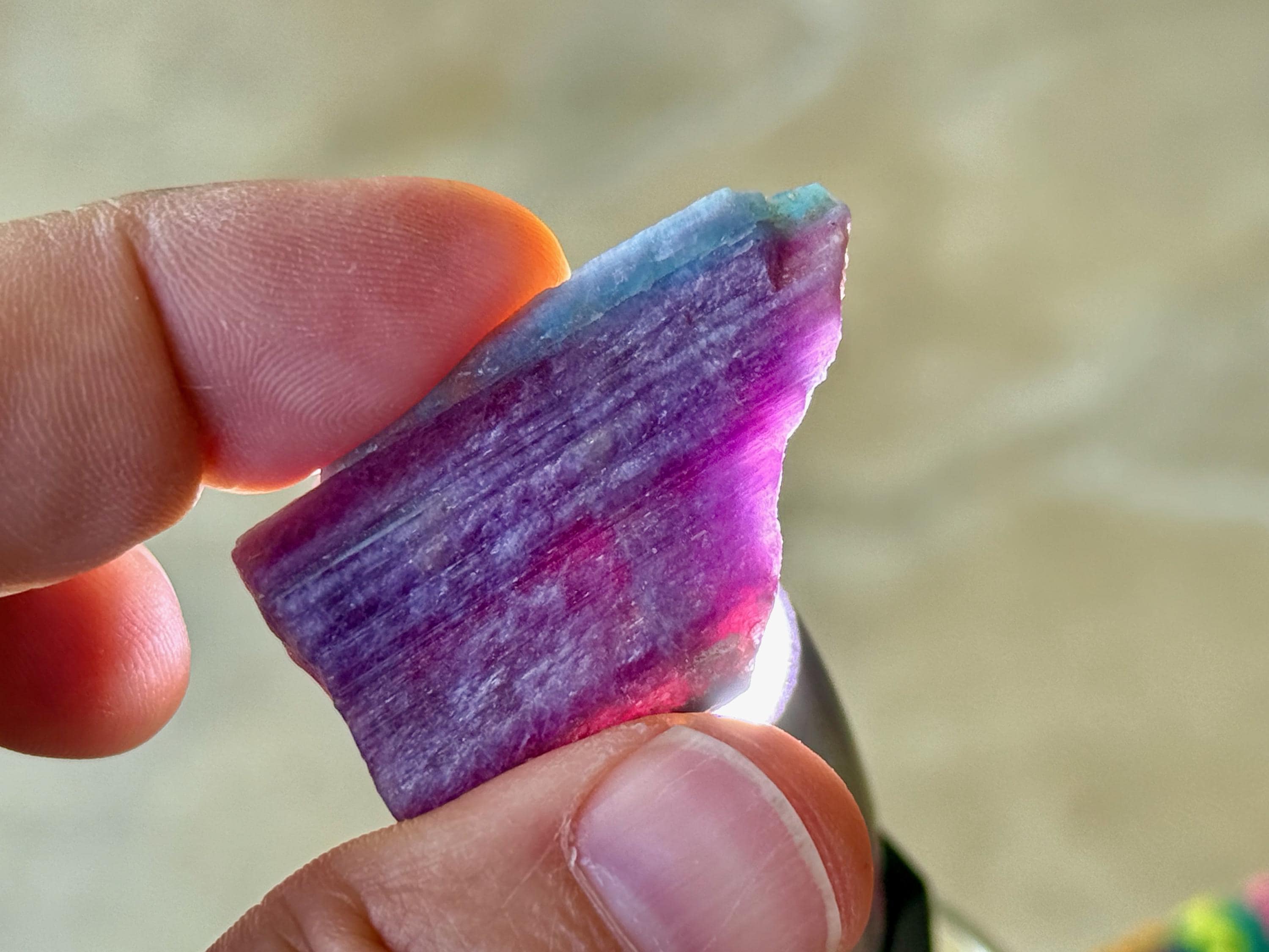 This exceptional multicolor Paraiba Tourmaline comes from an old find in Paraiba State, Brazil. This piece features colors of pinkish-purple and blue.