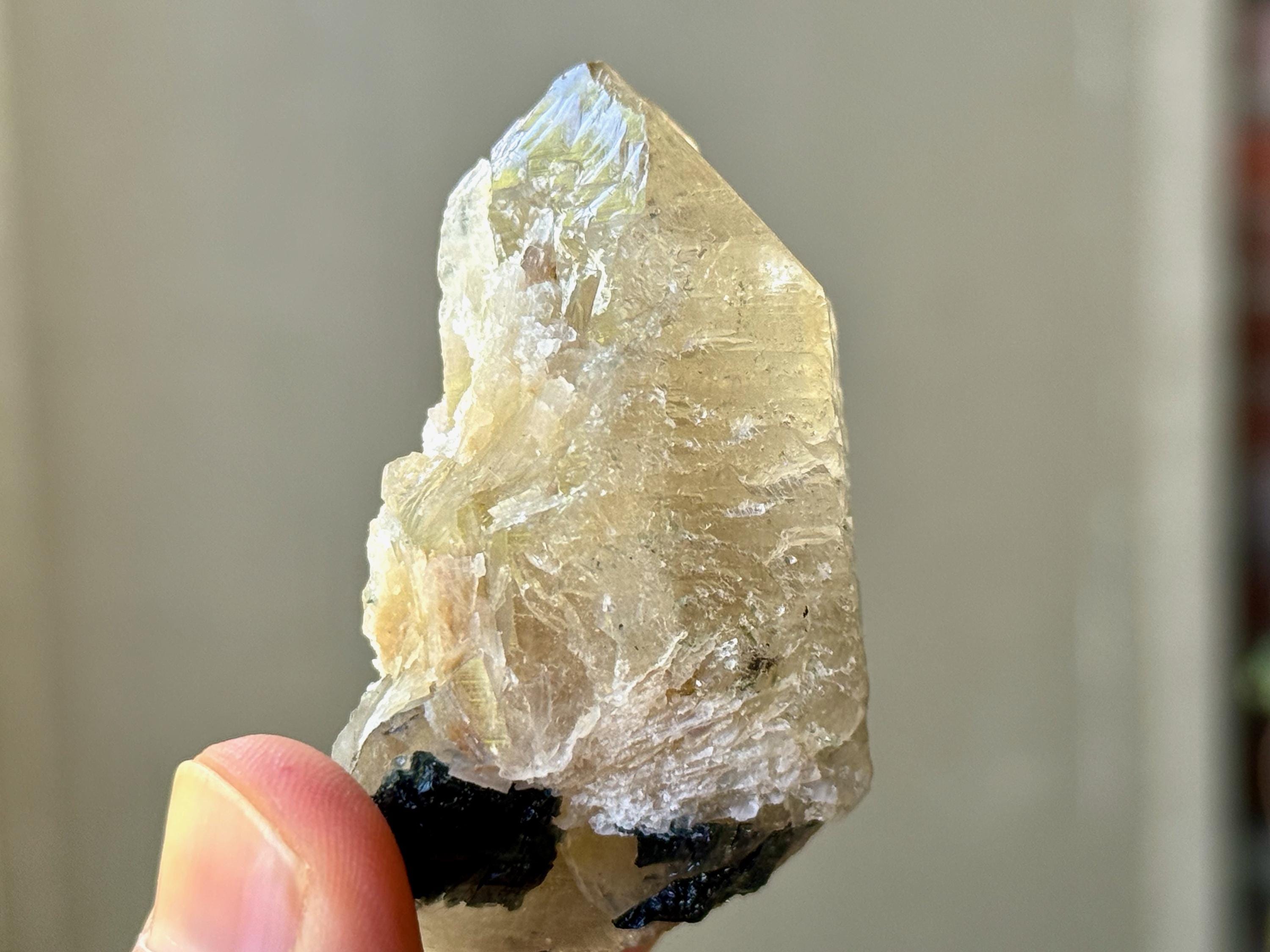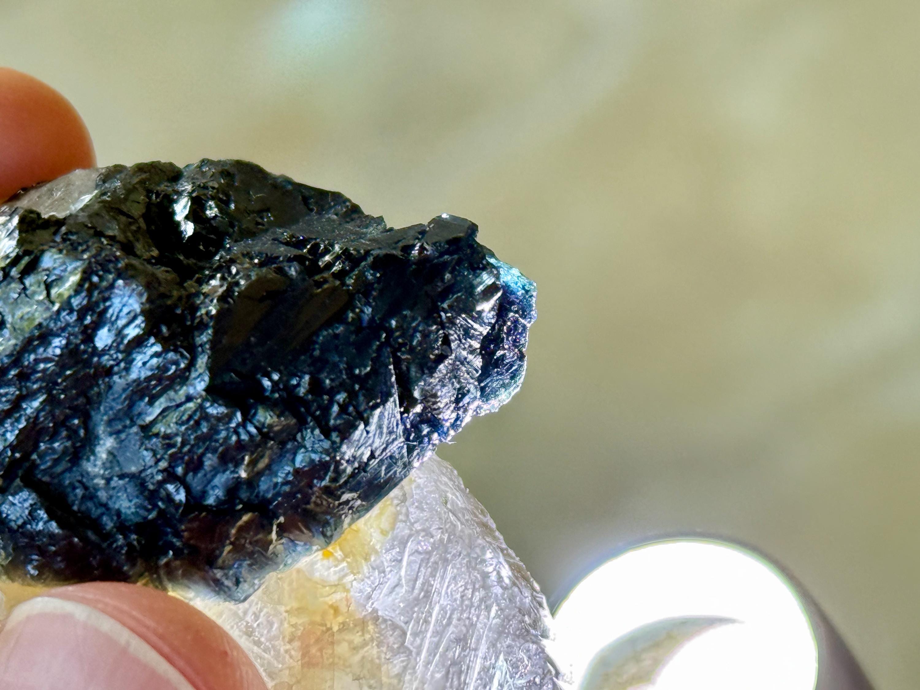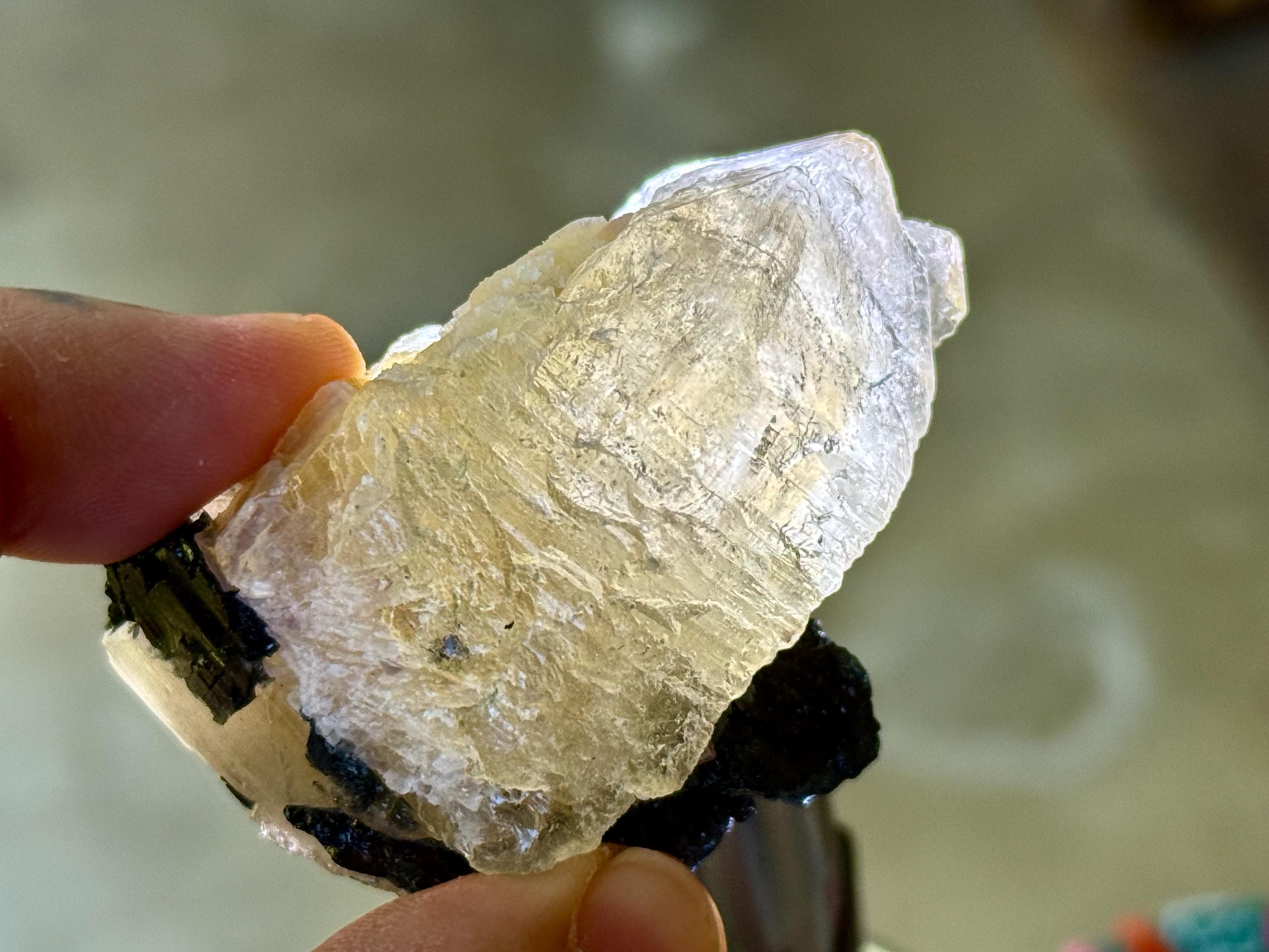 This crystal has a glassy complexion, with beautiful etched textures on its body and facets. The Tourmaline at the base appears black, but if we backlight it around the edges, we can see hints of blue (Photos 4-6).