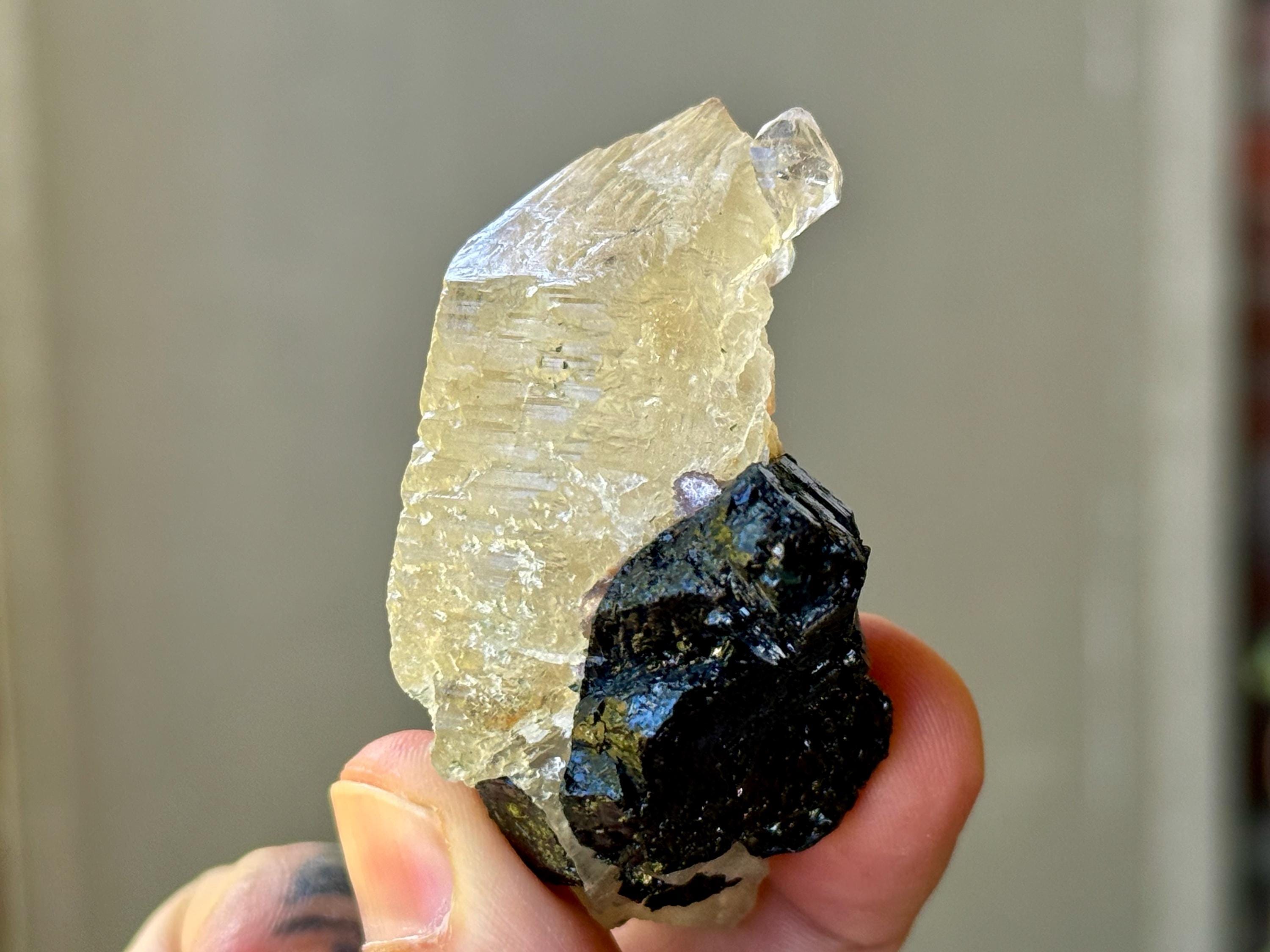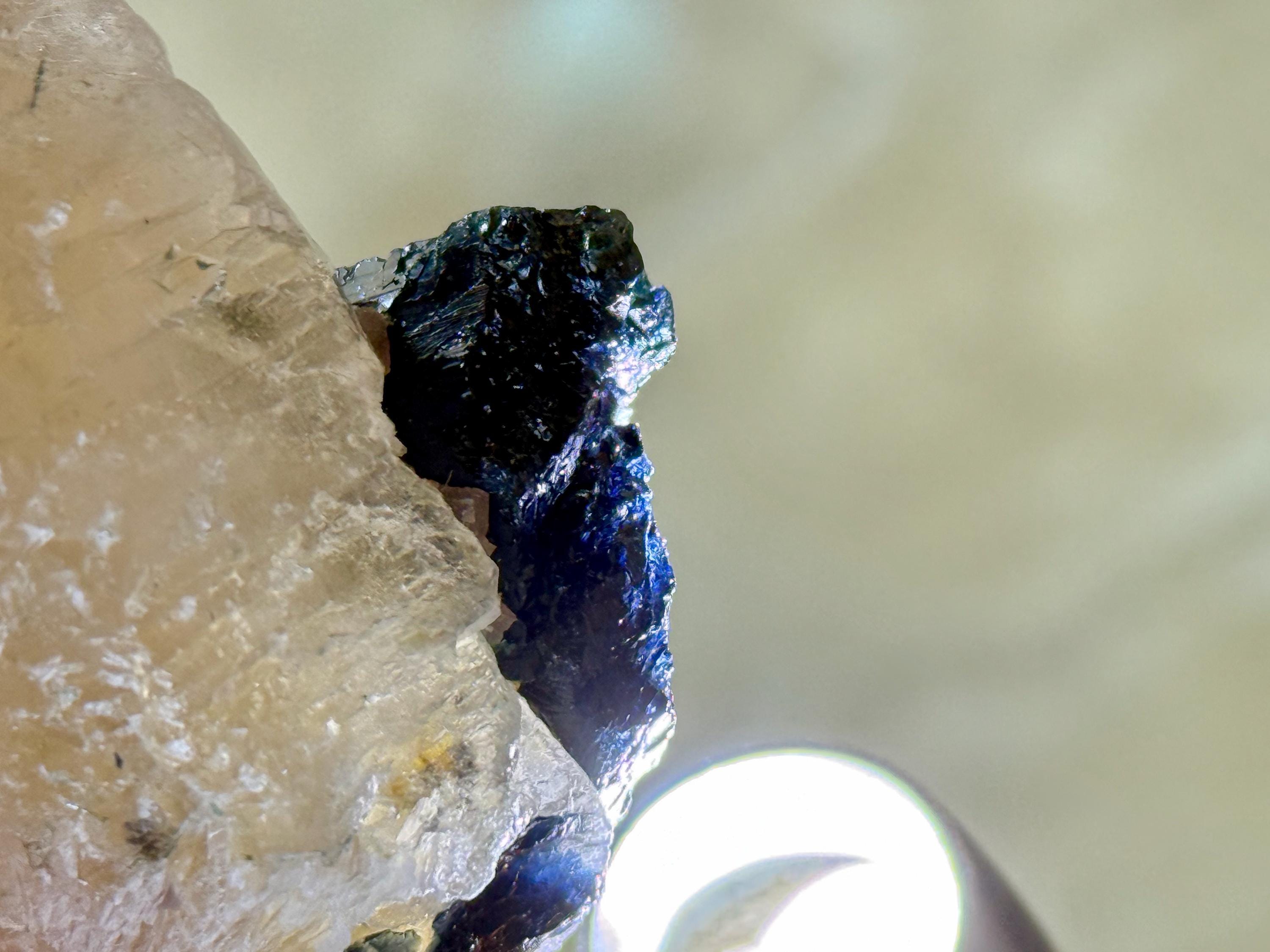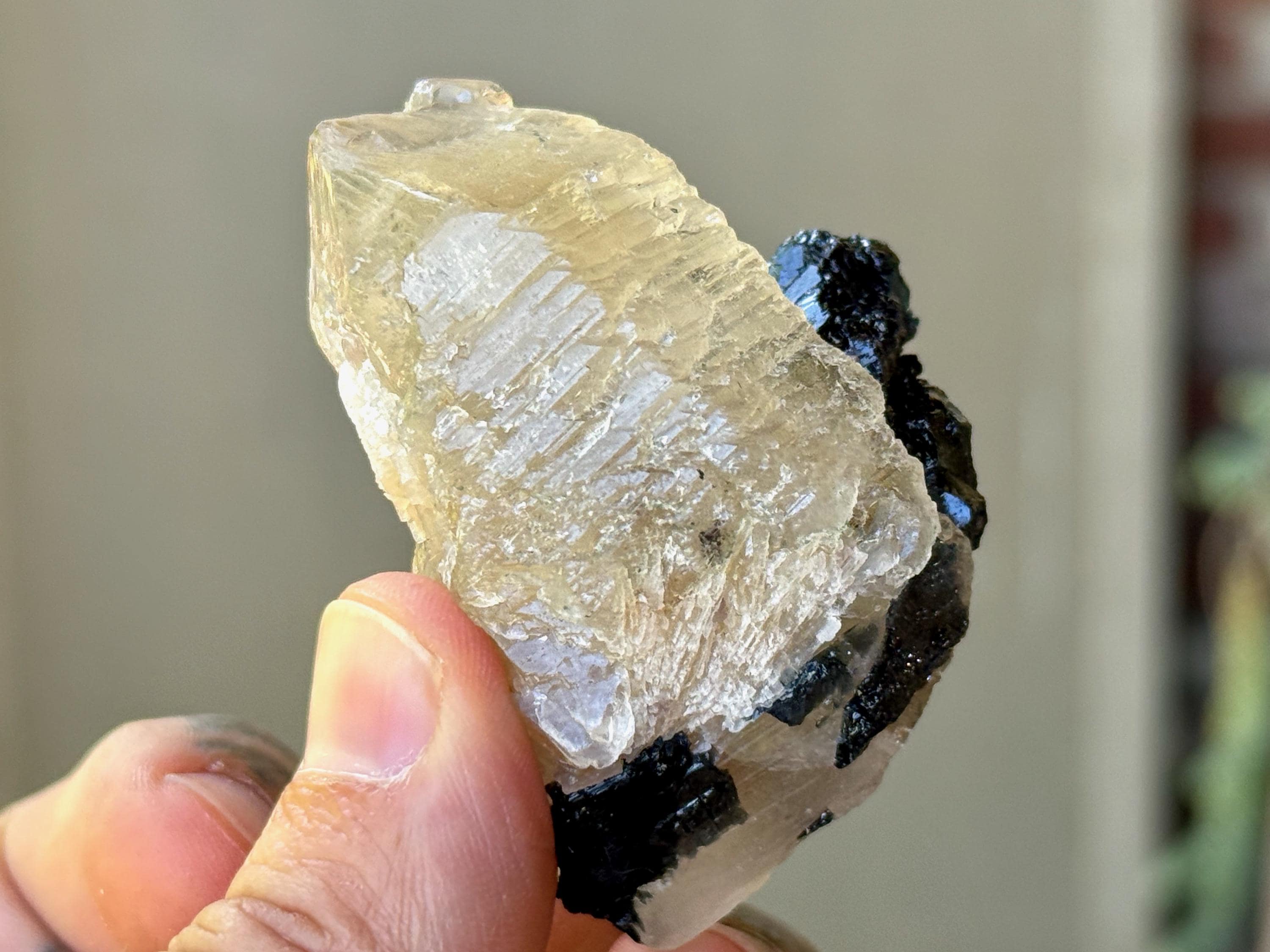 This crystal has a glassy complexion, with beautiful etched textures on its body and facets. The Tourmaline at the base appears black, but if we backlight it around the edges, we can see hints of blue (Photos 4-6).