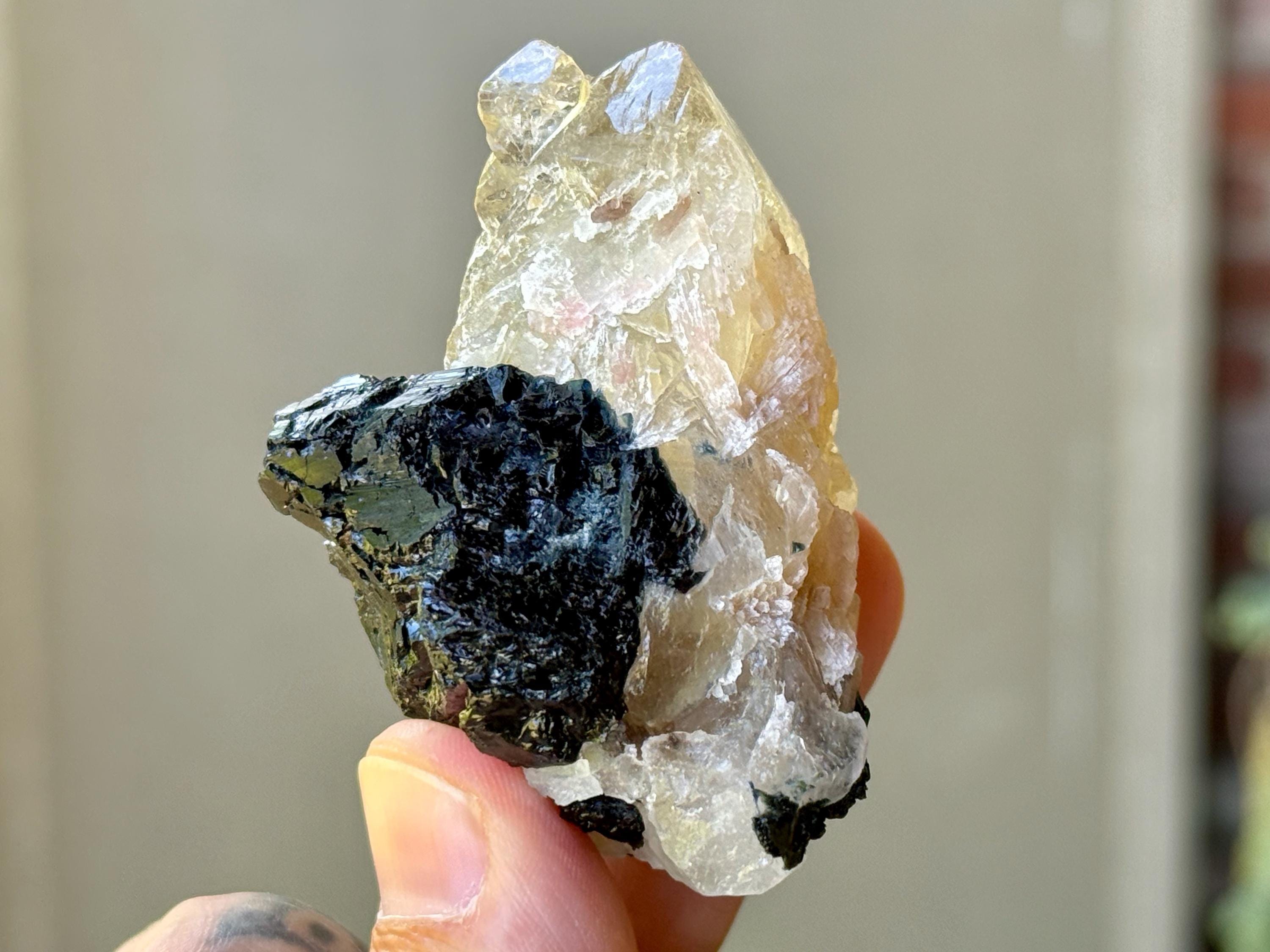Superb luster and a mild champagne hue to this highly lustrous, natural Citrine with a large inclusion of dark Blue Tourmaline.