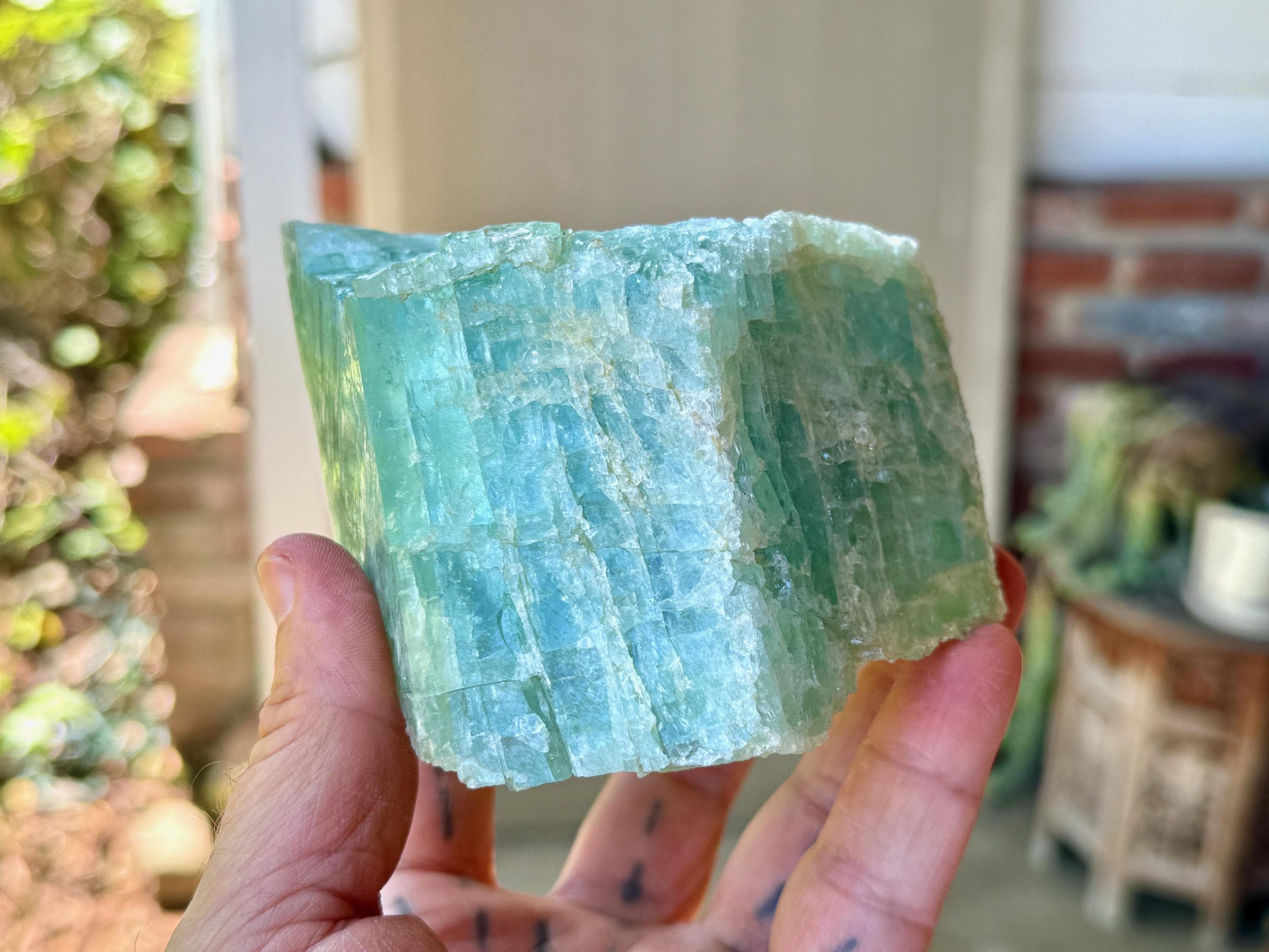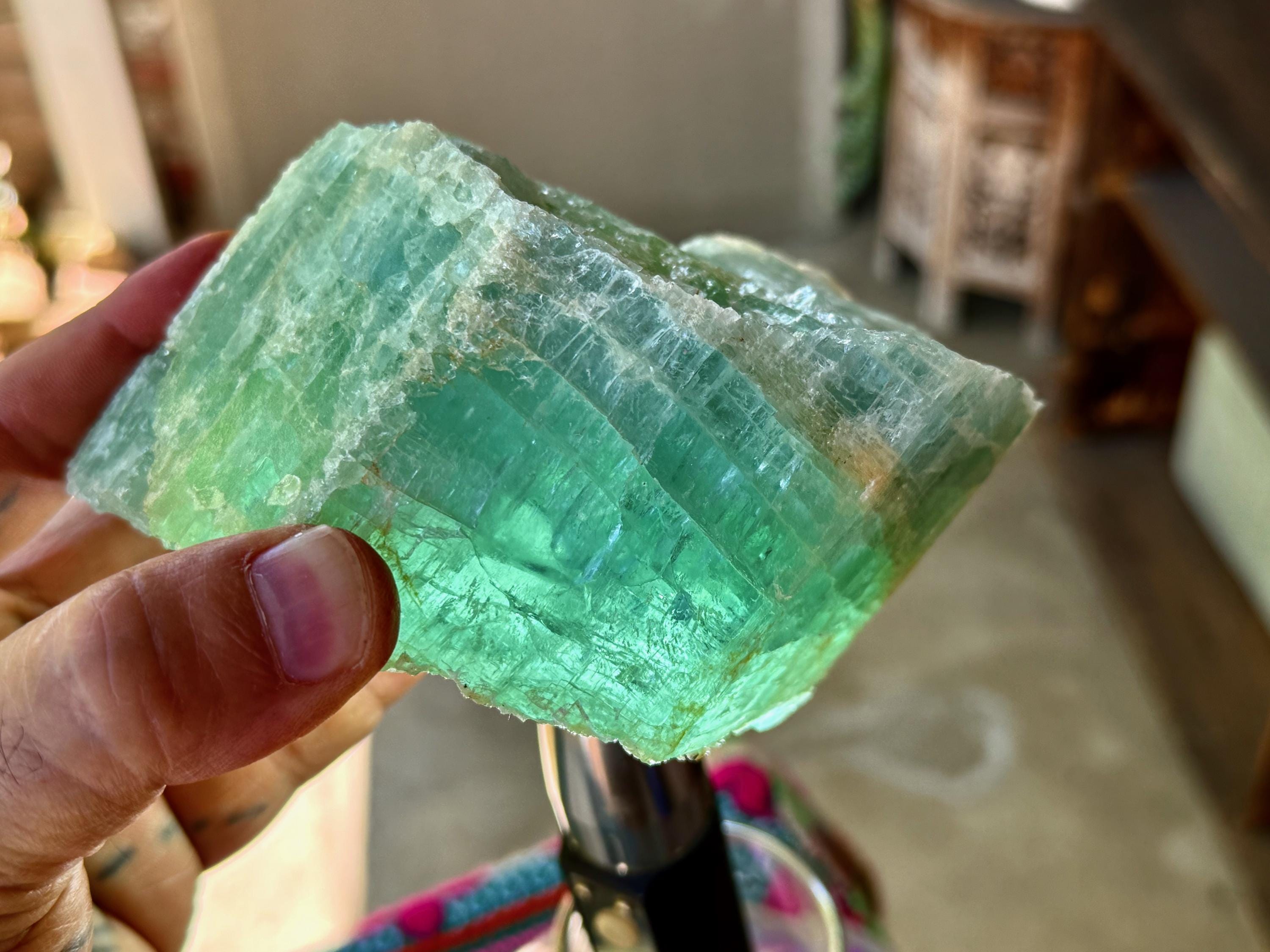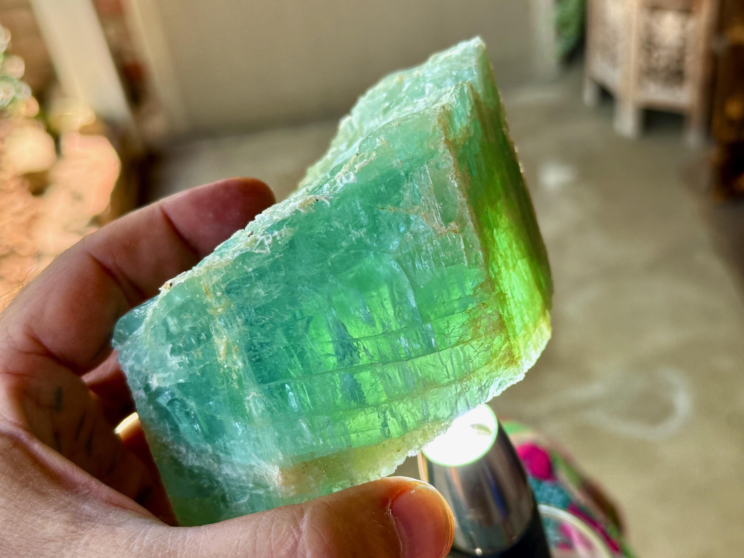 When backlit, as in Photos 1, 4-5, we can see just how well this piece passes light, and also we can see some more of the green hues pop a bit more.