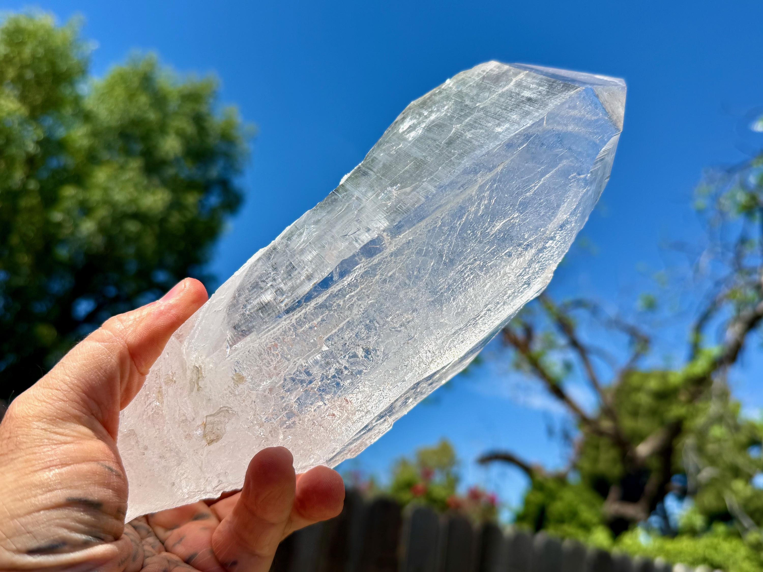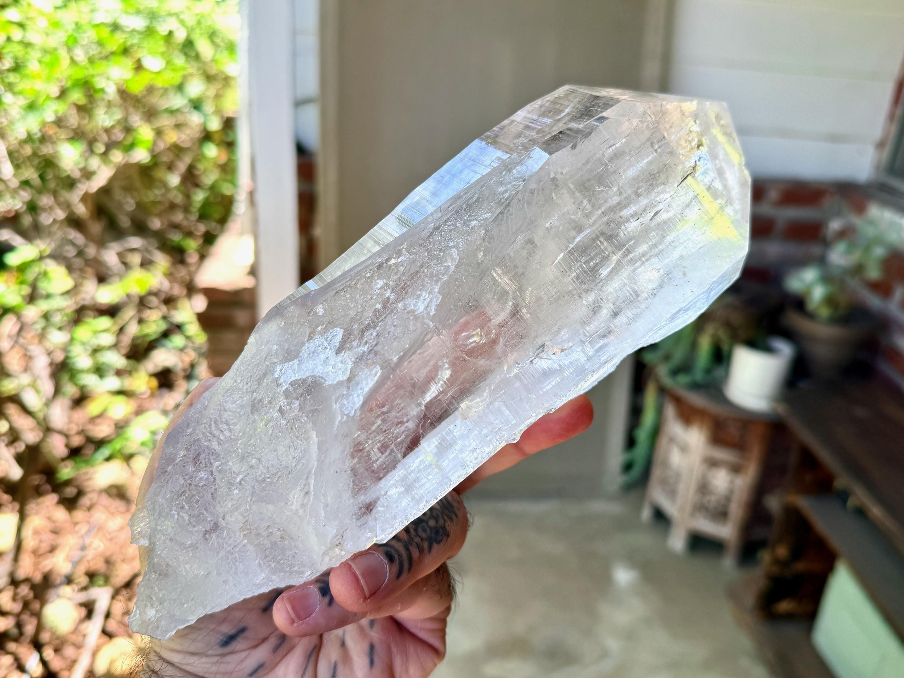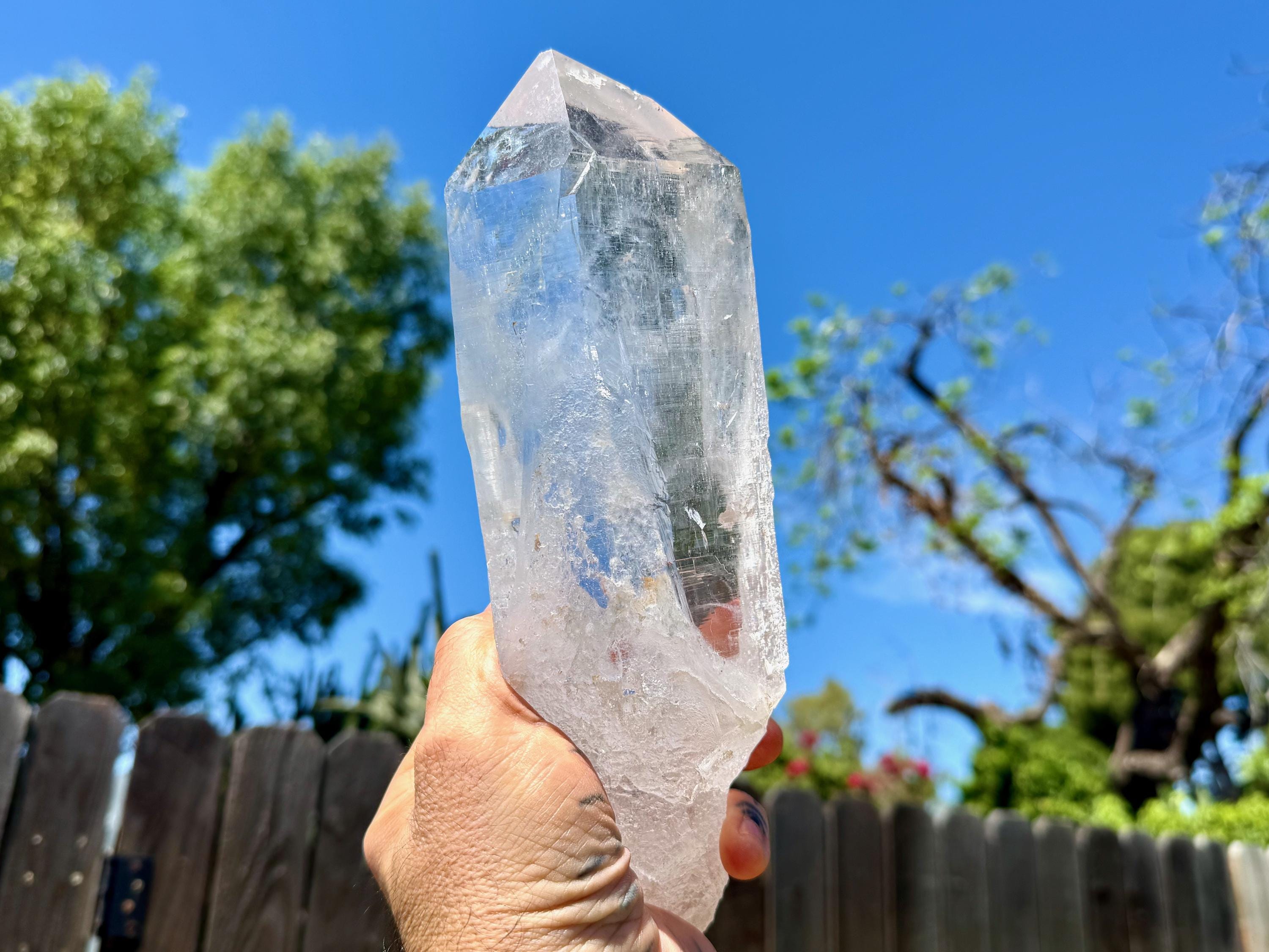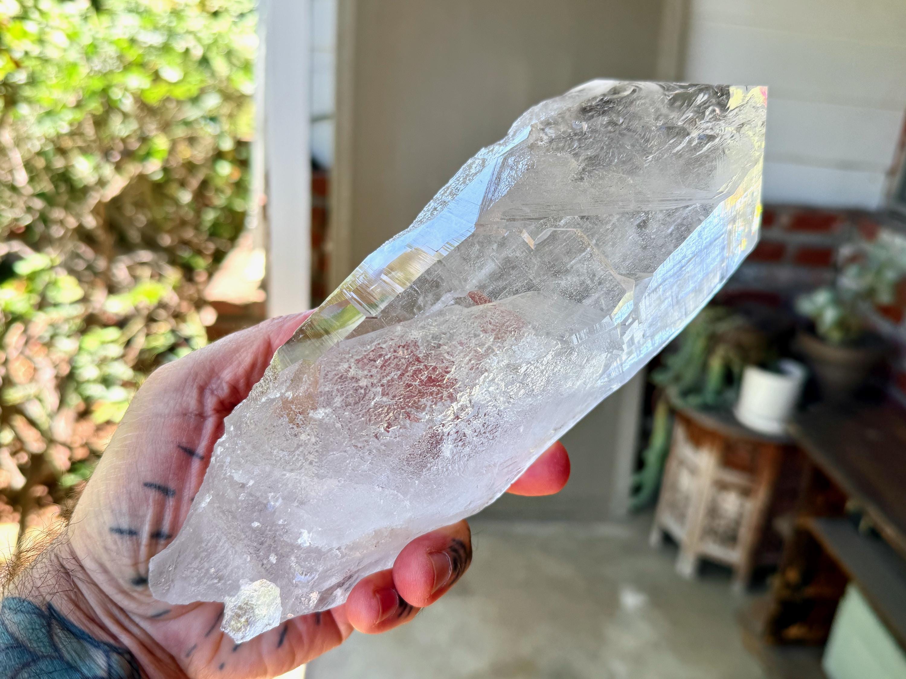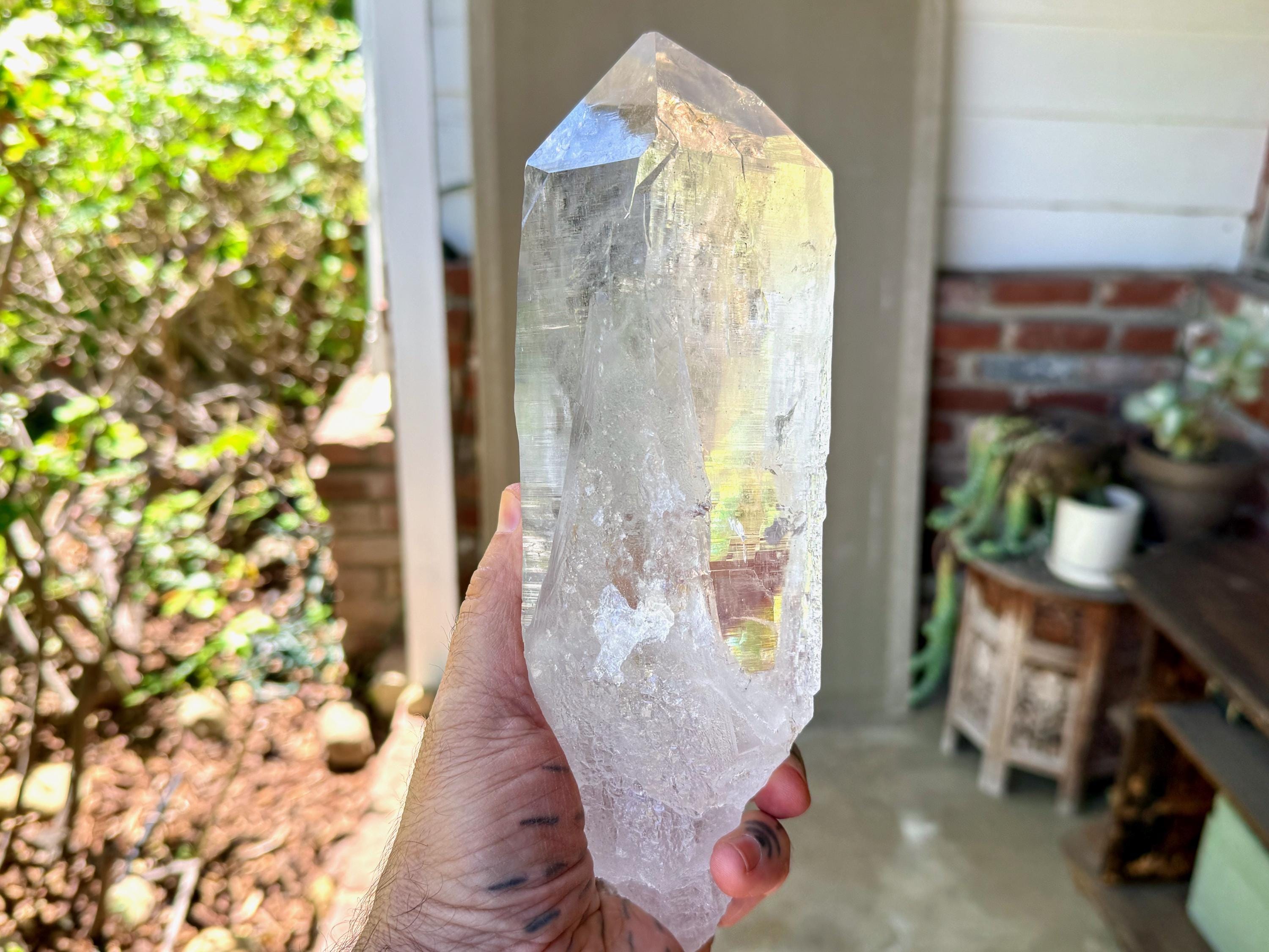 *Please note that this crystal is clear and colorless. Any yellow hues in the photos are from the natural sunlight and surrounding environment reflecting off the crystal.
