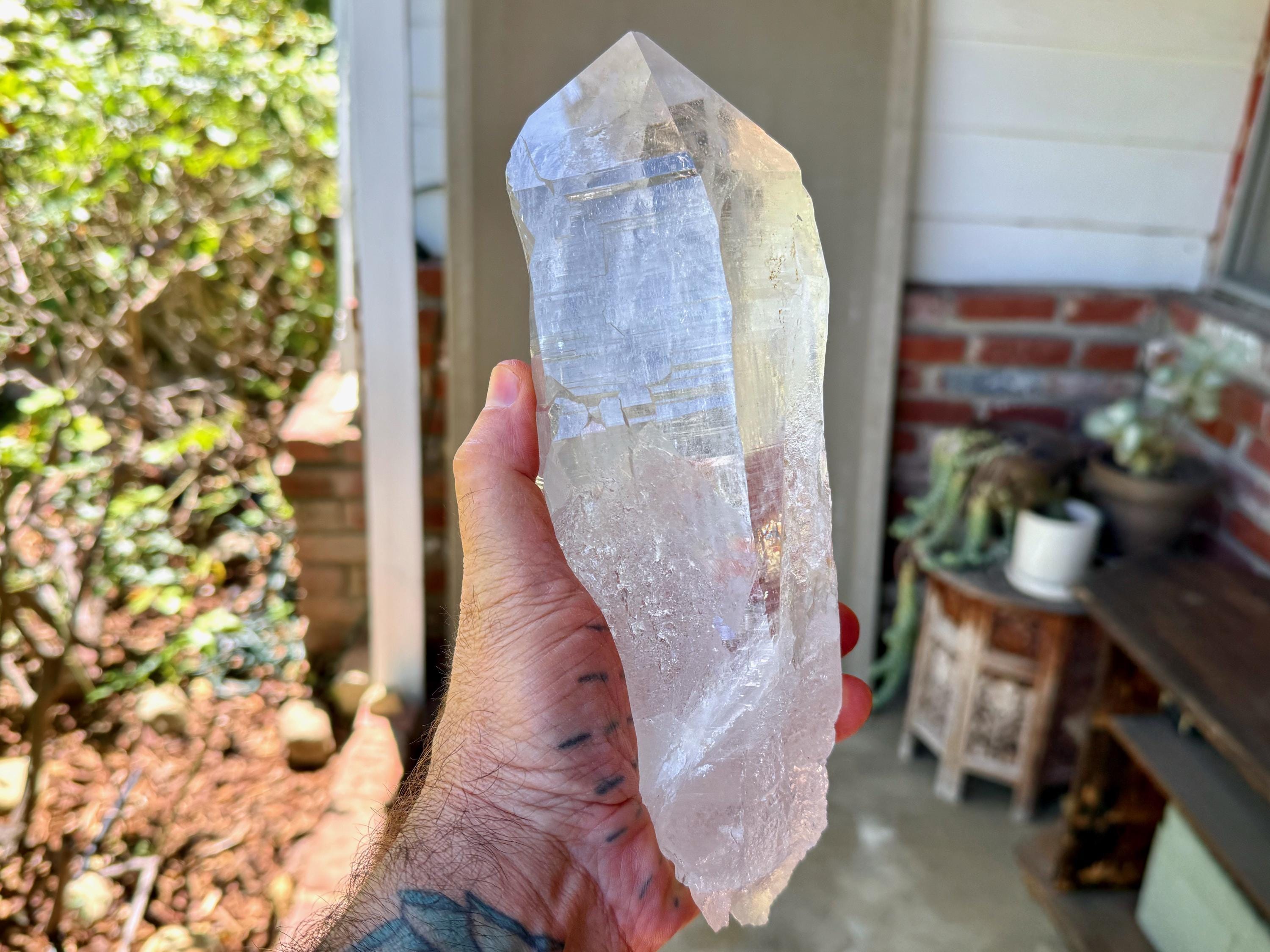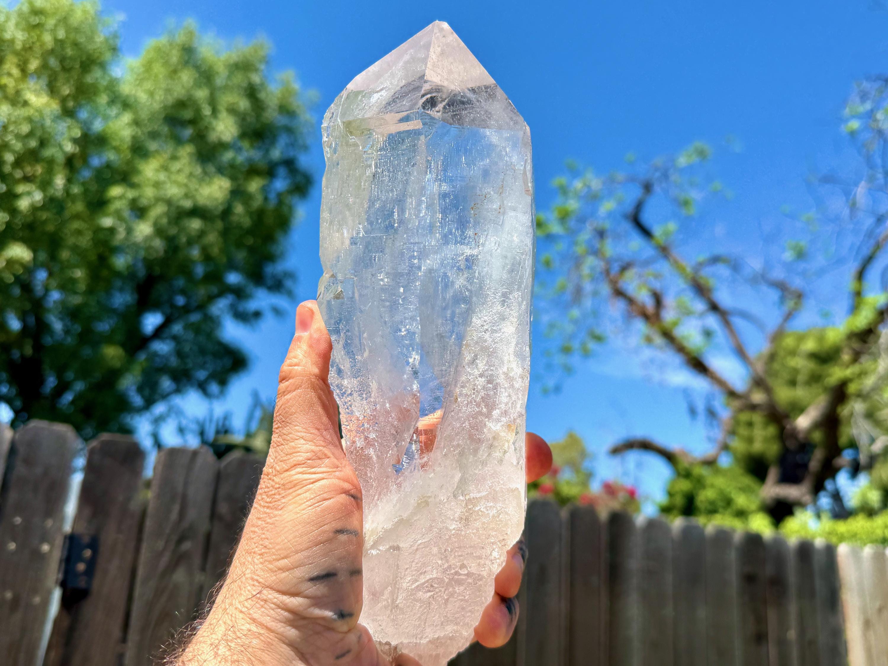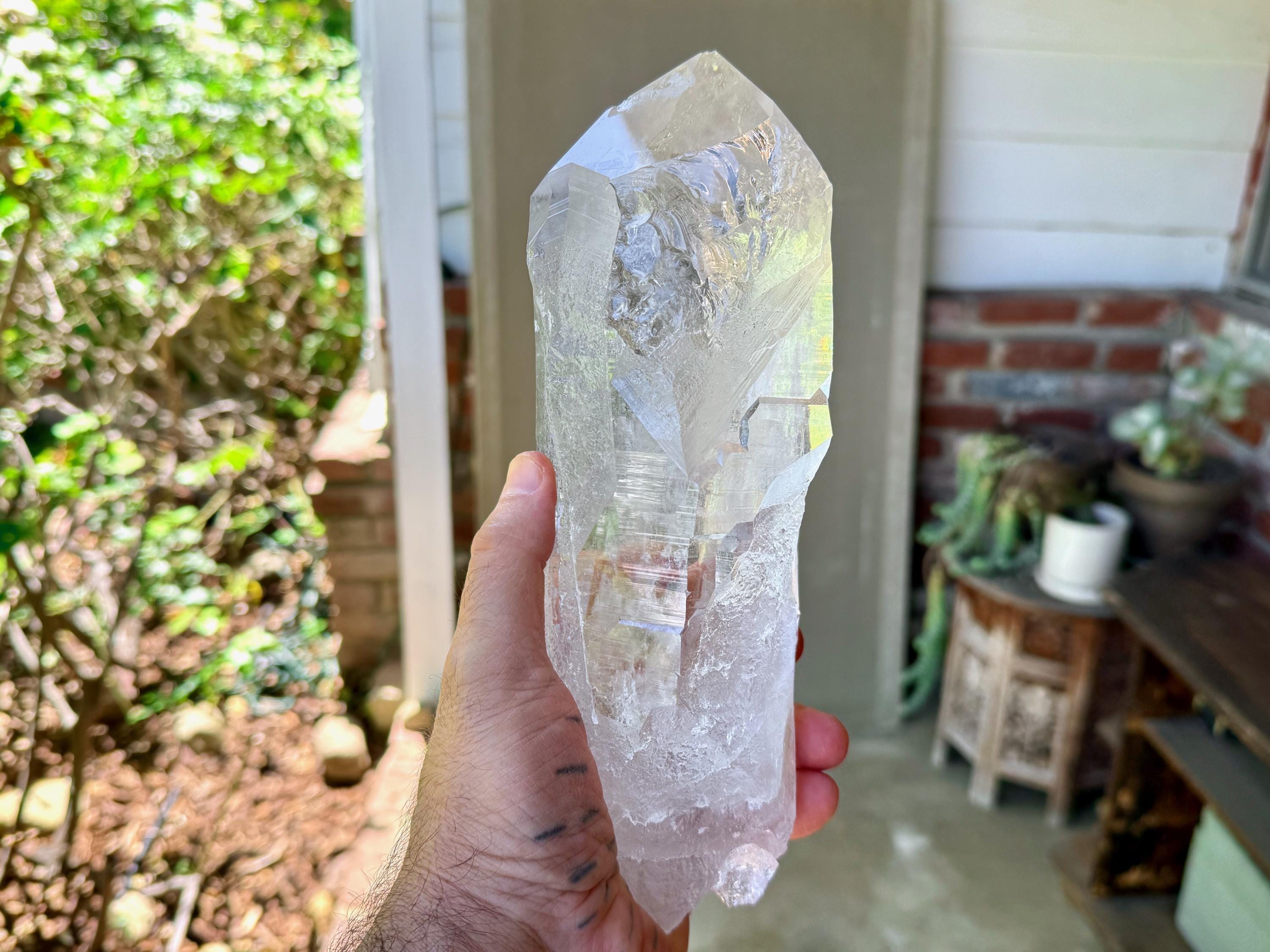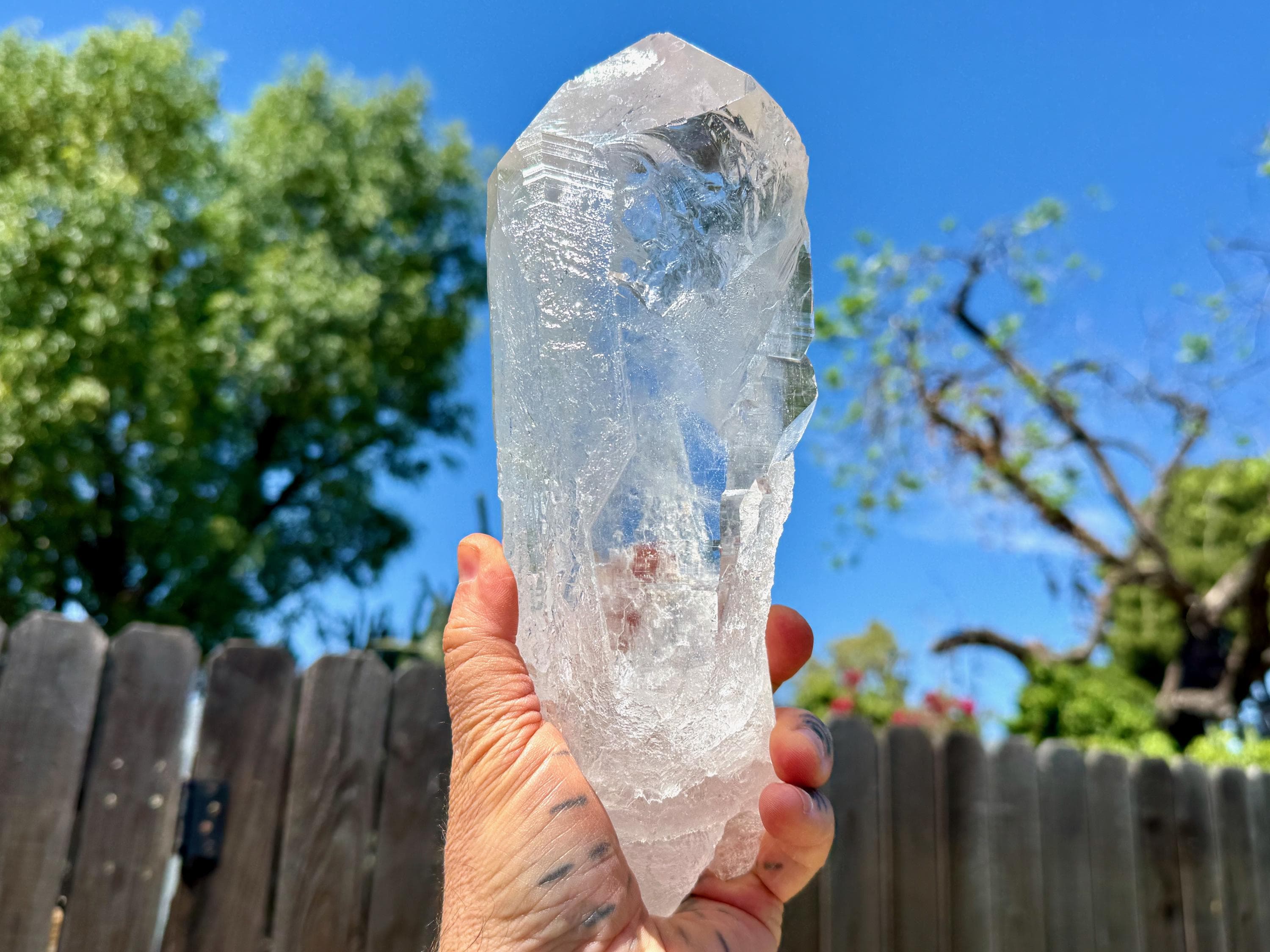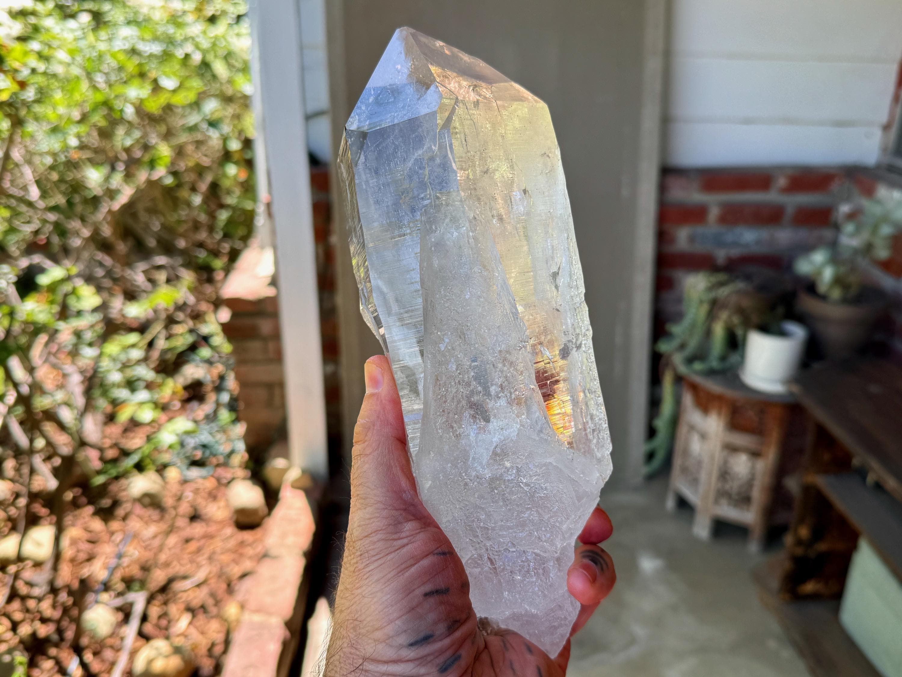 *Please note that this crystal is clear and colorless. Any yellow hues in the photos are from the natural sunlight and surrounding environment reflecting off the crystal.