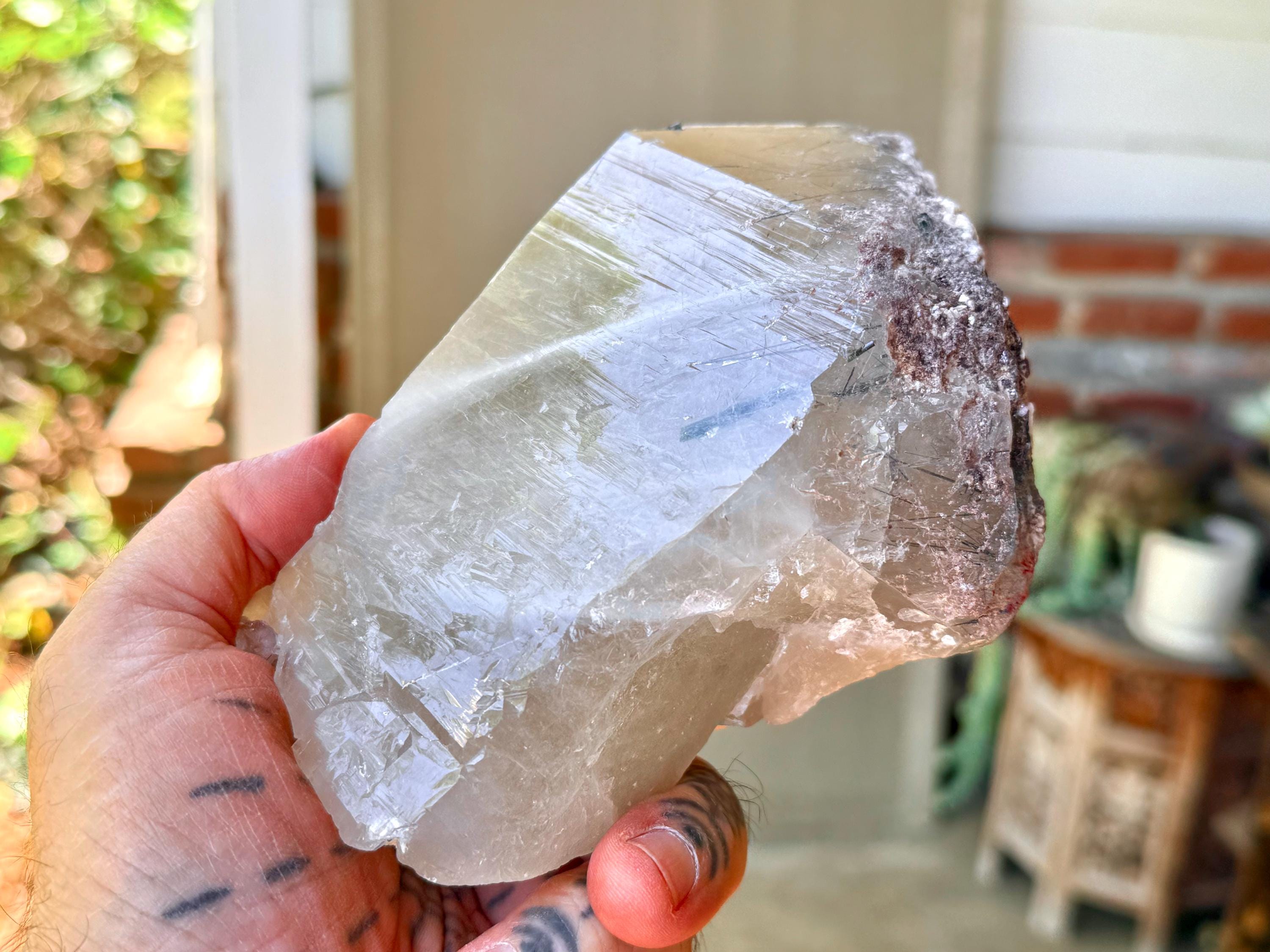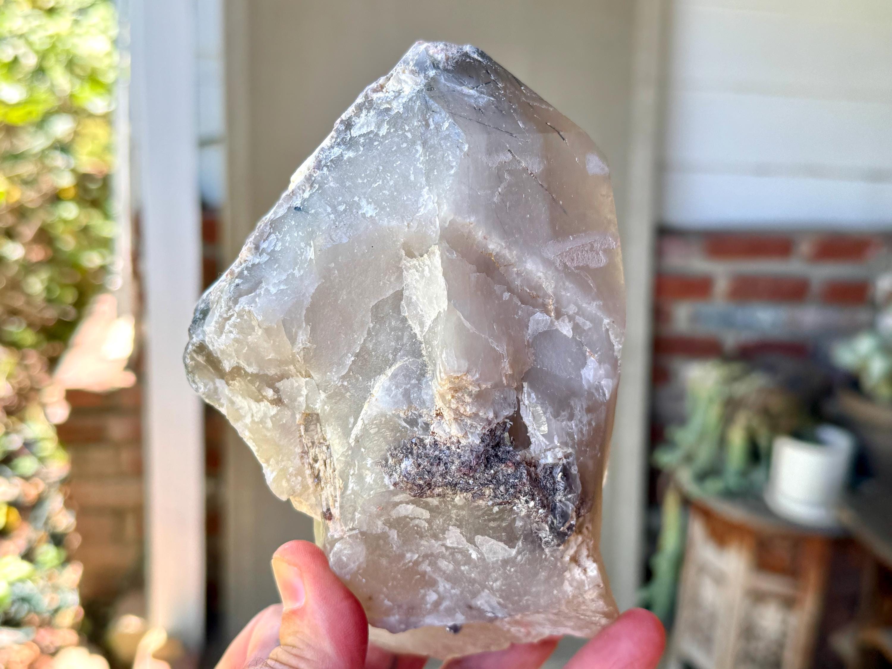 Superb luster to this large, mildly smoky Unicorn Stone Quartz crystal with a ghostly white phantom inclusion. This phantom spans the entire piece on one of its broad sides, with a sweeping, ethereal "V" formation.