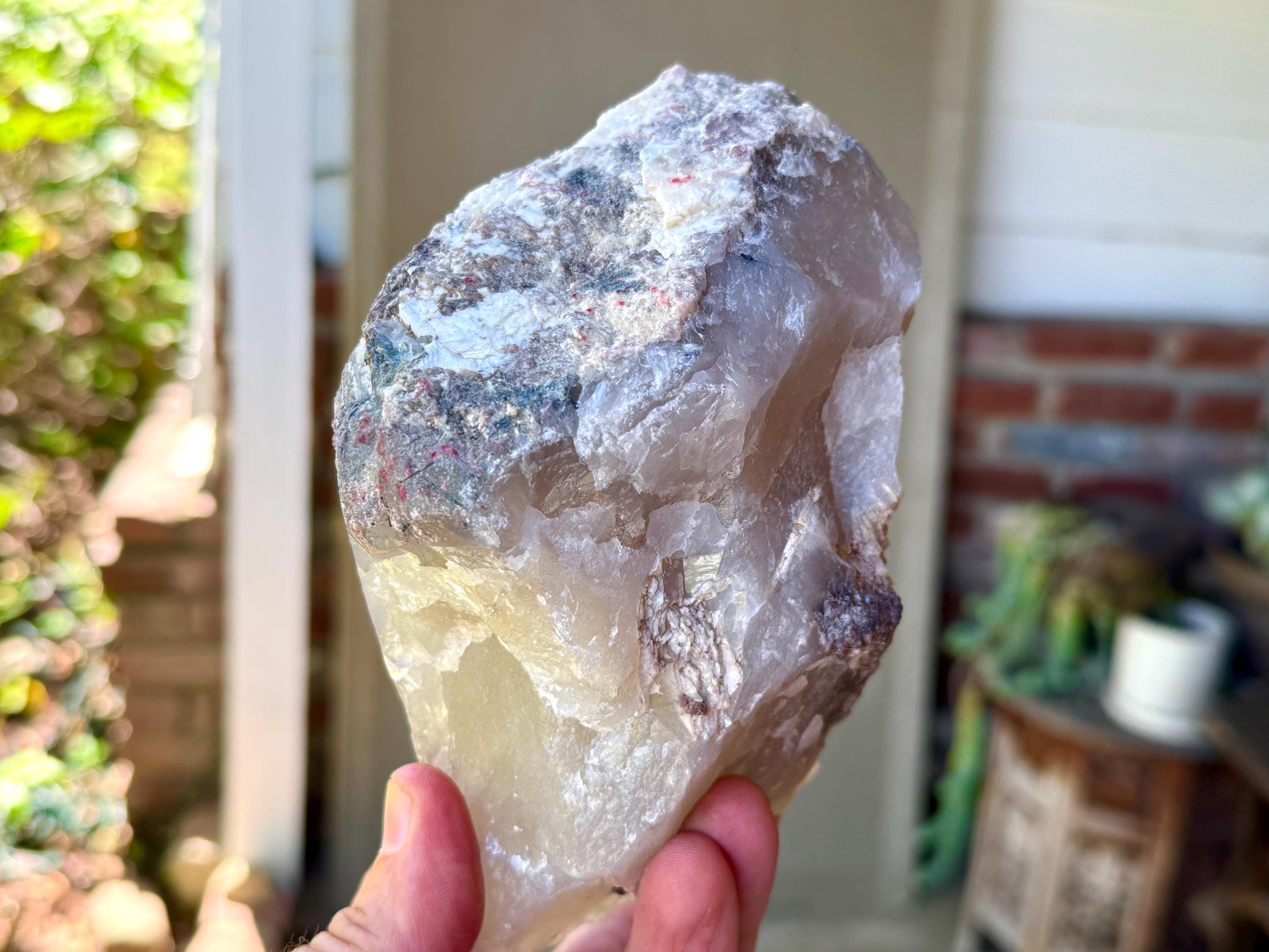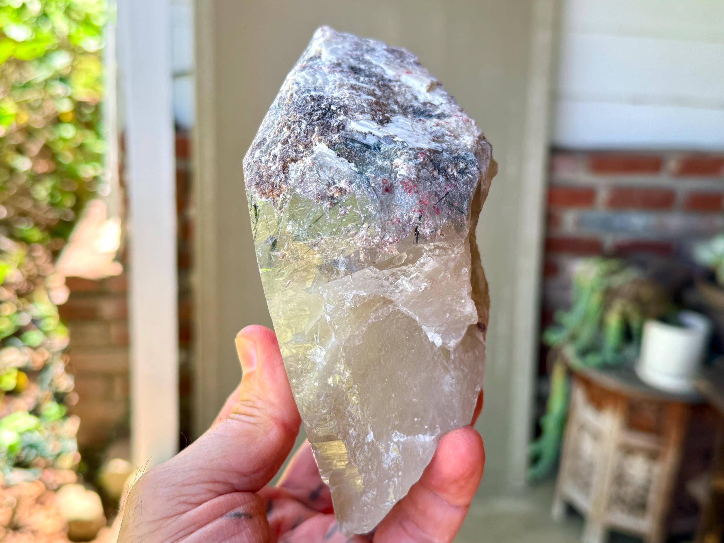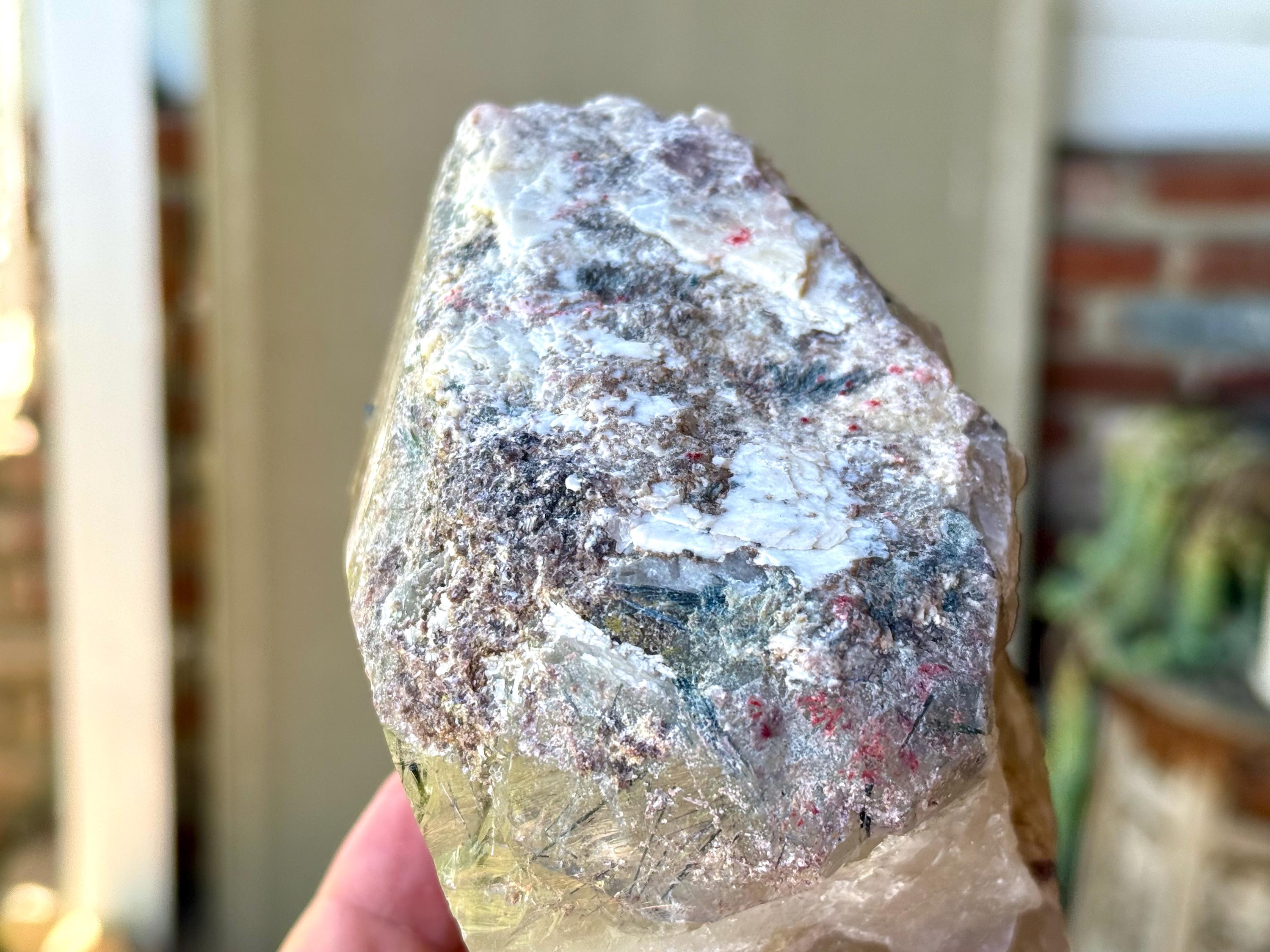 At the top of the crystal we see a colorful "frosting" of various inclusions, including purple Lepidolite and what is likely white Feldspar.
