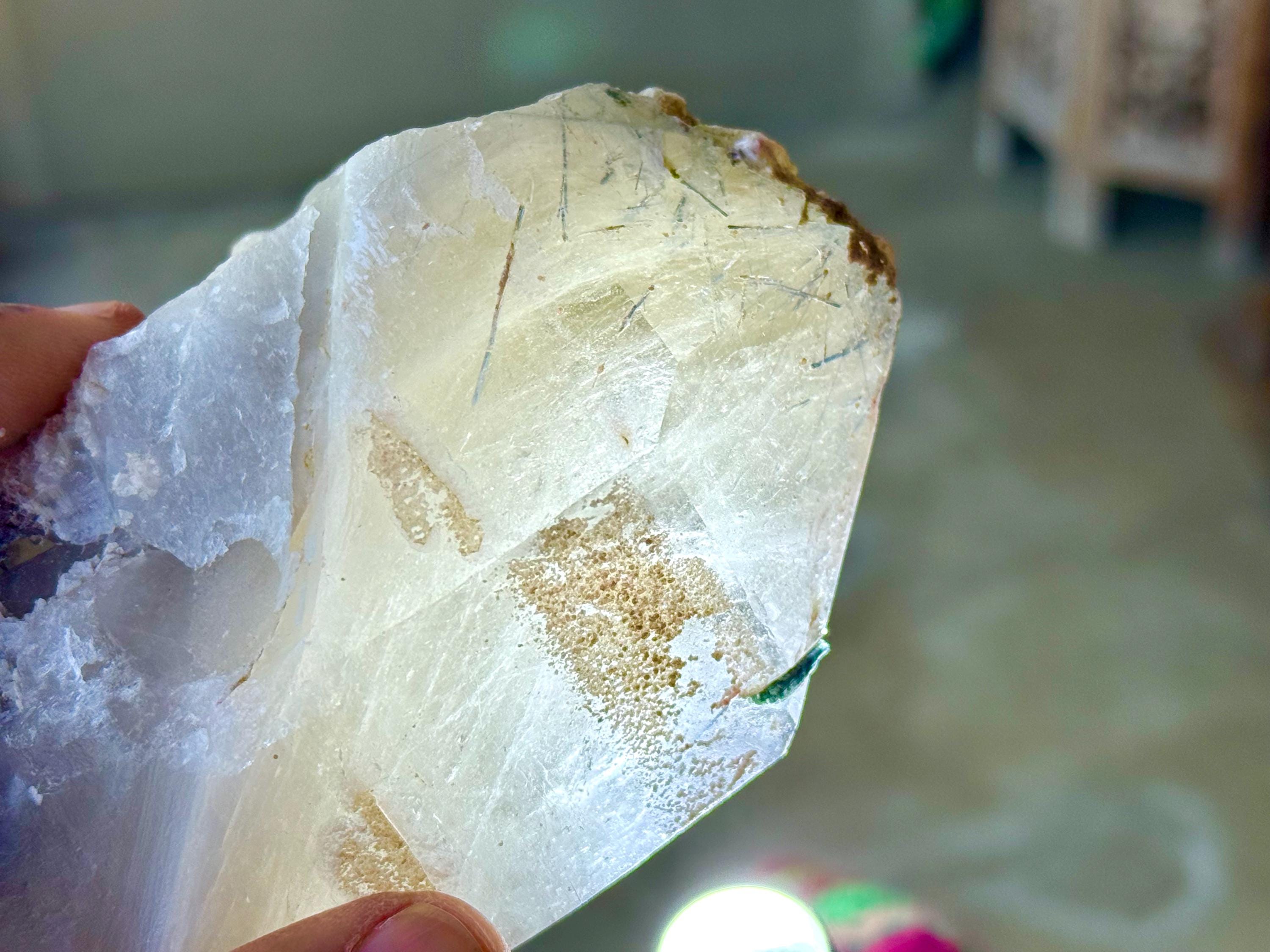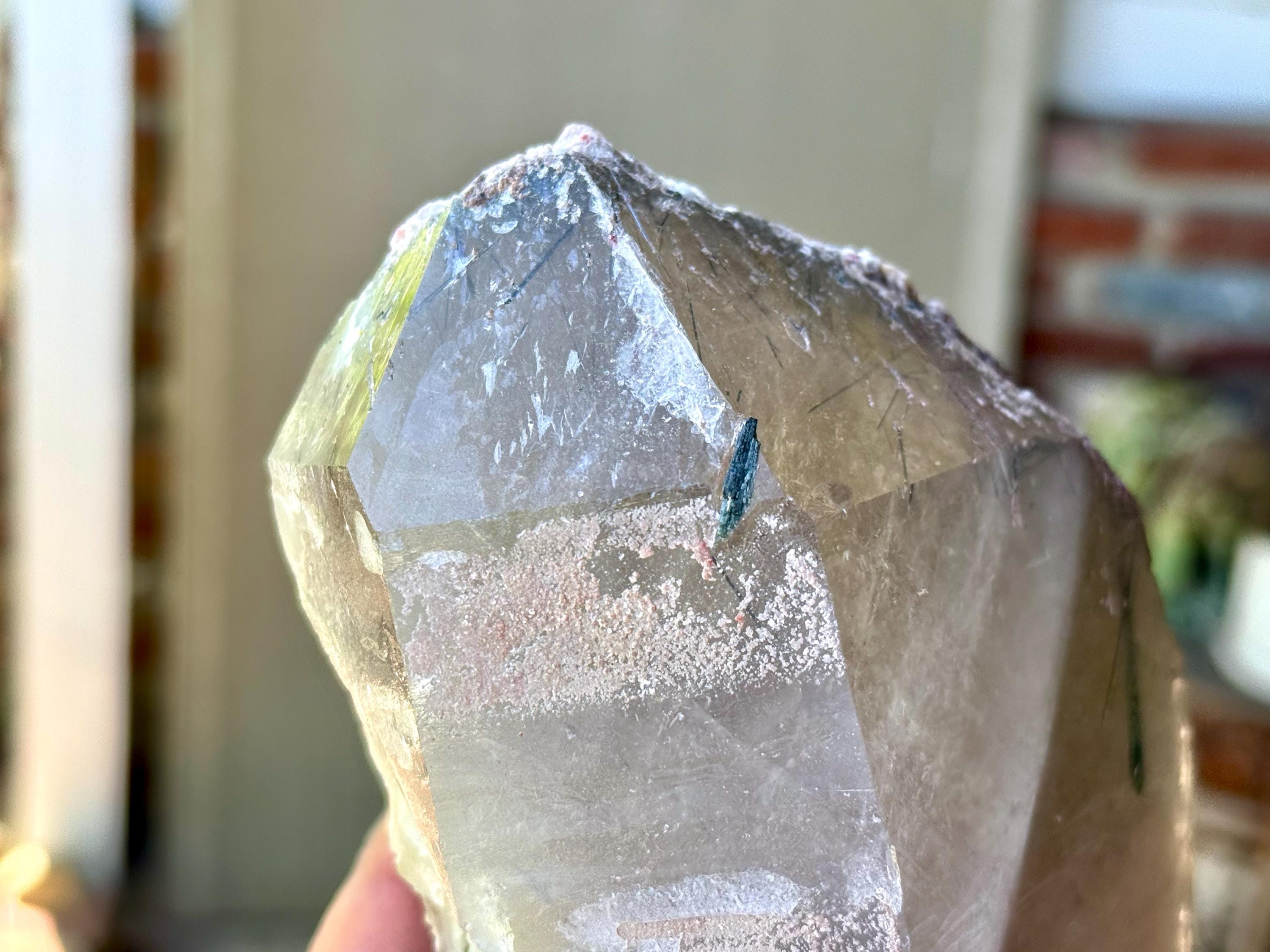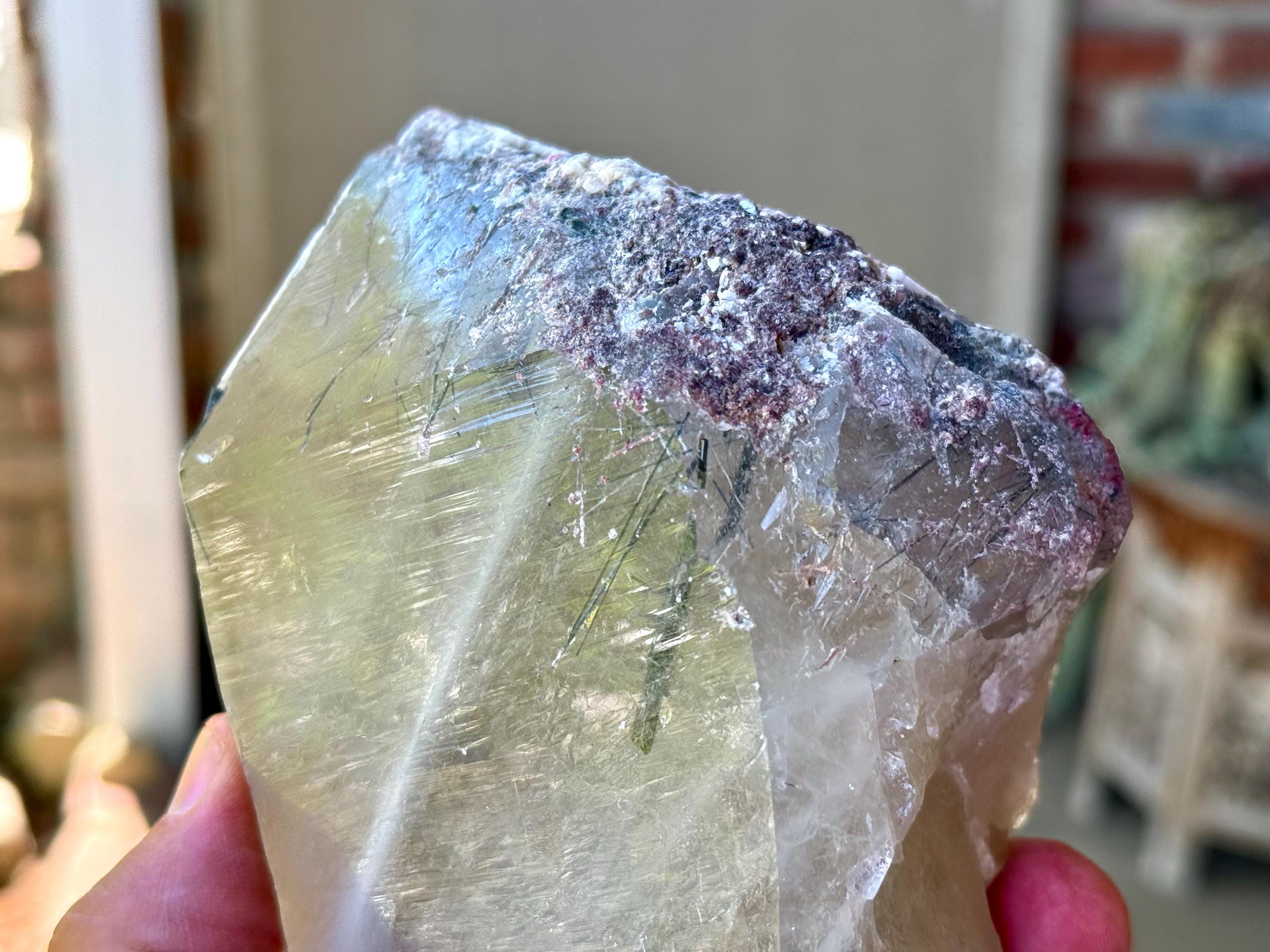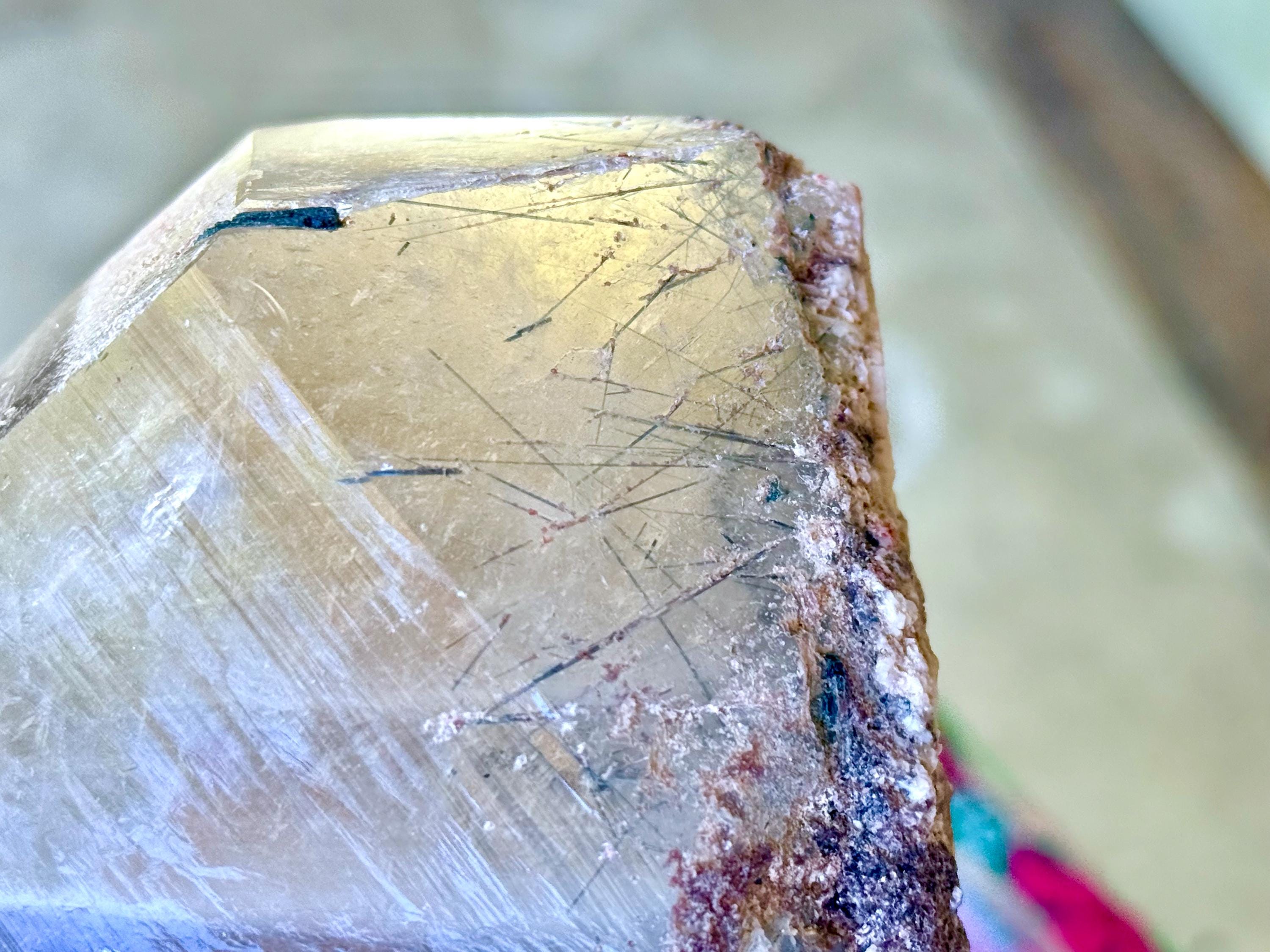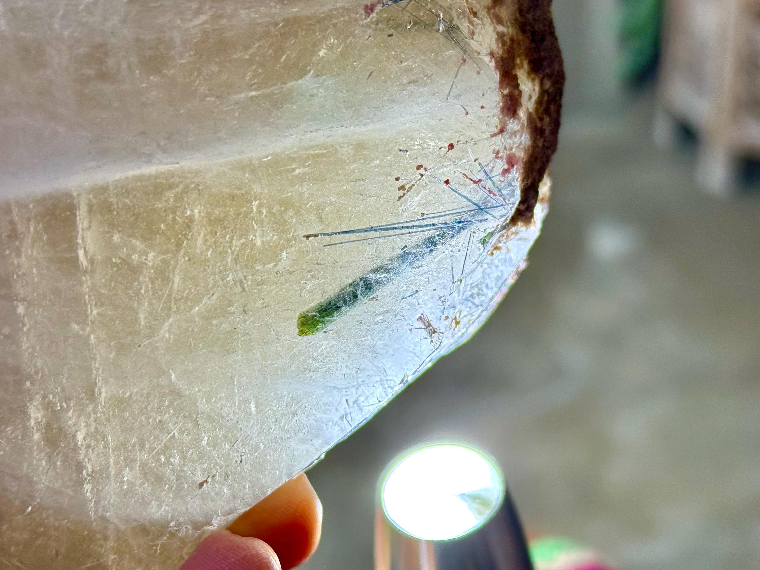 Just beneath the surface we can see an array of needle-like Tourmaline inclusions, and when backlit, they alight in colors of green and blue-green (Photos 5-7).