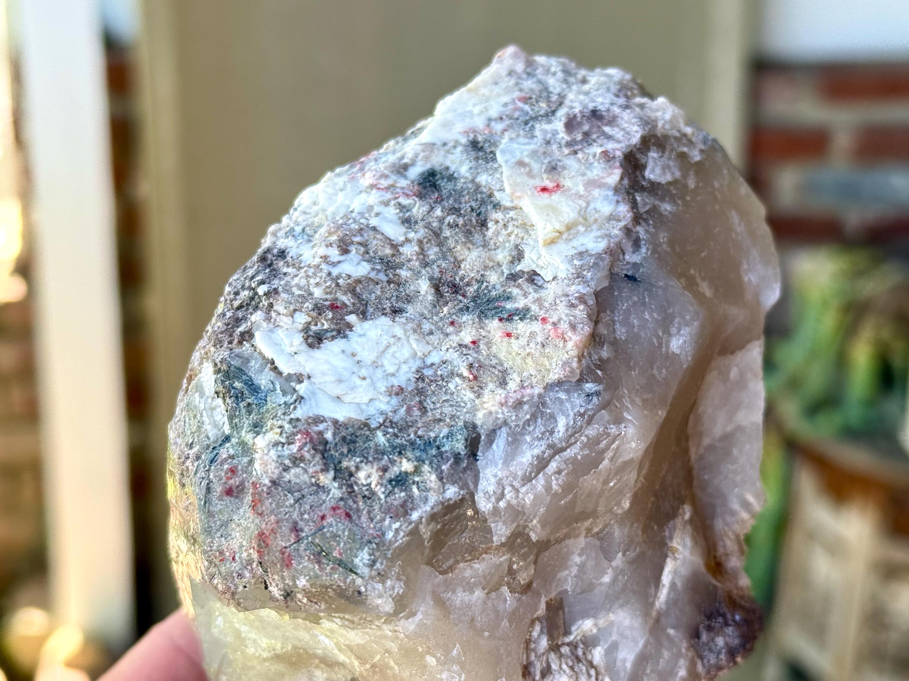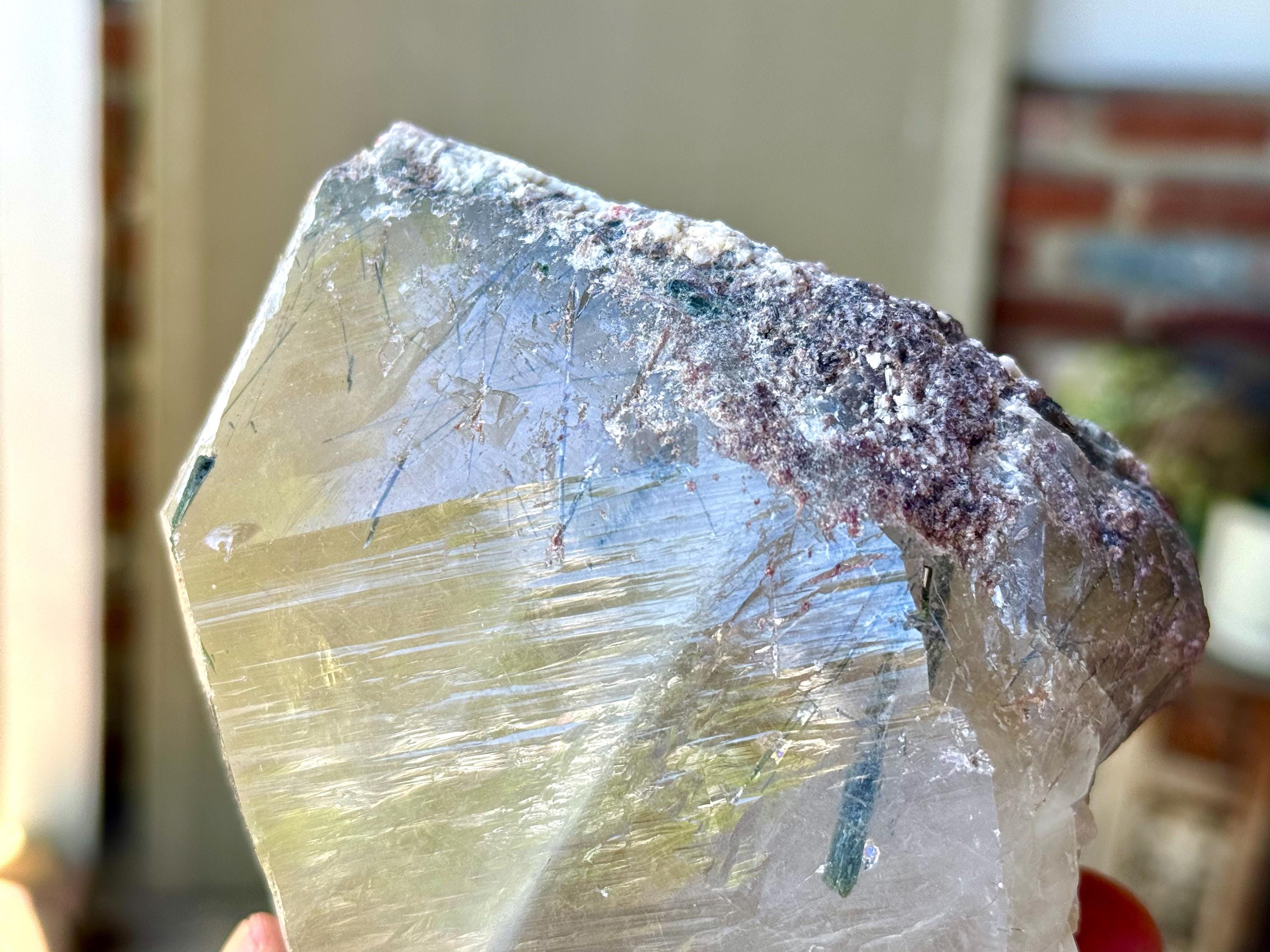 This unique Unicorn Stone Phantom Quartz with Blue-Green Tourmaline and Lepidolite inclusions comes from a recent find in São José do Safira, Minas Gerais, Brazil.