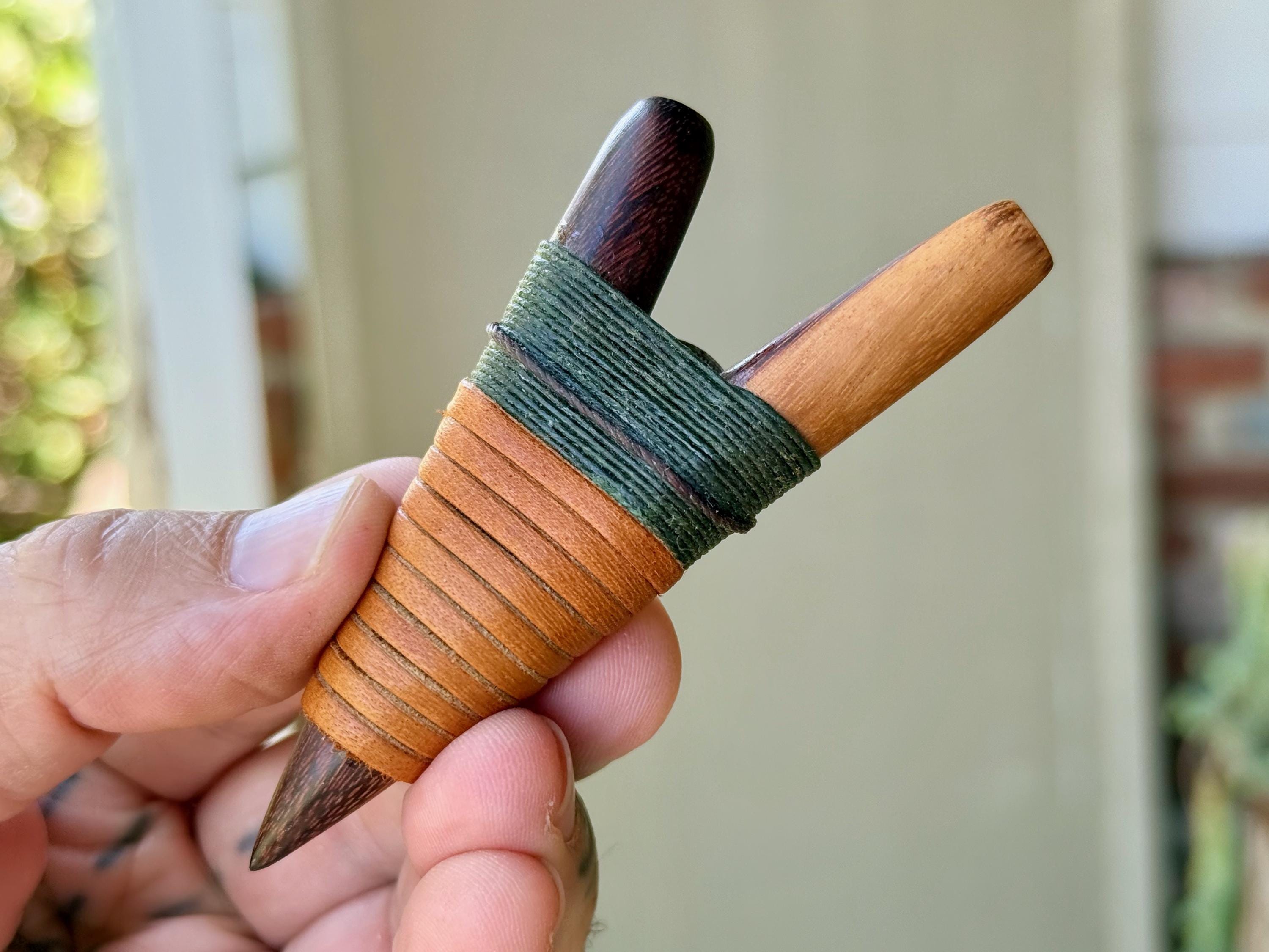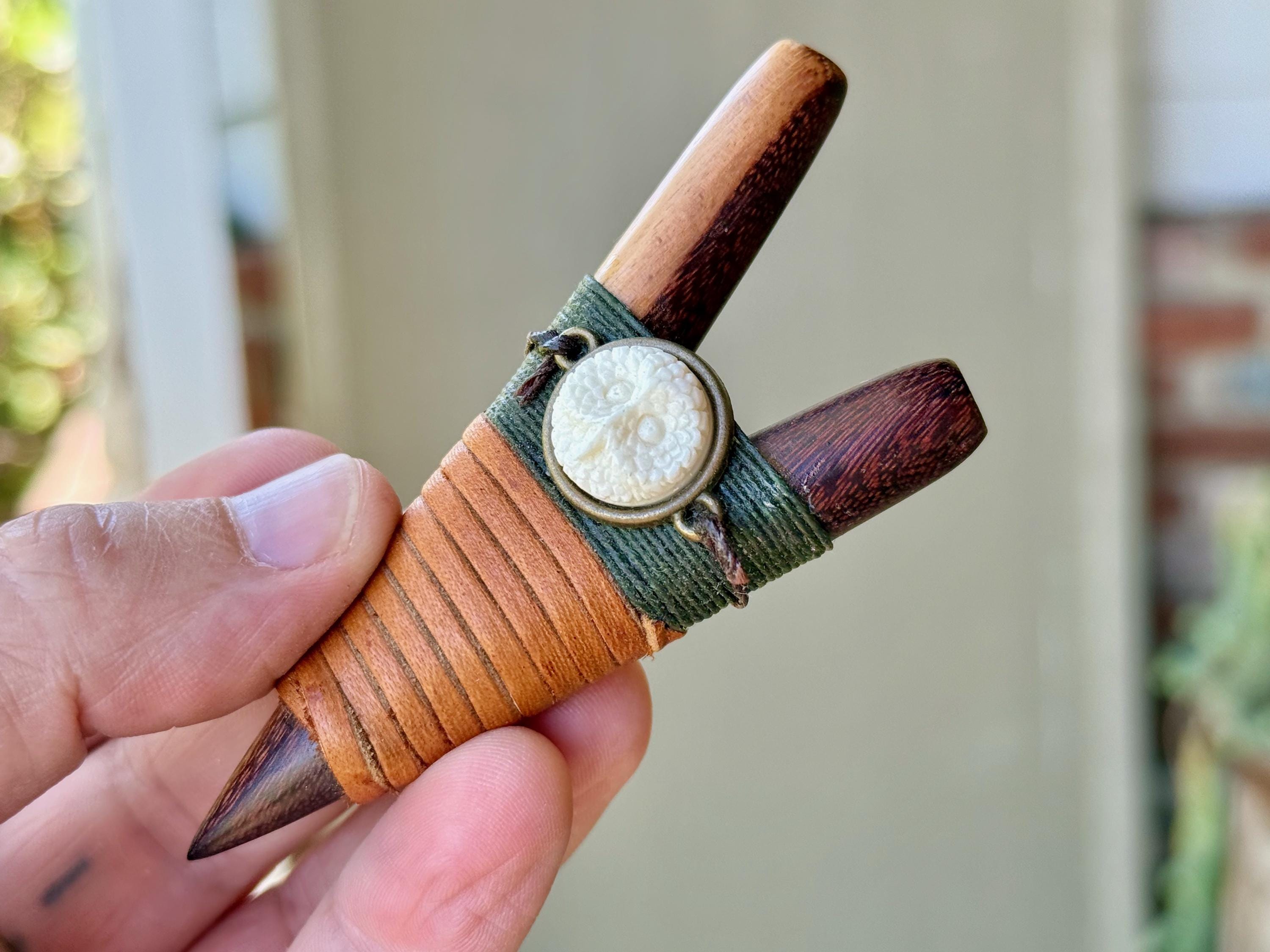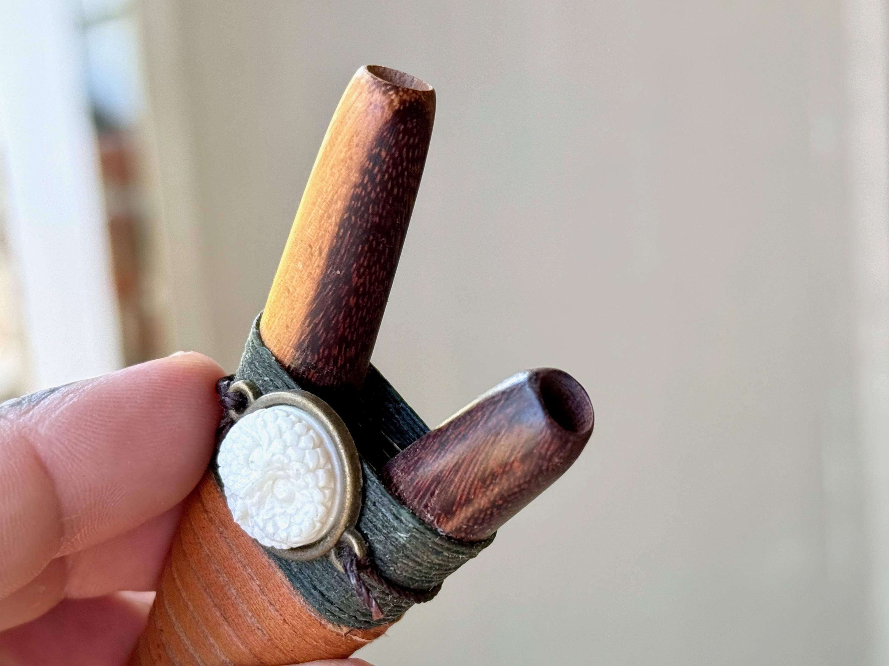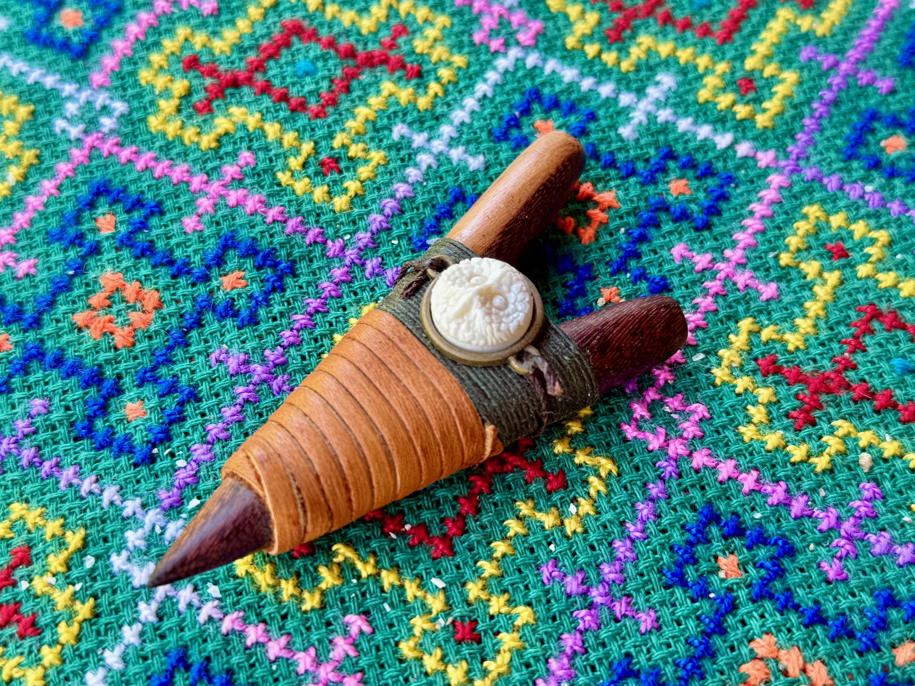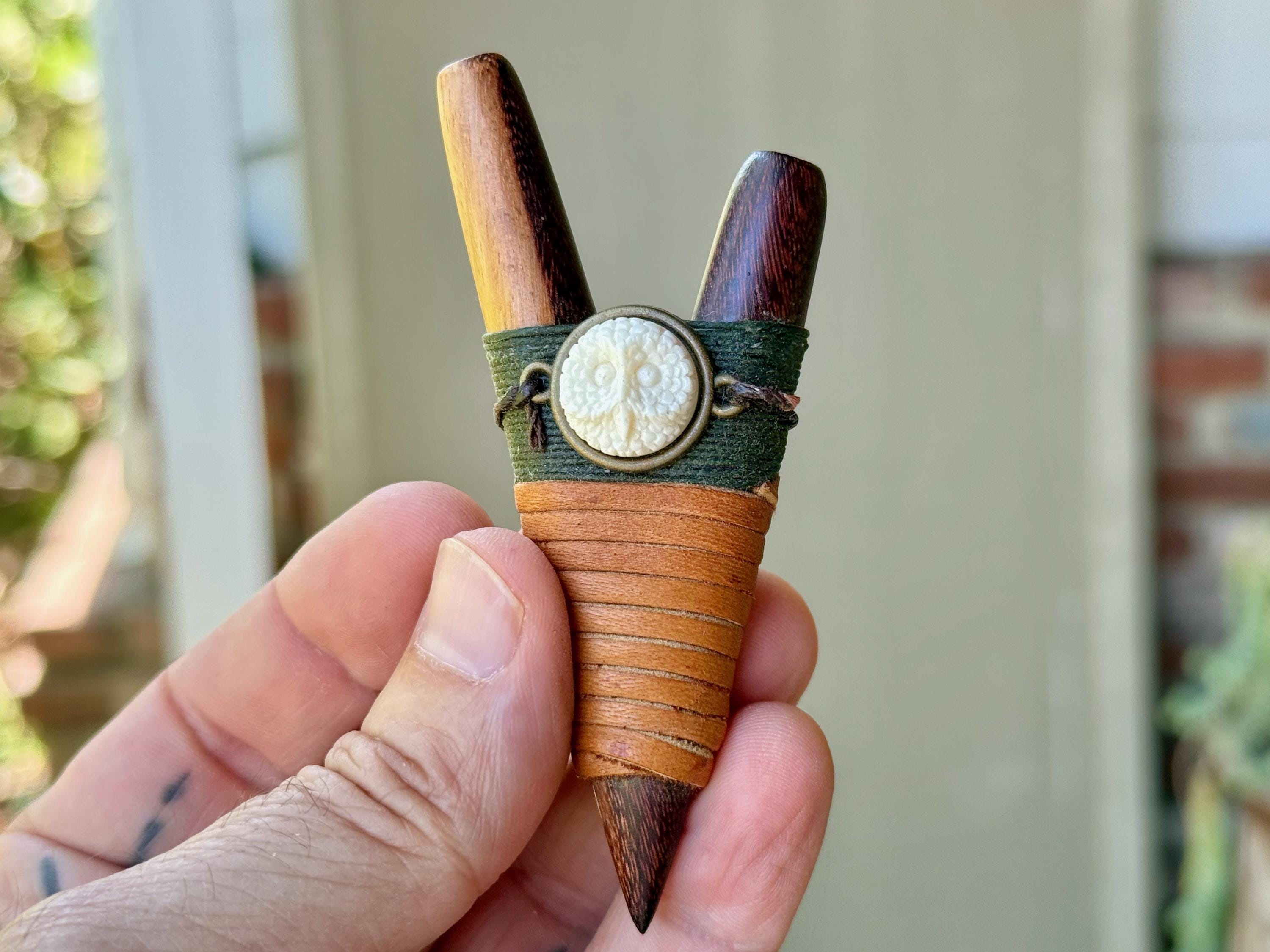 This Kuripe Pipe — for self-administering hapé — was hand carved from a single block of natural Two-Tone Tropical Wood and adorned with waxed thread and leather. This pipe also features a carved Owl face cabochon inlay.