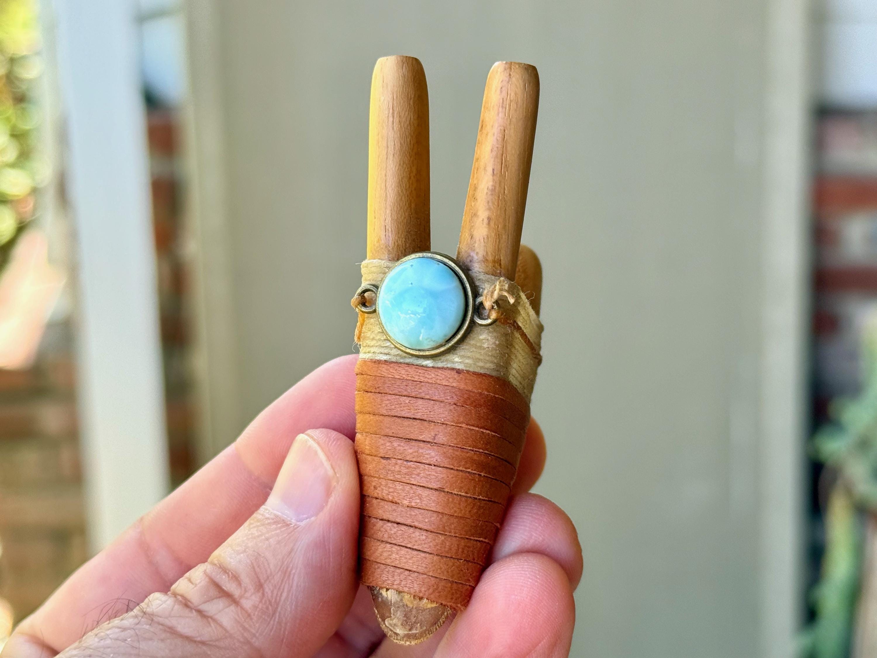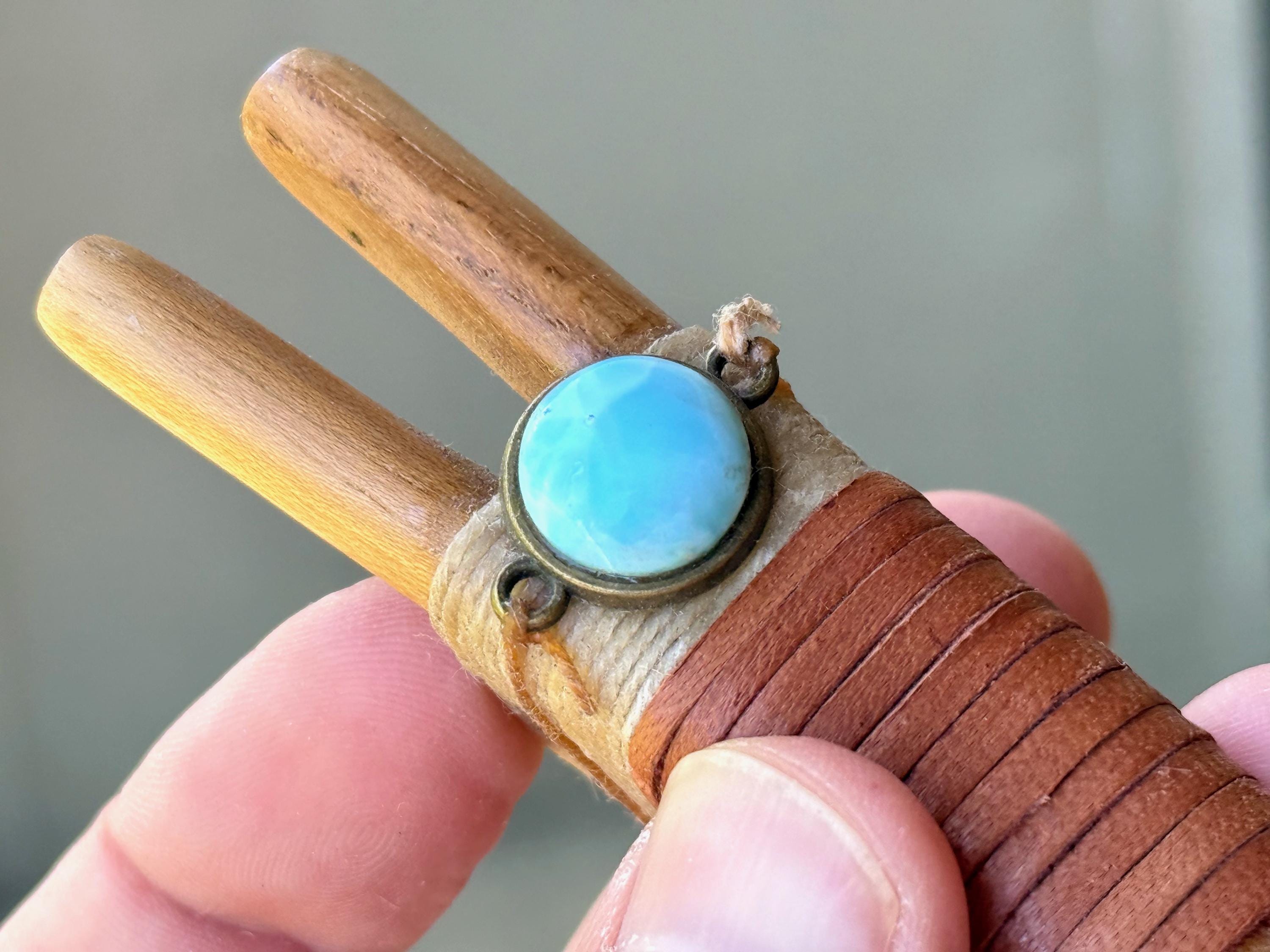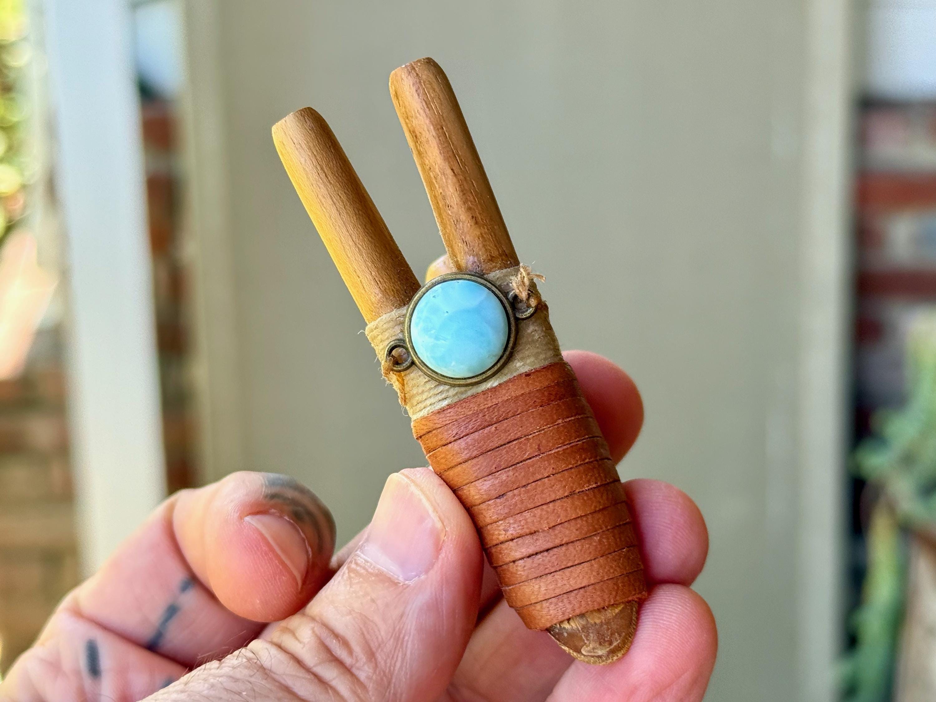 This Double Kuripe Pipe — for self-administering hapé — was hand crafted from natural Teak Wood and adorned with leather, waxed thread and an Amazonite cabochon.