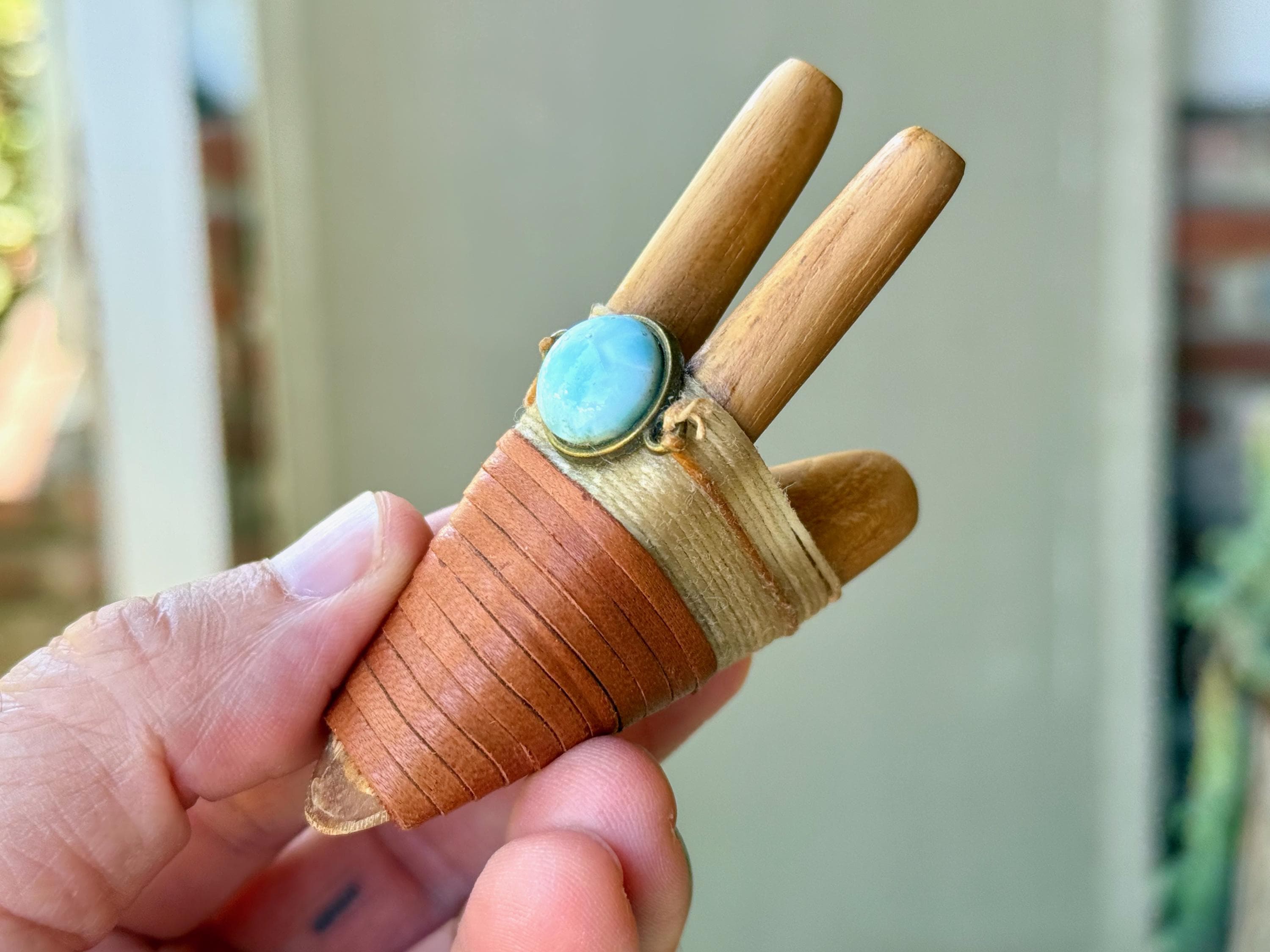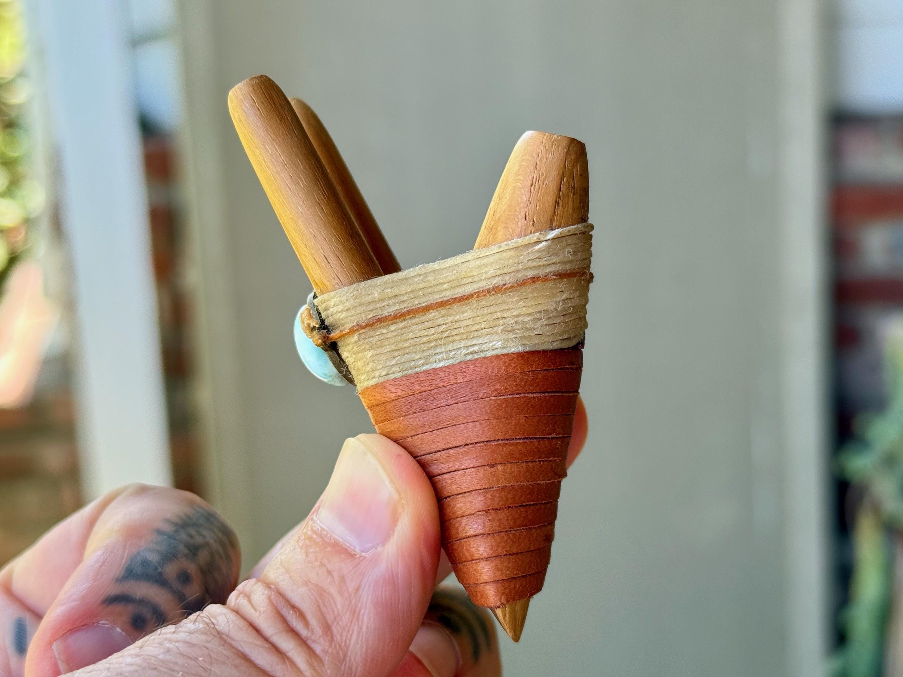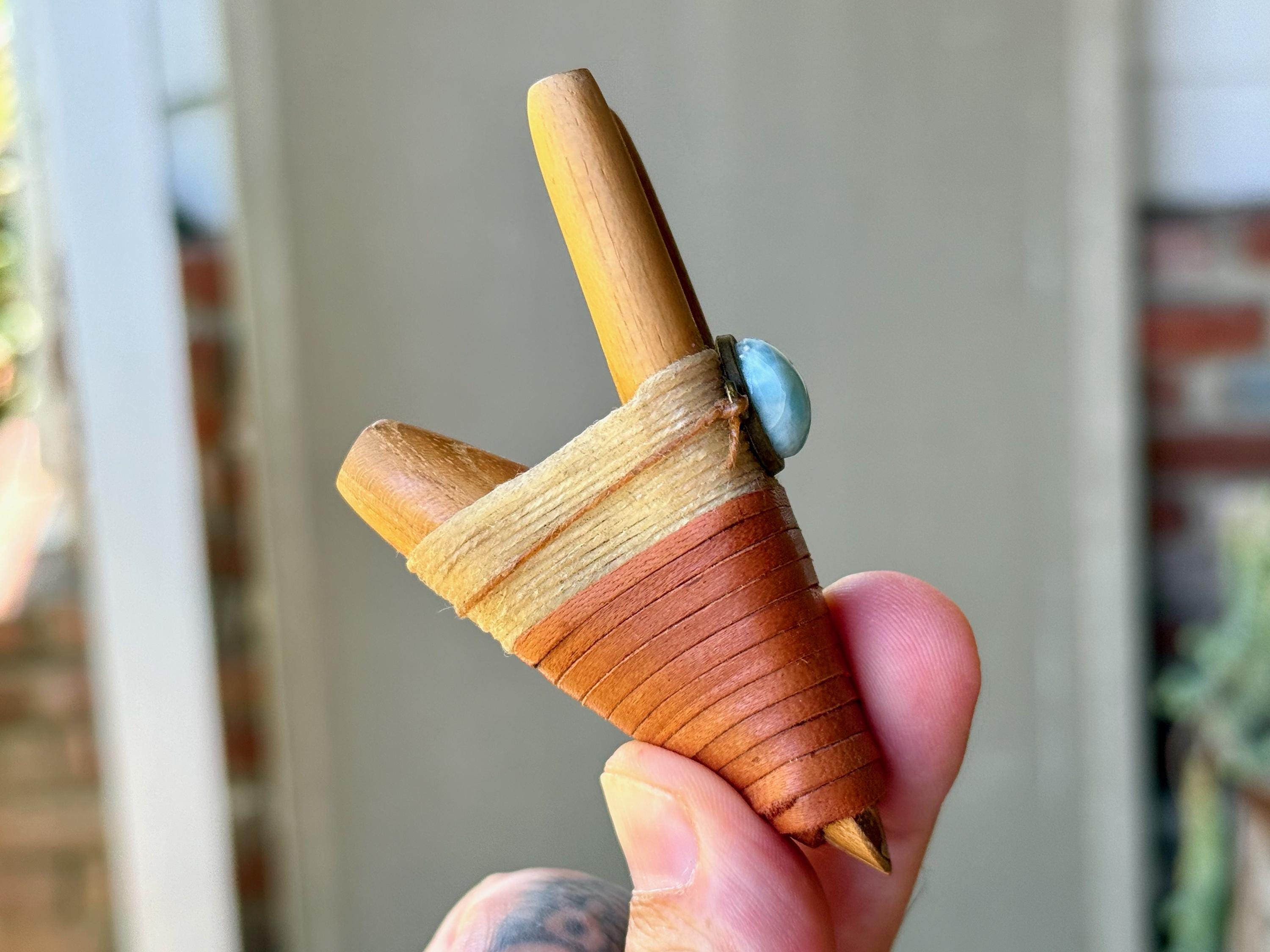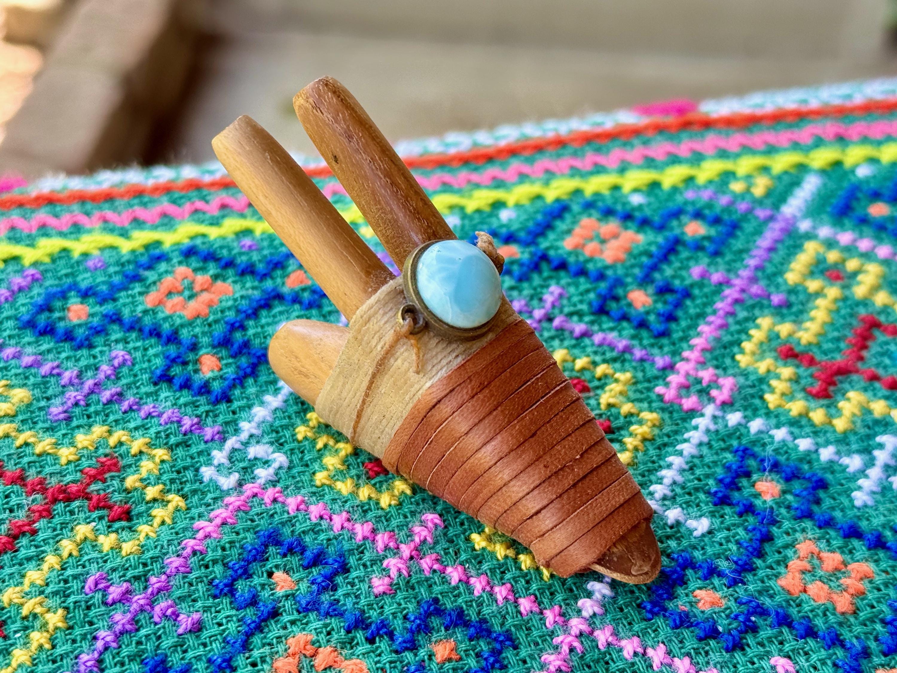 This Double Kuripe Pipe — for self-administering hapé — was hand crafted from natural Teak Wood and adorned with leather, waxed thread and an Amazonite cabochon.