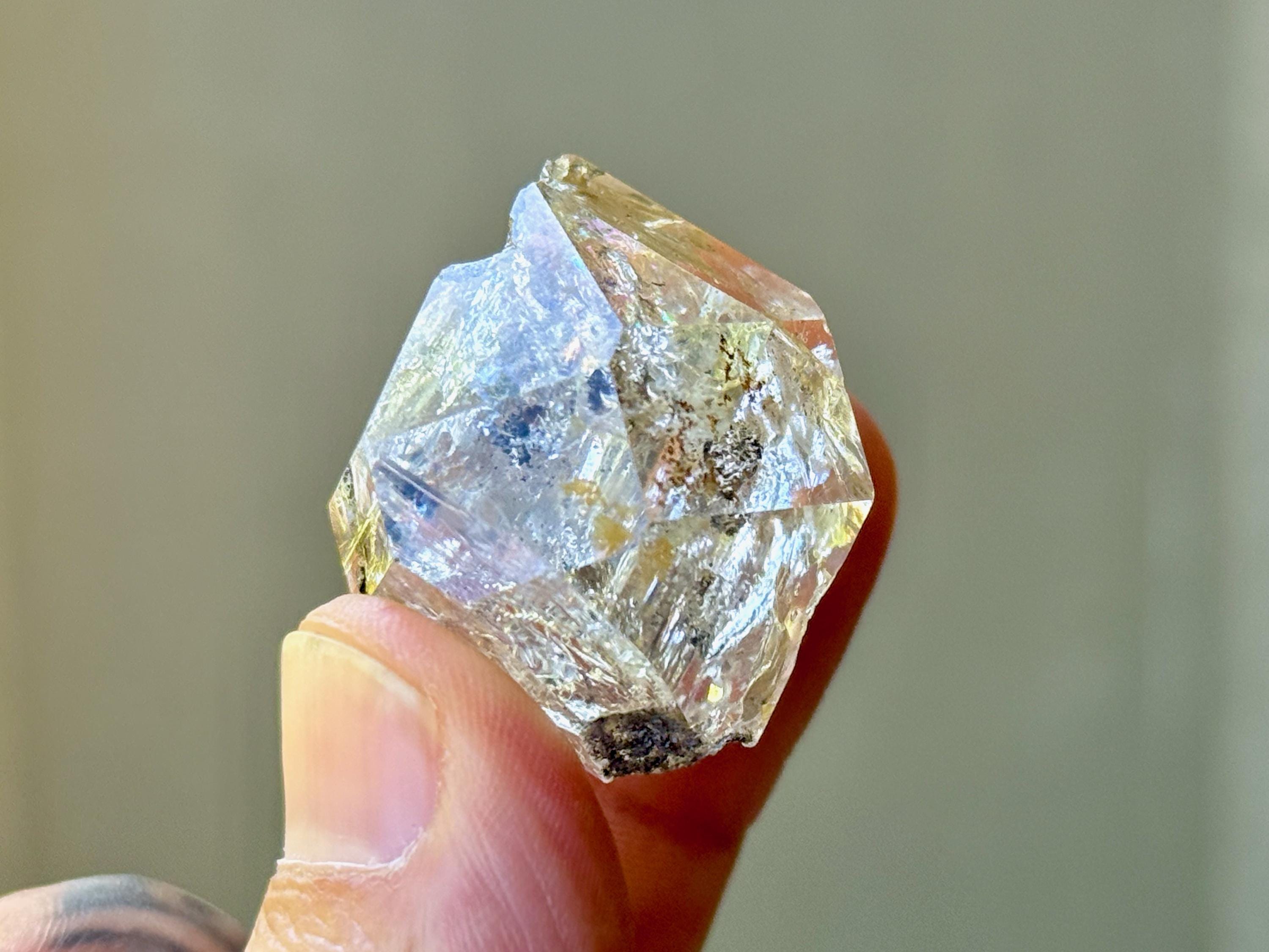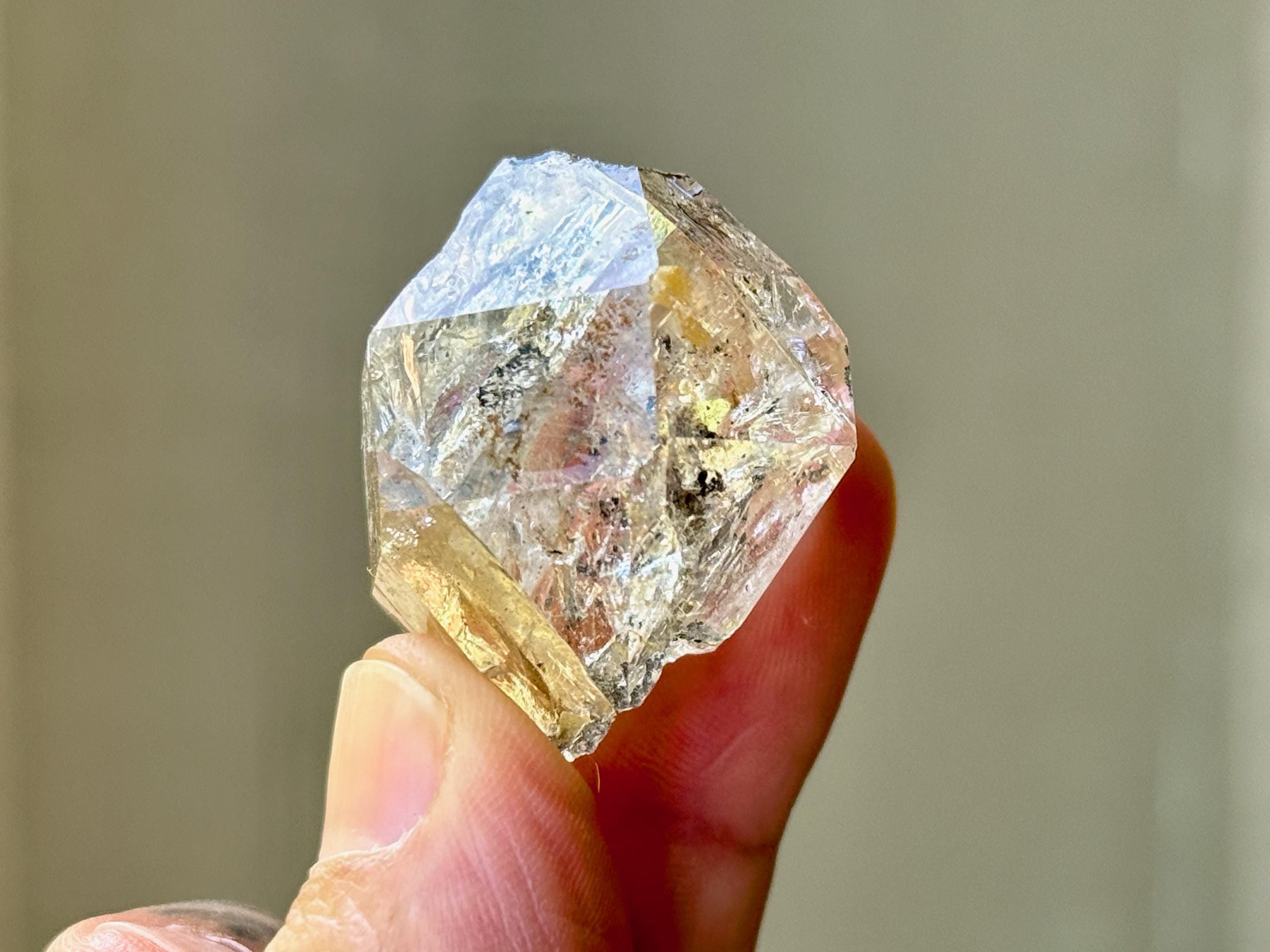 *Please note this crystal is clear and mostly colorless. The yellow hues in the photos are from the natural sunlight and surrounding environment reflecting off the crystal.