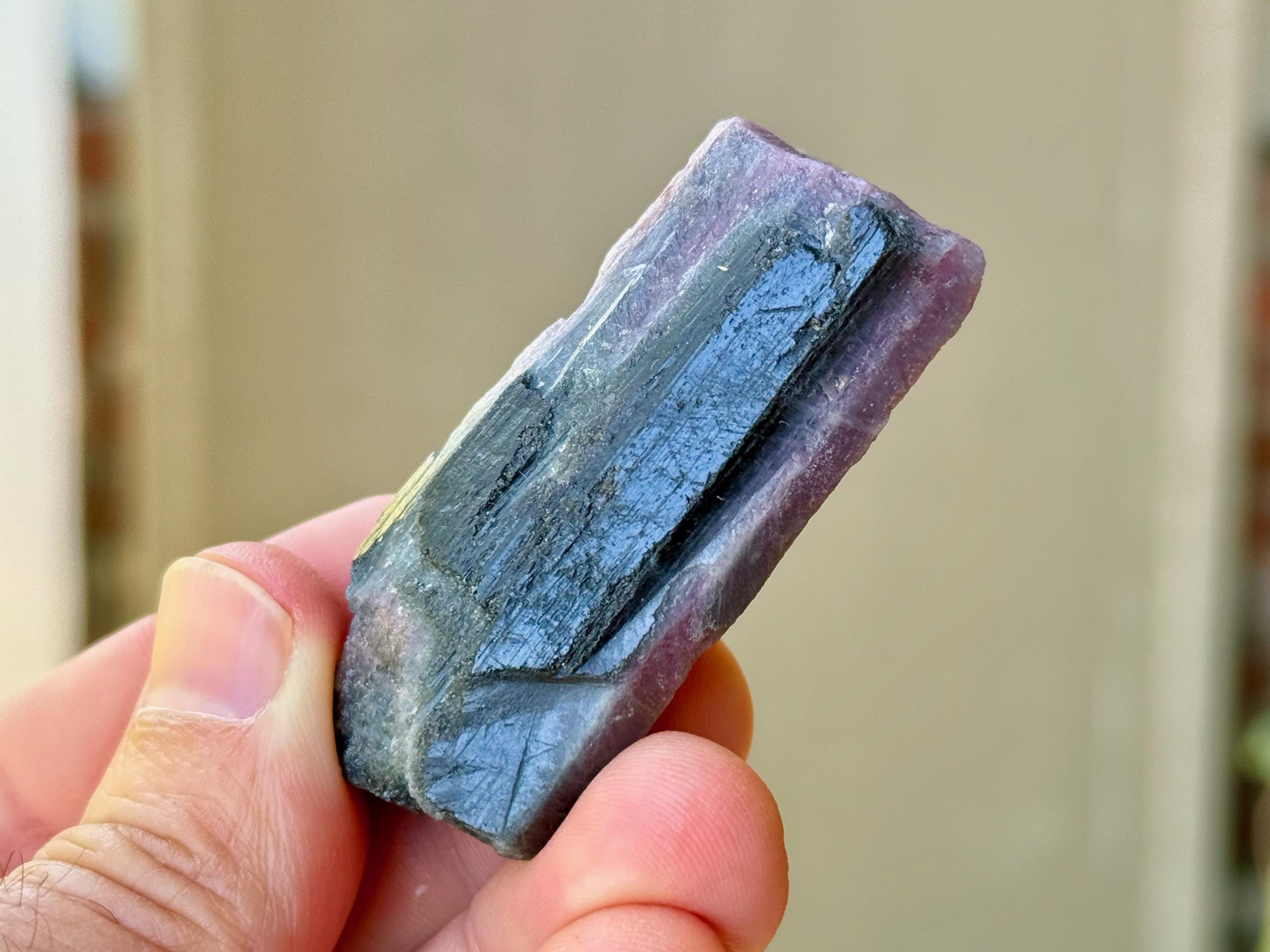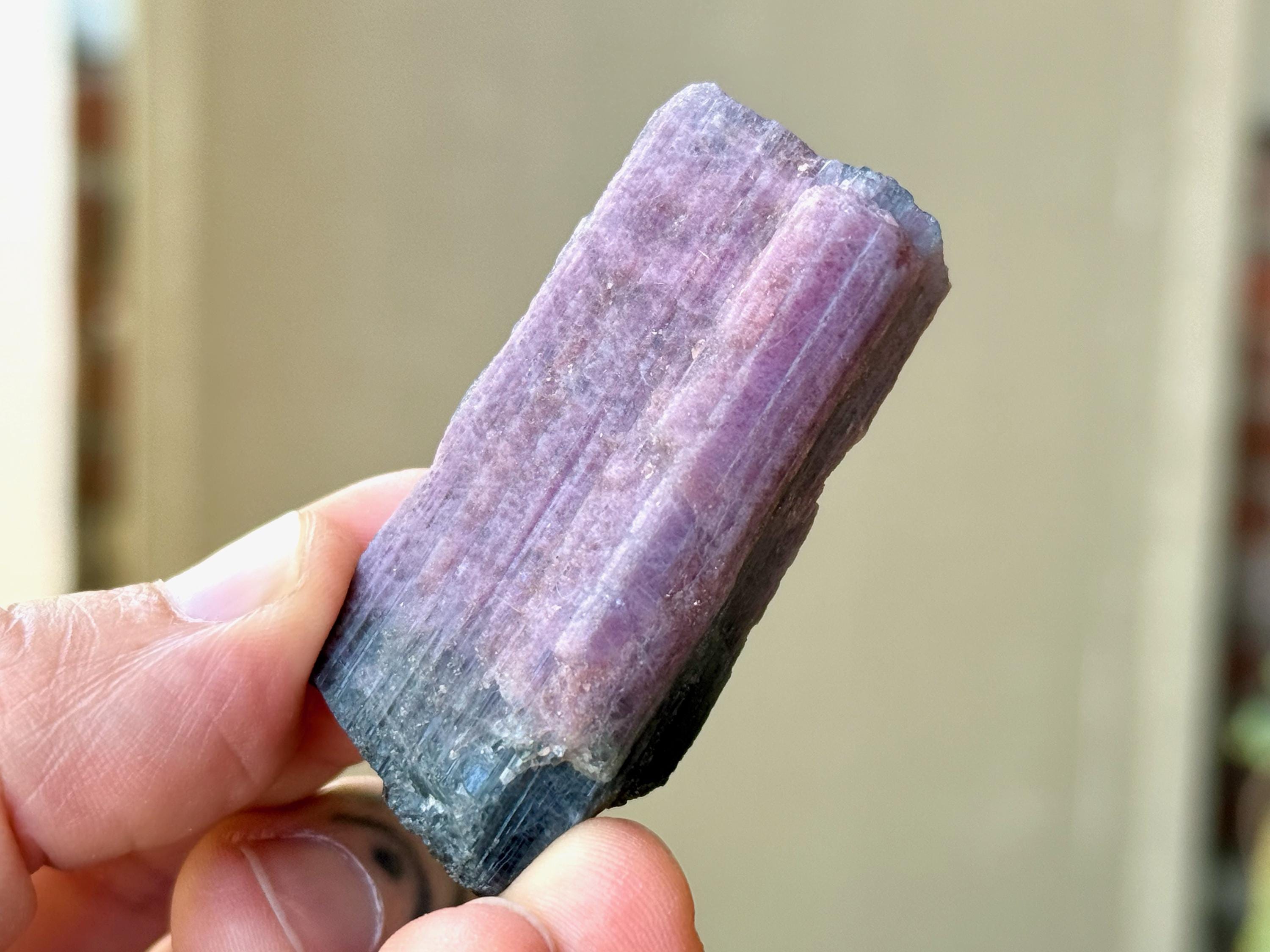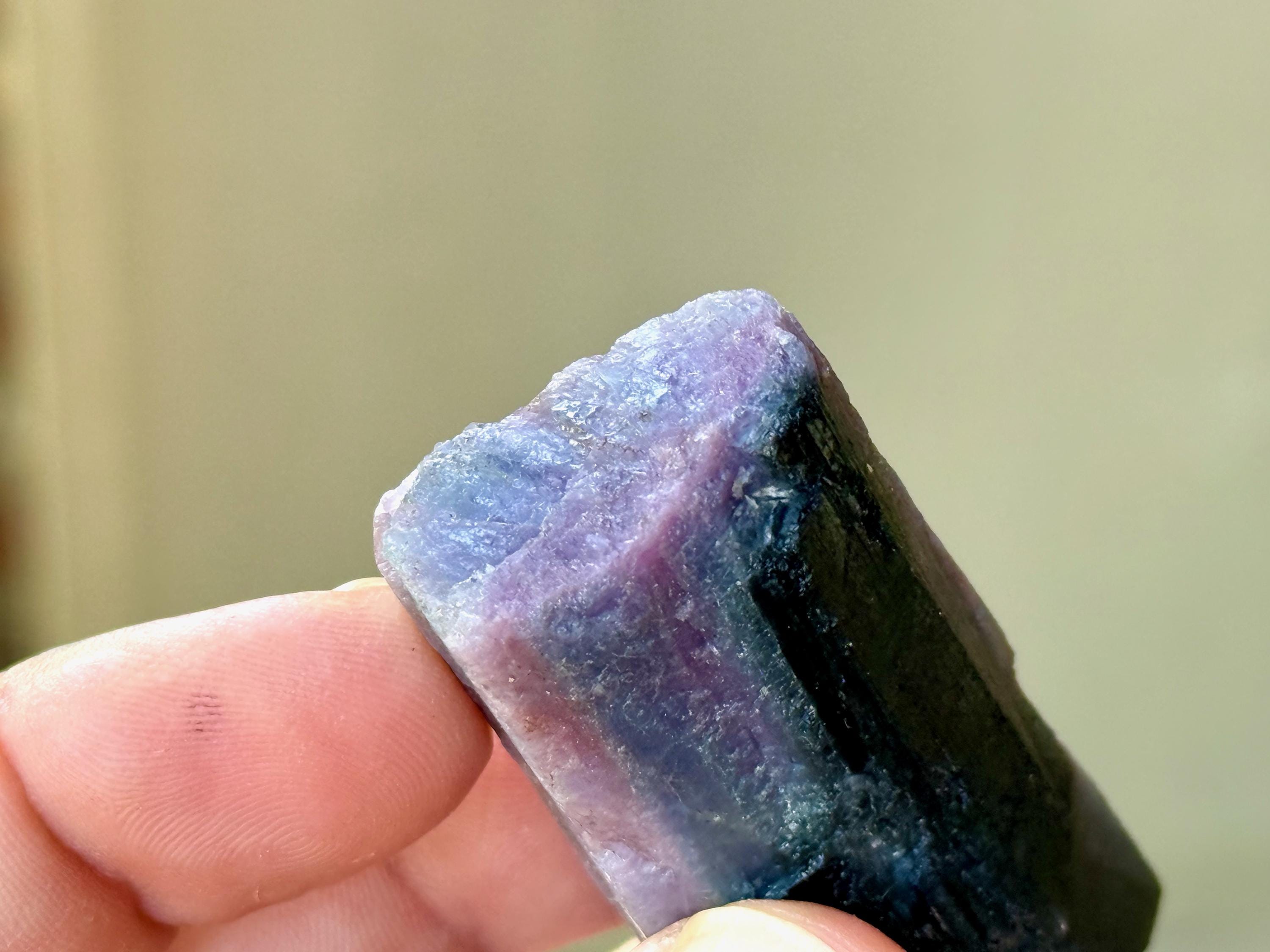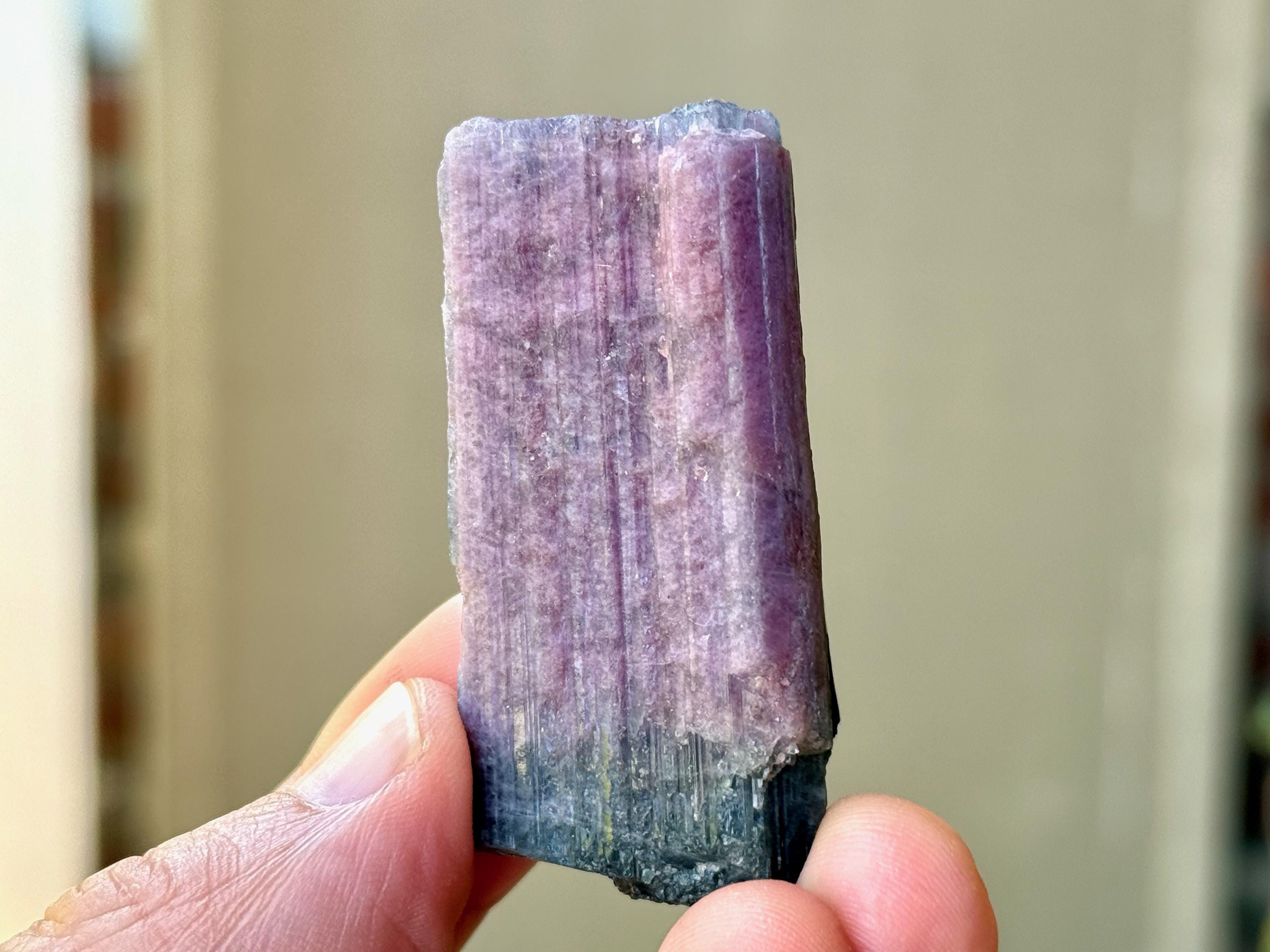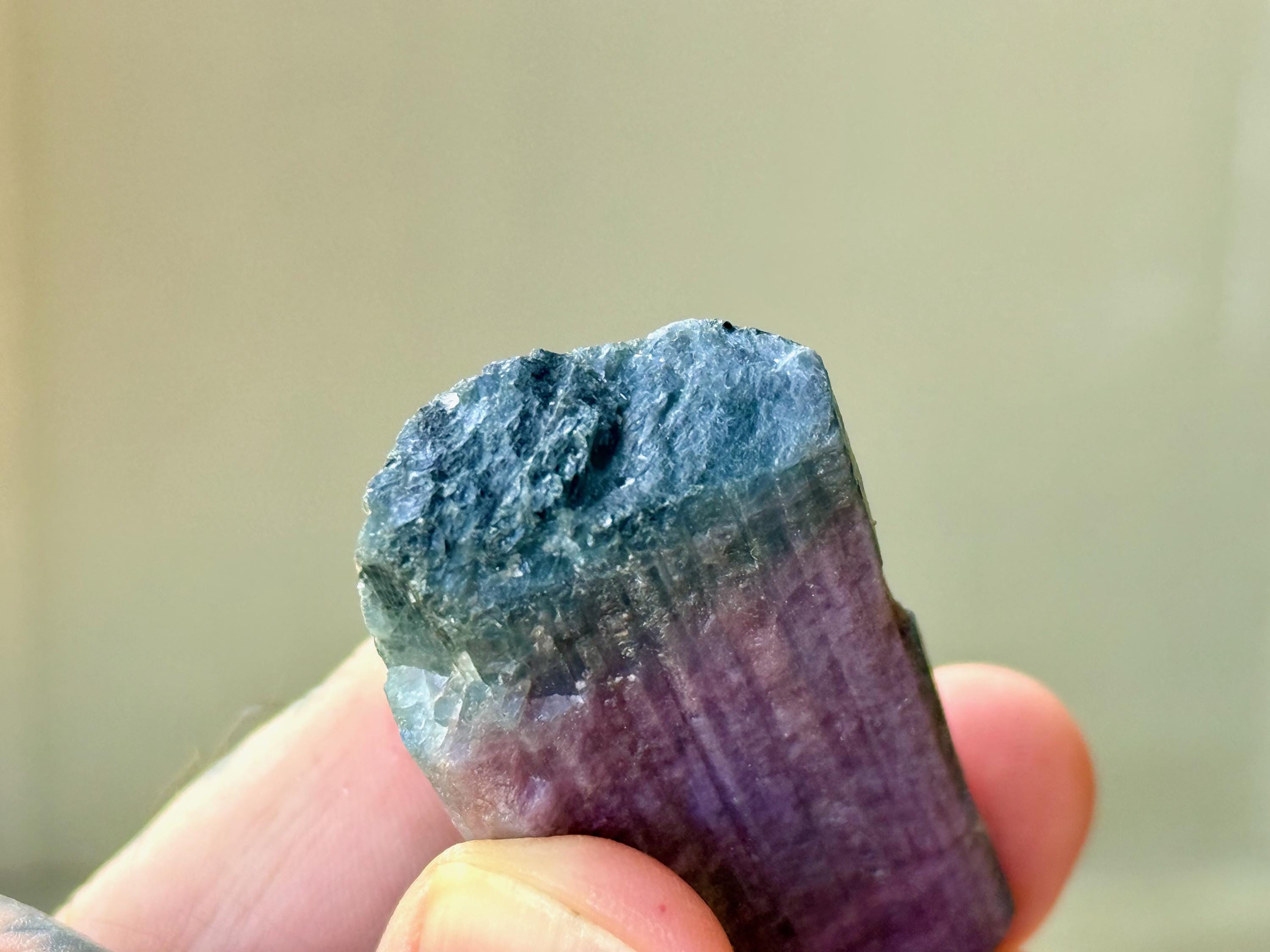 Vibrant colors to this beautiful Paraiba Tourmaline, with a dark pinkish-purple "core" and a portion of midnight blue "skin" on the exterior. This is the largest piece we have from this collection.