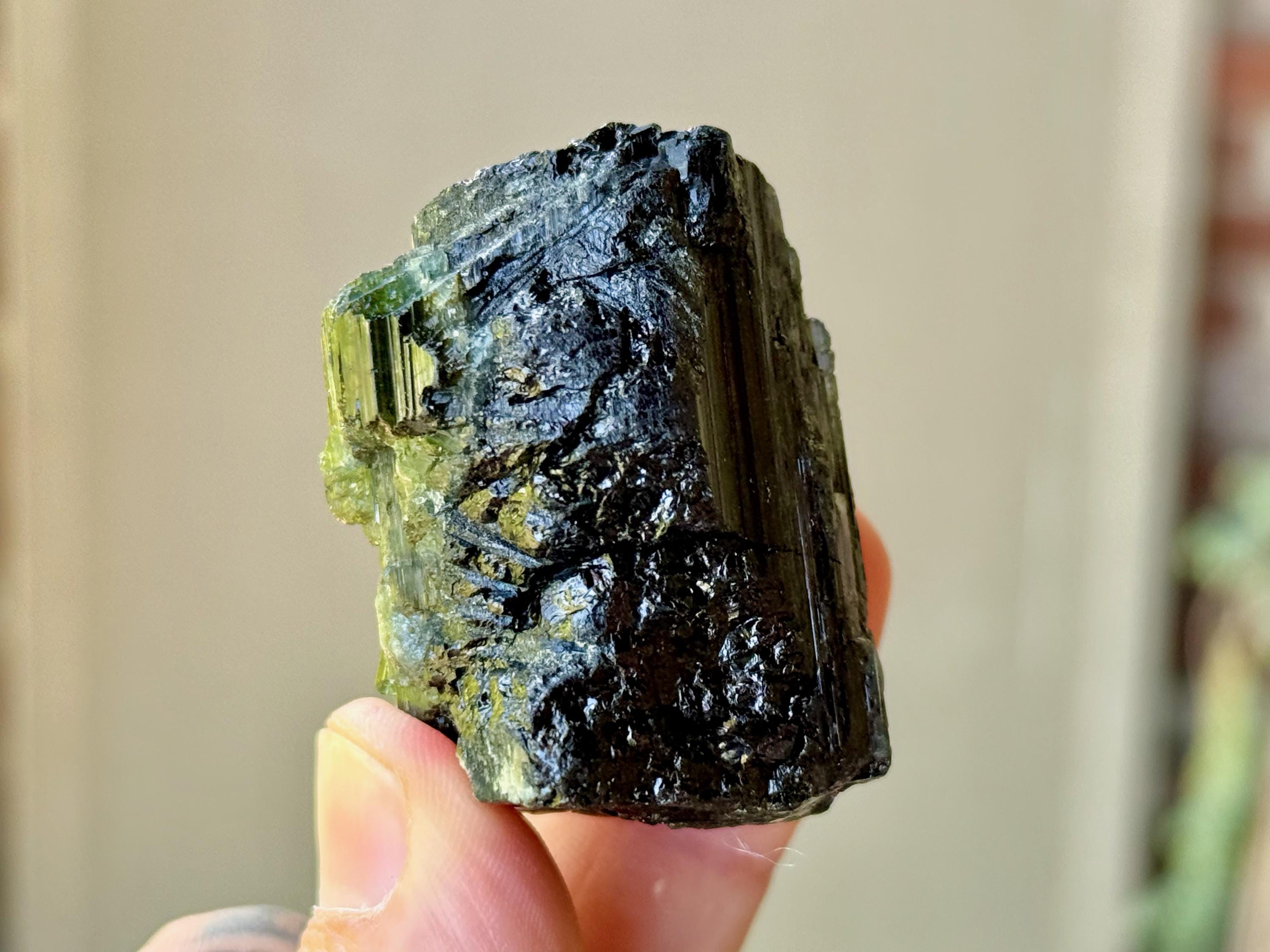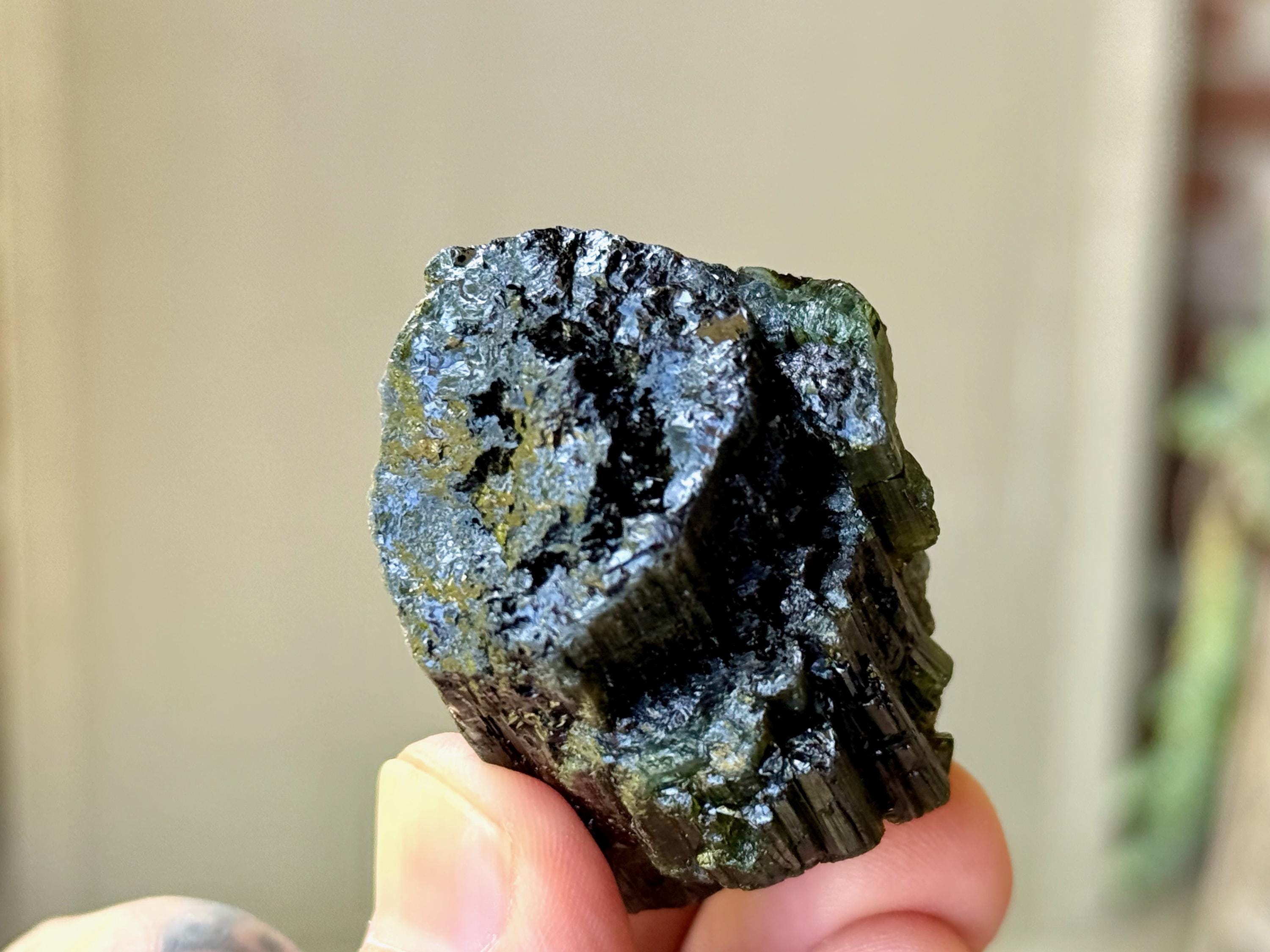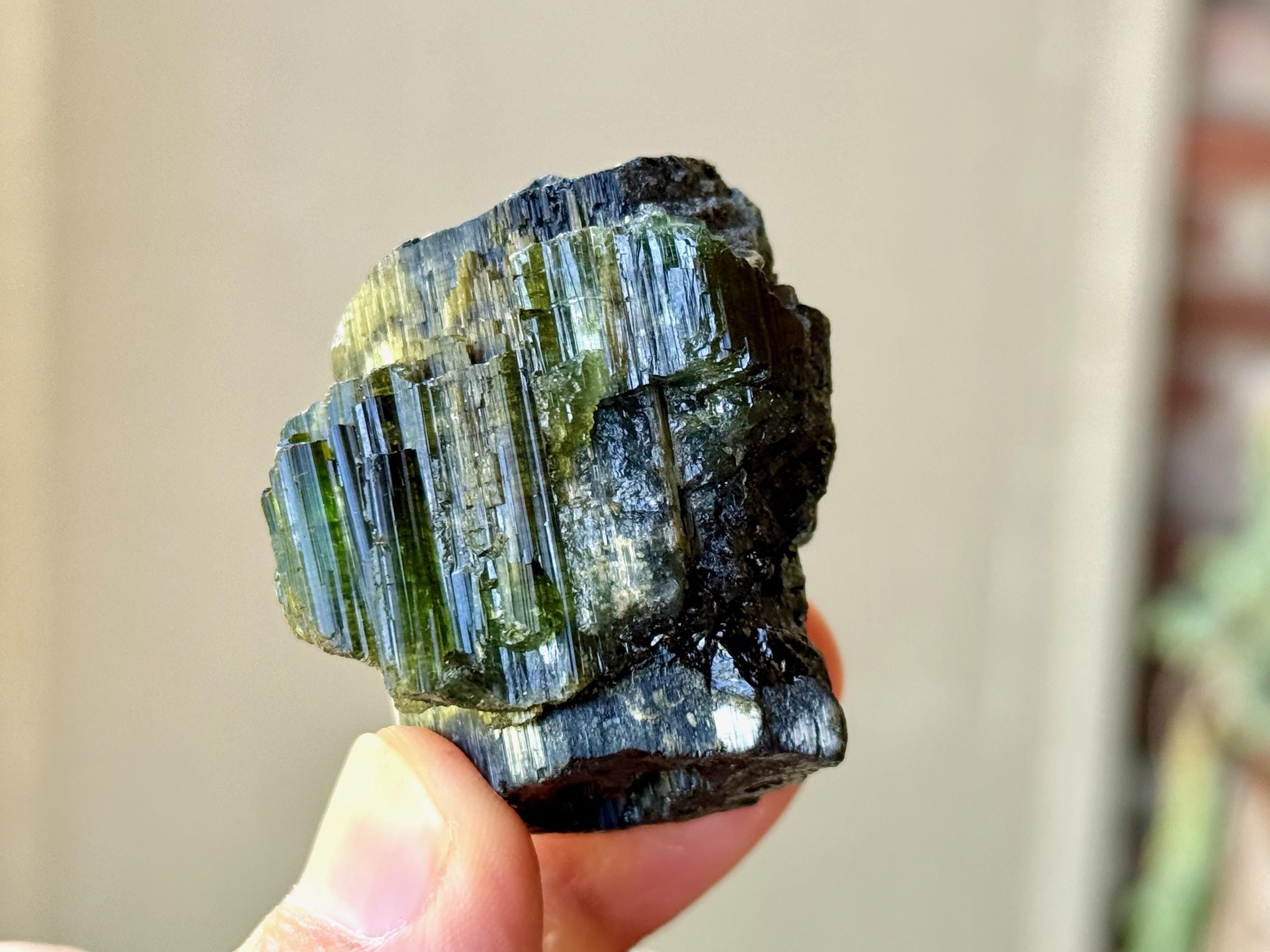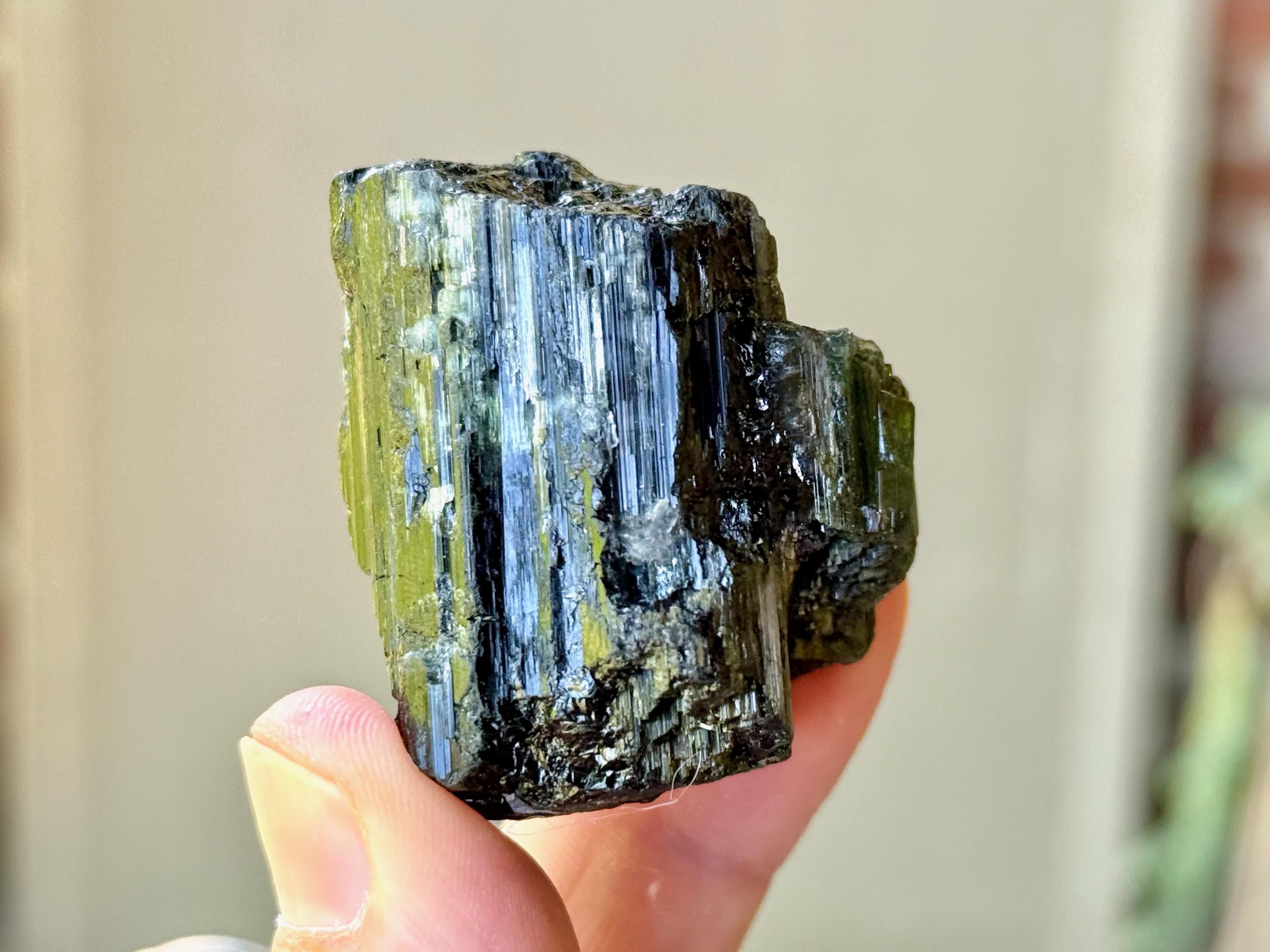 Cat's Eye Tourmaline gets its name for its iridescent quality, and the crystals from this find are bicolor with Green and Black hues. Green Tourmaline purifies and strengthens the nervous system, allowing it to carry greater amounts of Life Force (Prana Energy). As more energy is carried within the physical body, higher degrees of consciousness can be maintained.